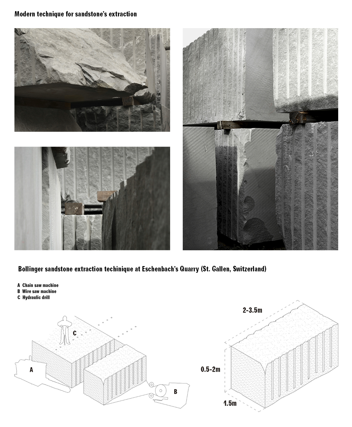 From that proposed excavation technique, it has been developed a building principle and an architectonic language and set of compositive rules that can hold the tension between the quarried place and the blocks extracted. The resultant architecture grows from the void in the excavation and creates an ambiguous continuity of formal and material language, of sizes and traces that change its position but constantly refer ones to the others, moving from the tectonics of the void to the stereotomy of the developed stone blocks assemblage.