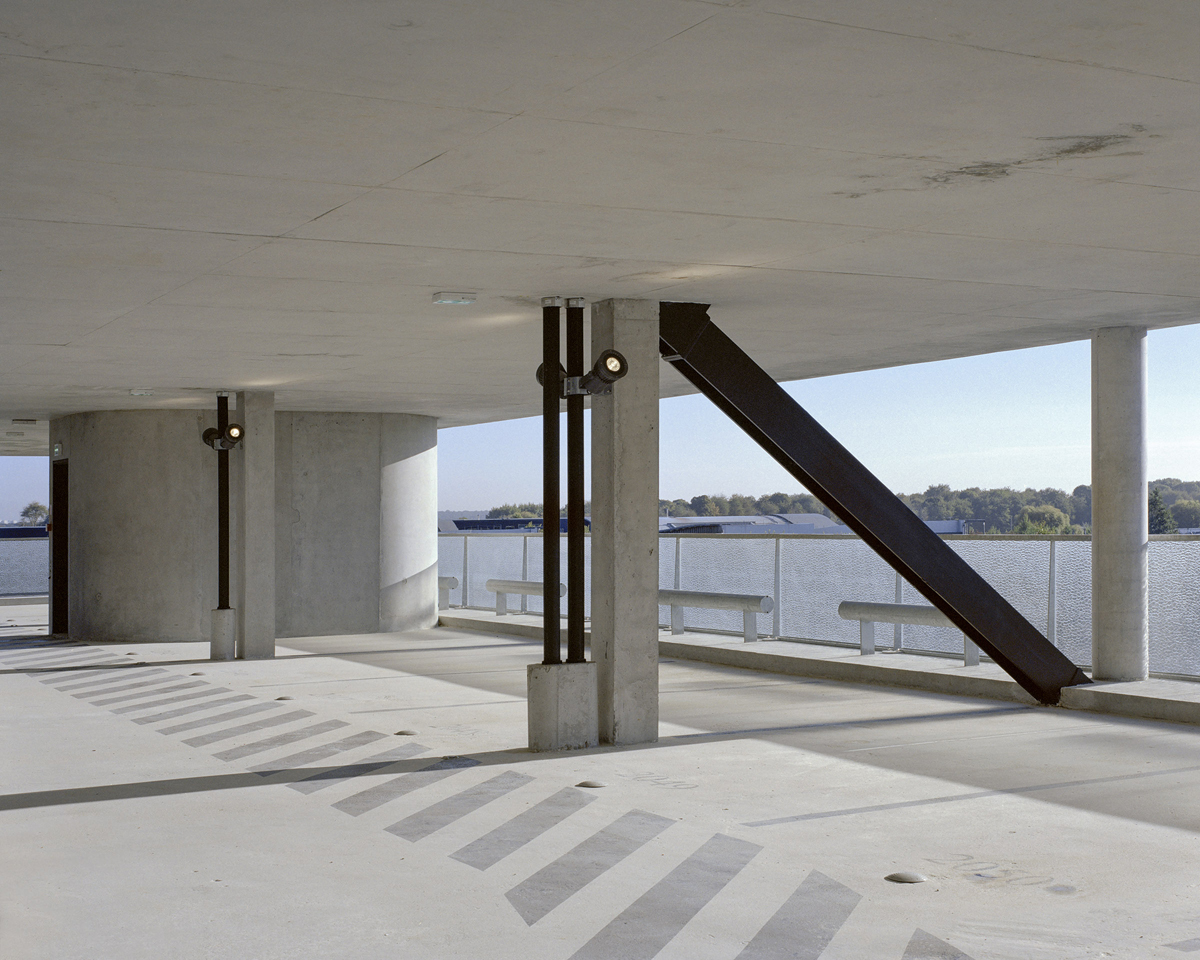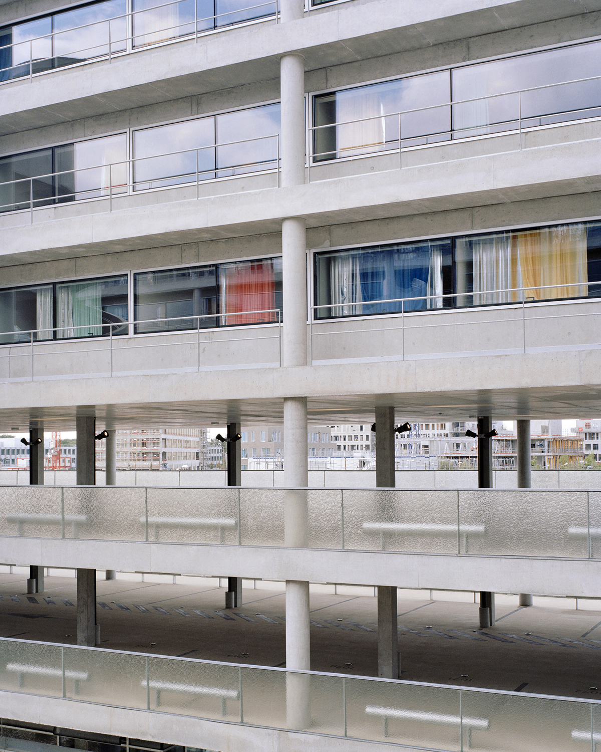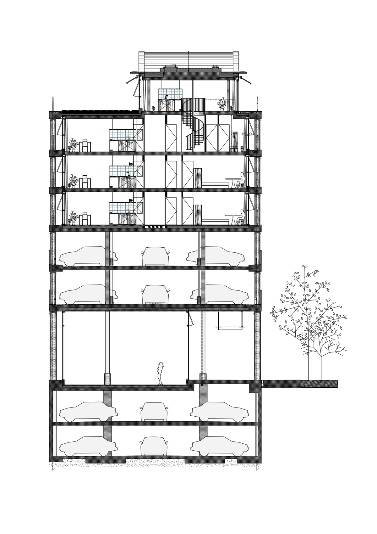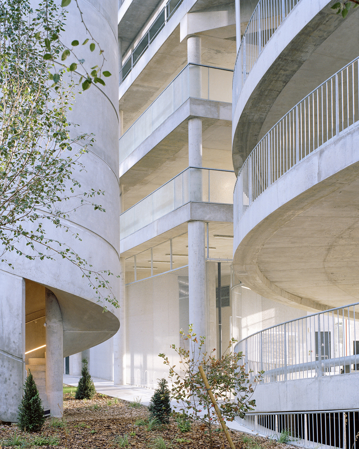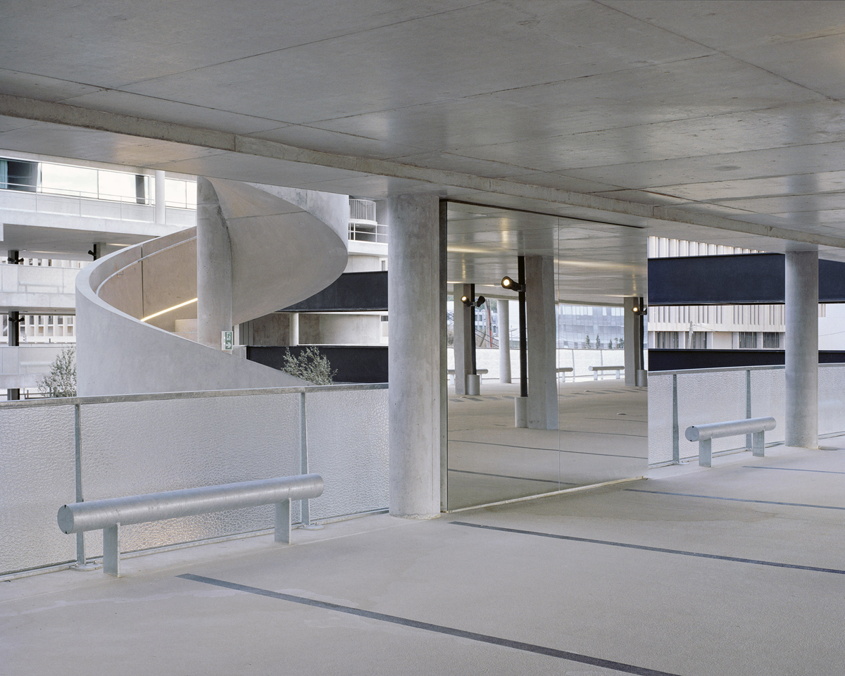 Thought out on the scale of the car as well as that of the individual, the building seeks a path between a strictly functionalist approach and that constrained by domestic norms. Domesticity is however very present in the scansion of the roof vaults. The attic even appears as a rereading of the typology of strip houses, laid out on the terrace. The regularity of the architectural vocabulary, even its monumentality, does not, however, stem from formal a priori, but rather asserts itself as a strict and sober resolution of the complex requirements of the program. The sharpness of these structural responses also allows the building to express a plasticity, almost brutalist, where the materials (concrete structure, glass panels removable from the dwellings) are returned to a constructive necessity and a plastic expressiveness as pure as each other.