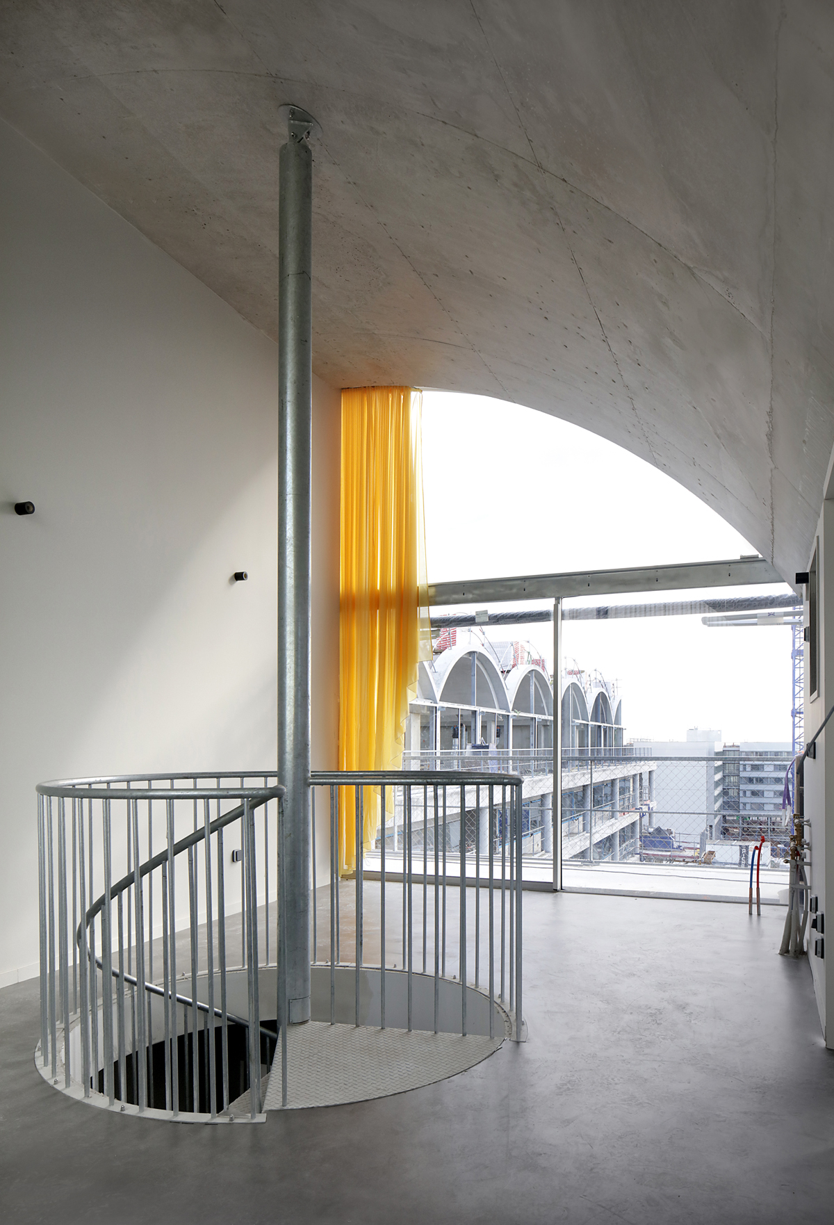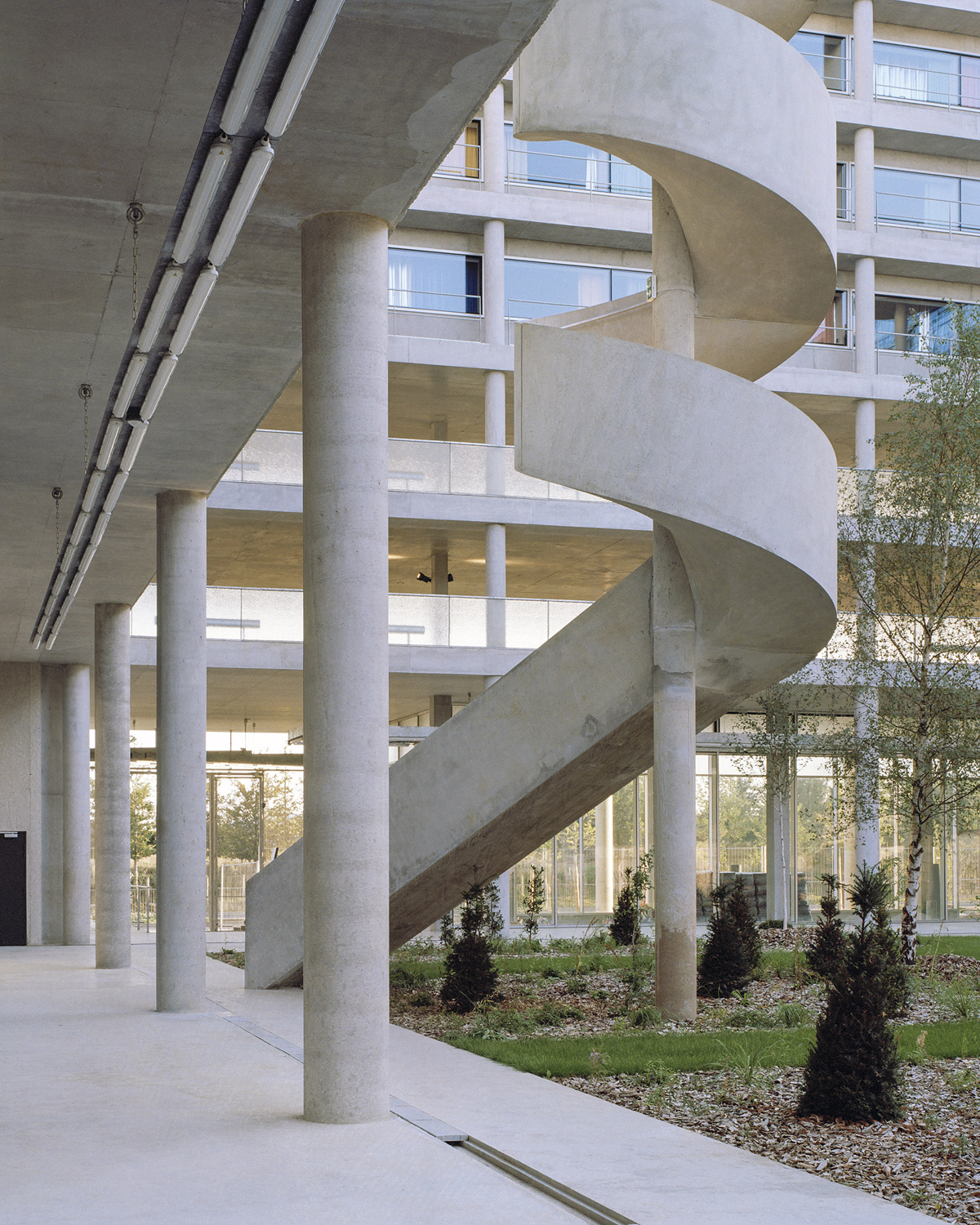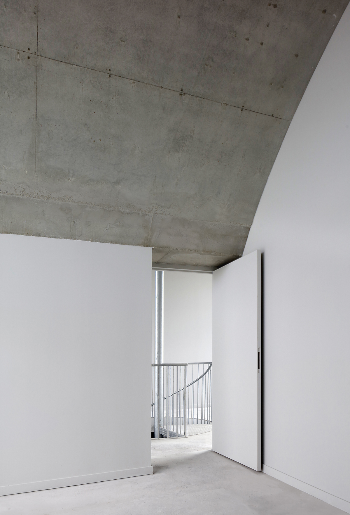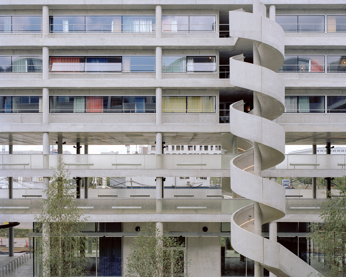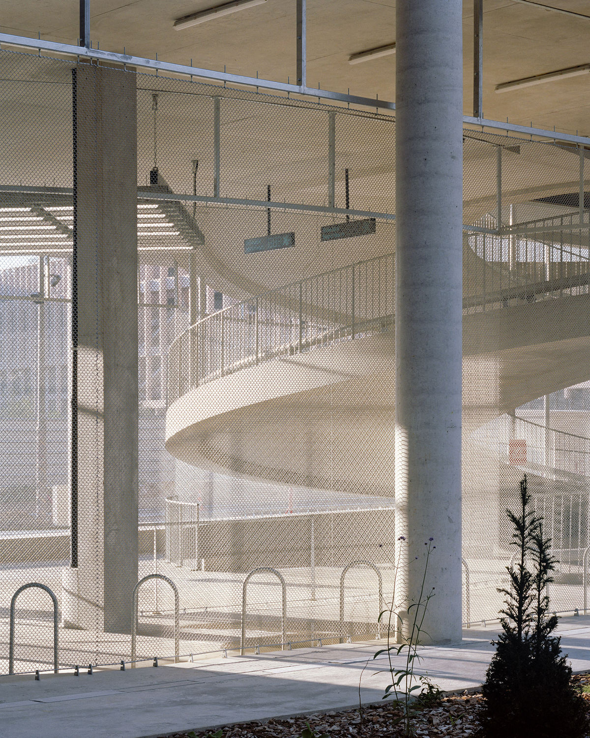 Thought out on the scale of the car as well as that of the individual, the building seeks a path between a strictly functionalist approach and that constrained by domestic norms. Domesticity is however very present in the scansion of the roof vaults. The attic even appears as a rereading of the typology of strip houses, laid out on the terrace. The regularity of the architectural vocabulary, even its monumentality, does not, however, stem from formal a priori, but rather asserts itself as a strict and sober resolution of the complex requirements of the program. The sharpness of these structural responses also allows the building to express a plasticity, almost brutalist, where the materials (concrete structure, glass panels removable from the dwellings) are returned to a constructive necessity and a plastic expressiveness as pure as each other.