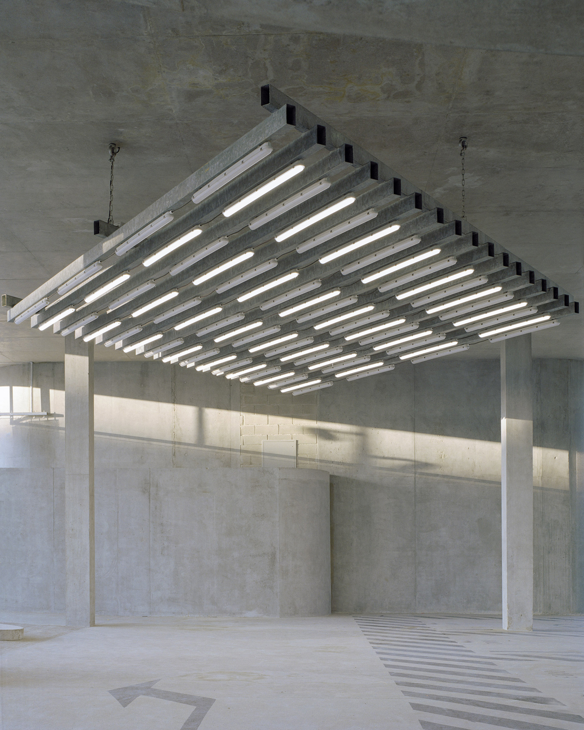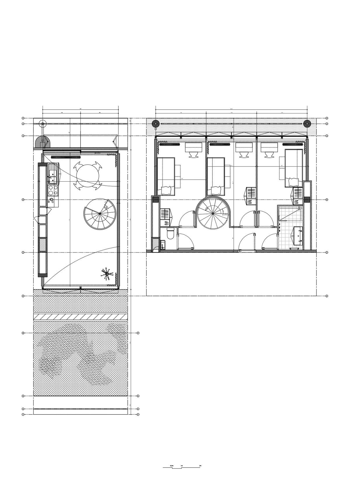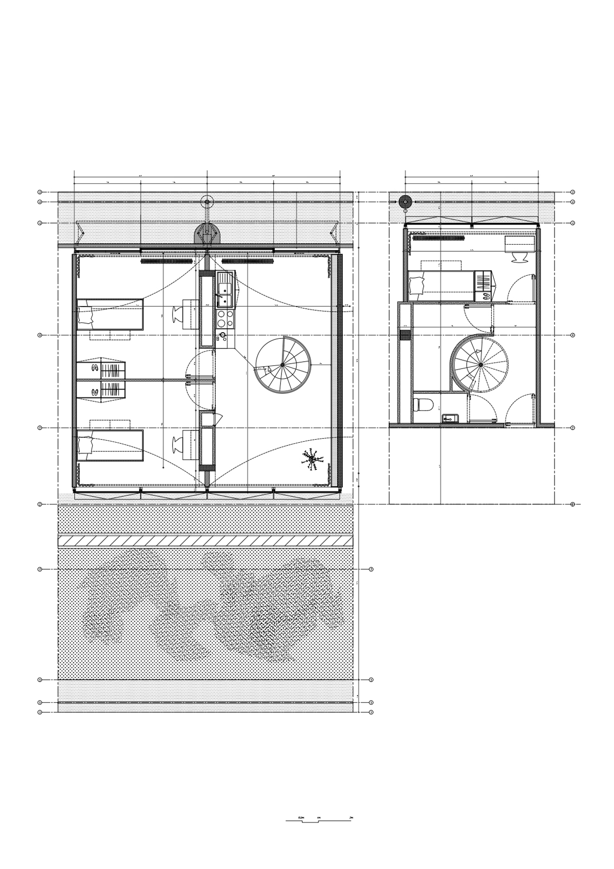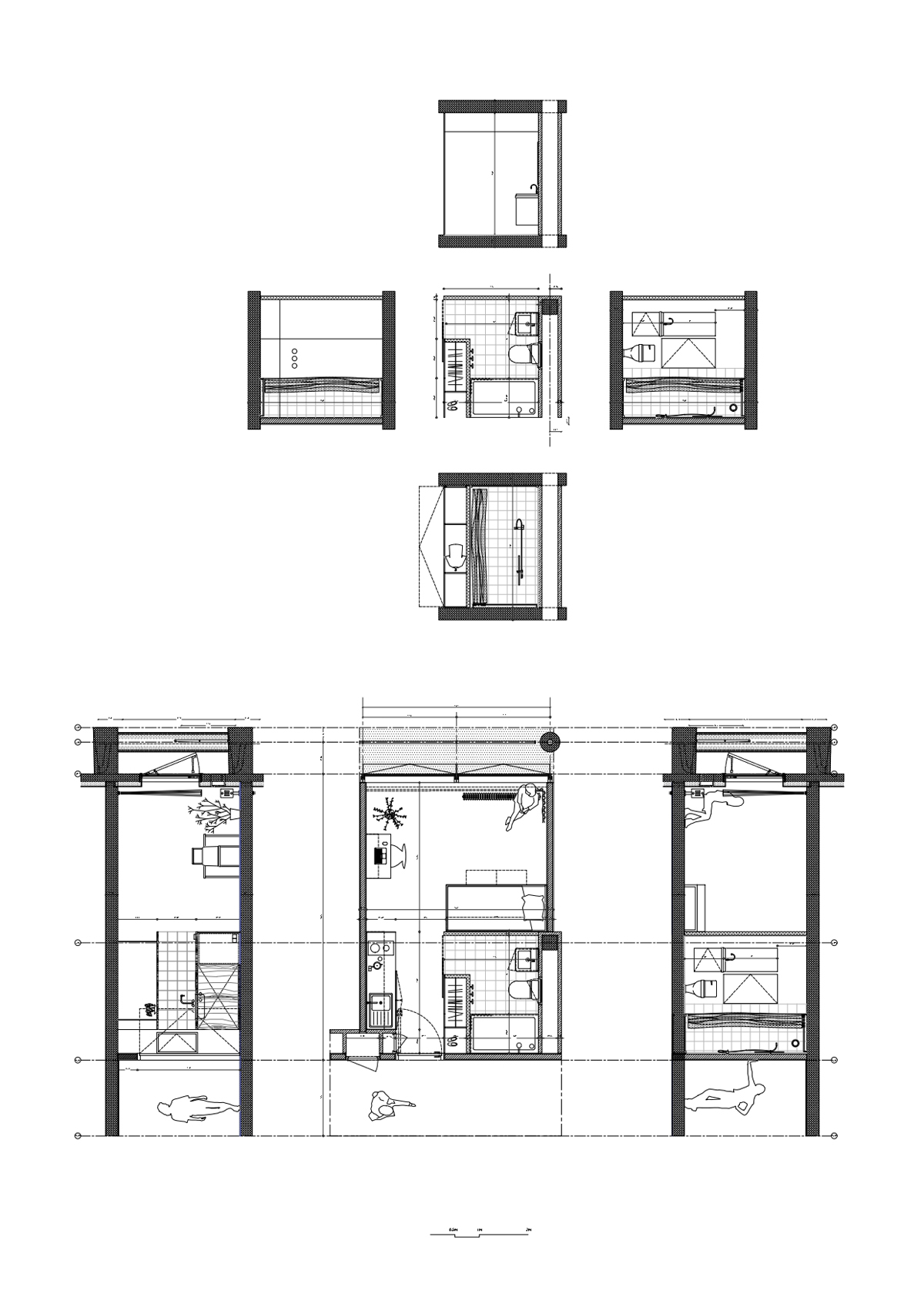 Thought out on the scale of the car as well as that of the individual, the building seeks a path between a strictly functionalist approach and that constrained by domestic norms. Domesticity is however very present in the scansion of the roof vaults. The attic even appears as a rereading of the typology of strip houses, laid out on the terrace. The regularity of the architectural vocabulary, even its monumentality, does not, however, stem from formal a priori, but rather asserts itself as a strict and sober resolution of the complex requirements of the program. The sharpness of these structural responses also allows the building to express a plasticity, almost brutalist, where the materials (concrete structure, glass panels removable from the dwellings) are returned to a constructive necessity and a plastic expressiveness as pure as each other.