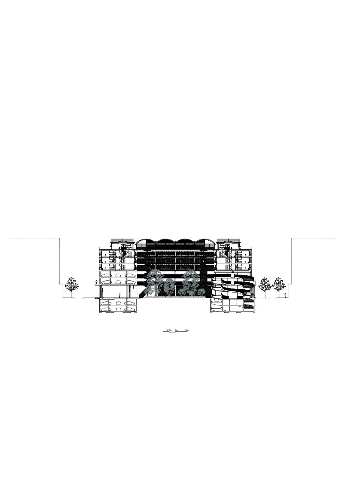 Rather than a building, the project should even be presented as a thrifty and equipped structure. The program brings together several distinct elements (student housing, communal living facilities, shops, public and private parking lots) but absolutely refuses to play the composite agglomeration card. On the contrary, it is rather the uniqueness of the lines and the modular rhythm of the whole that is striking. The distribution of the different programs obeys a logic of superimposition: a double-height first floor hosting the shops and the collective spaces of the student residence; two levels, ground floor+1 and ground floor+2, on a large open plateau for public parking spaces; on levels ground floor+3, ground floor+4 and ground floor+5, three levels of housing; and finally an attic level hosting the high levels of certain duplex housing units. This distribution has the advantage of offering the noblest and most unobstructed views to all the housing units, while designing a more streamlined building base. This base even plays on certain contrasting and superimposing effects: a largely transparent first floor and two parking levels above, which are much opaquer. Access to the parking lots provides another visual contrast, since it is provided by large, interlaced ramps, while being included in the volume of the building, give it another spectacular dimension.