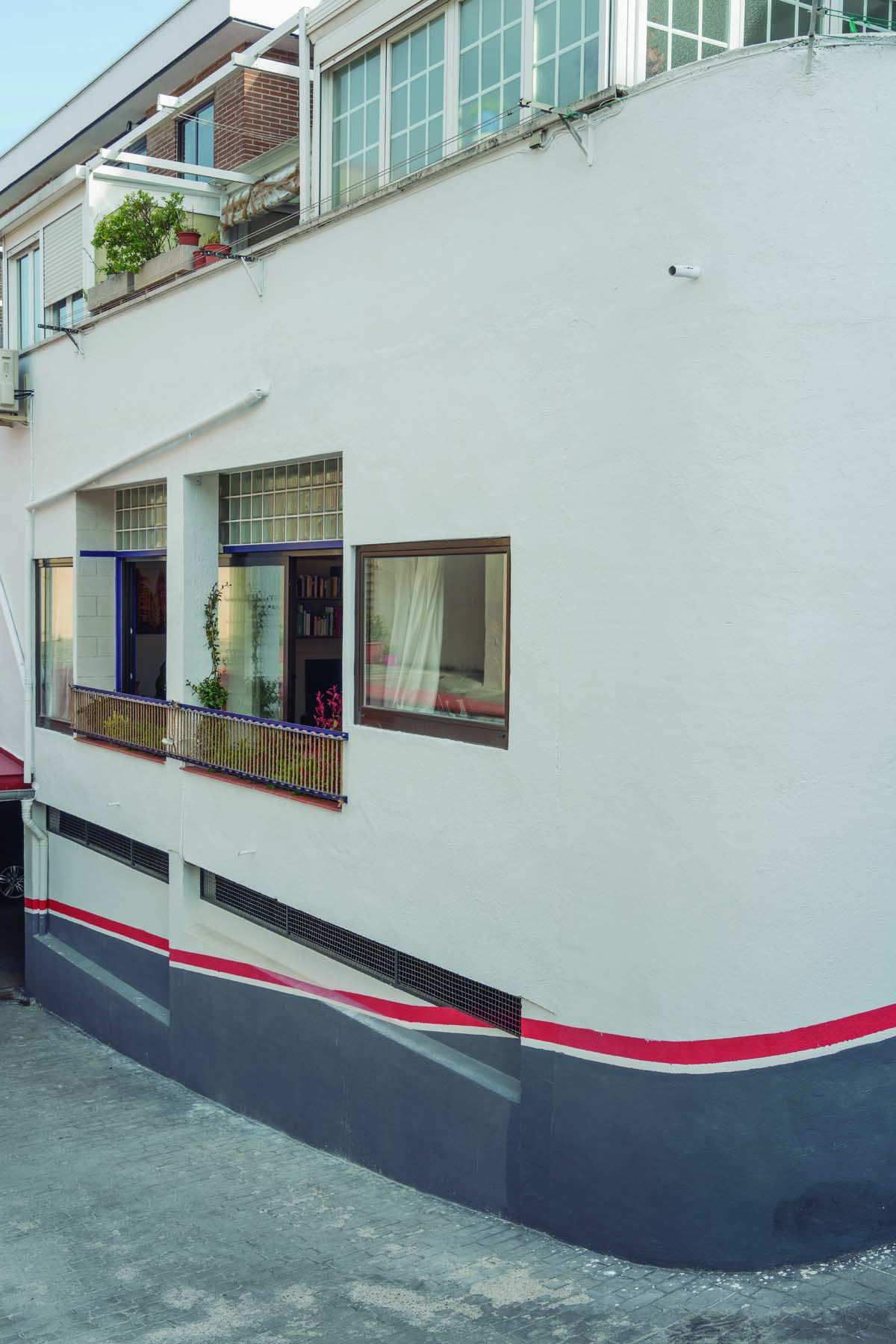 El Garaje es un tallmble al paso de la luz. Una superficie de bloques de hormigón blanco, pavés y acero, anticipa las soluciones constructivas del interior de la vivienda. El resto de la fachada existente se recorta puntualmente para acoger dos aberturas adicionales. Desde el interior, la fachada enmarca fragmentos parciales del contexto urbano y regula los grados de intimidad necesarios entre la vivienda y la calle. Se construye así un umbral que sirve de antesala de la cocina y ofrece un espacio polivalente capaz de duplicar su superficie durante el día mientras que por la noche una gran puerta corredera cierra la habitación de los niños.