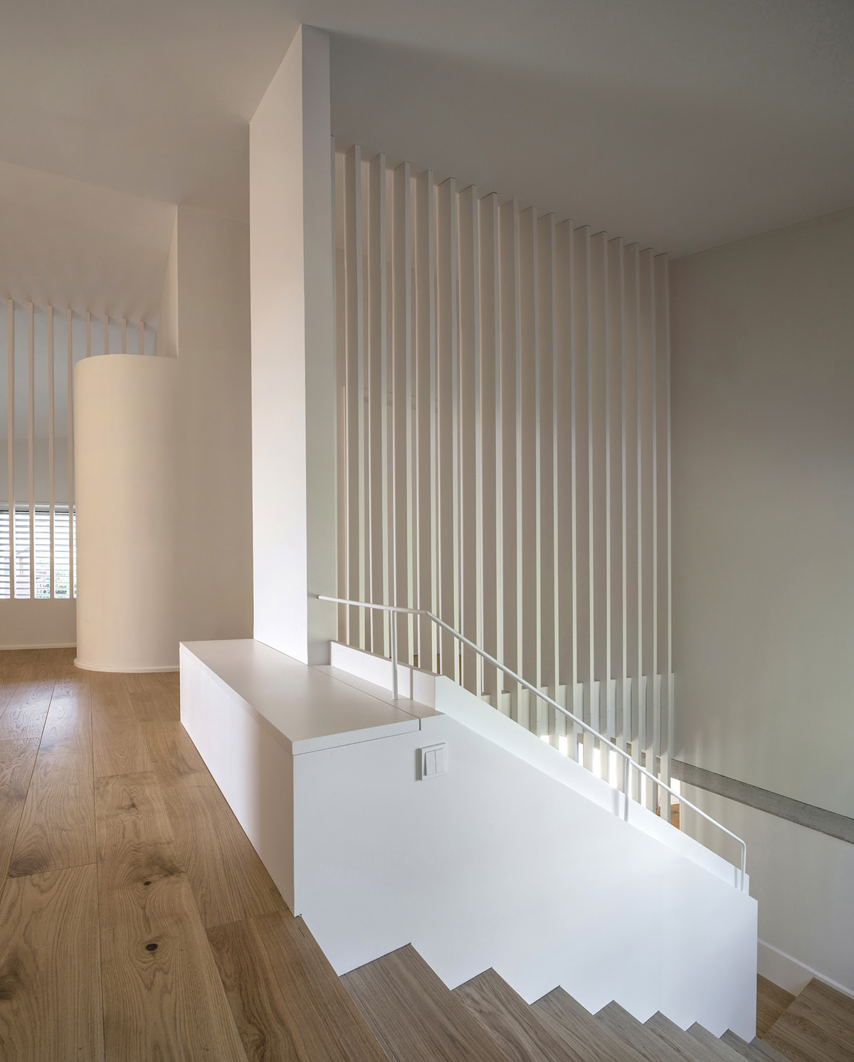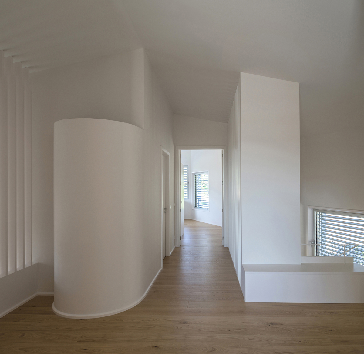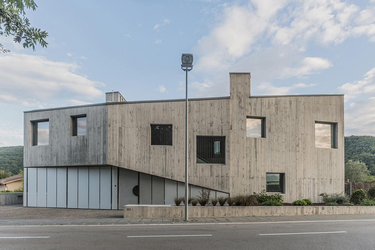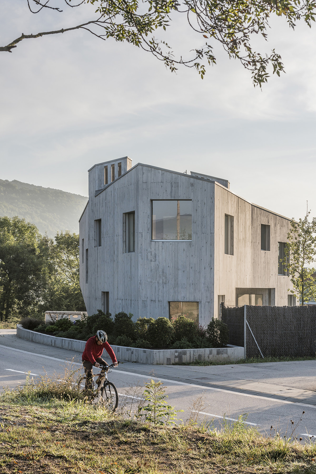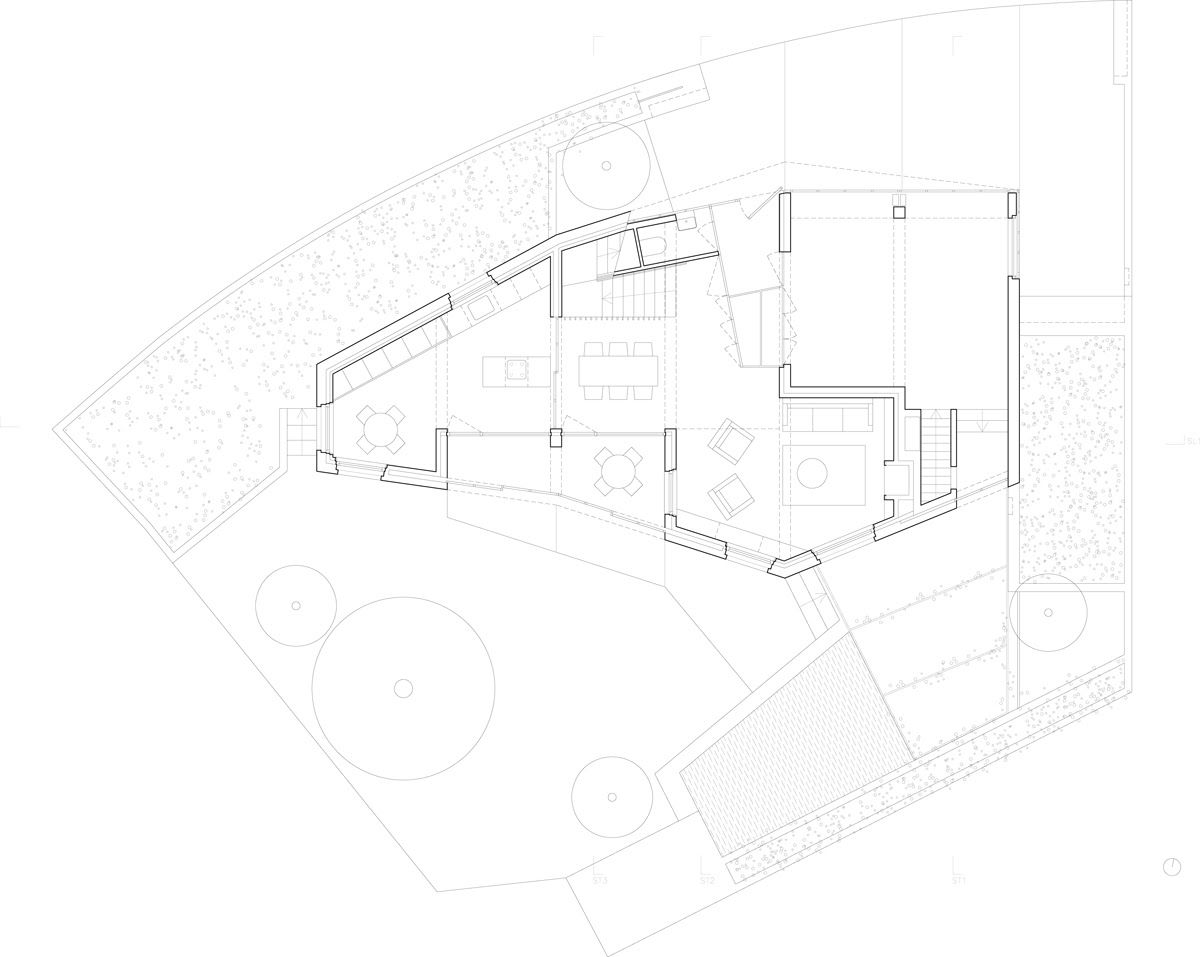 El edificio, de apariencia masiva, corona un promontorio en el borde del tejido urbano. Se podría decir que la casa completa la fisiografía del lugar. La entrada, presidida por una plazoleta y un banco corrido, reconoce el punto más alto y ensancha el cruce de dos caminos. La fachada a norte es convexa, geometrizando el trazado de la vía. La cara sur, en cambio, es cóncava para abrazar el jardín con la ayuda de volúmenes auxiliares escalonados.