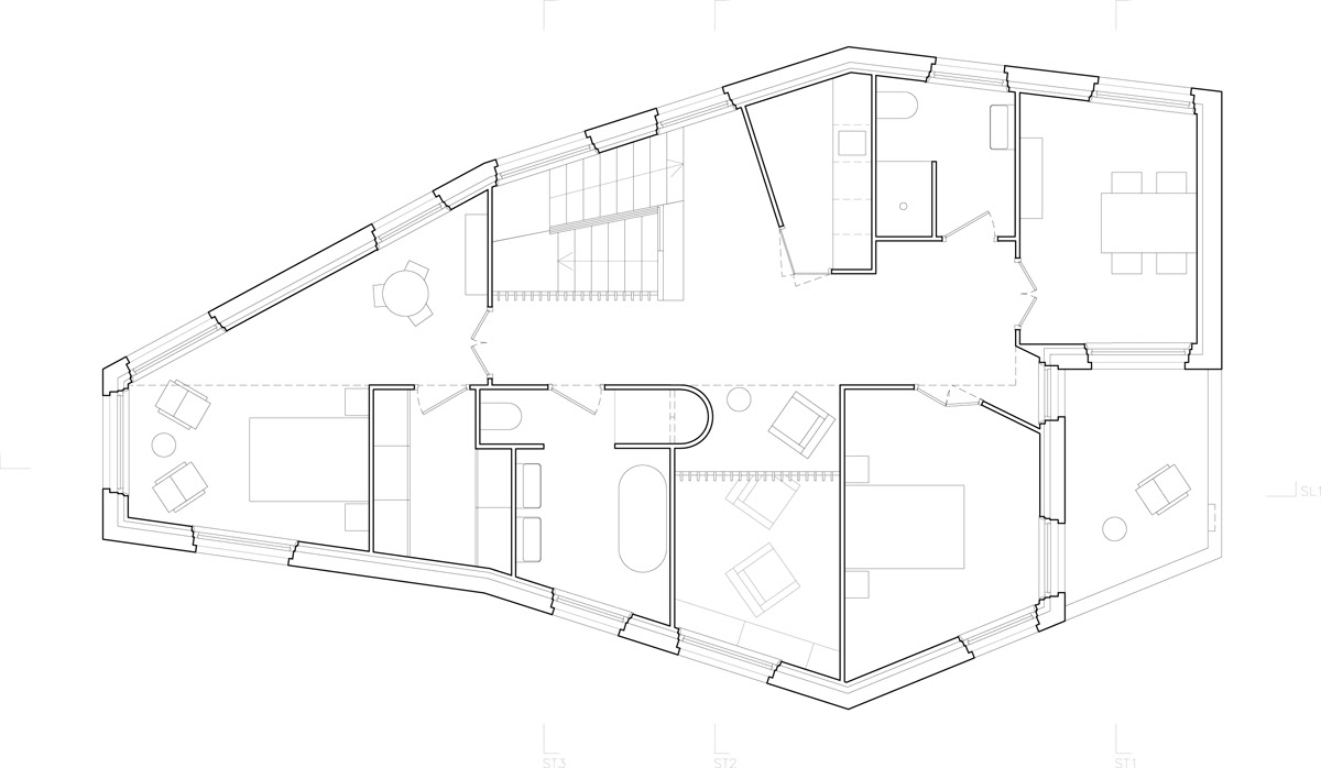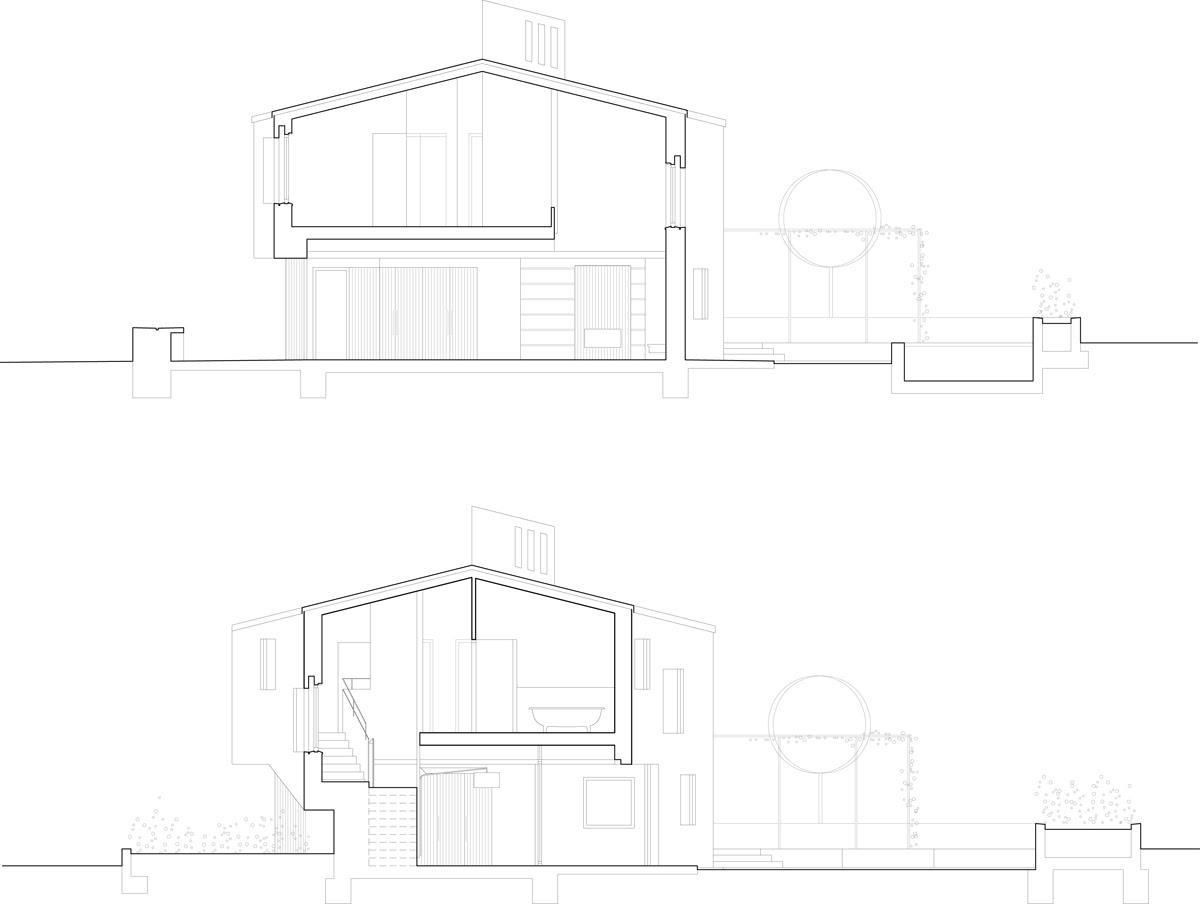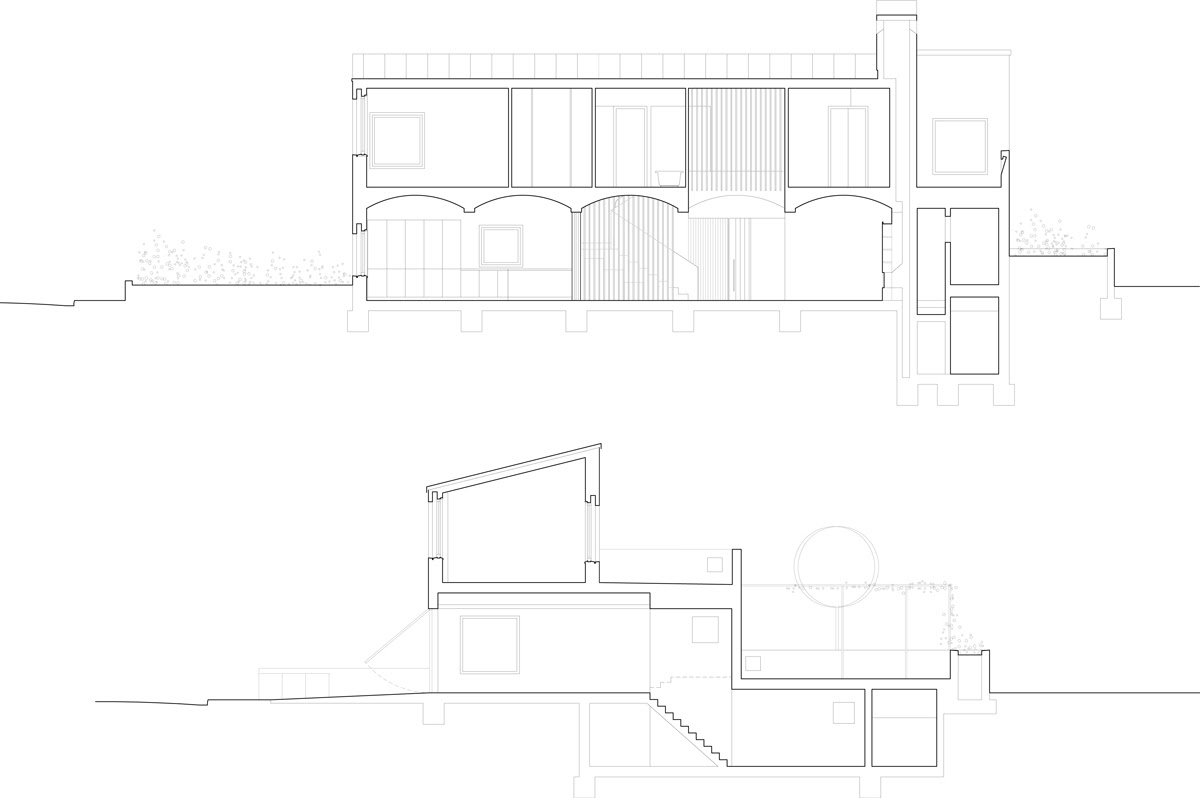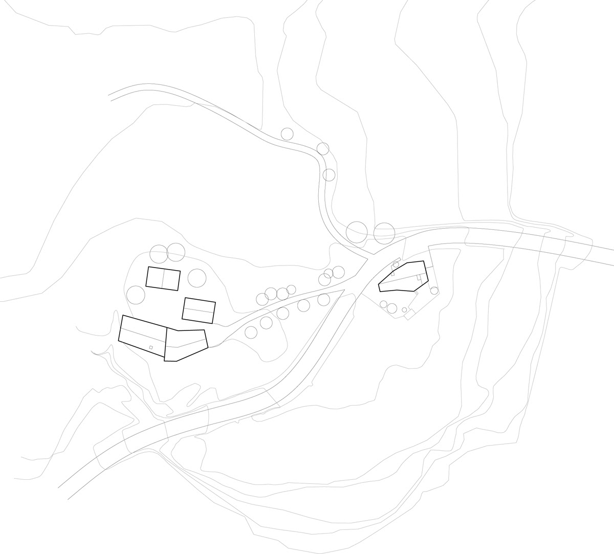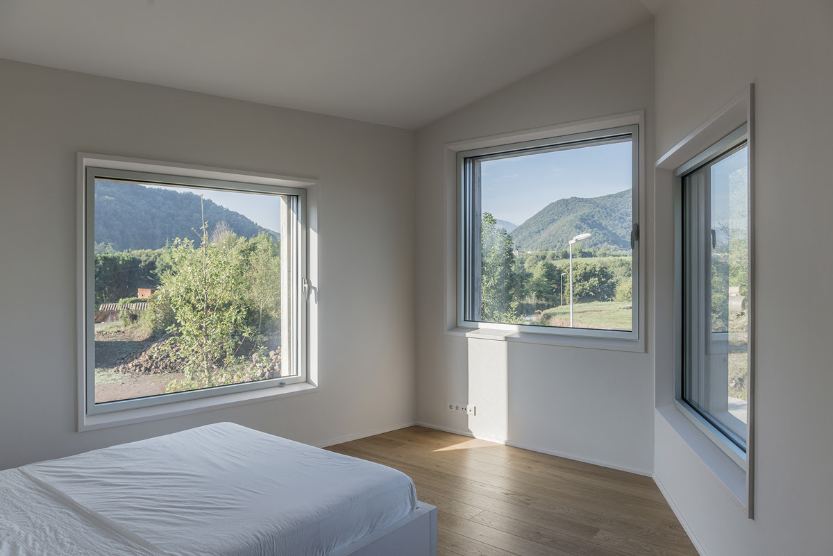 Esta aparente irregularidad perimetral esconde una estructura pautada y ortogonal formada por seis crujías paralelas. De alguna forma podría leerse como una casa rectangular con cubierta a dos aguas a la que hemos achaflanado las caras. La edificación mantiene una posición de bis a bis con la masía de Marunys. Sus caras estrechas se miran desde ambos lados del camino, franqueándolo. La nueva construcción establece una relación física con la antigua, y también tiende vínculos con la tradición constructiva local. De hecho, la casa Cáscara comparte con la masía, módulo y sistema estructural, volumetría y mecanismos de adaptación tipológica al emplazamiento.