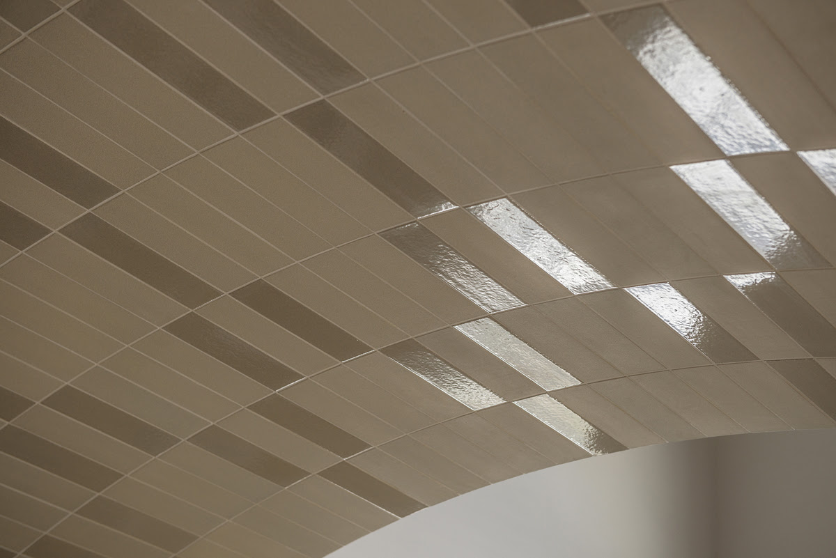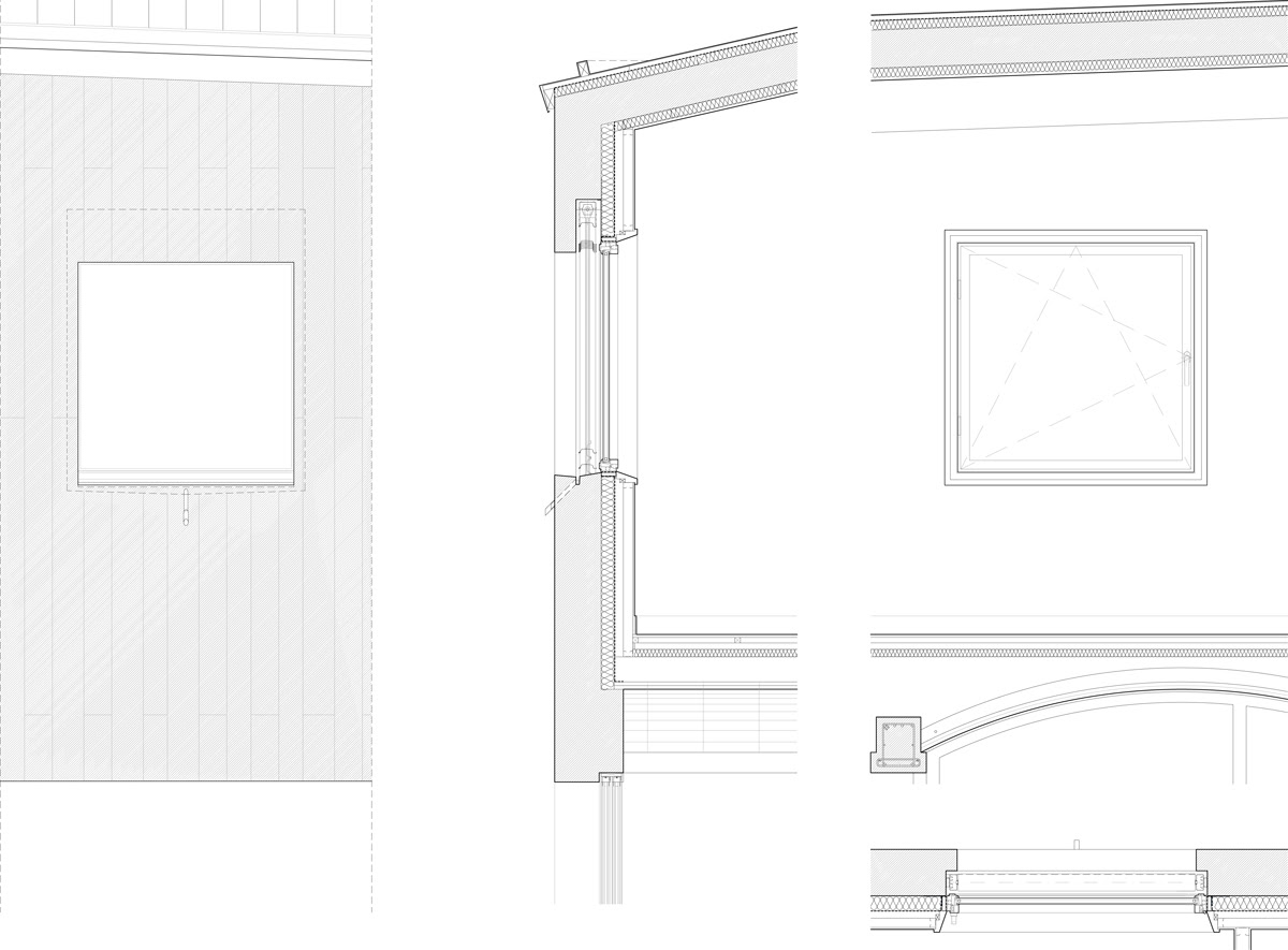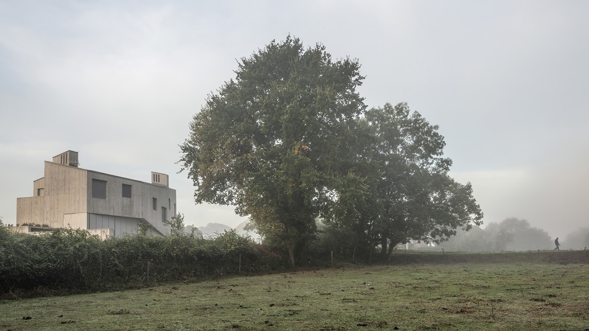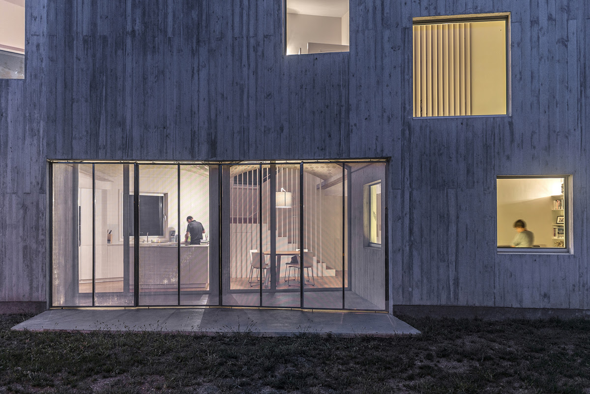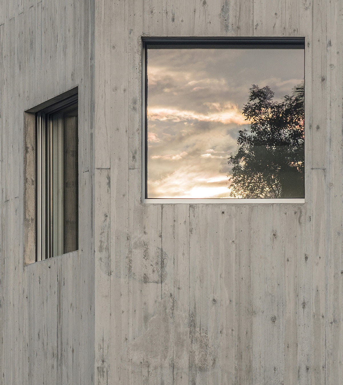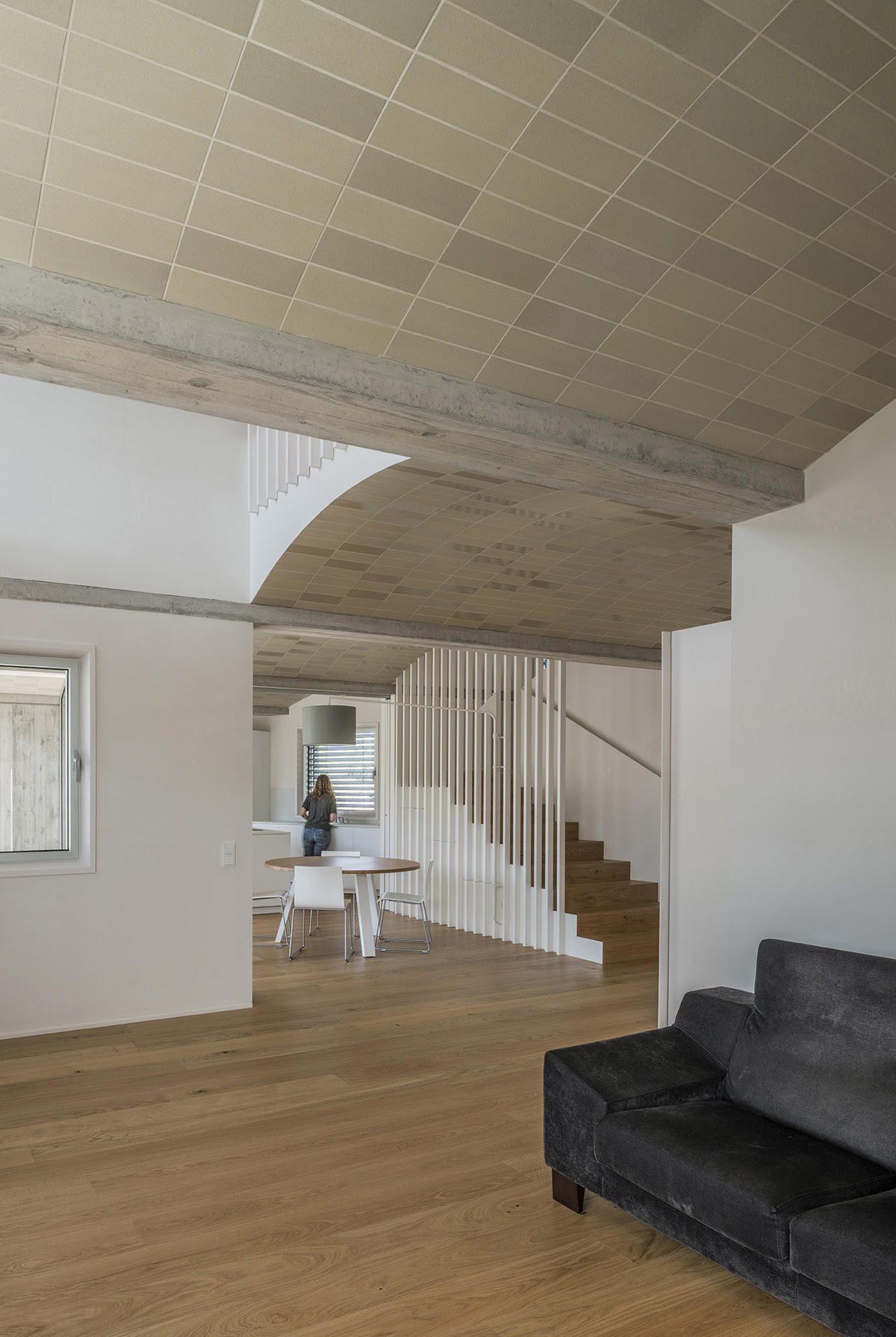 Es también el techo responsable de construir un estuche refinado para el interior, en contraste con el carácter áspero del hormigón encofrado en tabla al exterior. El patrón romboidal dibujado en la bóveda remite a lo textil, a los estampados, del mismo modo que el rasurado de los revestimientos de madera evoca un empapelado. Forma parte de la decoración, entendida como la capa que situamos entre nuestras vestimentas y las paredes de la casa. Pero aquí es inseparable de la misma estructura portante y de alguna forma convierte el techo en un elemento sensible a la variación lumínica y cromática. Actúa como una caja de resonancia que amplifica el intercambio con el entorno.