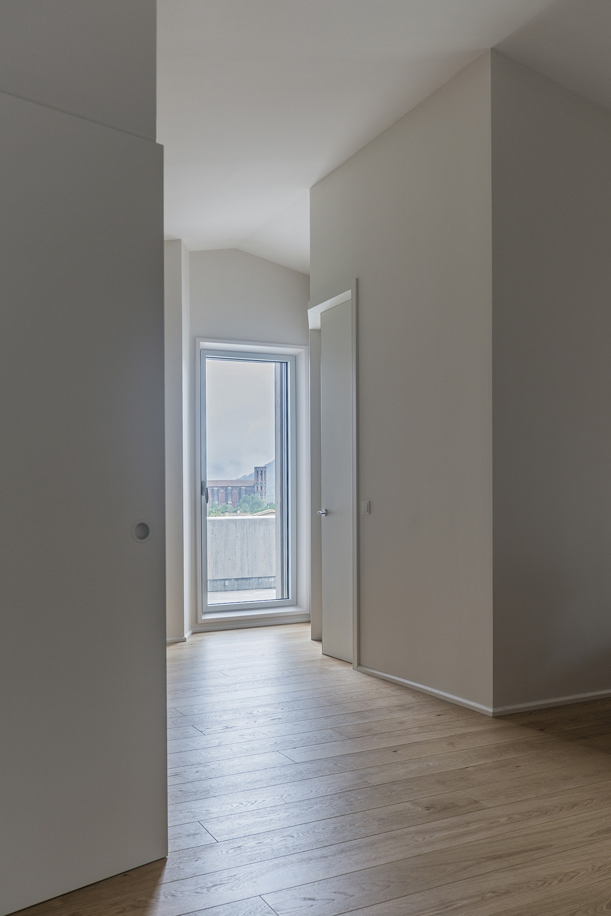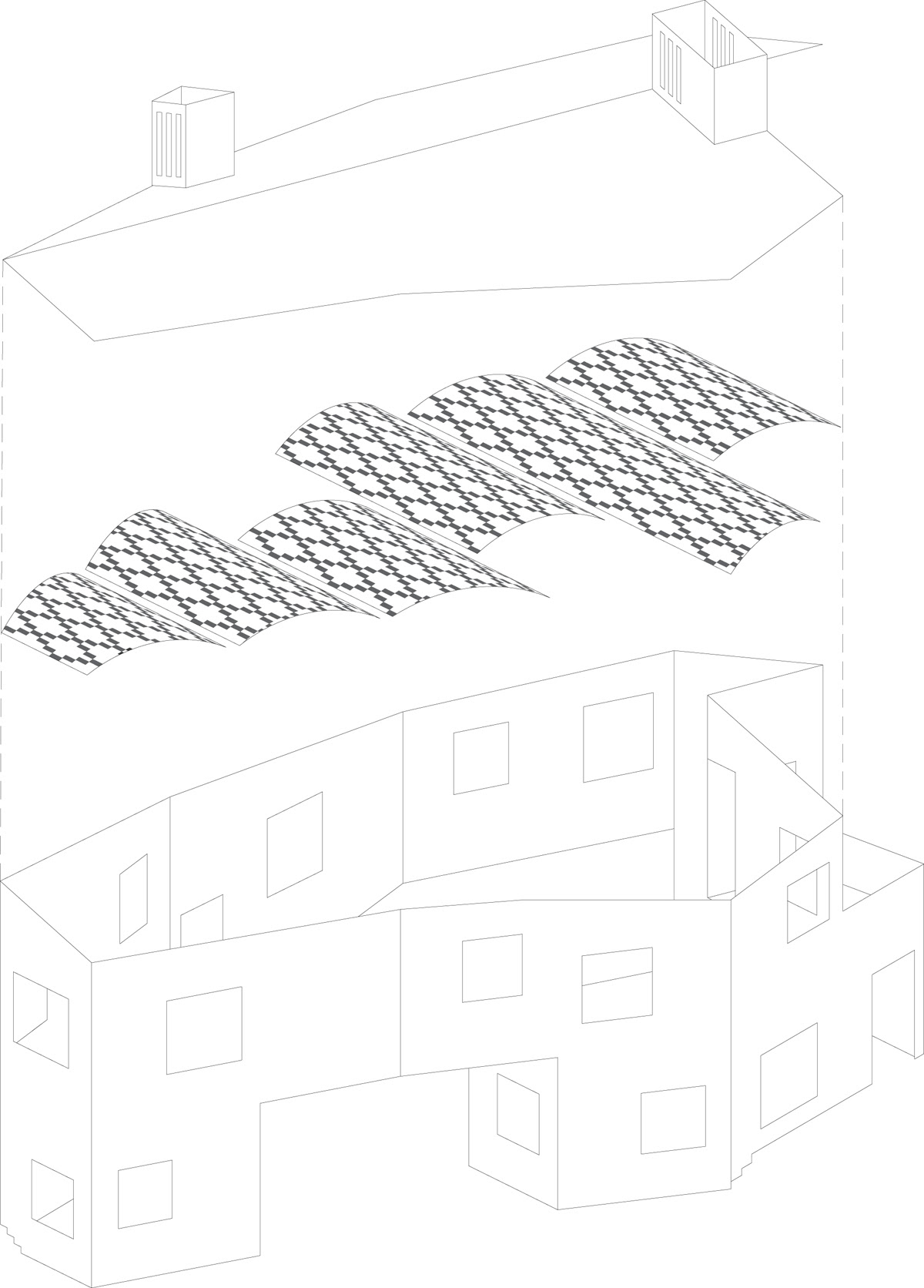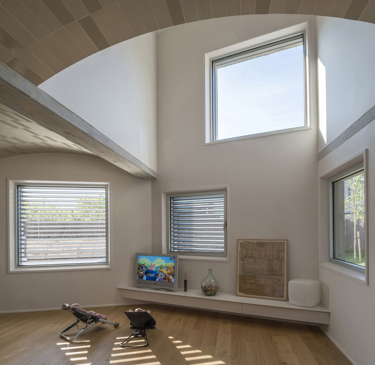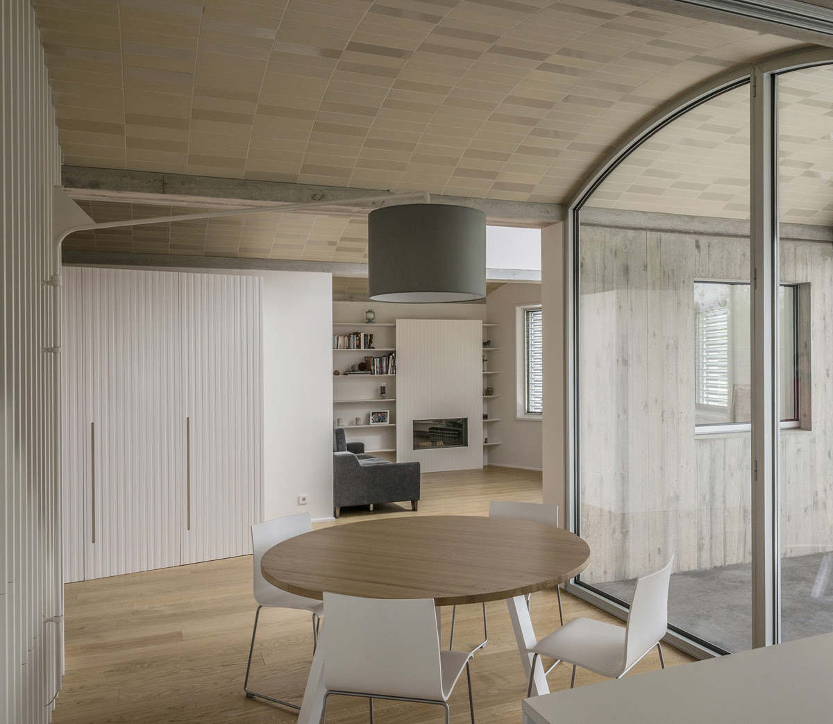 La actividad interior viene acompañada por la concavidad de las techumbres. En el piso superior las habitaciones quedan definidas por el intradós de las dos aguas de la cubierta. La planta baja está concebida como un espacio único en el que se diferencian ámbitos y rincones. A esta singularización contribuye decisivamente la estructura abovedada, coronando cada una de las actividades que se desarrollan bajo ella.
