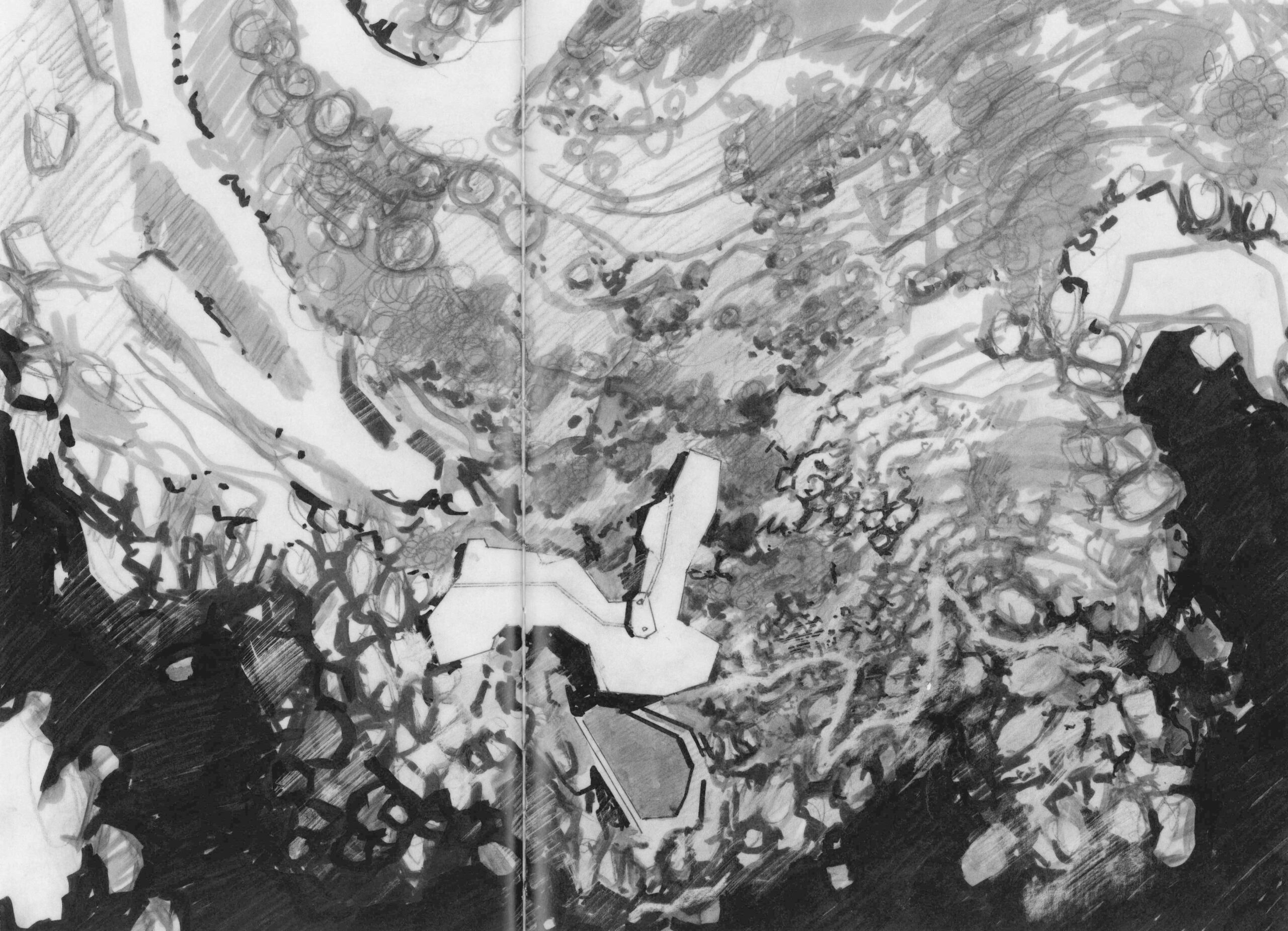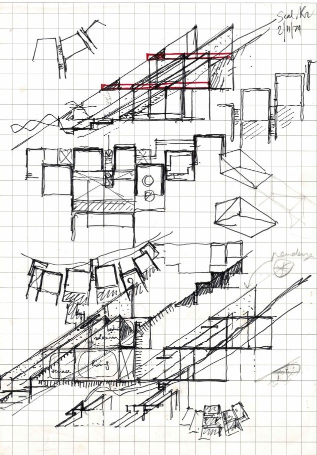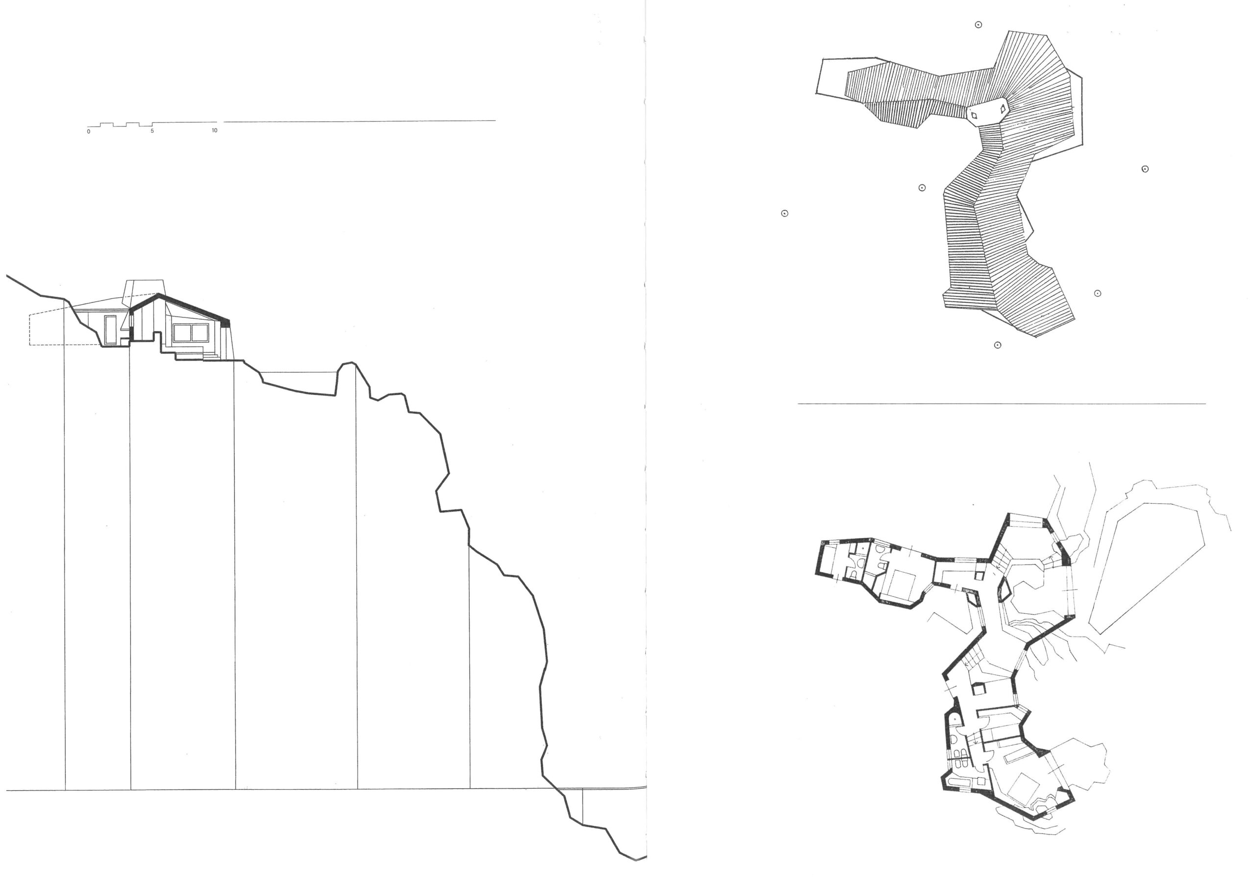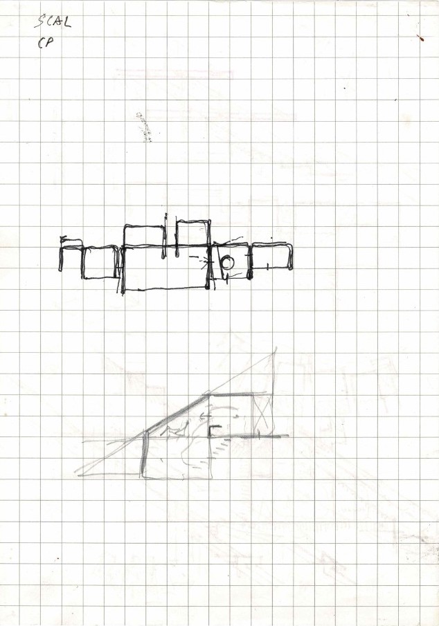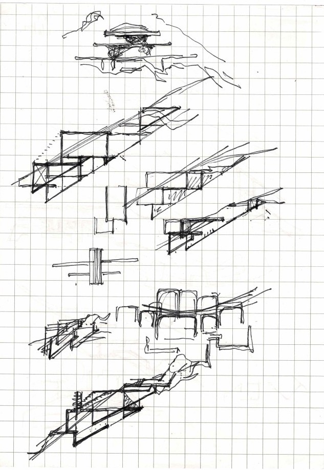 The third sketch was third time lucky. After innumerable visits to the site, my fears and doubts had gone. At last the forms sprang up freely and the interior levels were those of the natural site. The plan came into being almost straight away. Smaller and more intimate than the earlier ones, I made it in just a few days based on two years of thinking and working.