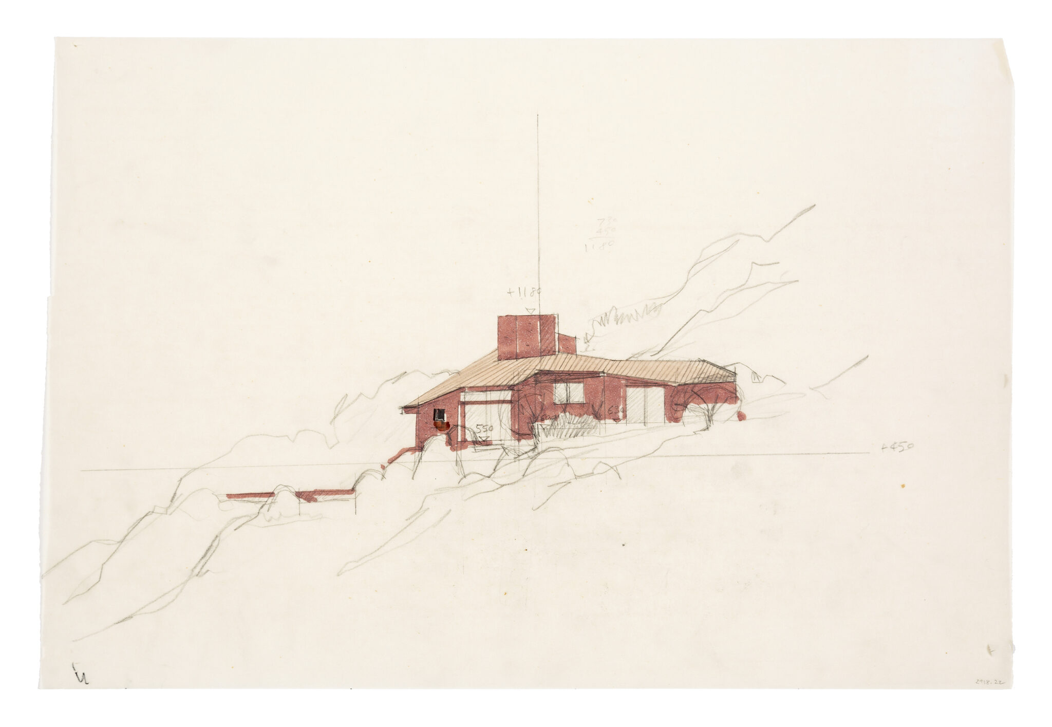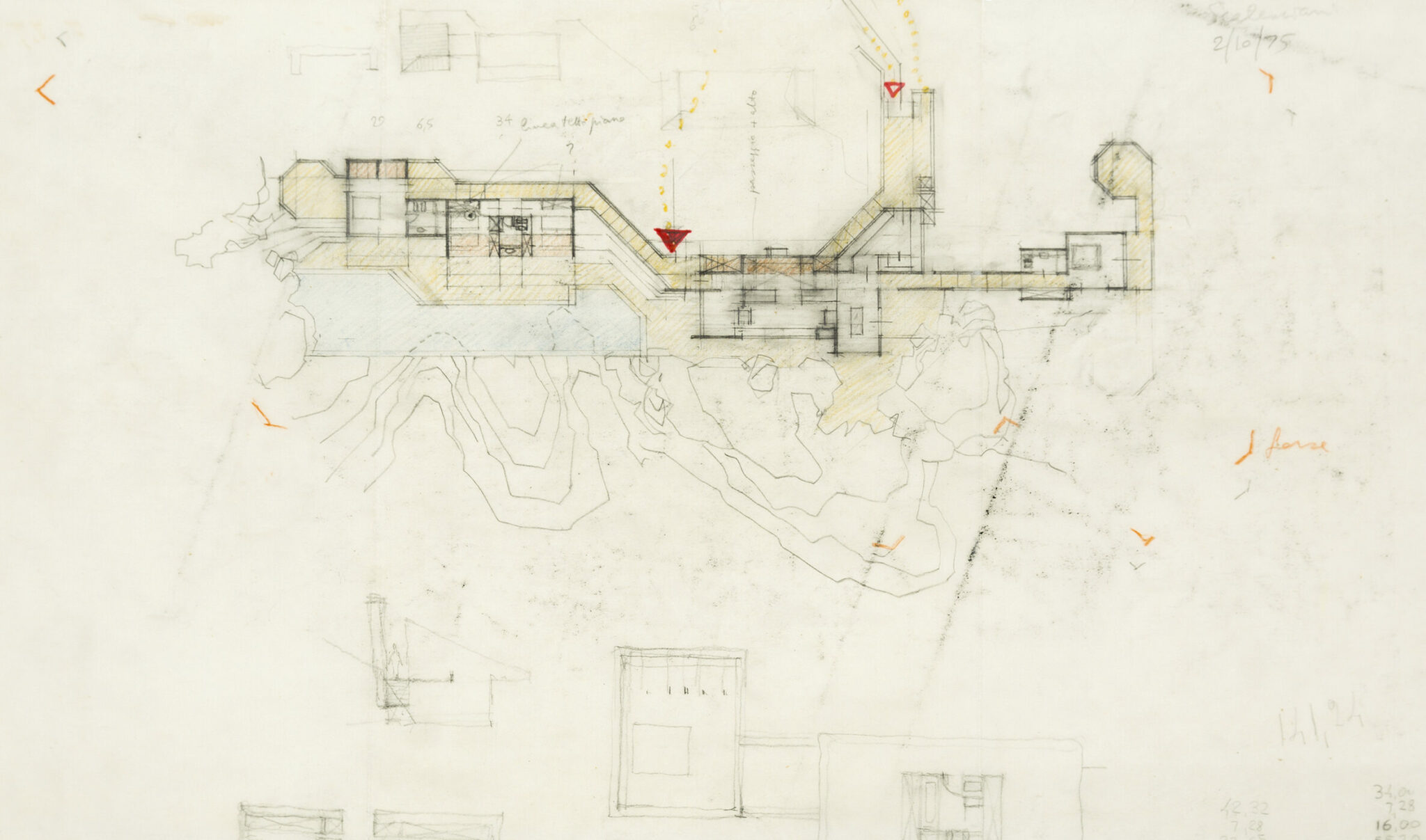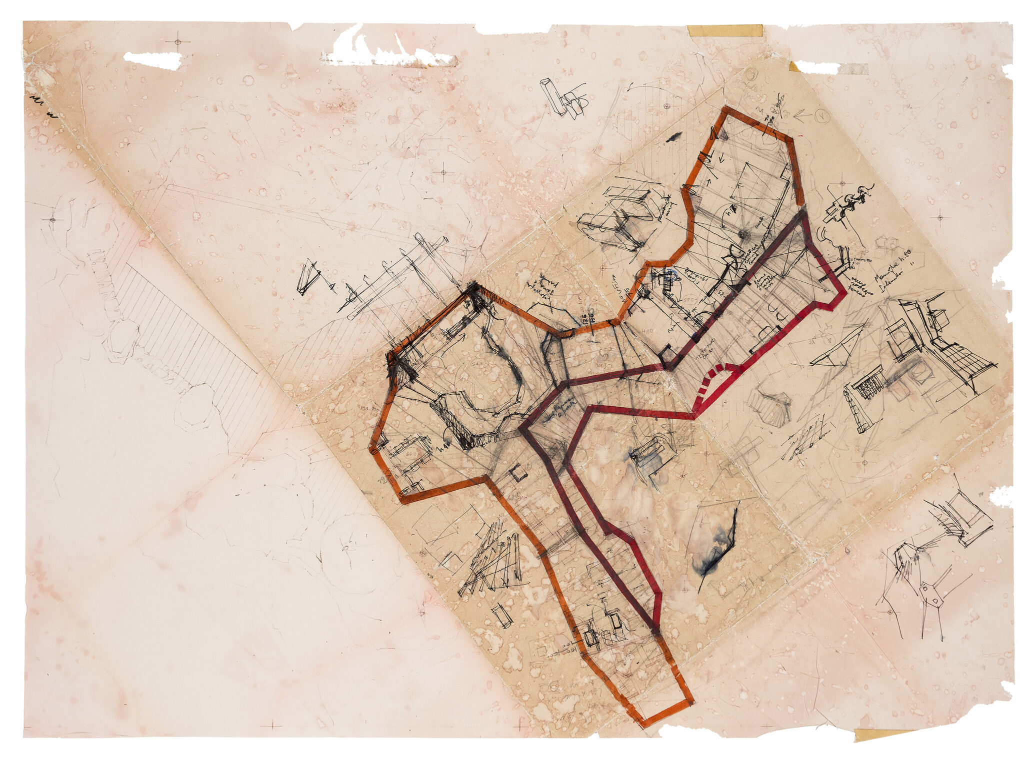 Alberto Ponis (1933), working site plan, Casa Scalesciani, 1977. Pencil, black and red ink over office print on pink paper, 610 × 835 mm. DMC 2918.1.