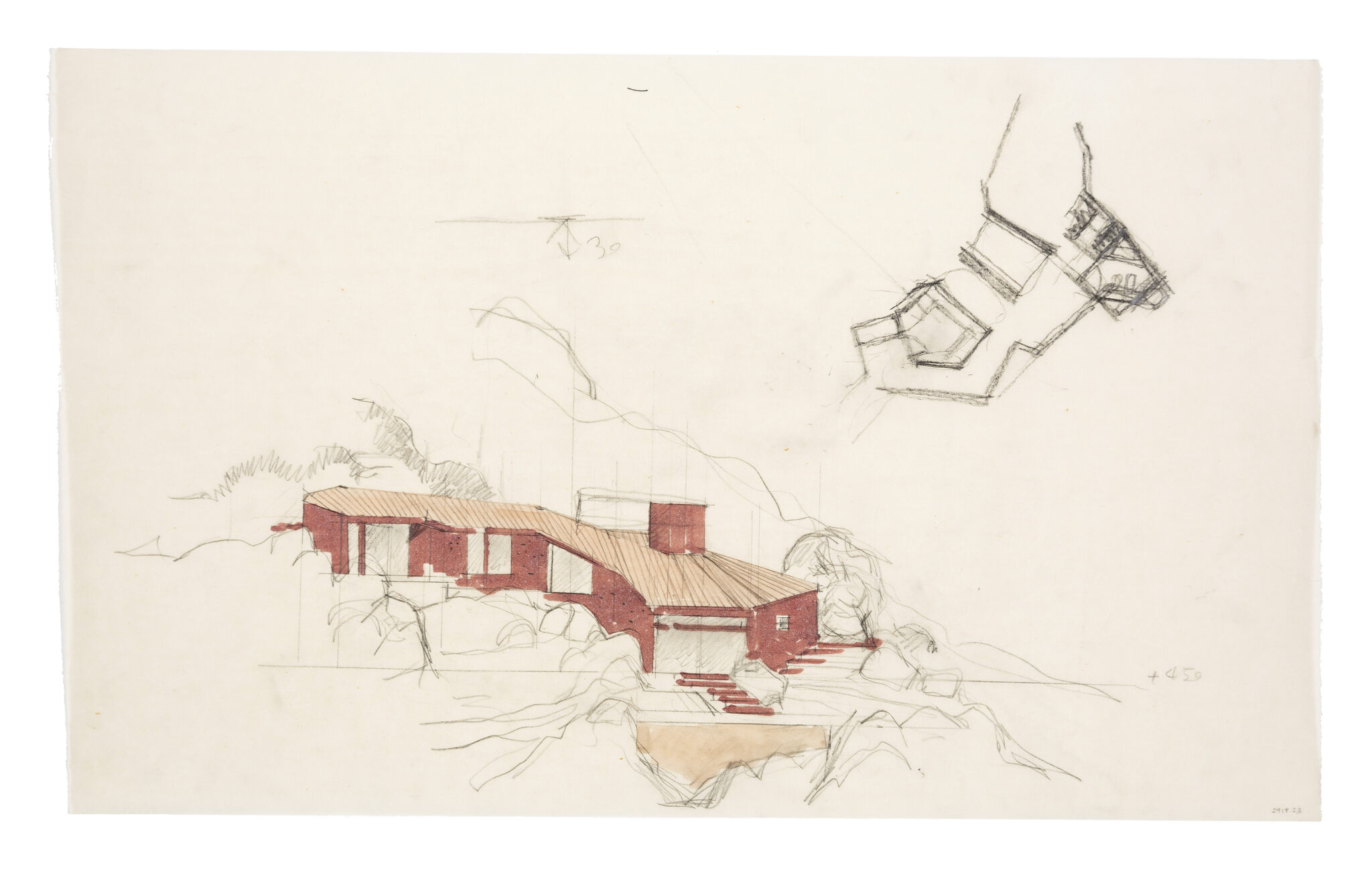 Alberto Ponis (1933), perspective and plan, Casa Scalesciani, 1977. Pencil and wash on tracing, 330 × 450 mm. DMC 2918.23.