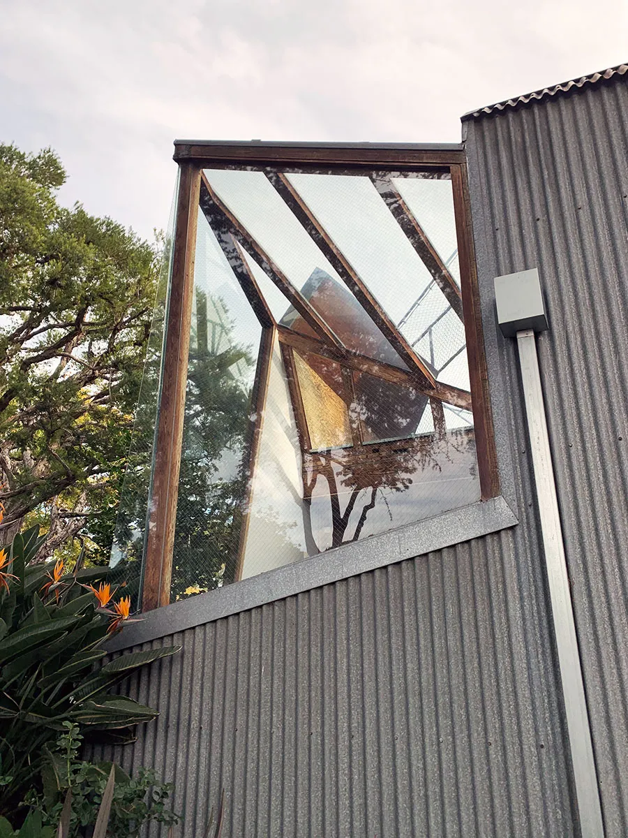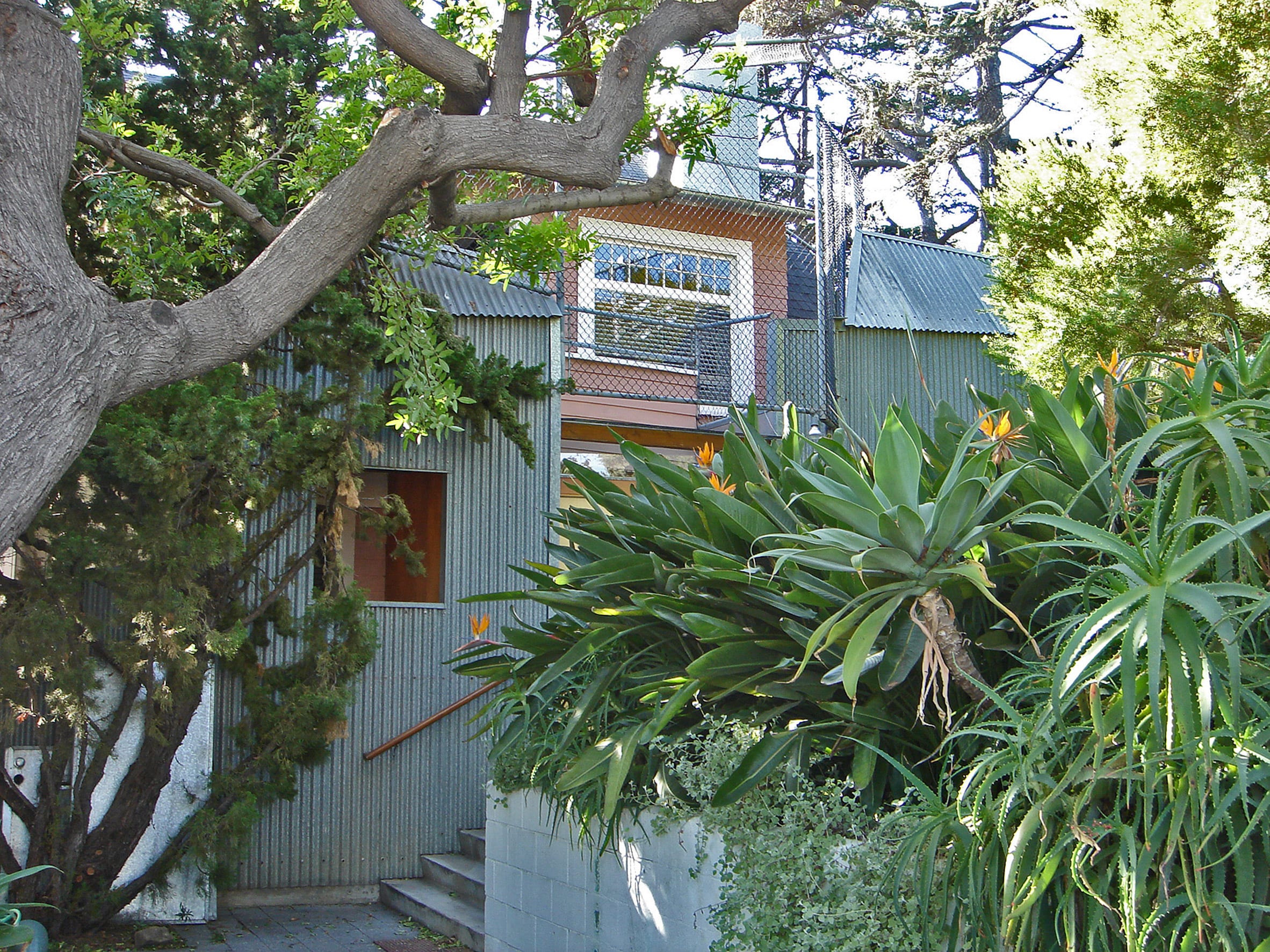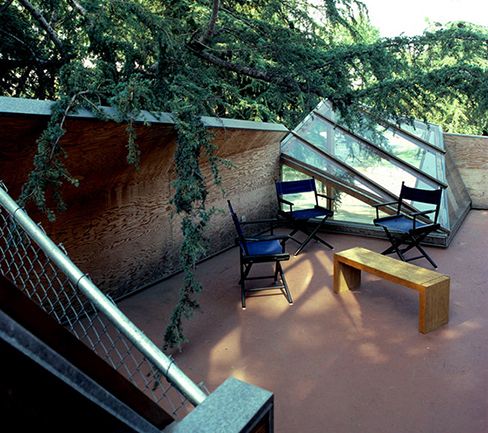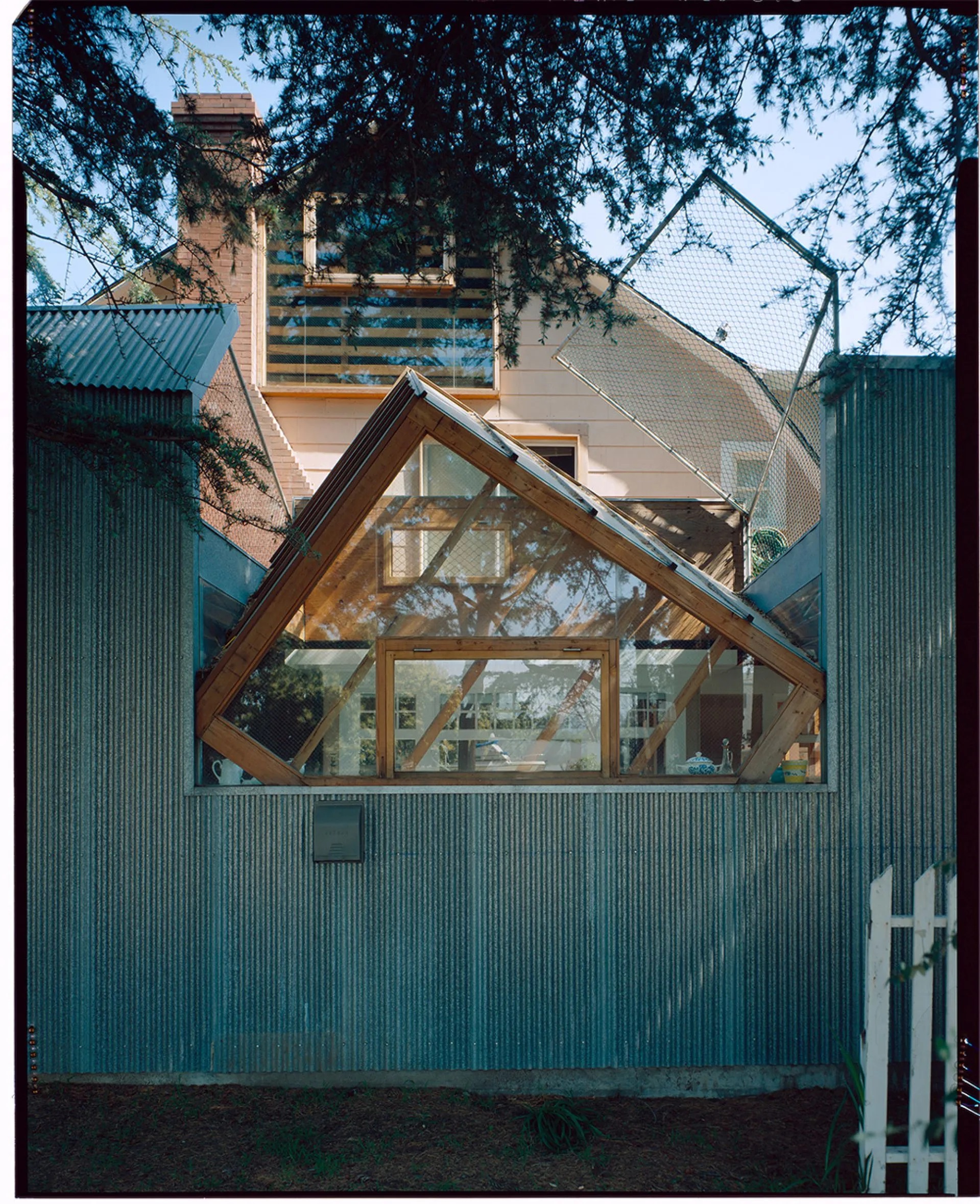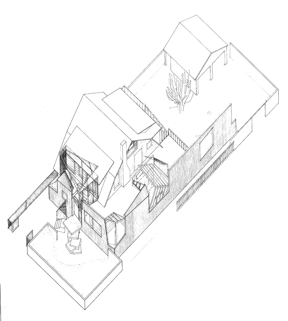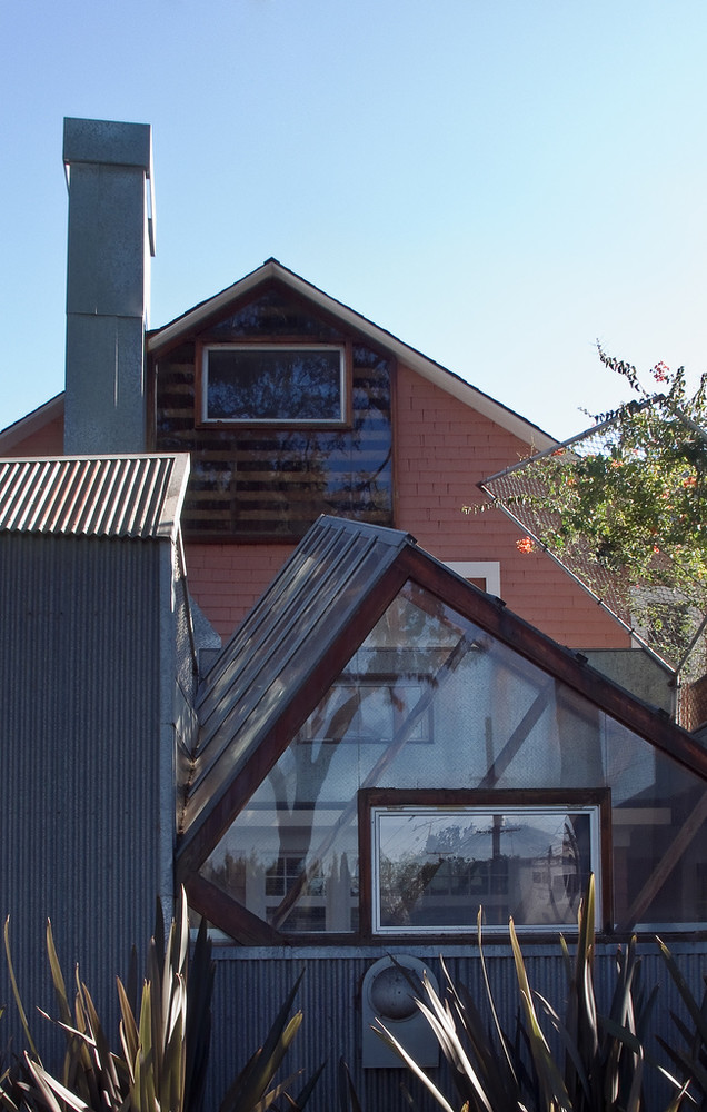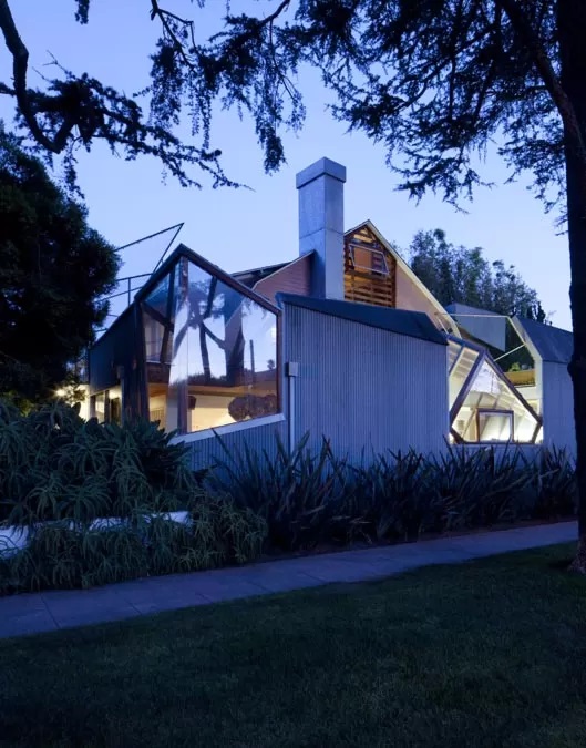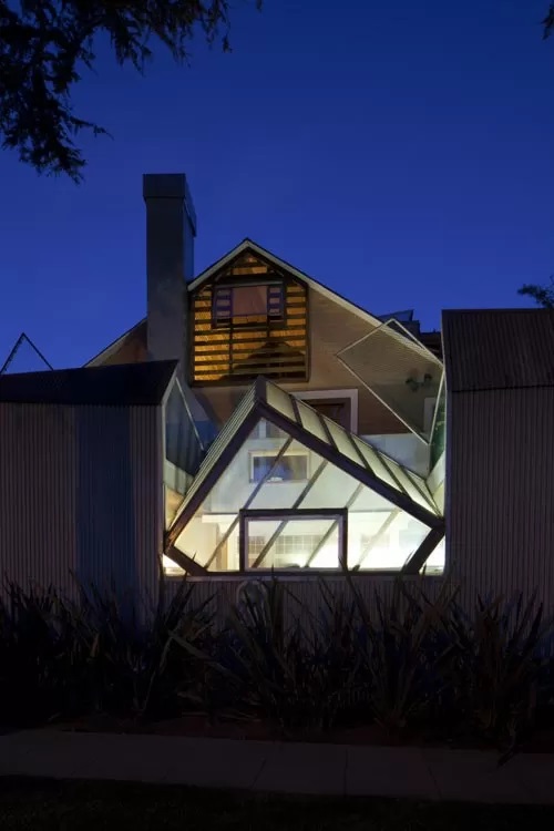 The entrance is barely discernible amidst the jutting angles of the exterior, which Gehry created from wood, glass, aluminum, and chain-link fencing. The apex of the old house peeks out from within this mix of materials, giving the impression that the house is consistently under construction.