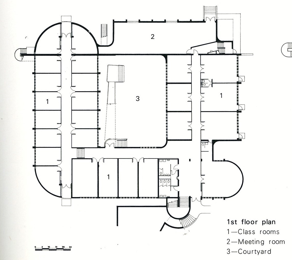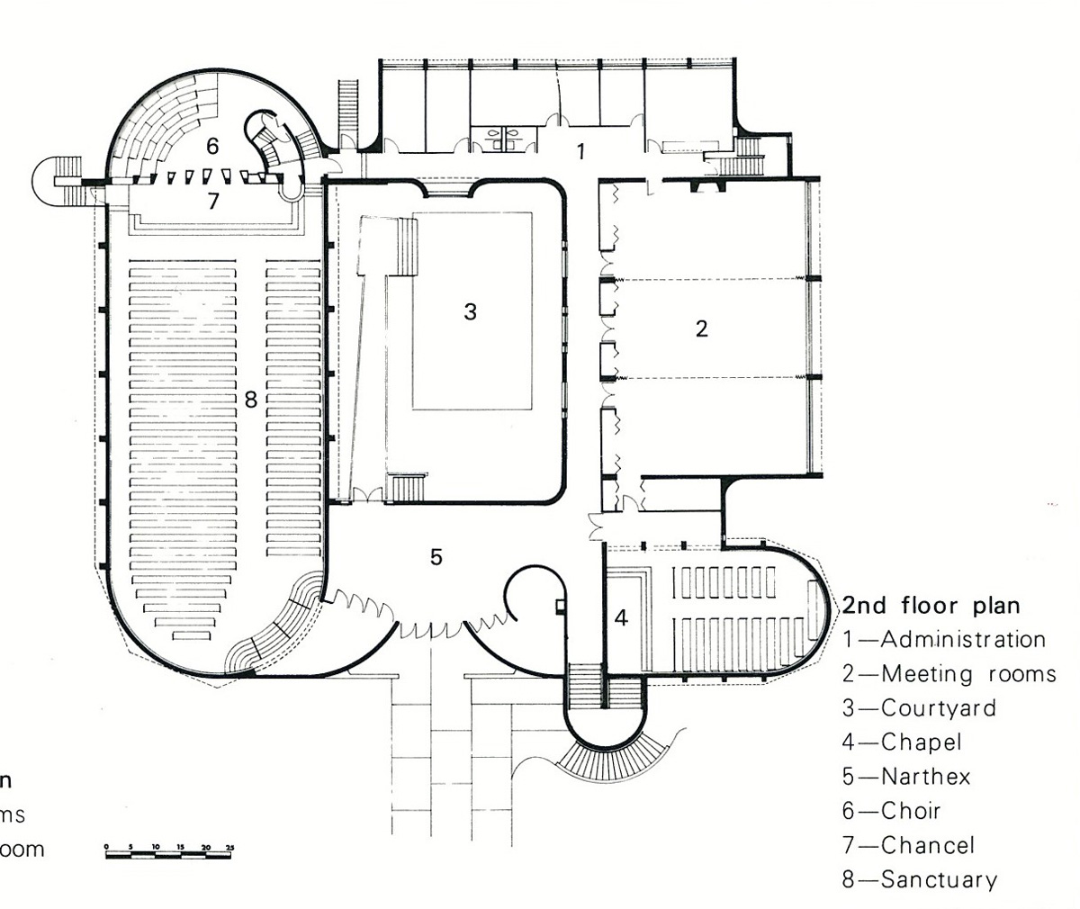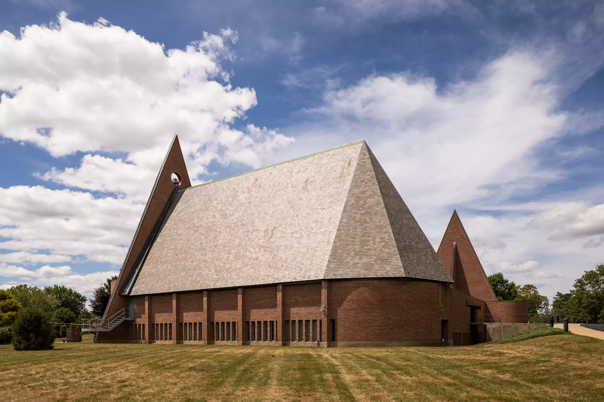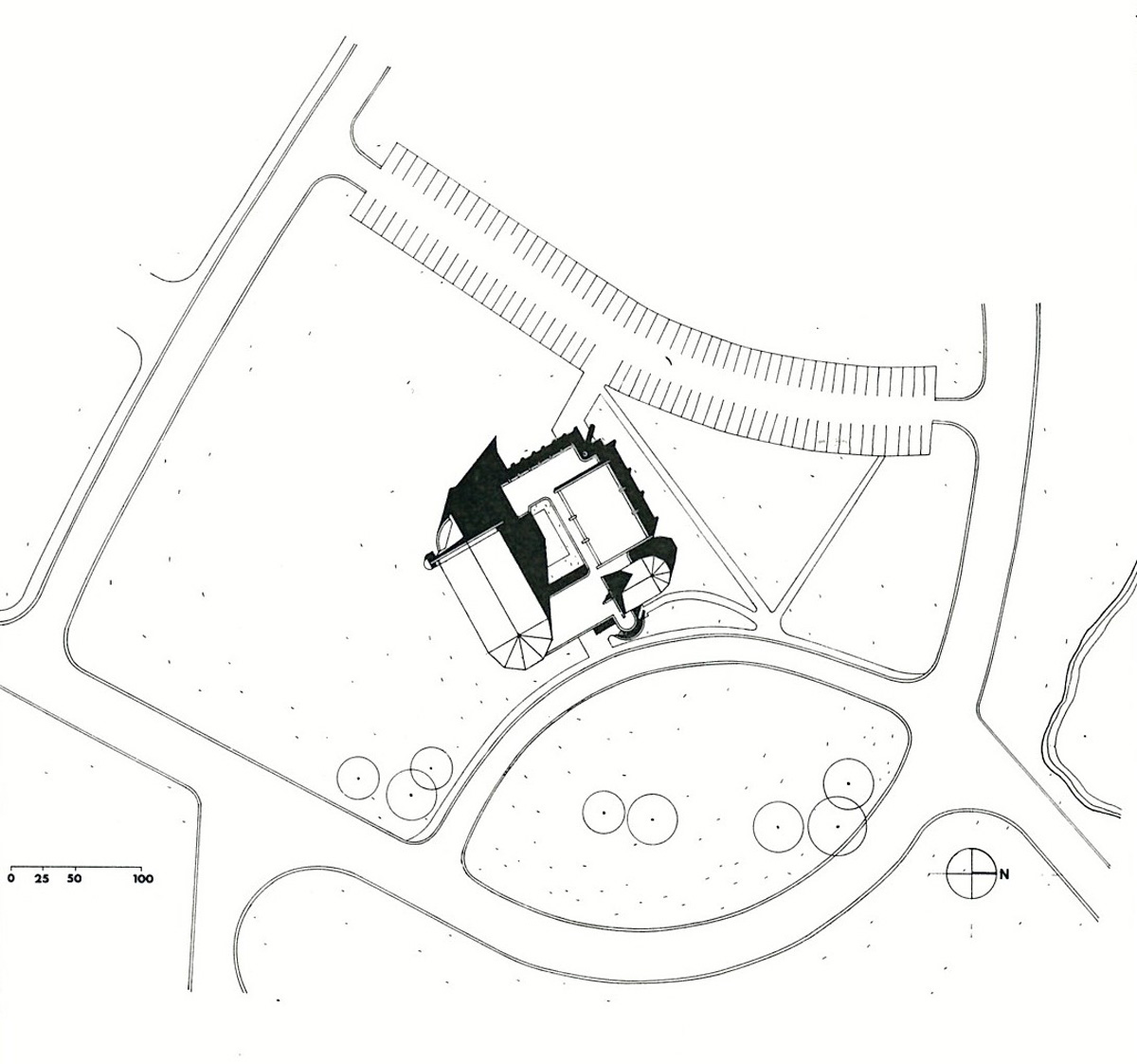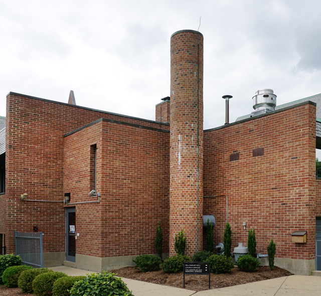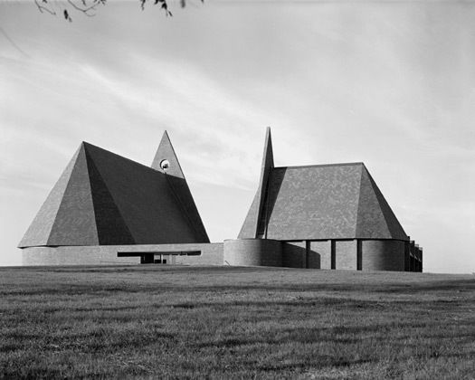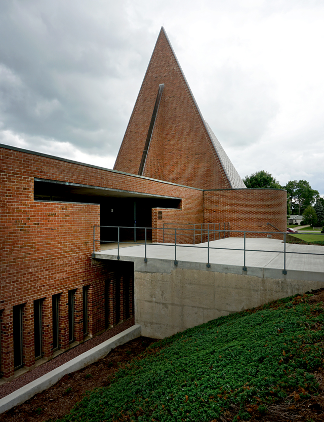 Bruegmann refuses to come down on the side of any of these possible interpretations, or to highlight what he thinks is Weese’s best work. A whole section could have been devoted to Weese’s many buildings in Columbus, Indiana, which include the sublime First Baptist Church (1962–65) and a branch of the Irwin Union Bank (not pictured in the book), both of which stand up in comparison to the better-known Columbus church and bank of Weese’s longtime friend Eero Saarinen. The church, in particular, is an essay in thoughtful use of materials, sympathetic siting, and sanctuary without fuss. When I first encountered it, appearing to sail across the grass, I suddenly wondered where on earth I was.