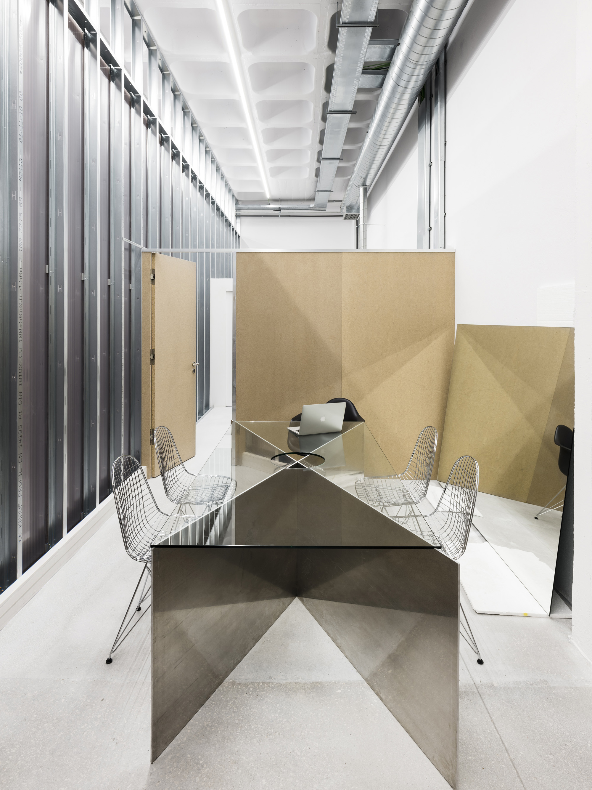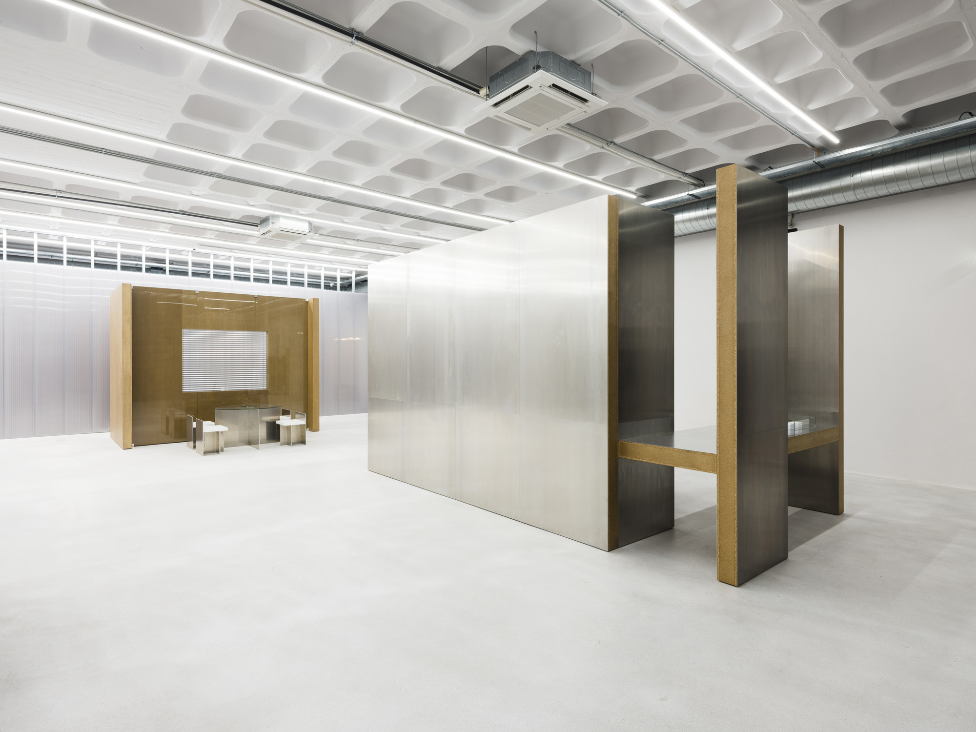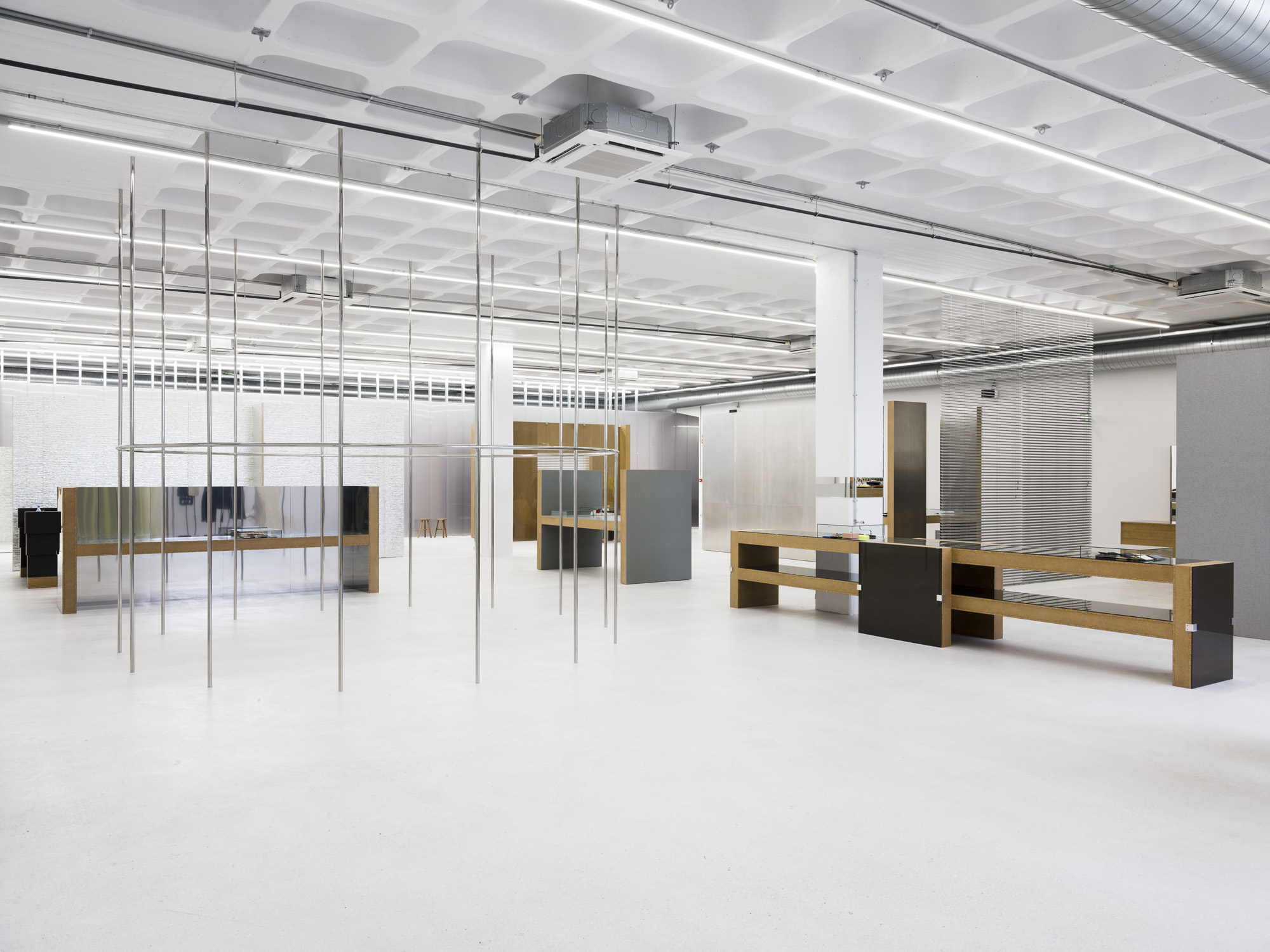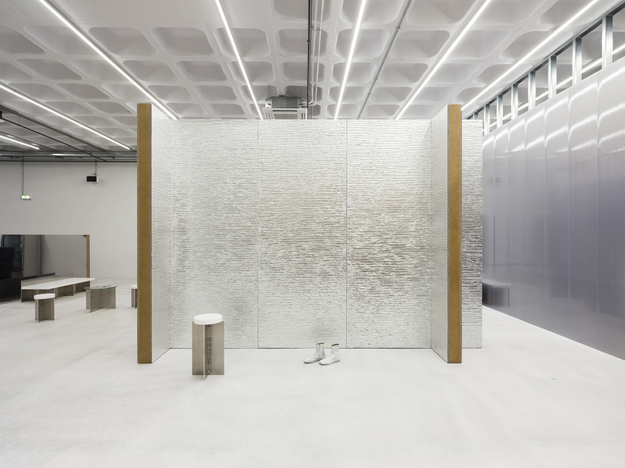 For furniture, using visible chipboard panels, covered by untreated grey or silver materials, the pieces are monumental, resembling fragments of architecture. Using extremely basic forms the pieces build up the stores’ radicality and are designed for the needs of each department – playing with what is visible or purposefully obstructed, forcing visitors to explore the space.