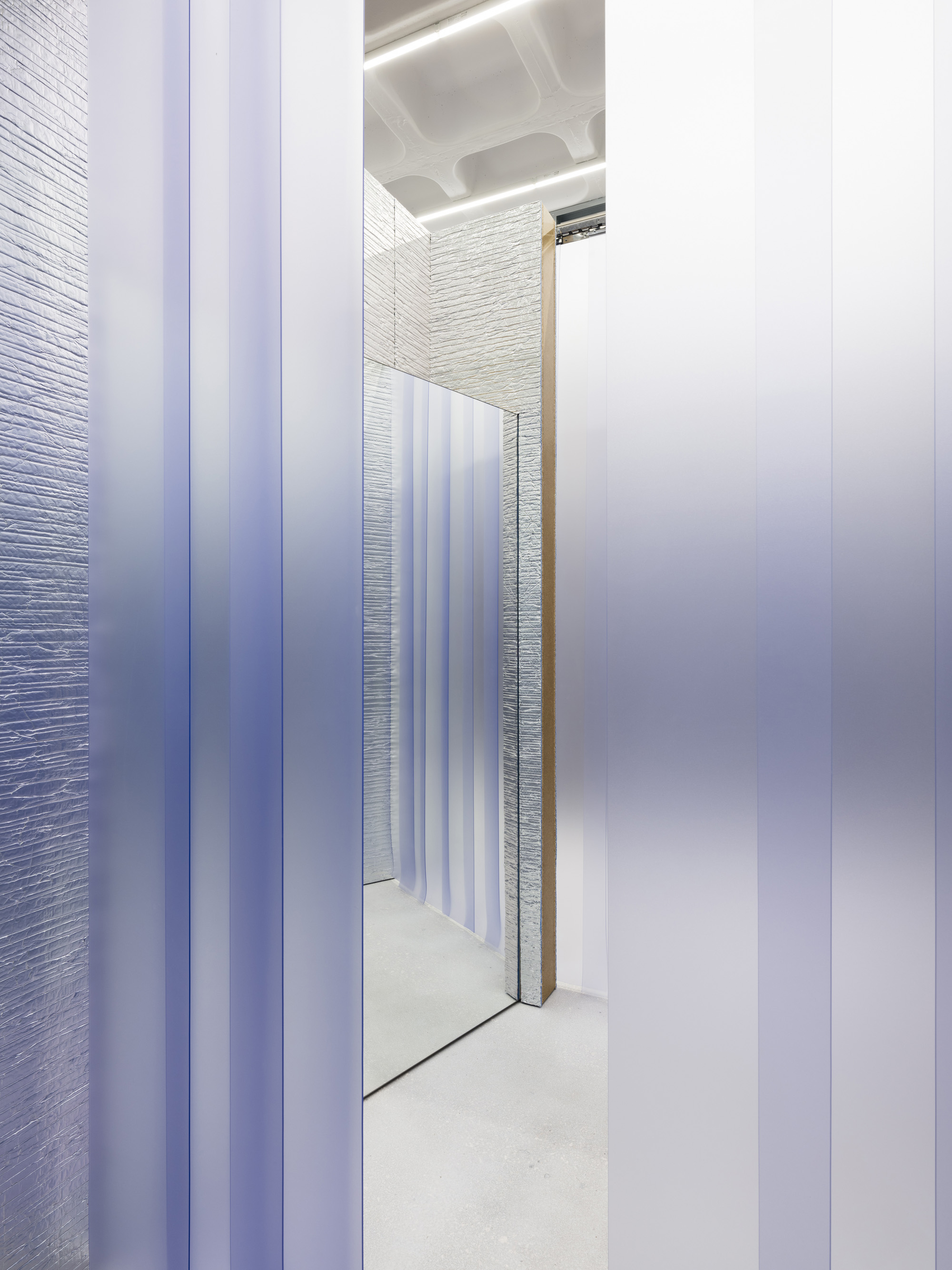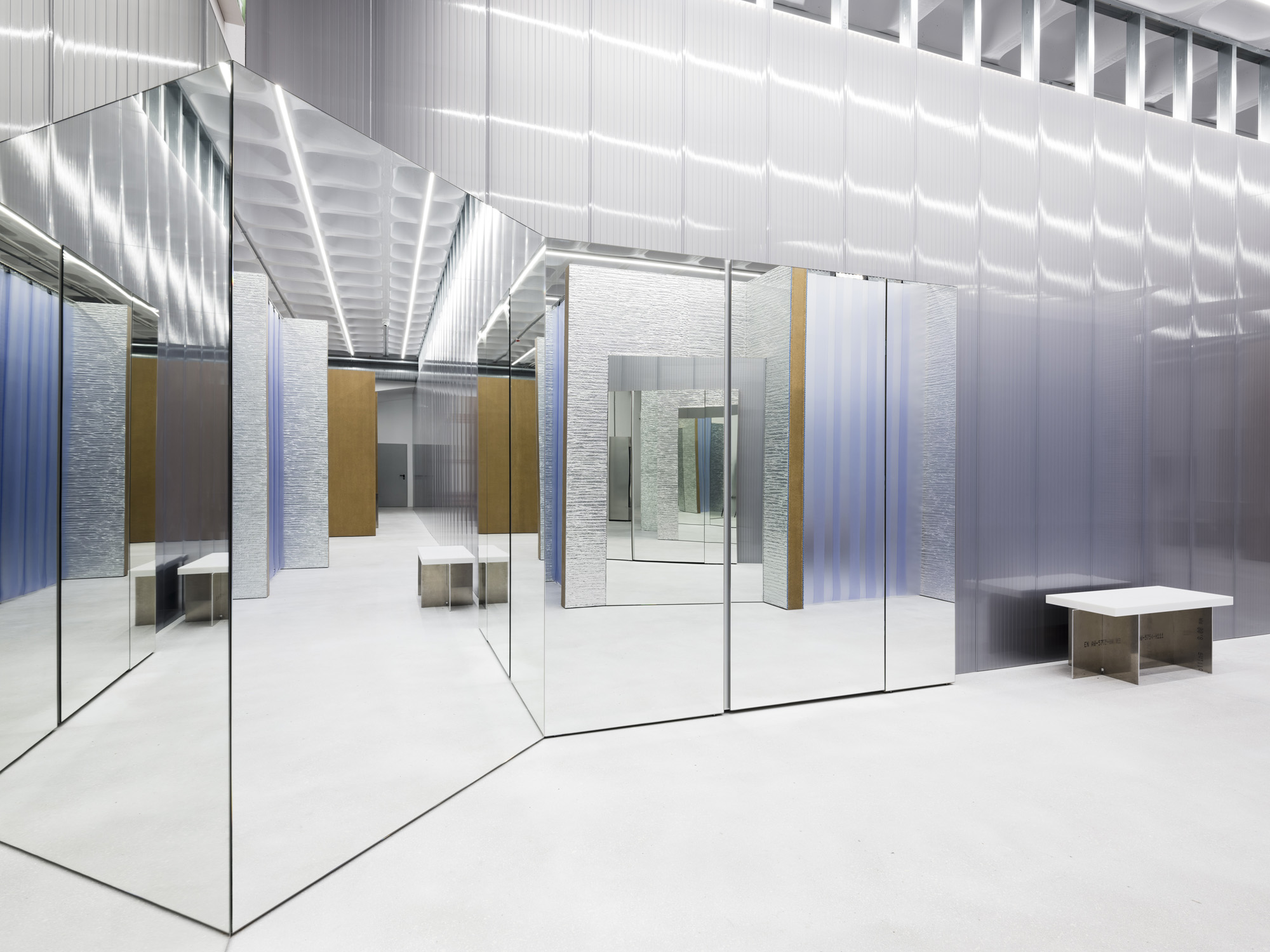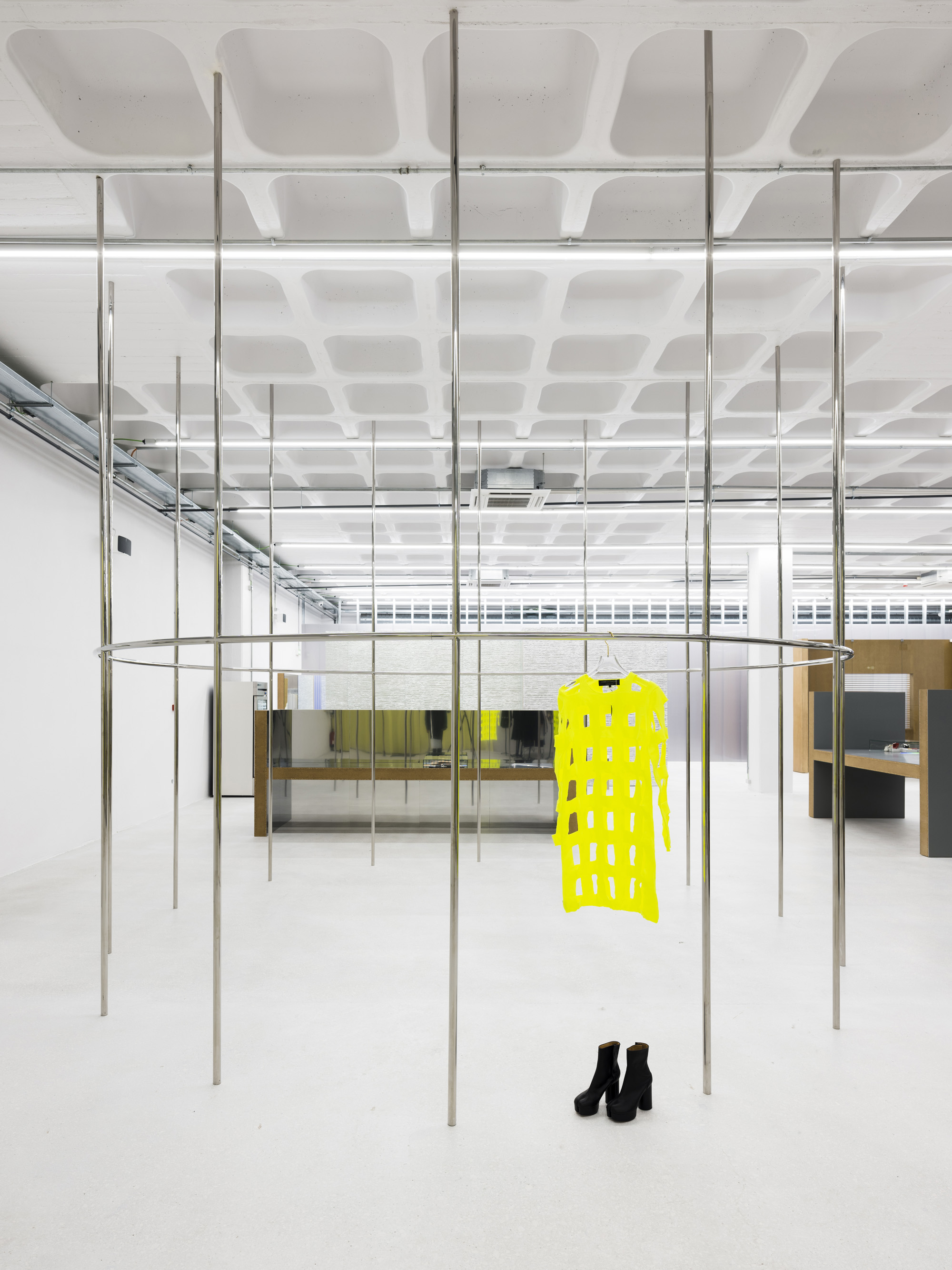 For furniture, using visible chipboard panels, covered by untreated grey or silver materials, the pieces are monumental, resembling fragments of architecture. Using extremely basic forms the pieces build up the stores’ radicality and are designed for the needs of each department – playing with what is visible or purposefully obstructed, forcing visitors to explore the space.