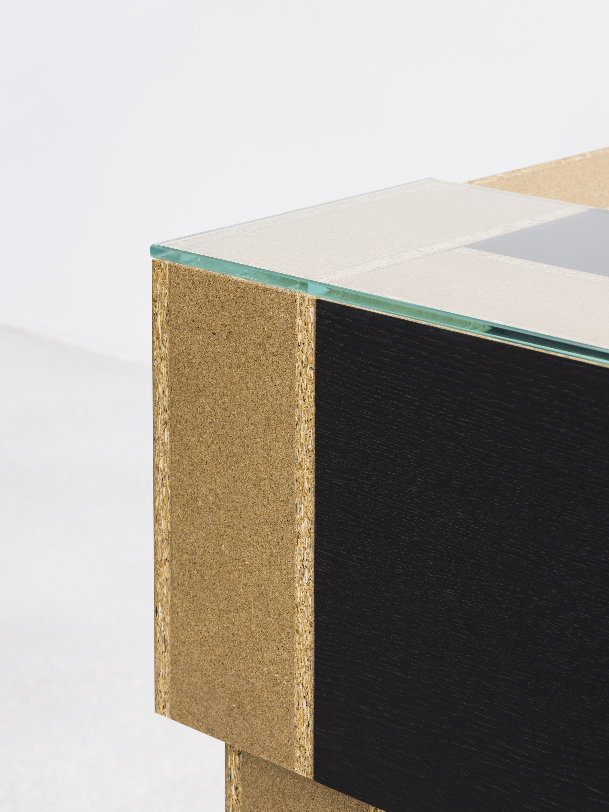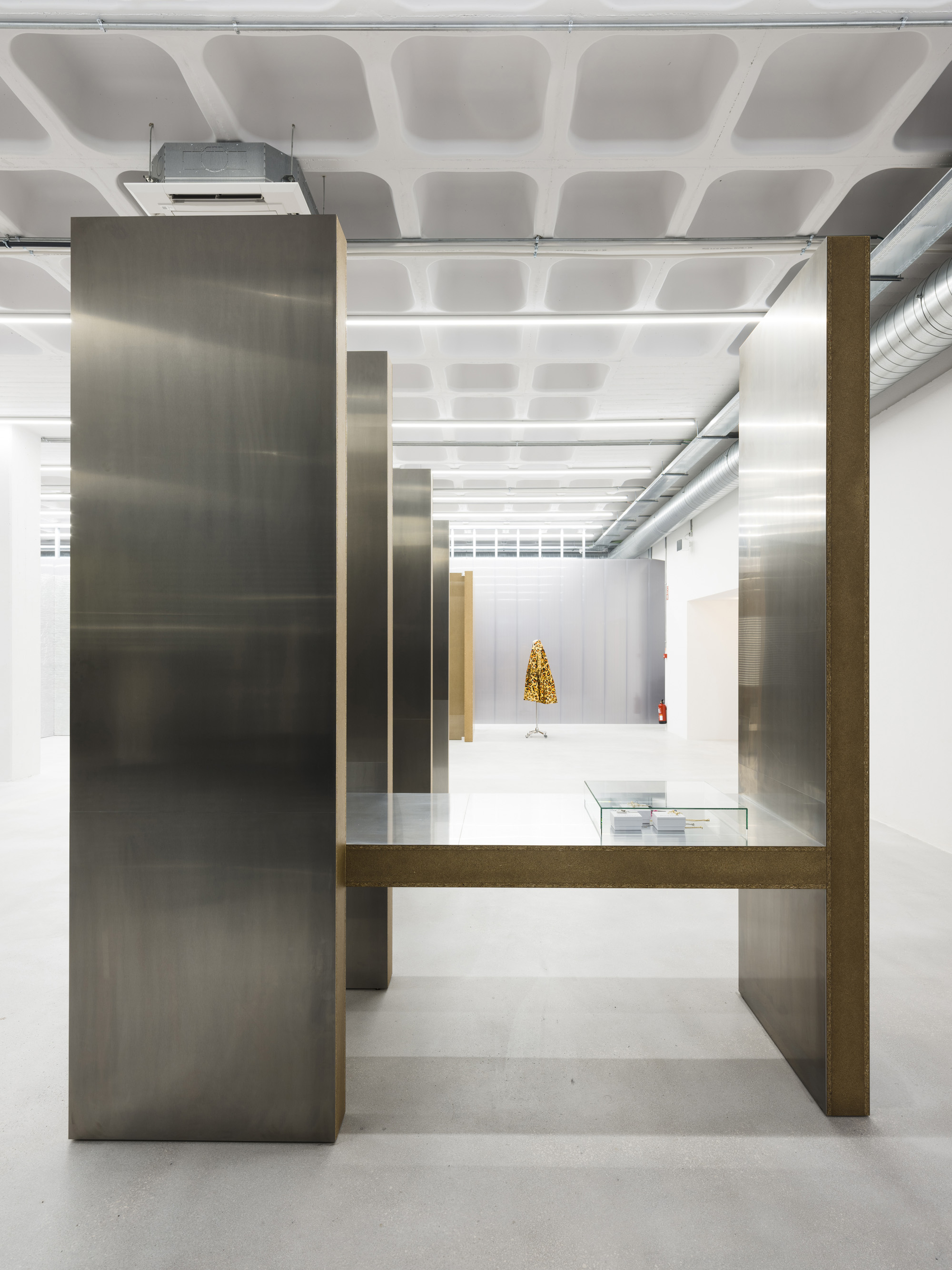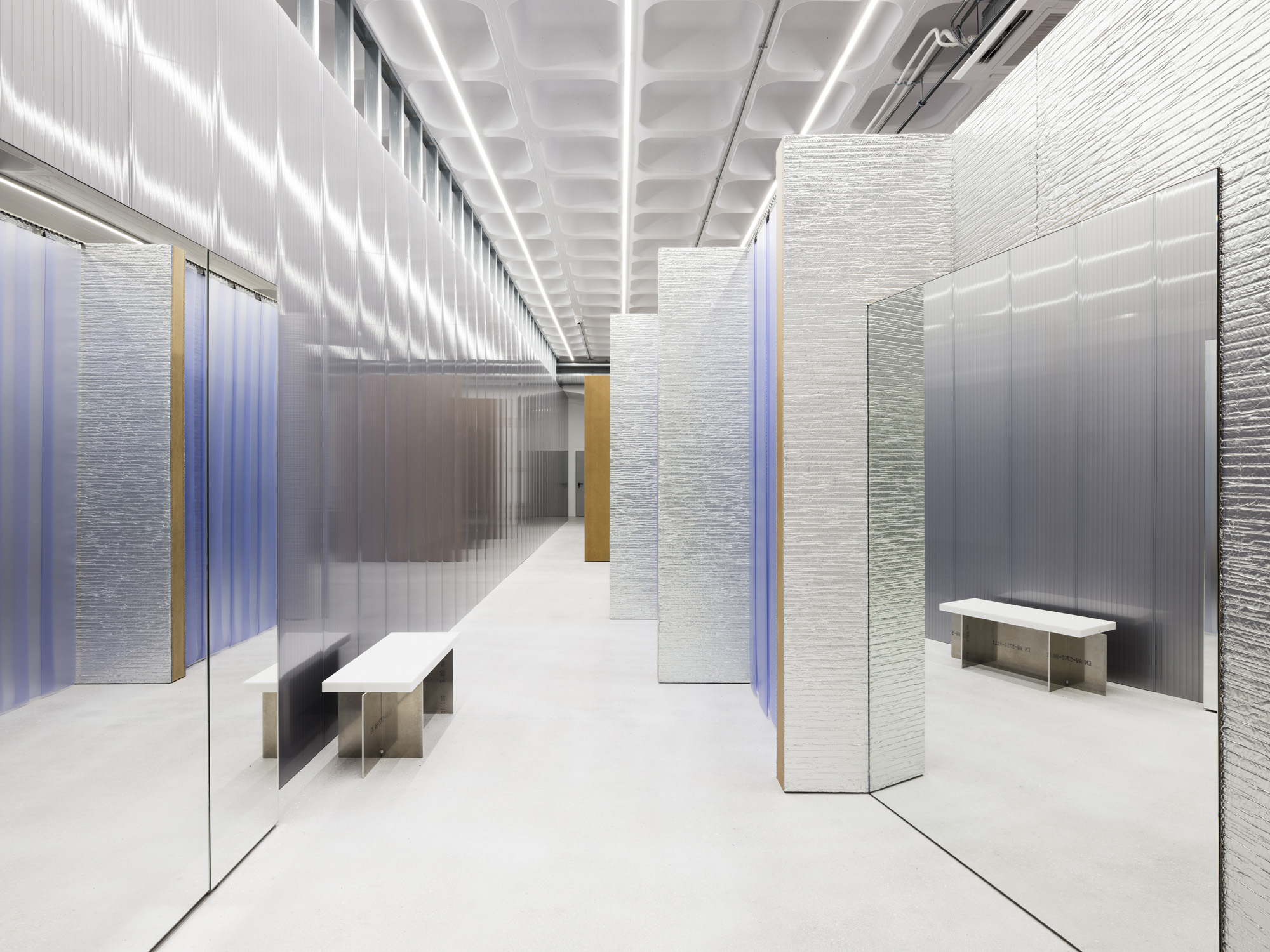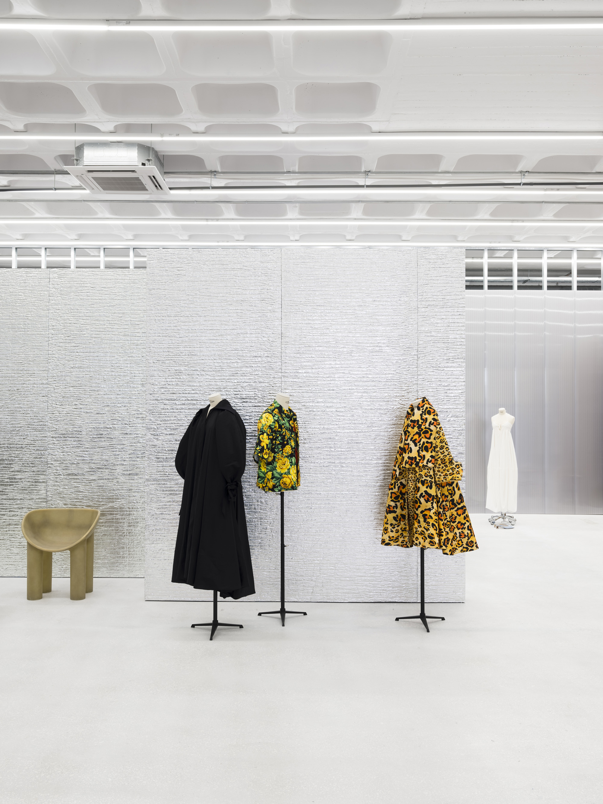 For furniture, using visible chipboard panels, covered by untreated grey or silver materials, the pieces are monumental, resembling fragments of architecture. Using extremely basic forms the pieces build up the stores’ radicality and are designed for the needs of each department – playing with what is visible or purposefully obstructed, forcing visitors to explore the space.