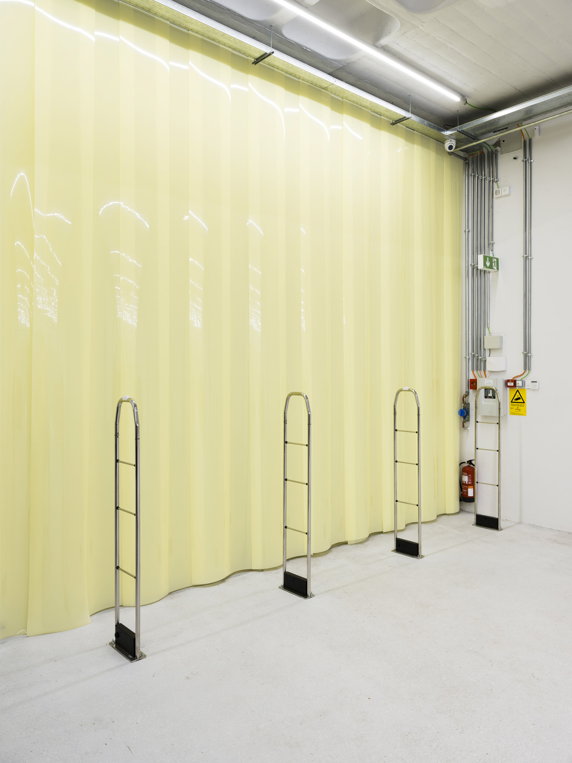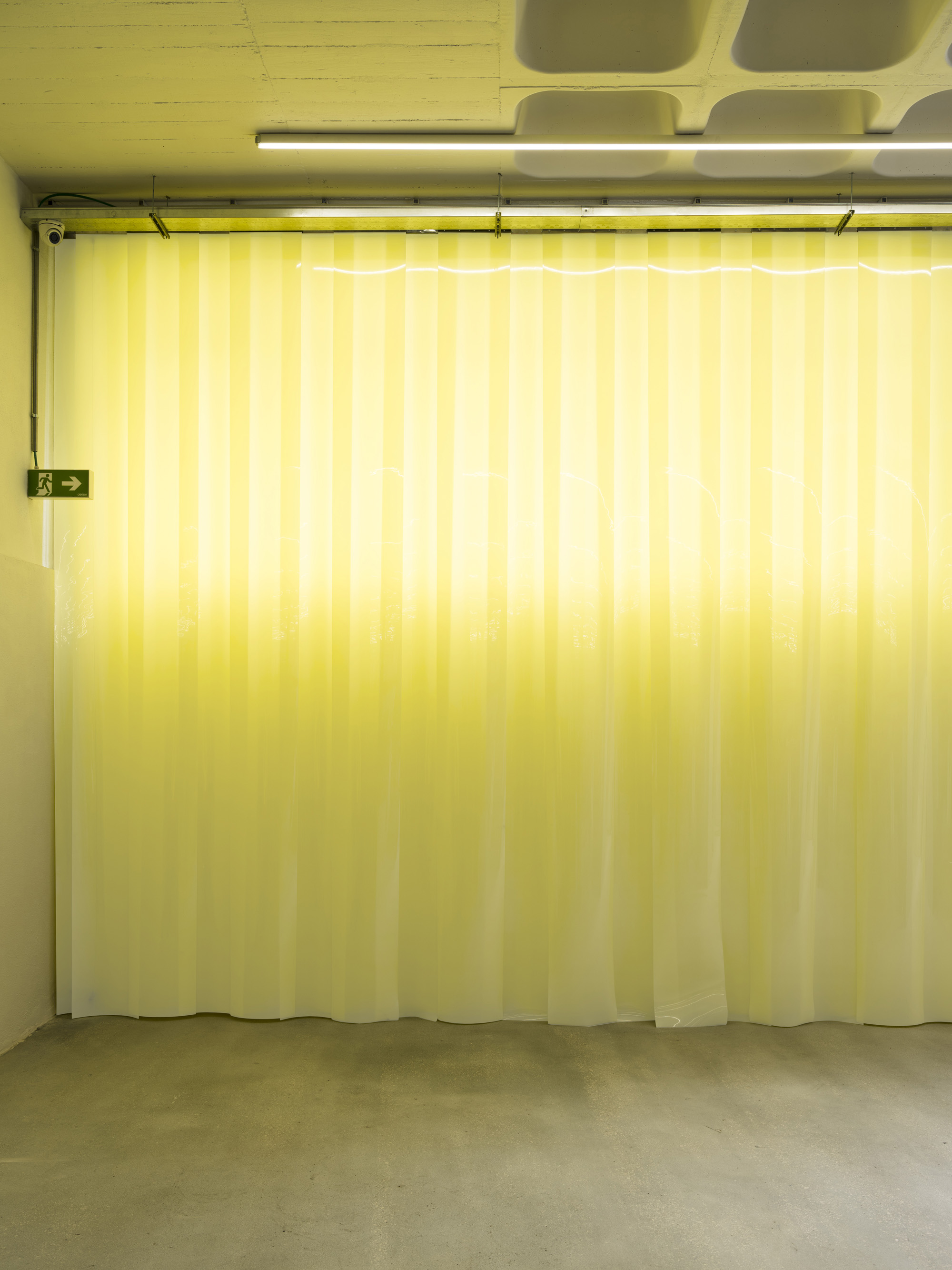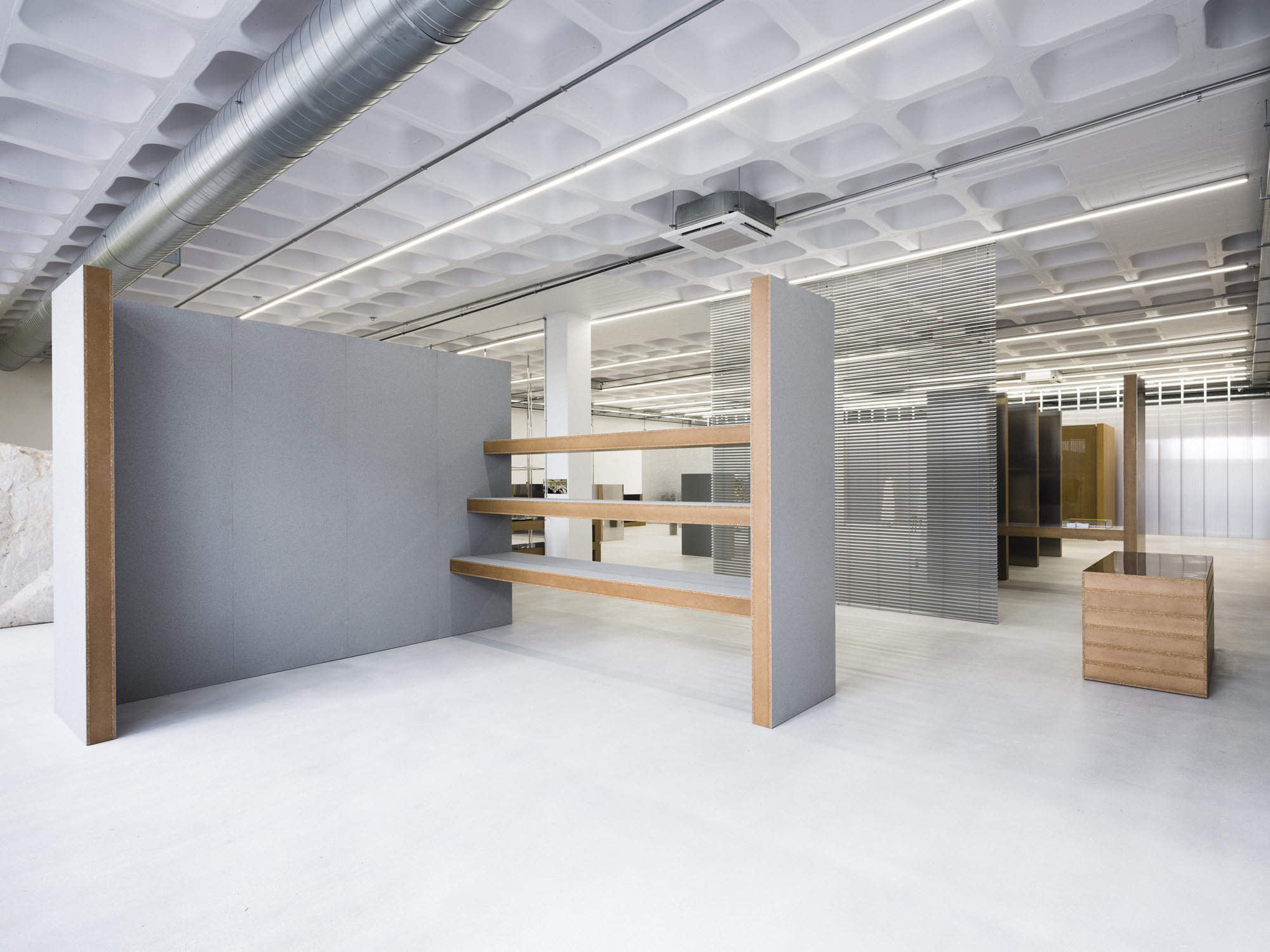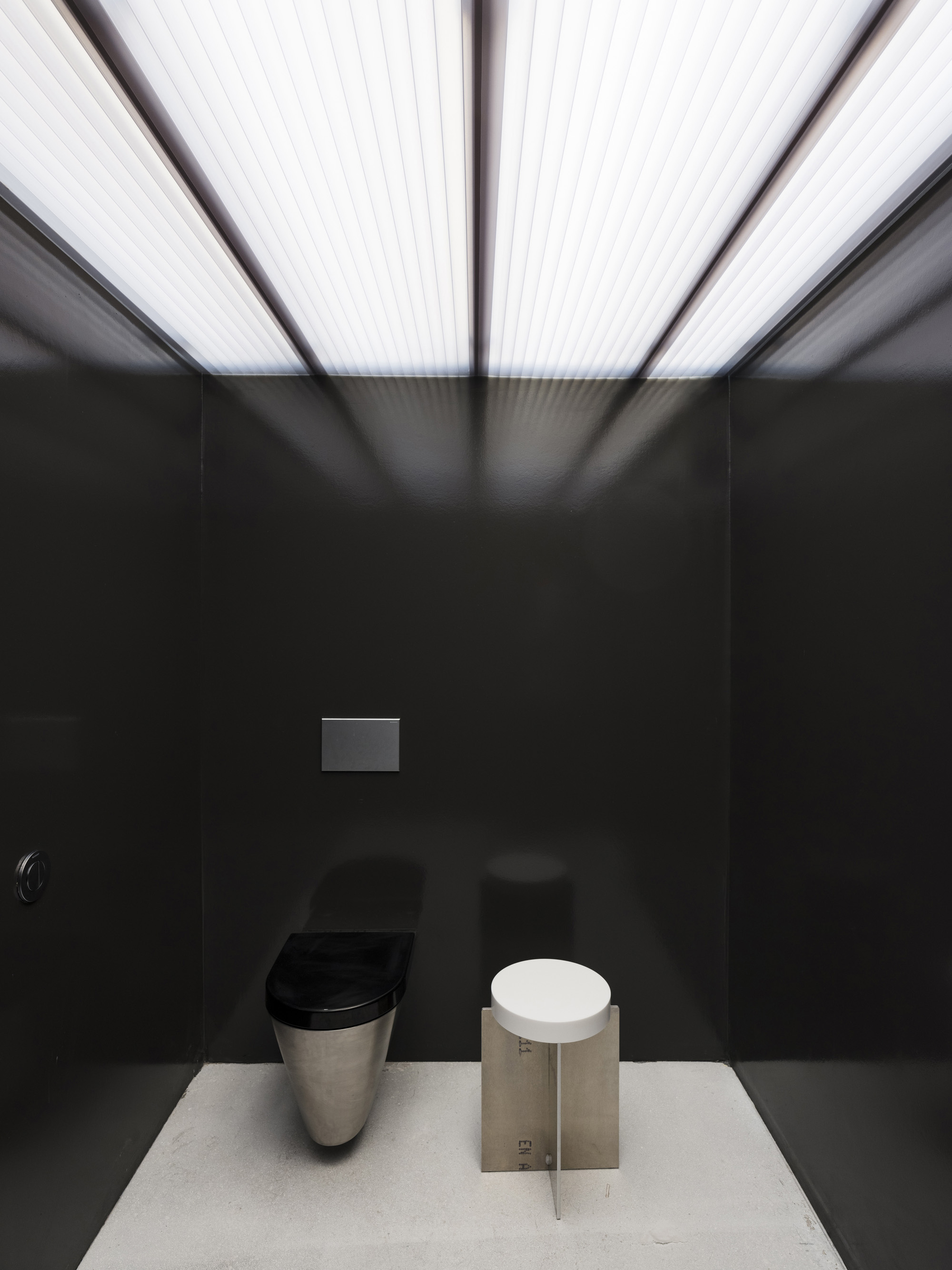 The artificial lighting, at first glance seems to be a purely functional element to light the whole space in a homogeneous way as you might find in warehouses or supermarkets, though on closer observation one can see that the spacing between each lighting line, installed parallel to the facade, becomes more dense as you move into the depth of the space.