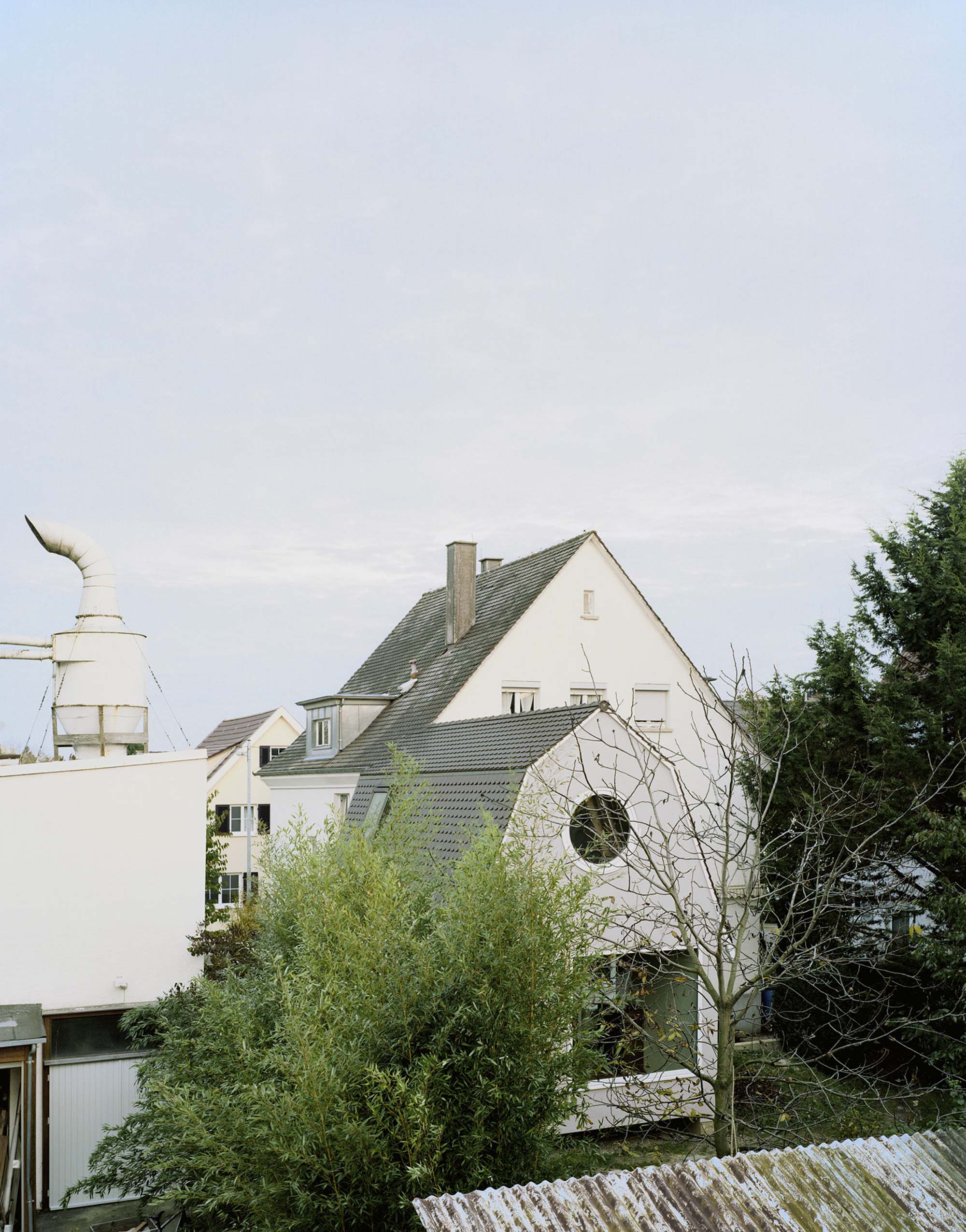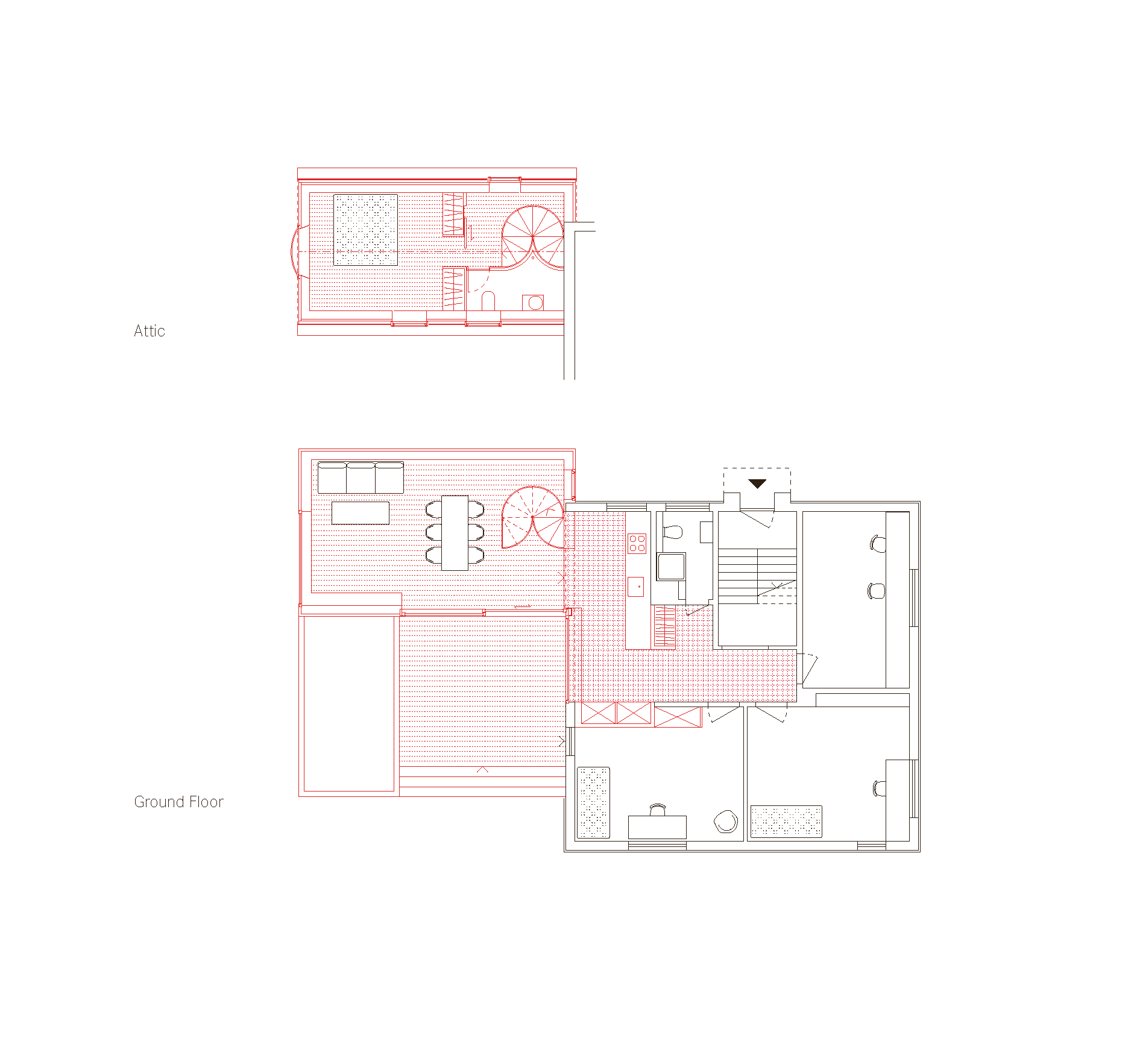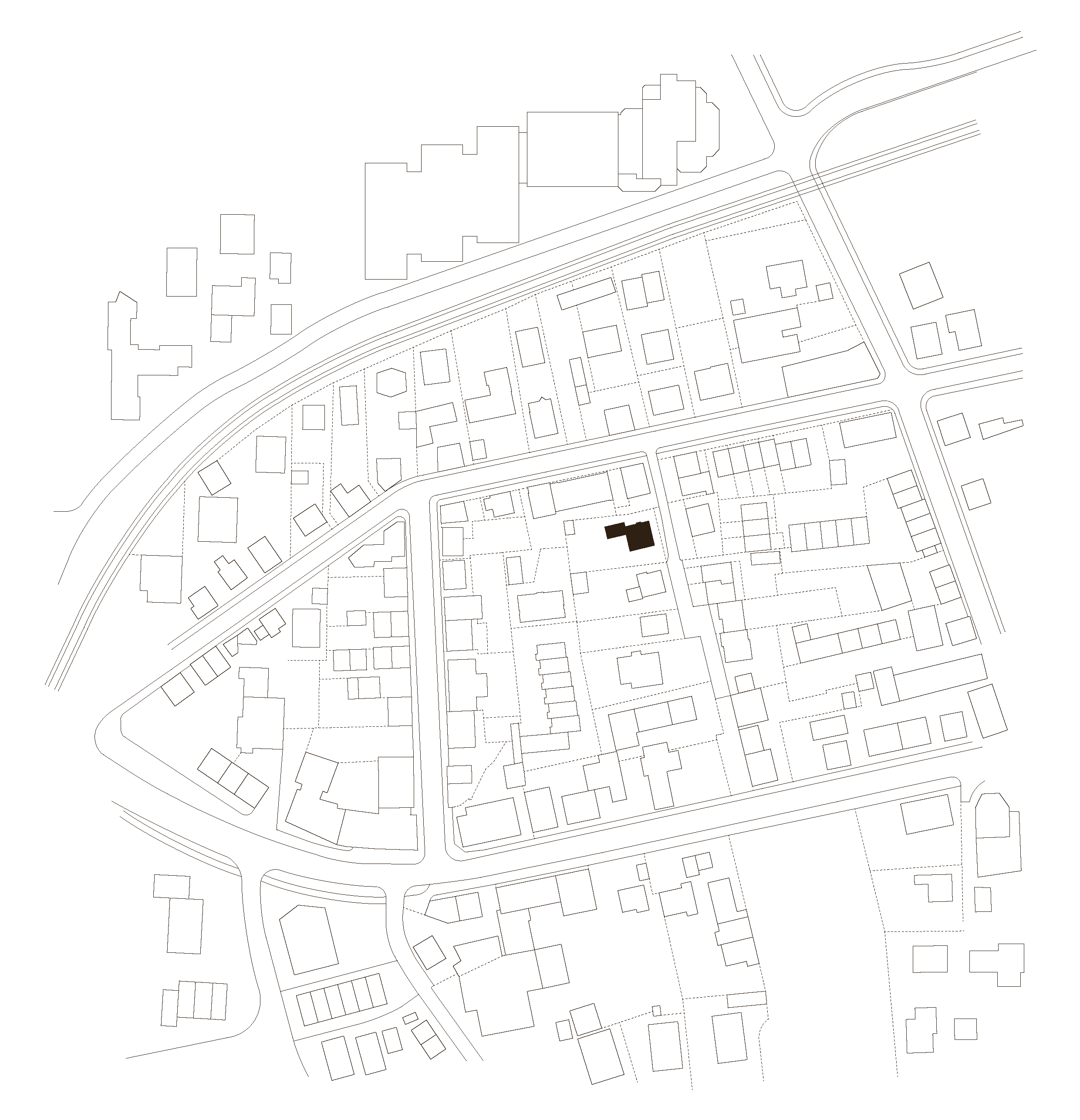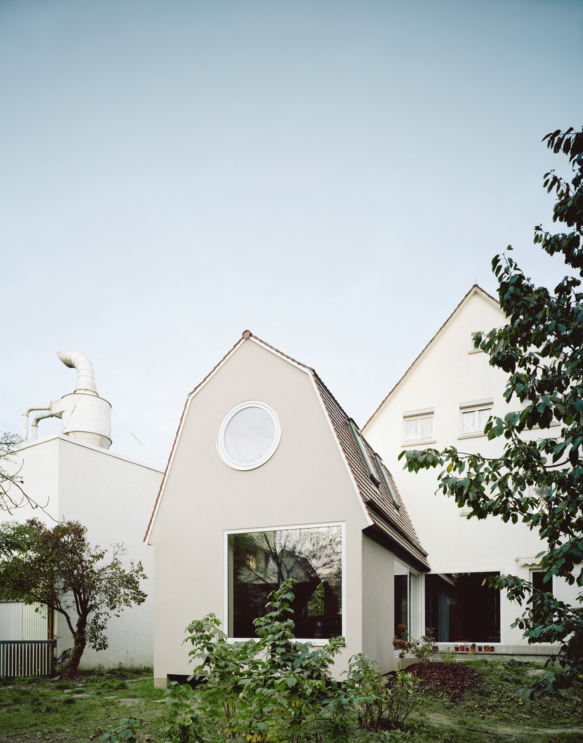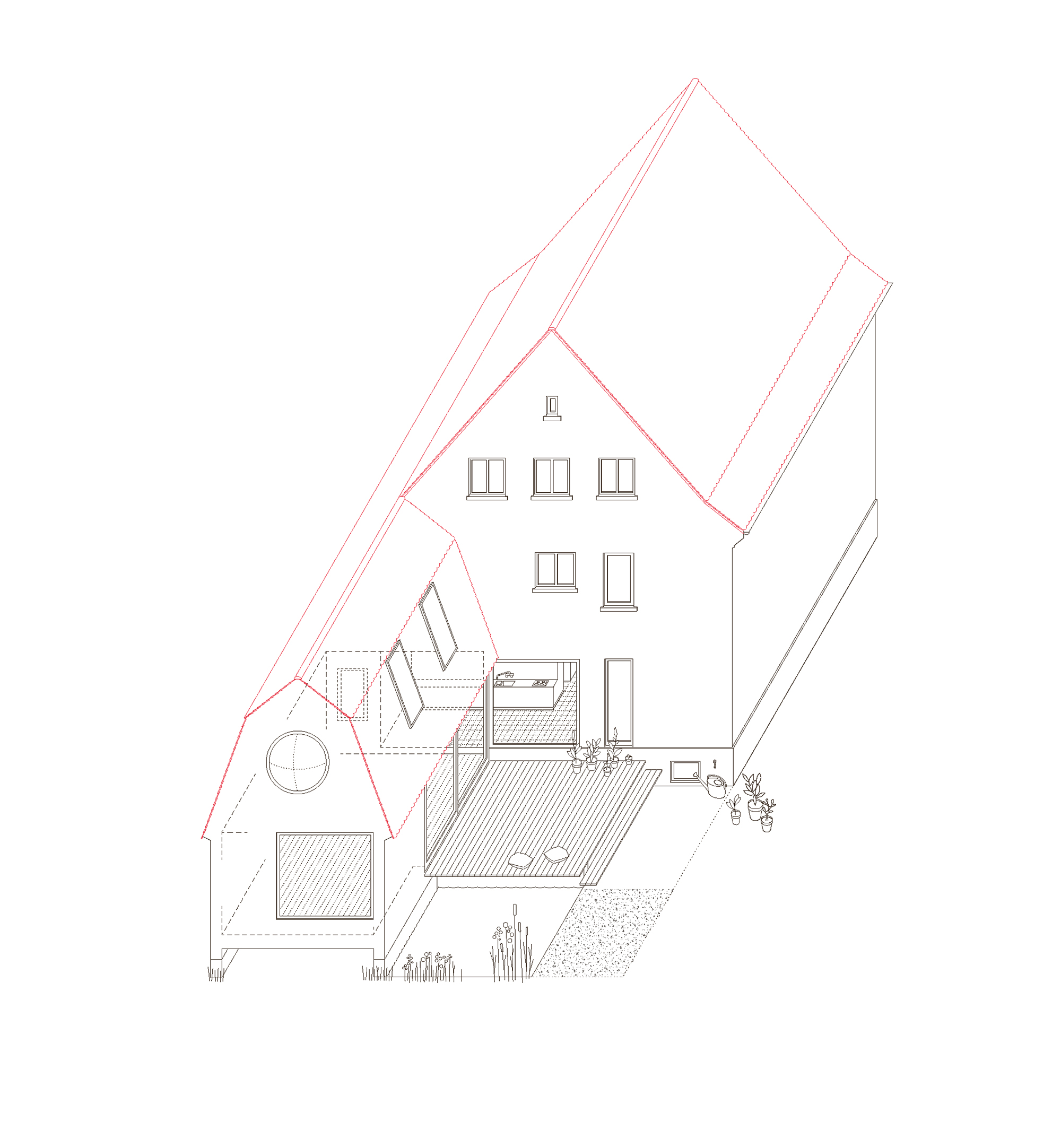 The simple, wood-framed structure on raised footings was built by the clients themselves, on a footprint of just 25 m². The two-story addition now connects to the existing three-story house where there were no windows in the facade. While the addition is clearly subordinate in width and overall size, its outer appearance matches the old building in color and materials, and its roof surface extends the existing roof, thus seamlessly joining the two. Through subtle play with the proportions of the openings, the roof shape, and the materials, the addition’s appearance oscillates between dependence and autonomy. At the juncture between old and new, the west wall was opened up on the ground floor to expand the existing kitchen with a dining and living area. The large areas of new glazing visually negate the inner corner, allowing the space to flow across the adjoining terrace and into the garden. Inside and outside, new and old form a spatial unity. In the newly created rooms, the residents now have the feeling of living in the garden. From the main living space on the ground floor, a stair leads to the attic loft and divides it into bedroom and bathroom areas.