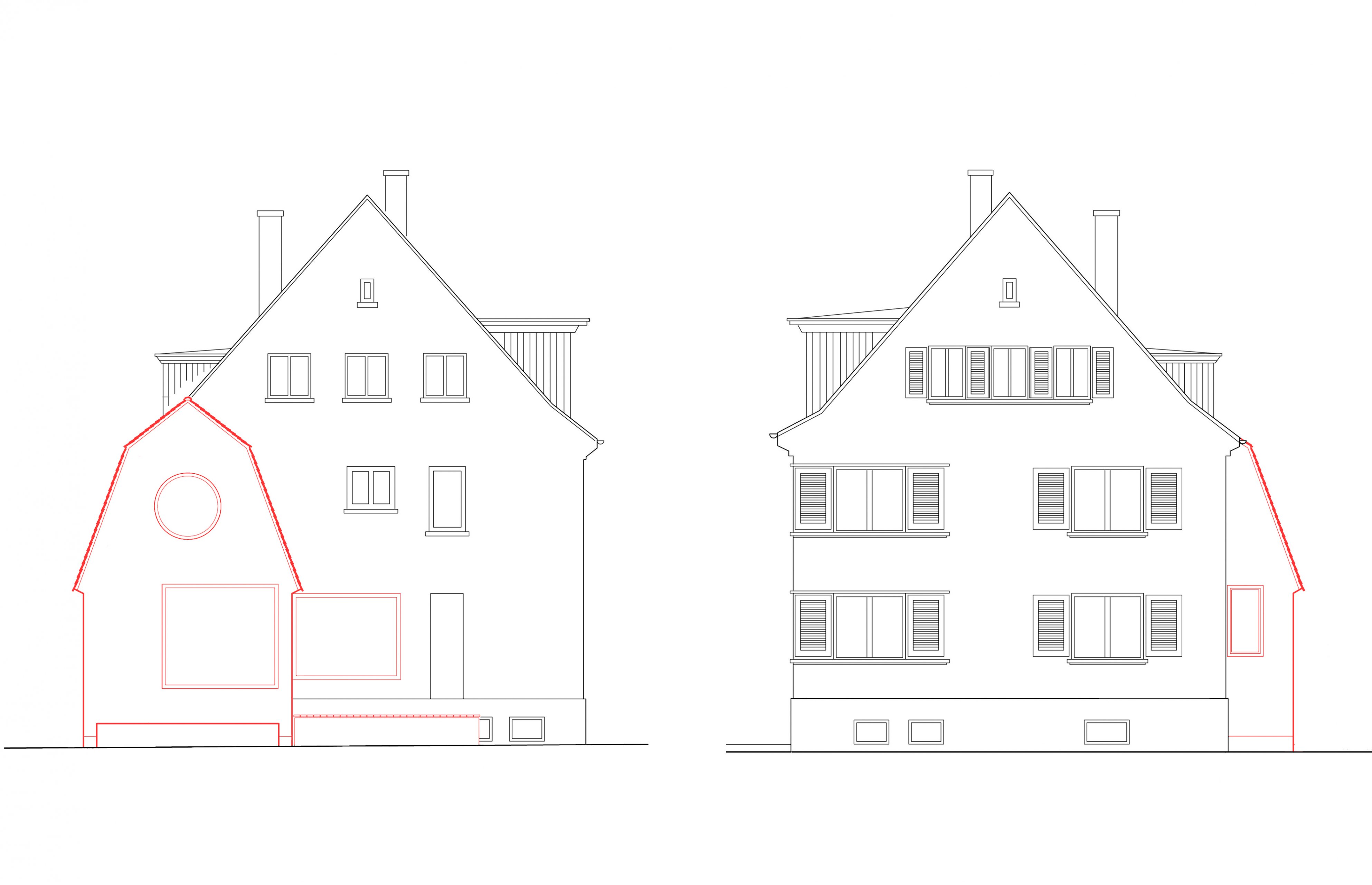 Our client, a family of four, had outgrown their 74 m² ground-floor apartment and needed more space for family life. The multifamily house from the 1930s offered the potential for an addition on the garden side to the west, which the clients initially envisioned as a one-story, flat-roofed building measuring 50 m². In the design process, we sought to augment the building by applying its inherent logic to the new elements, thus learning its language and translating it into a new one. The added construction reorganizes the floor plan, solves the daylight problem, and creates different areas in the garden that open up new possibilities for use.
