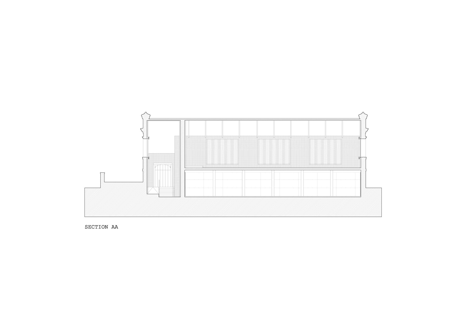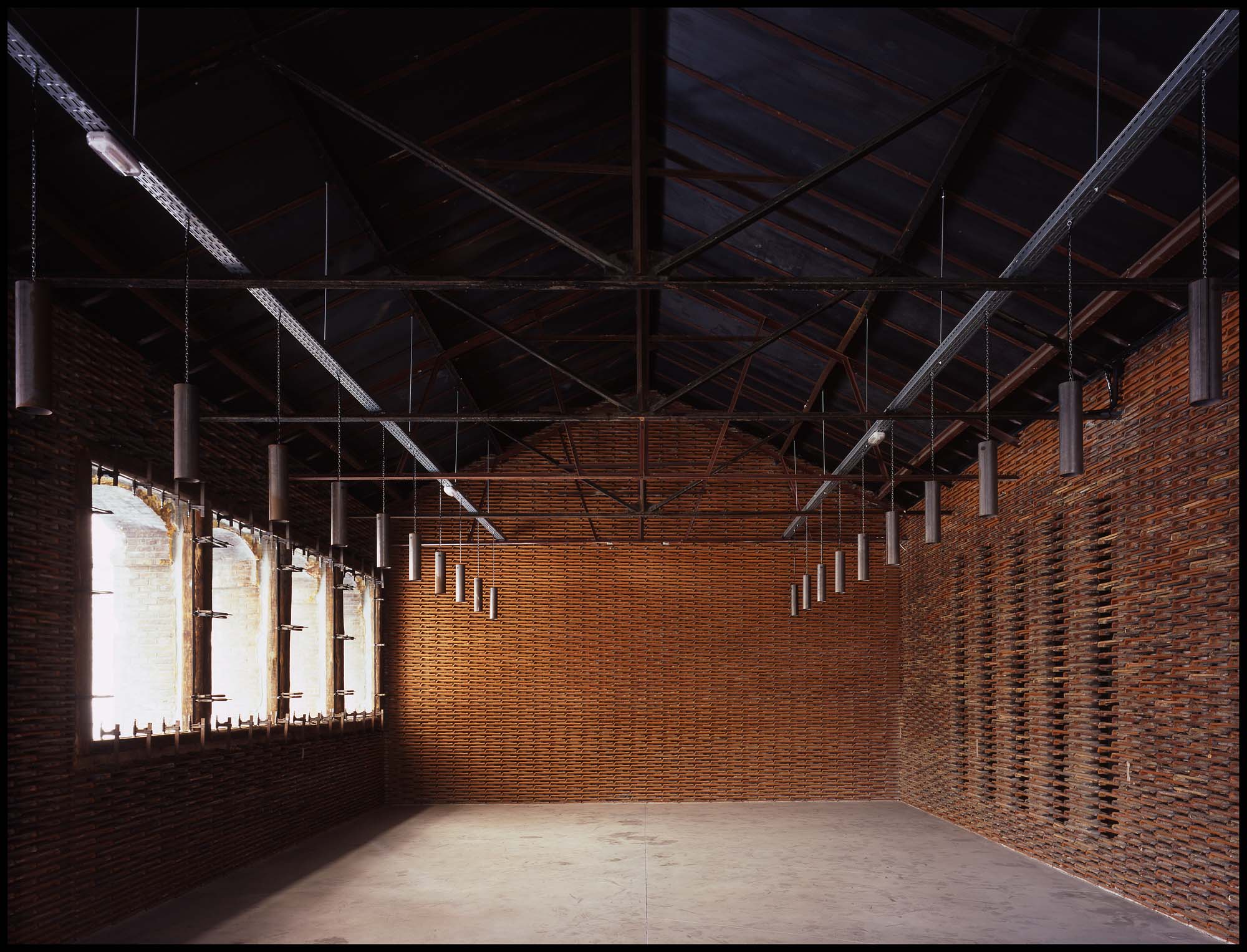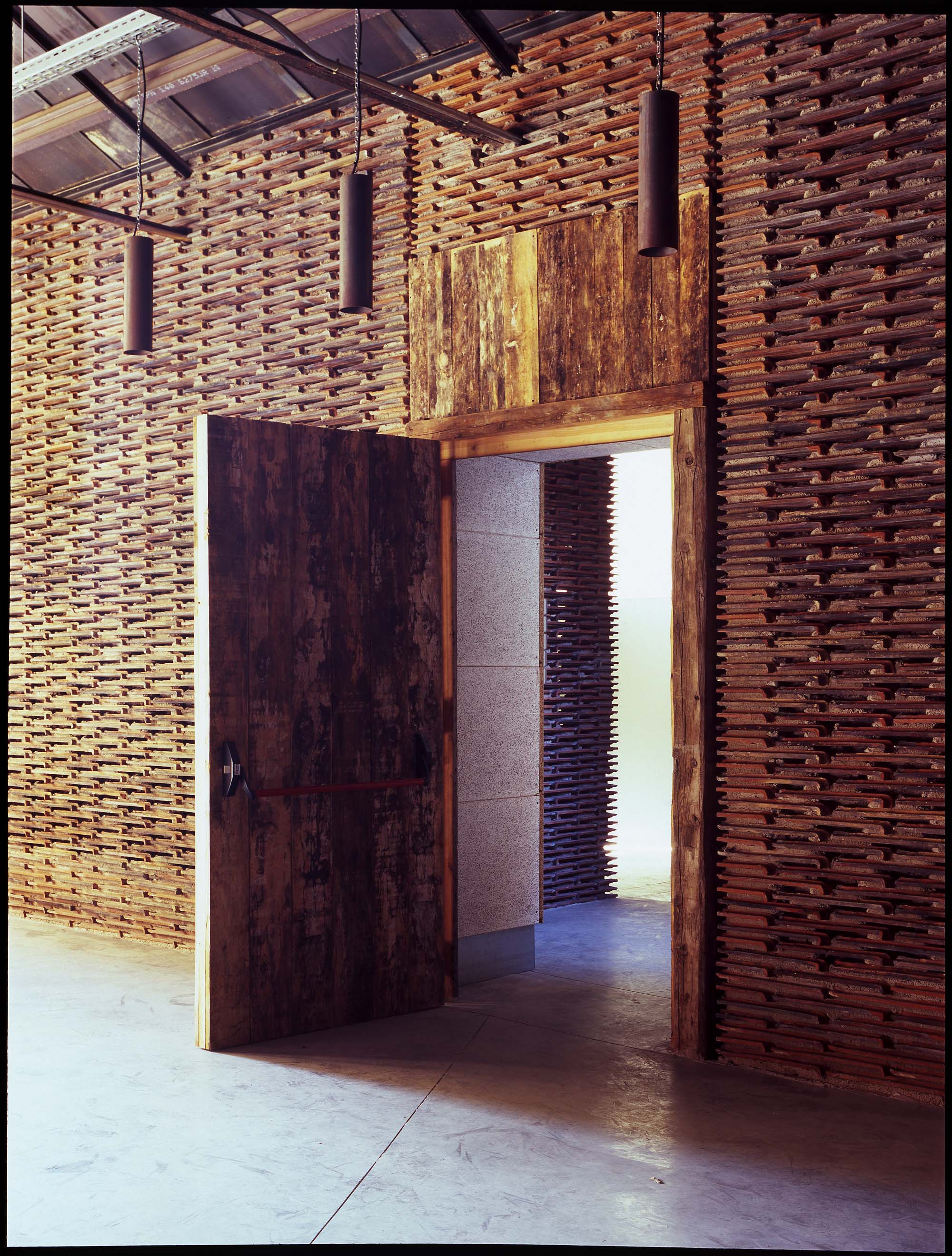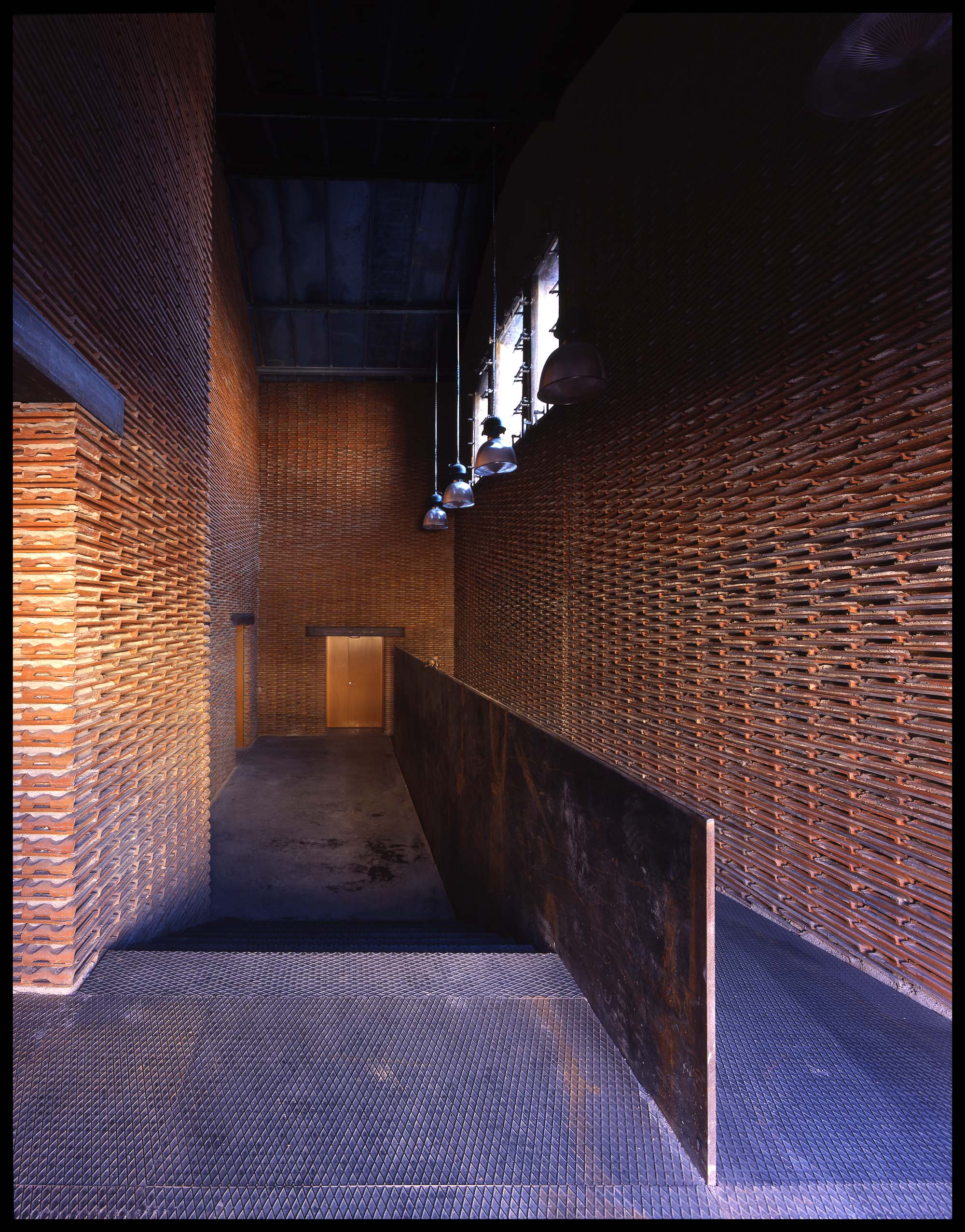 The priority of the intervention was to replace a roof of flat shingle tiles over boards and successively patched thin, hollow bricks, to carry out a structural reinforcement of the whole set, and to fit out the indoors, thermally and acoustically, so as to provide service to the new uses. This process had been followed before in some other warehouses of the slaughterhouse and, as a result, mountains of tile, timber, cladding and granite slab rubble piled up waiting to be taken to the dump.