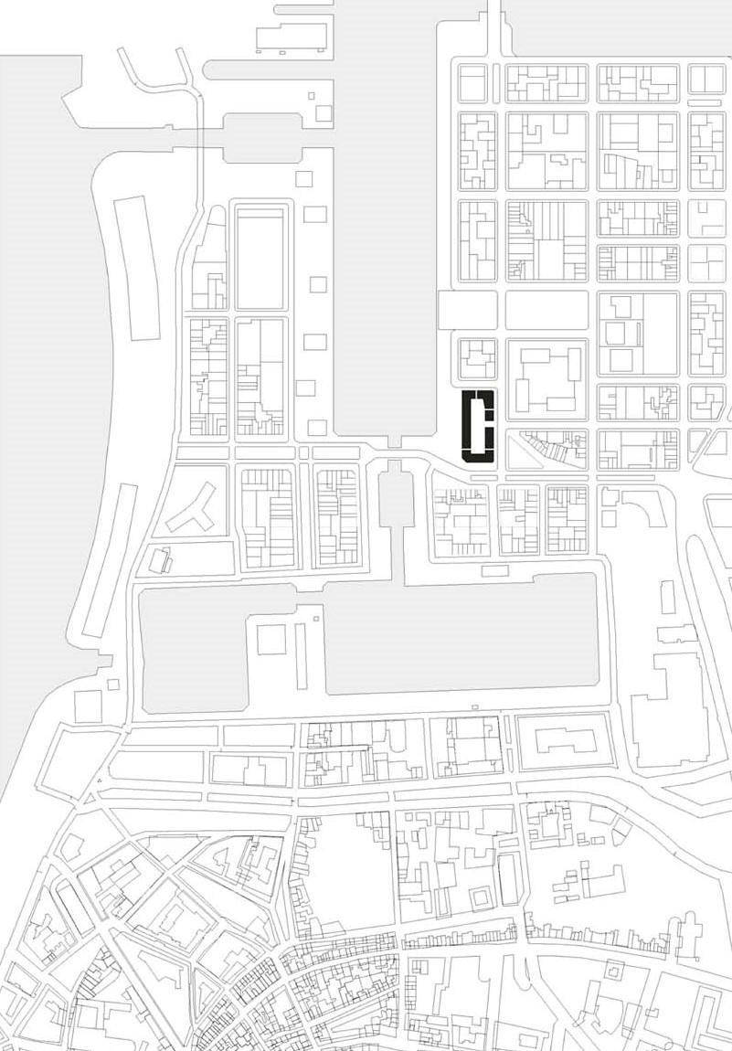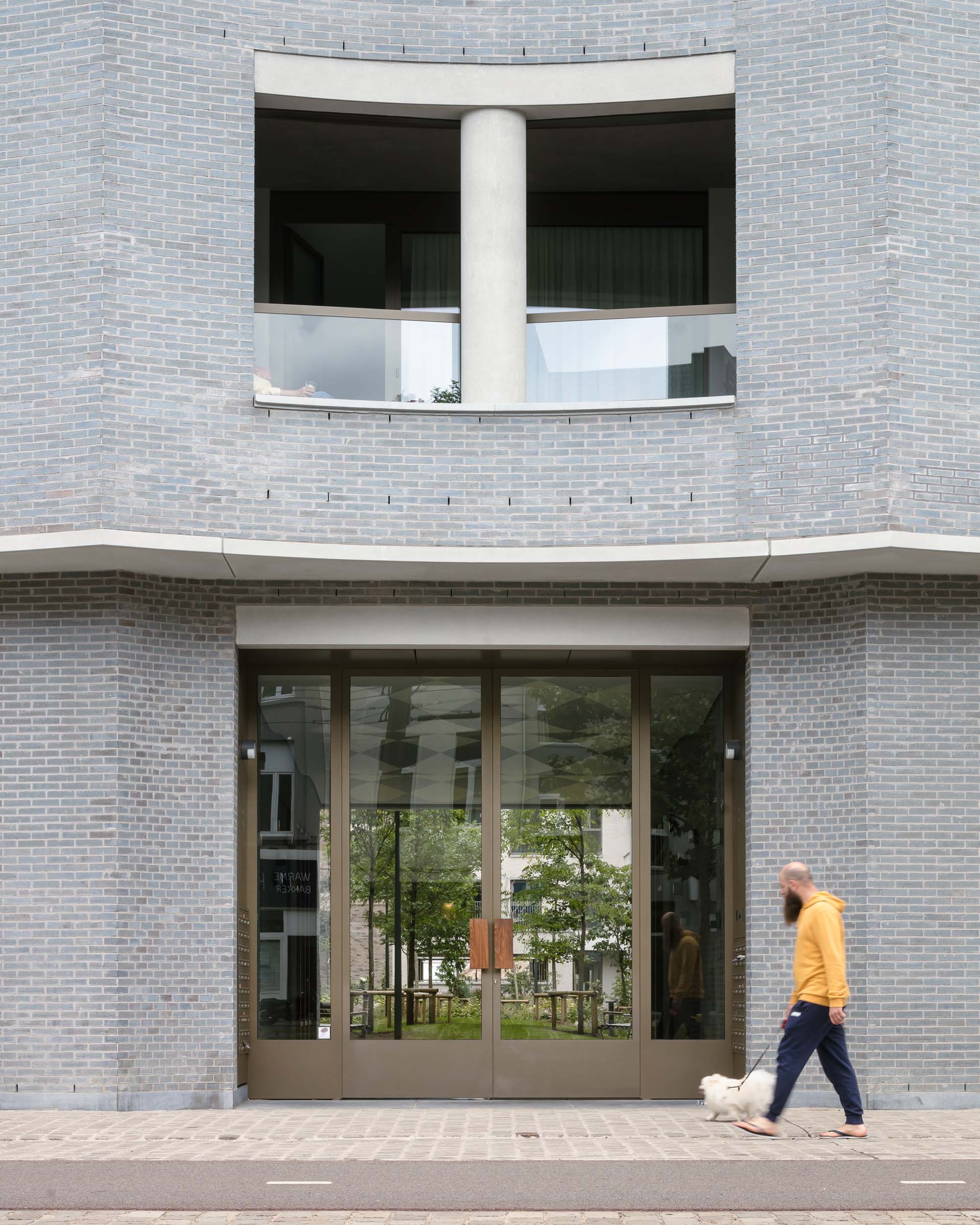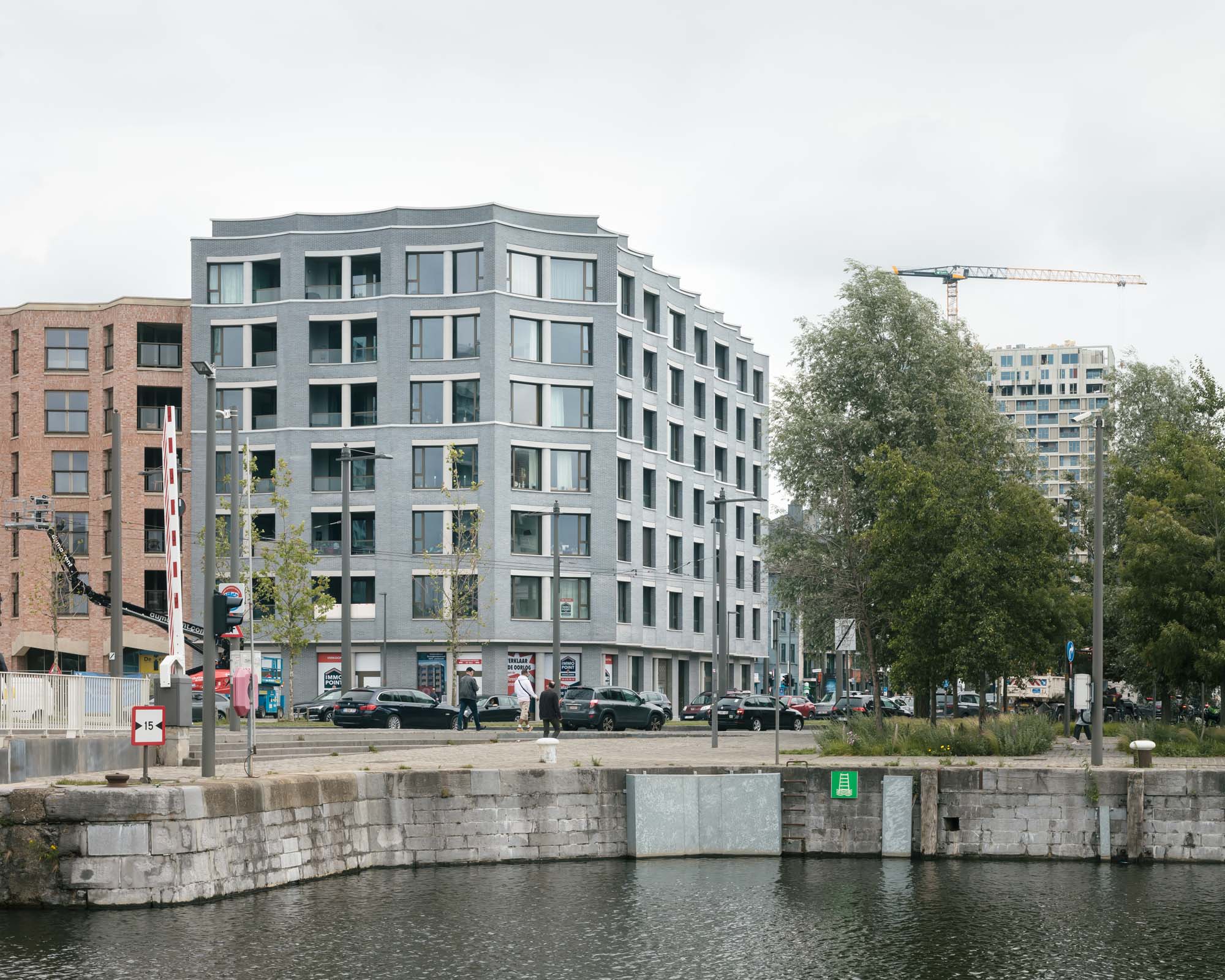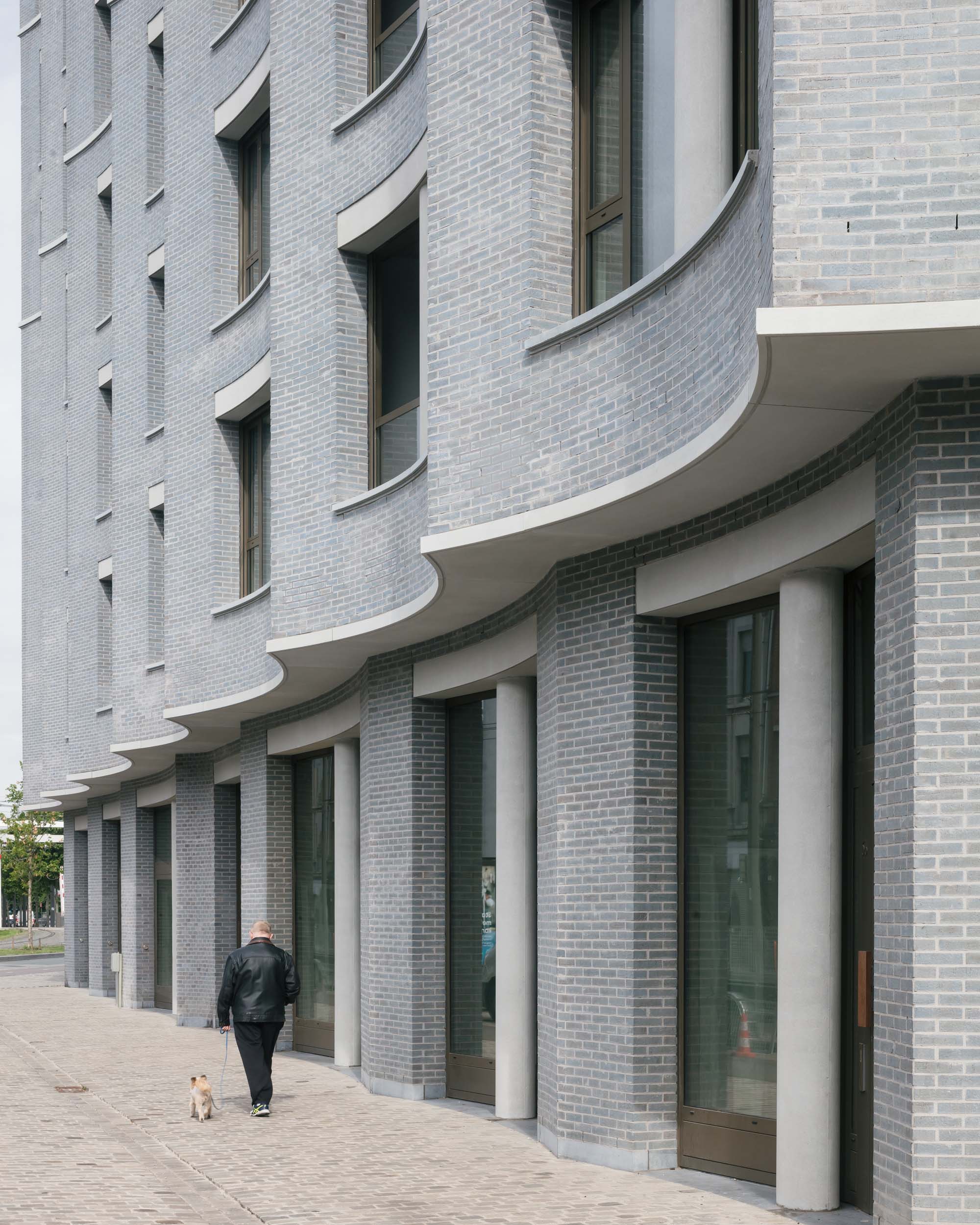 On a prominent site in the old port of Antwerp, next to the Kattendijkdok, we have constructed a stately residential building on the Londenstraat: an urban ‘palazzo’. The building is draped in a rhythmic, undulating facade, the order of which is both monumental and layered. The rhythm accommodates living spaces and large indoor terraces, which brings an air of domesticity and dynamism to the imposing volume. A shallow cantilever along the commercial spaces in the plinth creates intimacy for the pedestrians on the boulevard. A central passage, which bisects the palazzo, connects the Londenstraat with the courtyard. Glass facades lead the eye through the passage towards the interior. Two entrance areas provide access to nine apartments per floor. The route from pavement to front door is suffused with light and offers fine views. Sergison Bates Architects and Bulk Architecten designed the other four buildings in this city block.