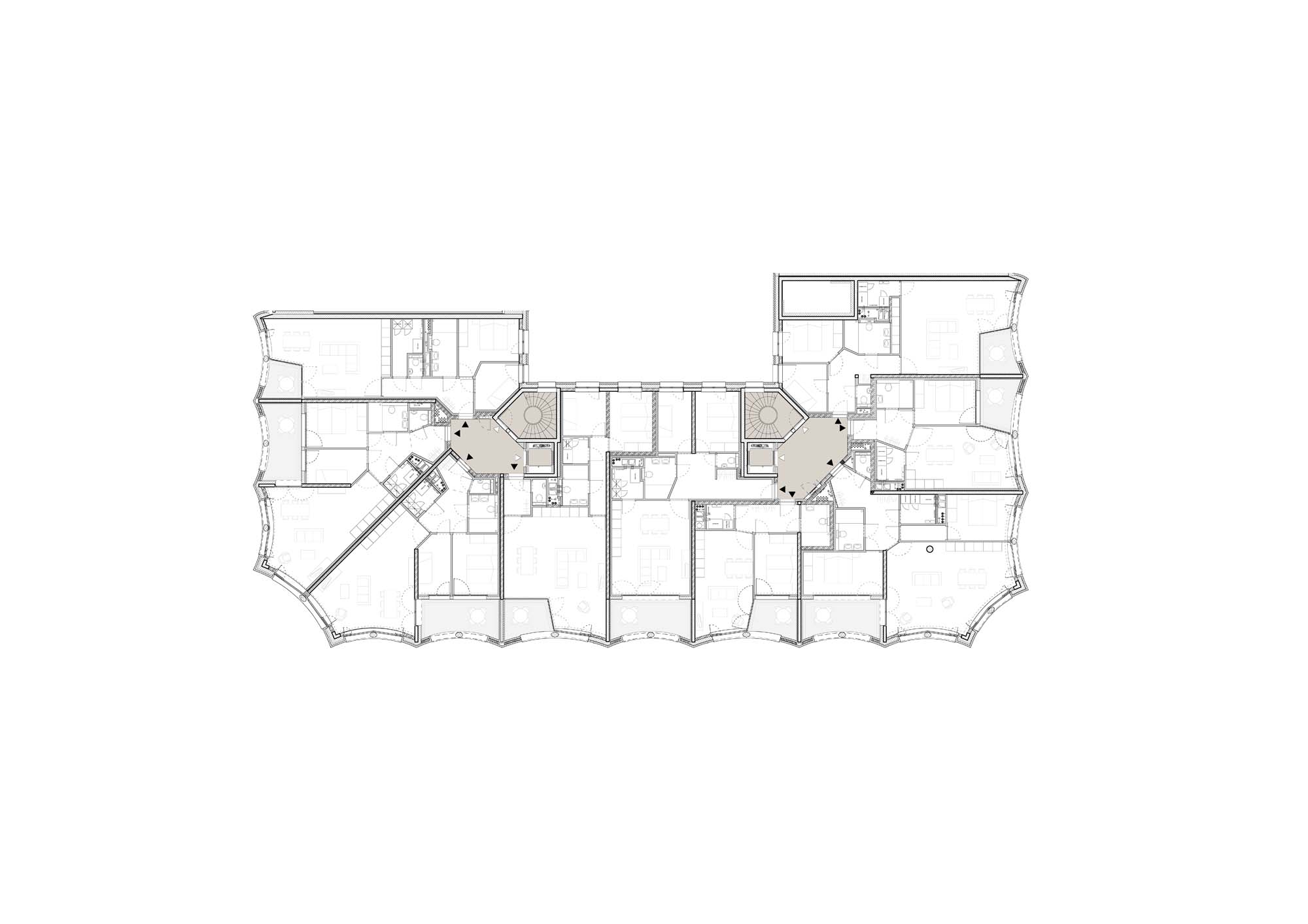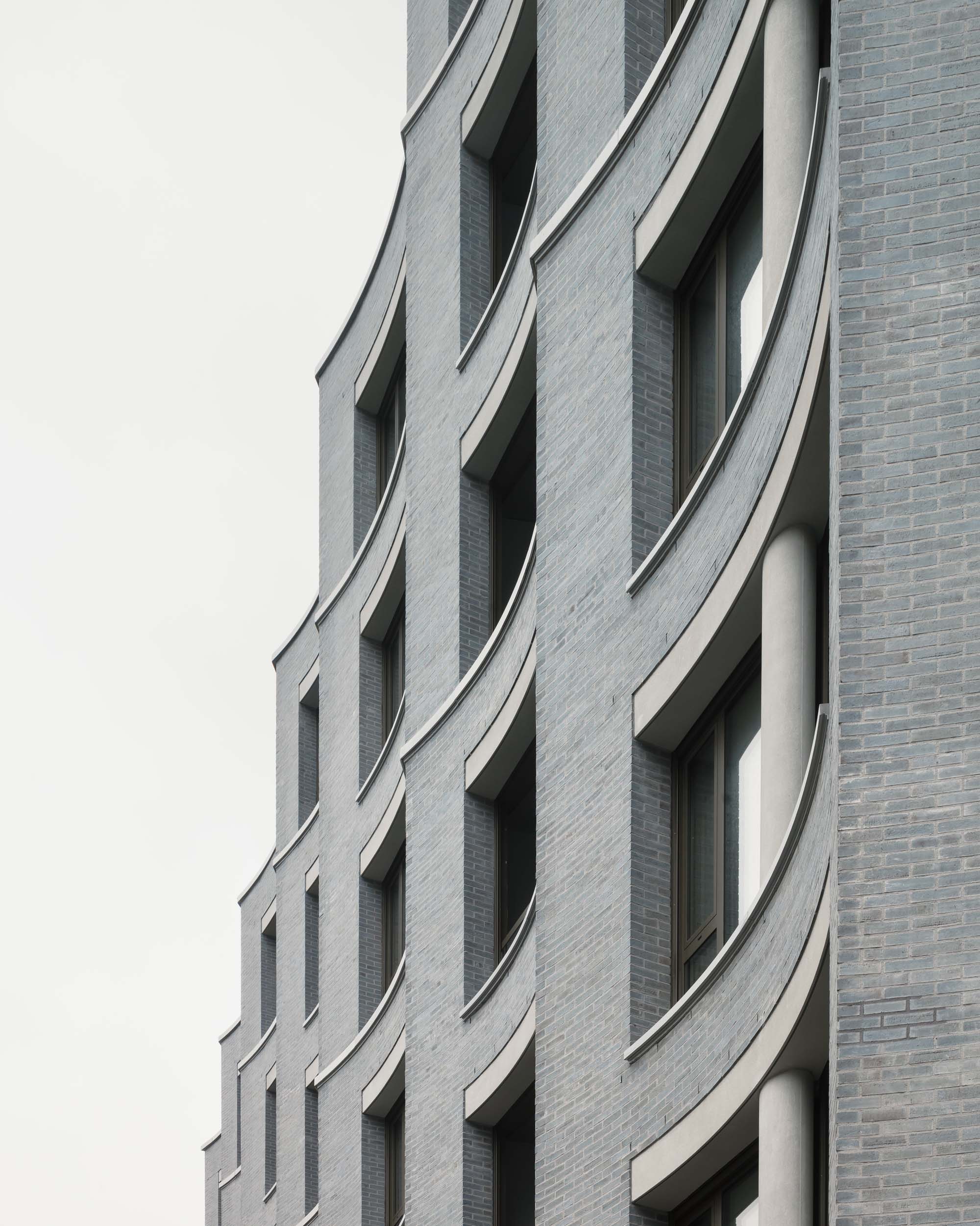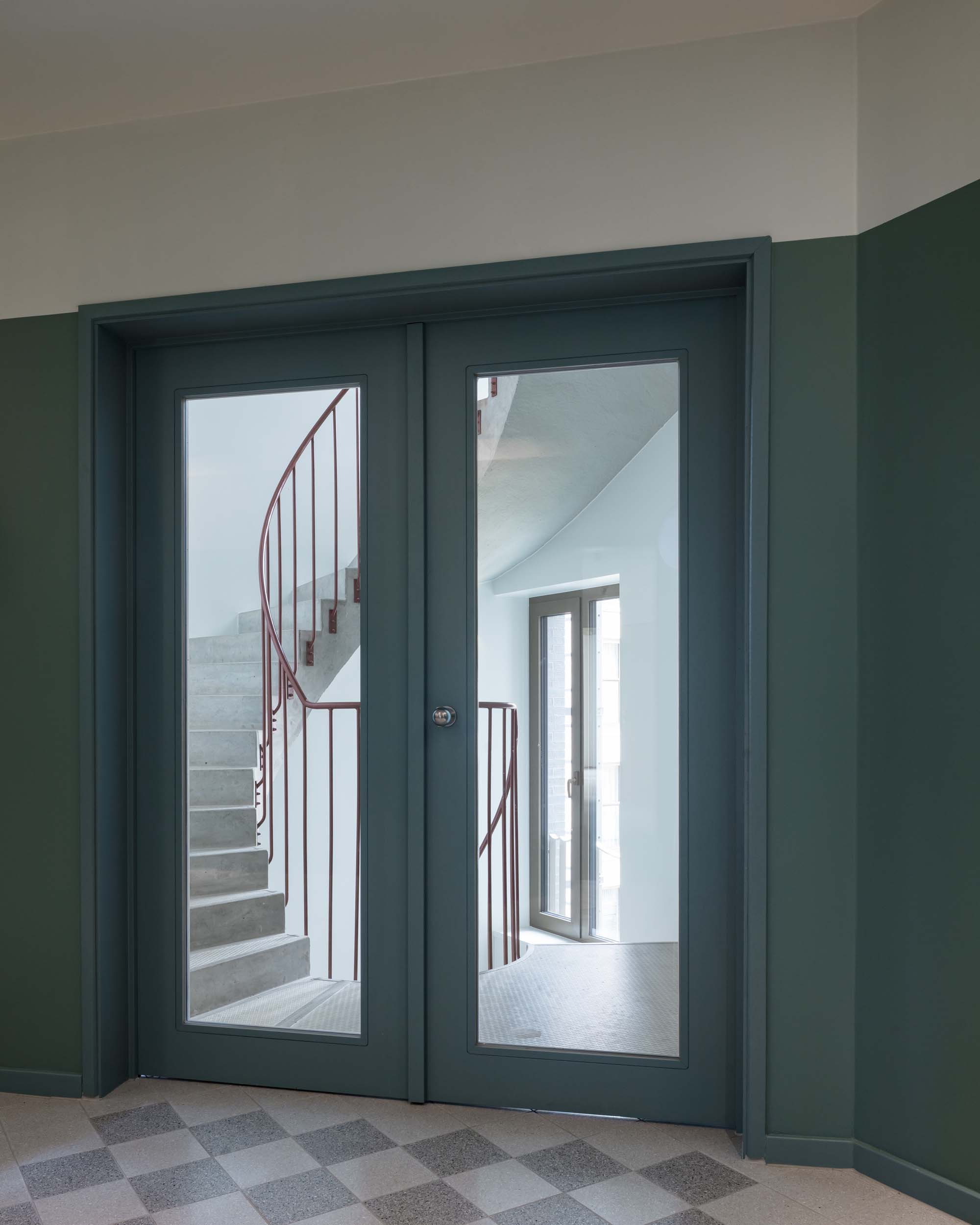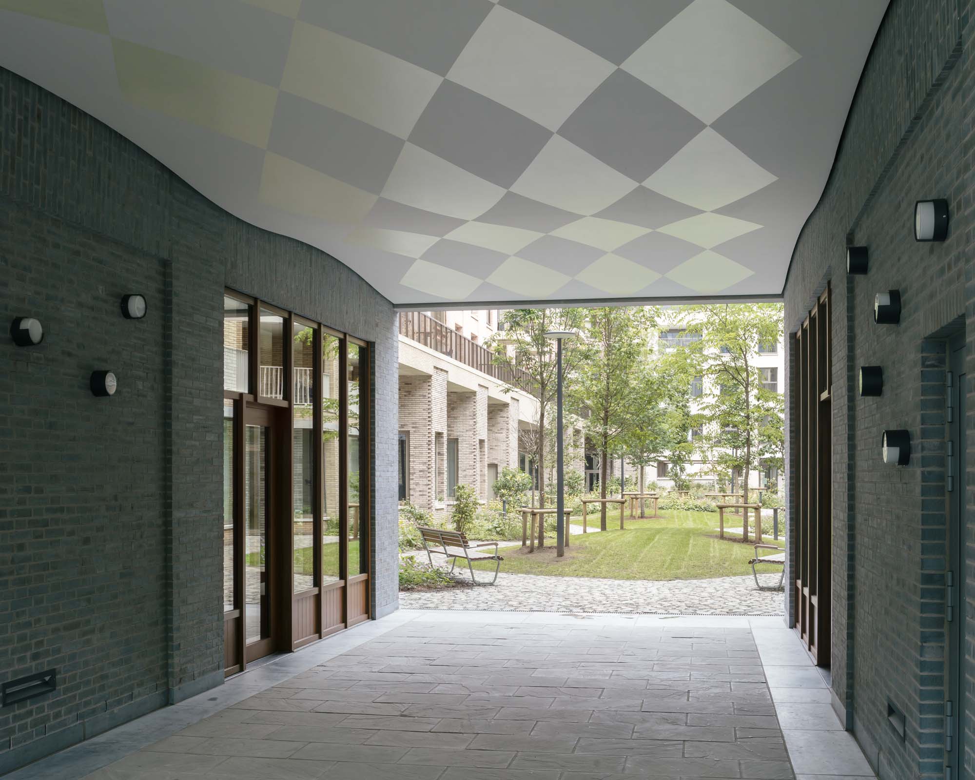On a prominent site in the old port of Antwerp, next to the Kattendijkdok, we have constructed a stately residential building on the Londenstraat: an urban ‘palazzo’. The building is draped in a rhythmic, undulating facade, the order of which is both monumental and layered. The rhythm accommodates living spaces and large indoor terraces, which brings an air of domesticity and dynamism to the imposing volume. A shallow cantilever along the commercial spaces in the plinth creates intimacy for the pedestrians on the boulevard. A central passage, which bisects the palazzo, connects the Londenstraat with the courtyard. Glass facades lead the eye through the passage towards the interior. Two entrance areas provide access to nine apartments per floor. The route from pavement to front door is suffused with light and offers fine views. Sergison Bates Architects and Bulk Architecten designed the other four buildings in this city block.