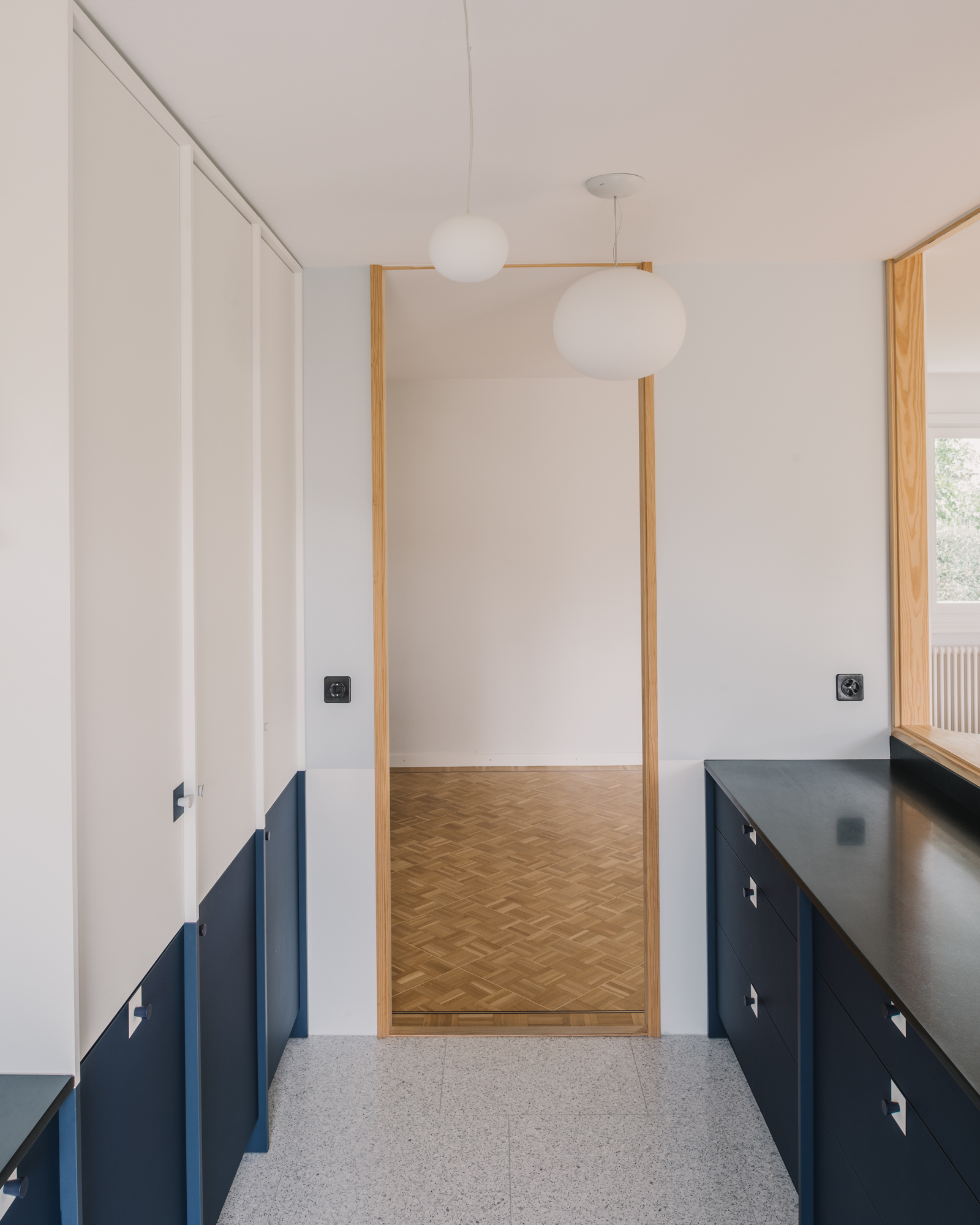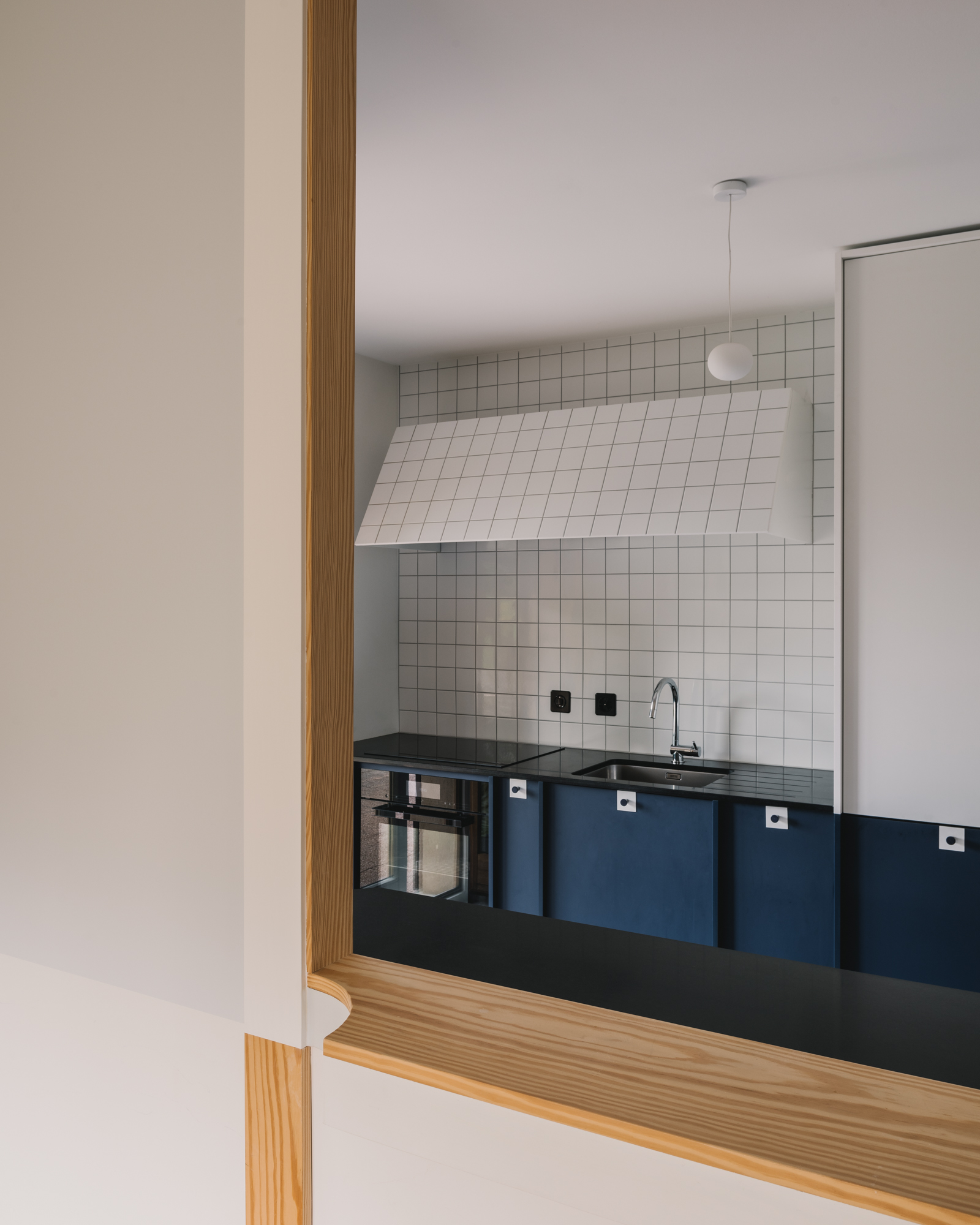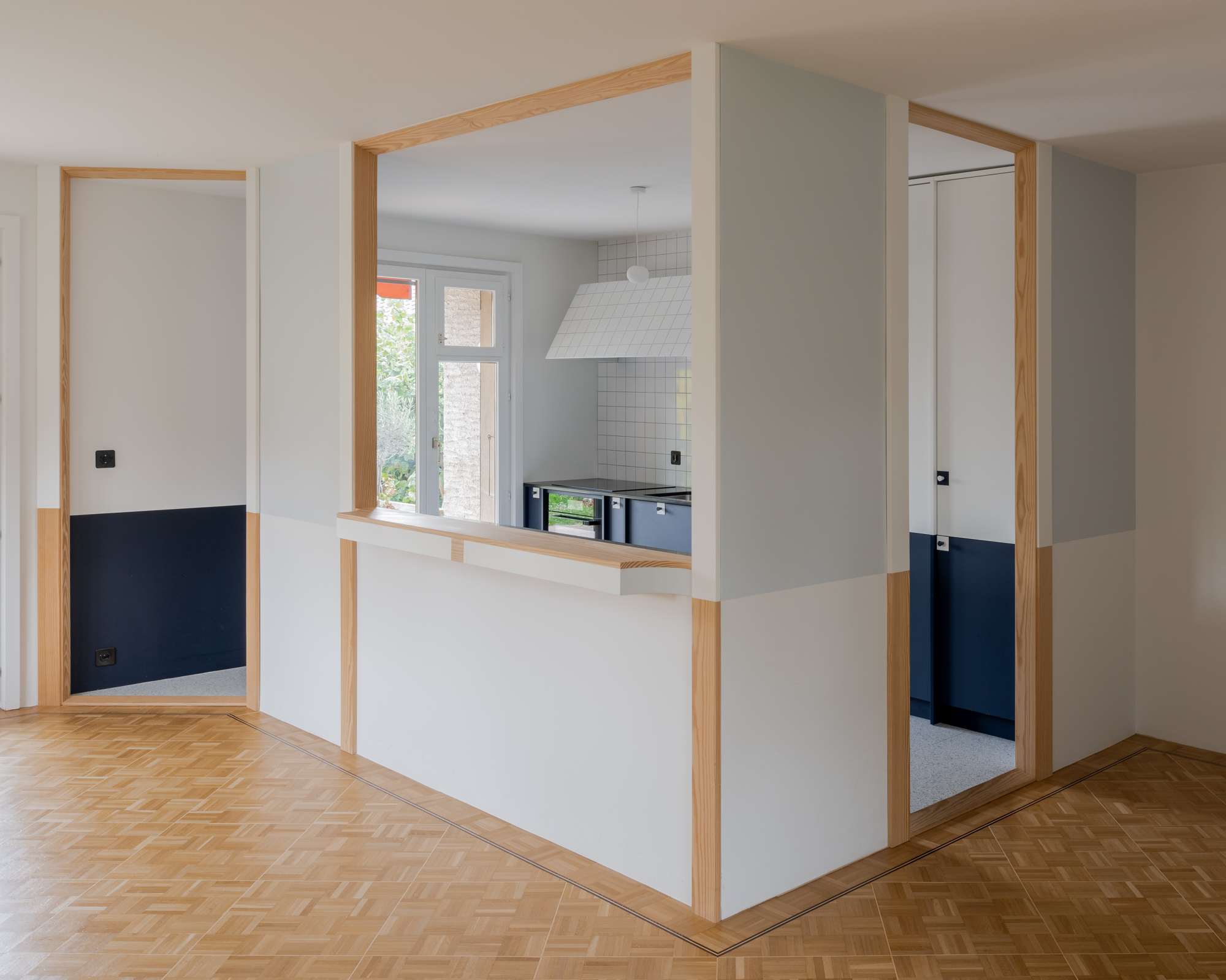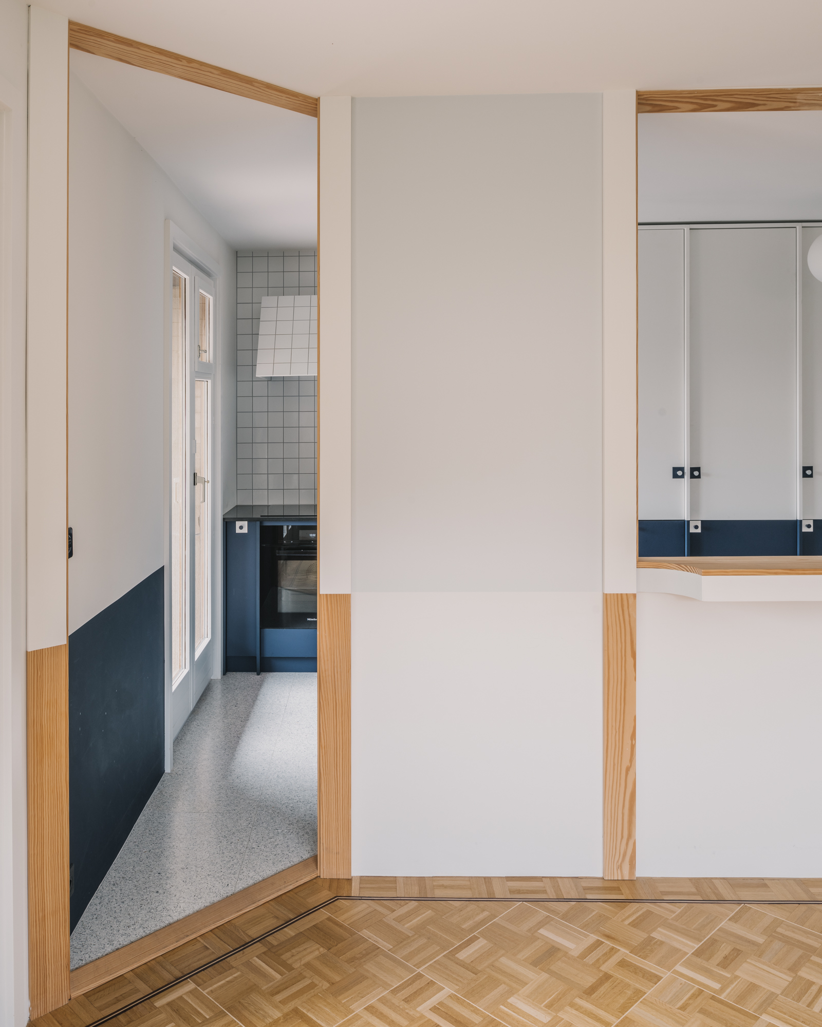 The project concerns the refurbishment of a cooking and dining area in an existing house. A folded wall, reminiscent of a screen, acts as a filter between both spaces. It preserves their autonomy while allowing cross views that are extended throughout the existing windows. A series of timber pilasters give the rhythm and articulate the different openings that vary between passages and an open bar. Family and guests can gather around the latest to share a glass of wine or a starter while the host is cooking. The chromatic game of figure and ground allows a visual intertwining of the screen and the kitchen features, blurring the limit between the interior and exterior of each space. Variations of the same primary colour – IKB and sky blue – emphasize either the depth or the surface quality of elements. Exposed timber fragments relate to the existing oak floor underlining the connection between old and new.
