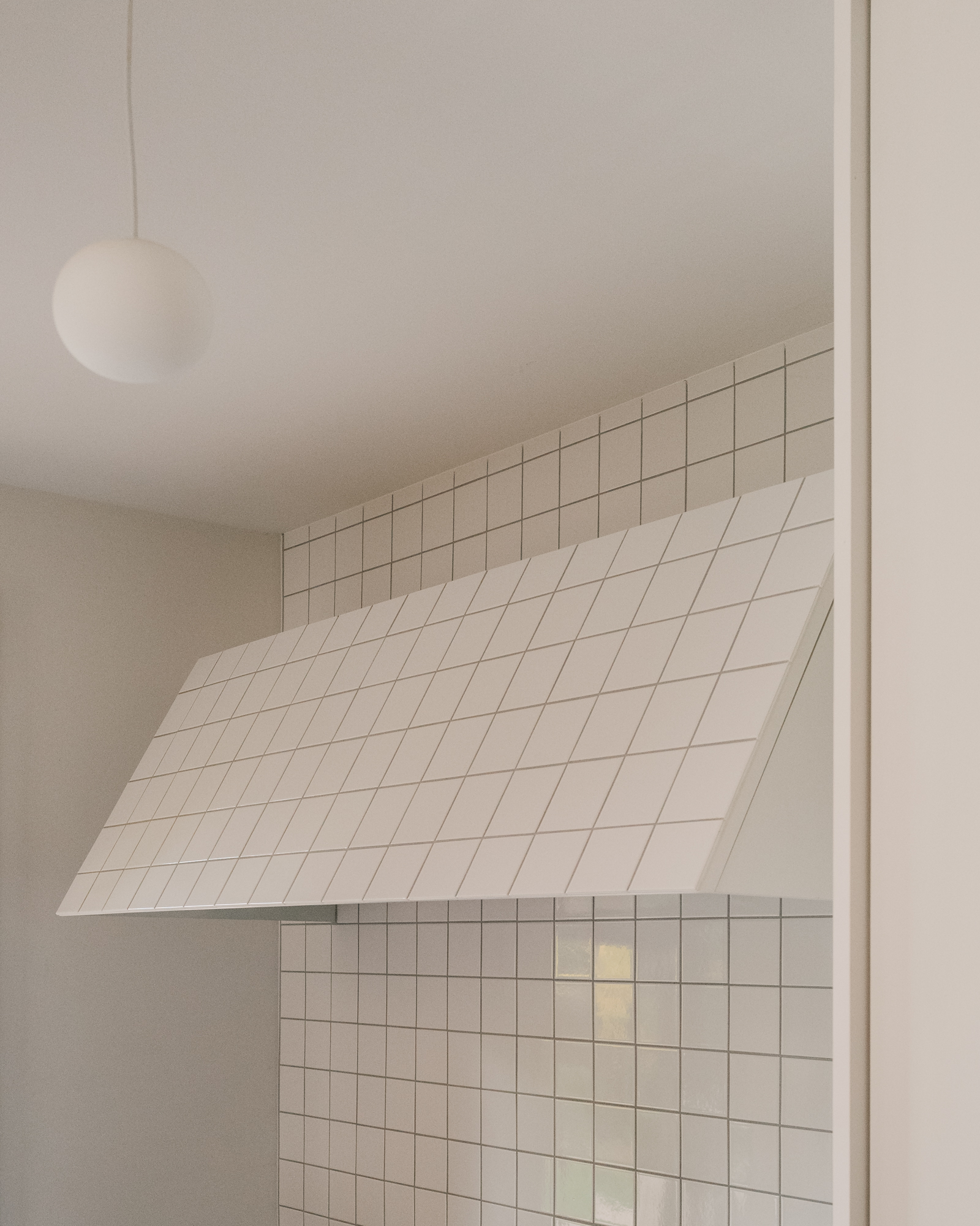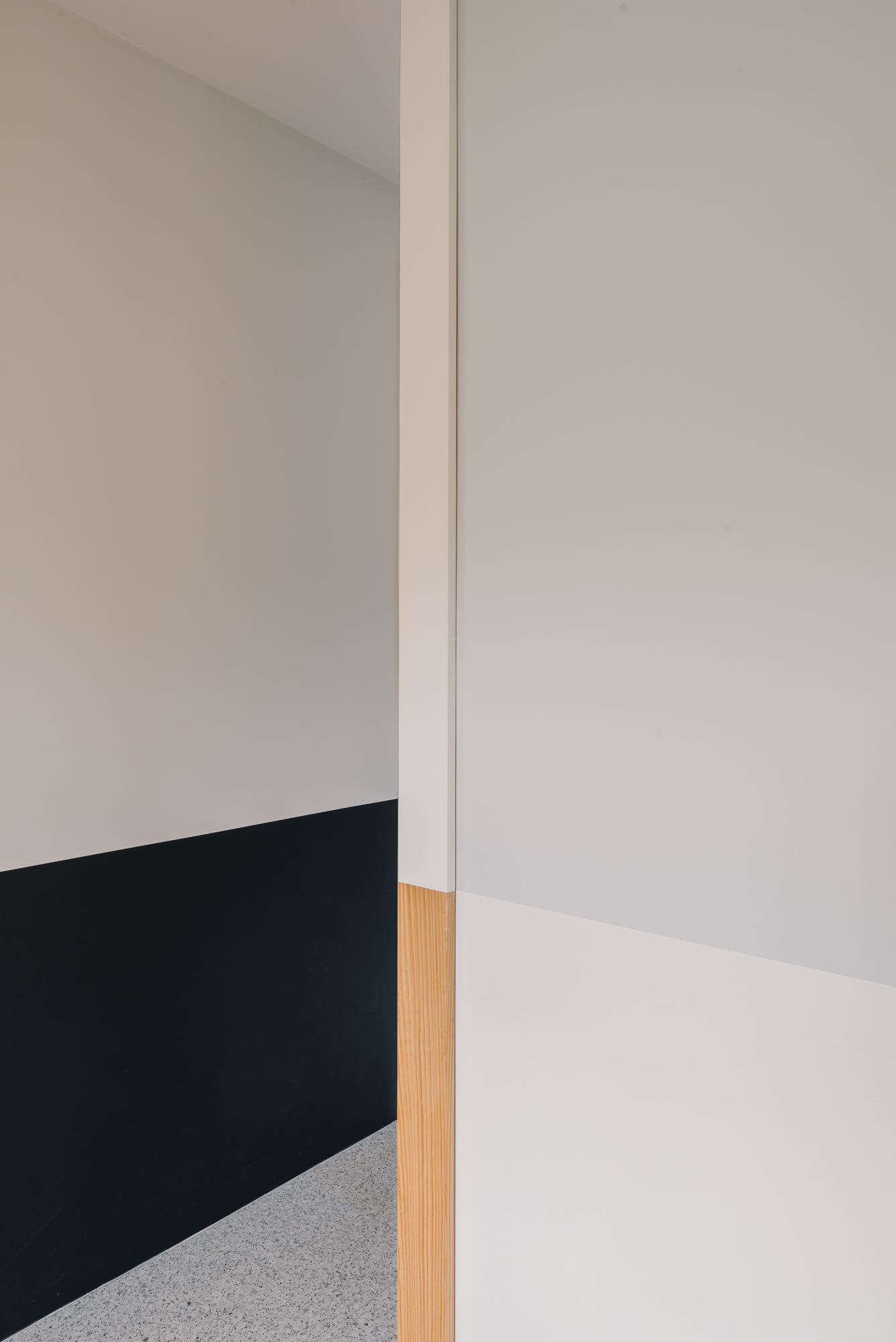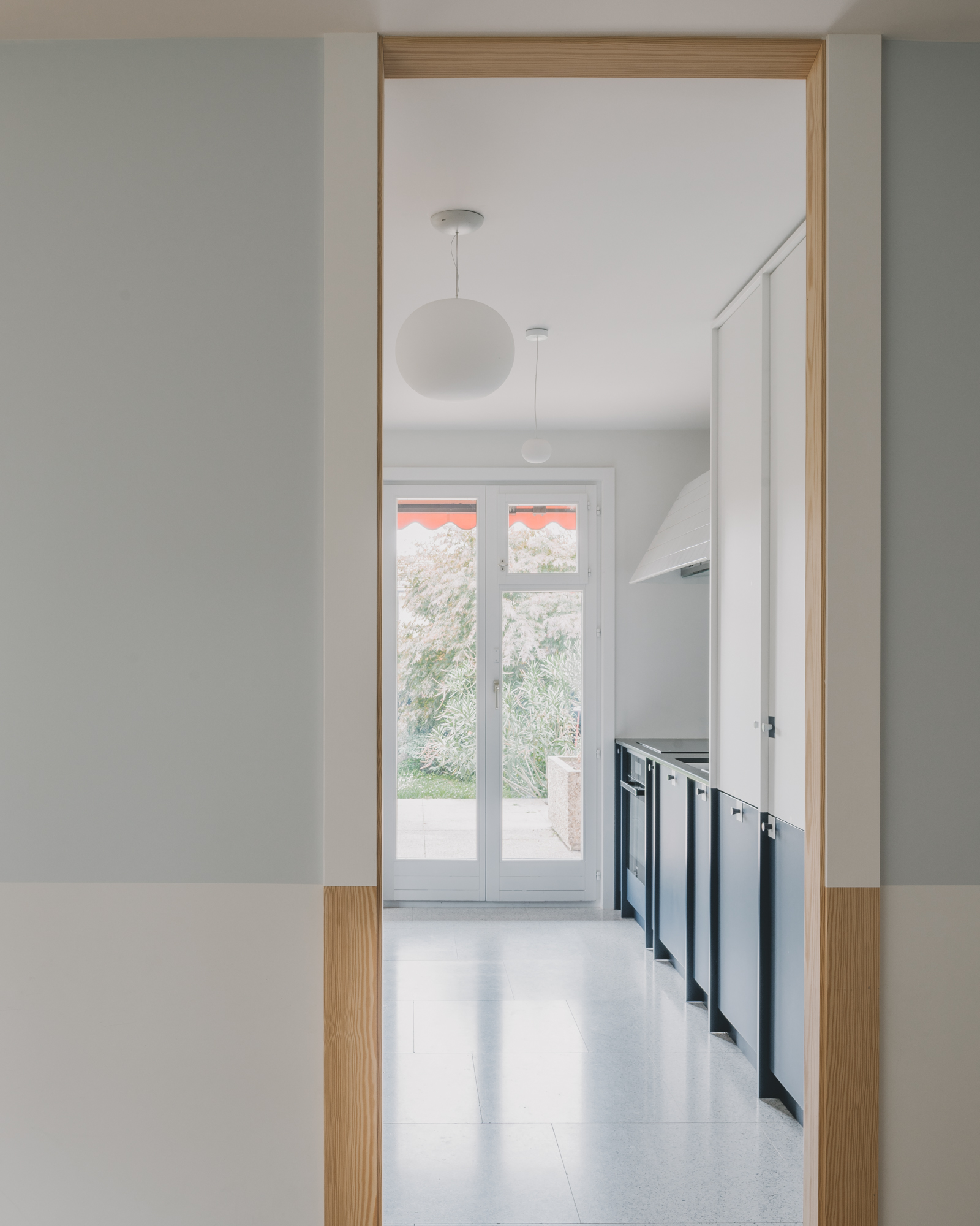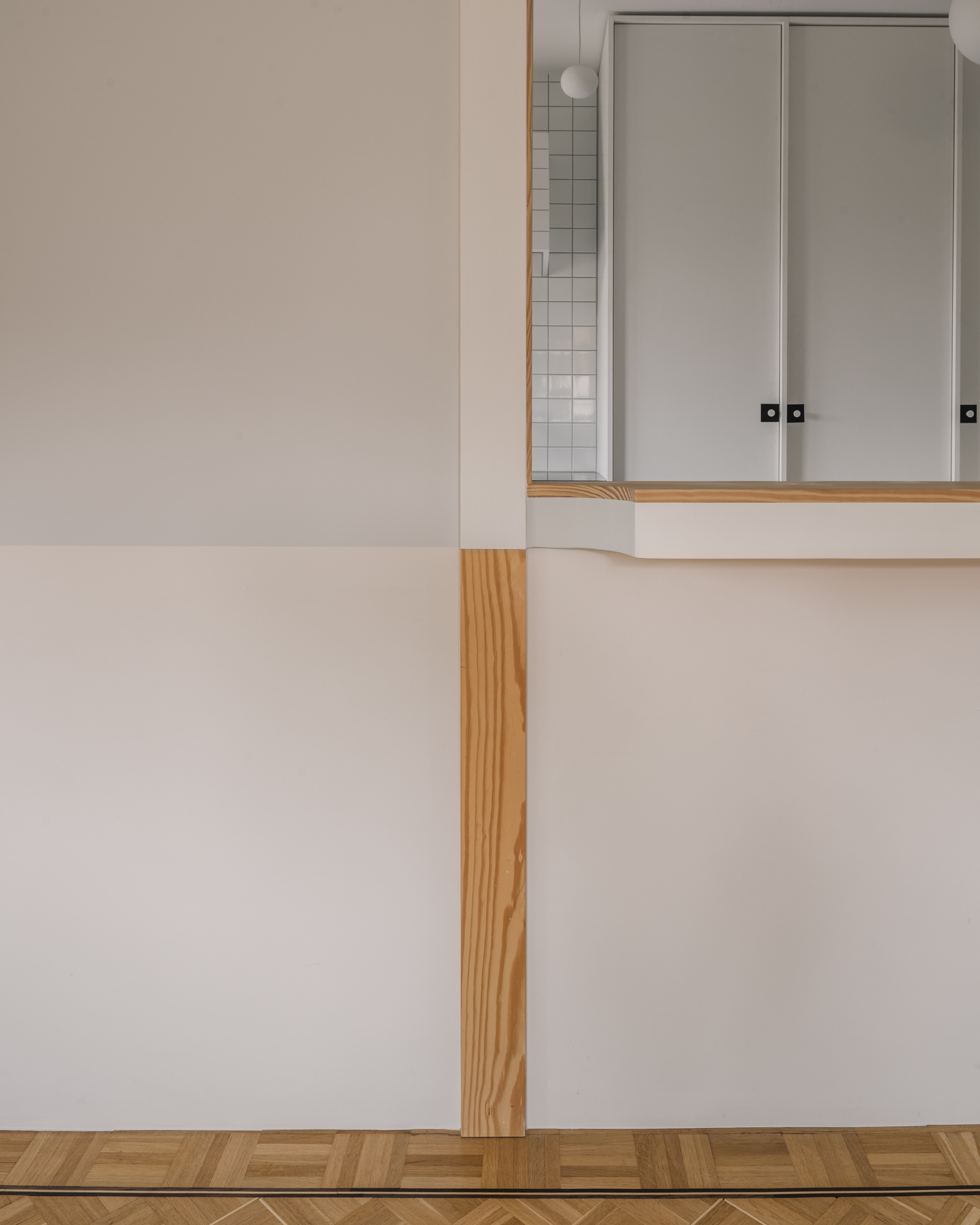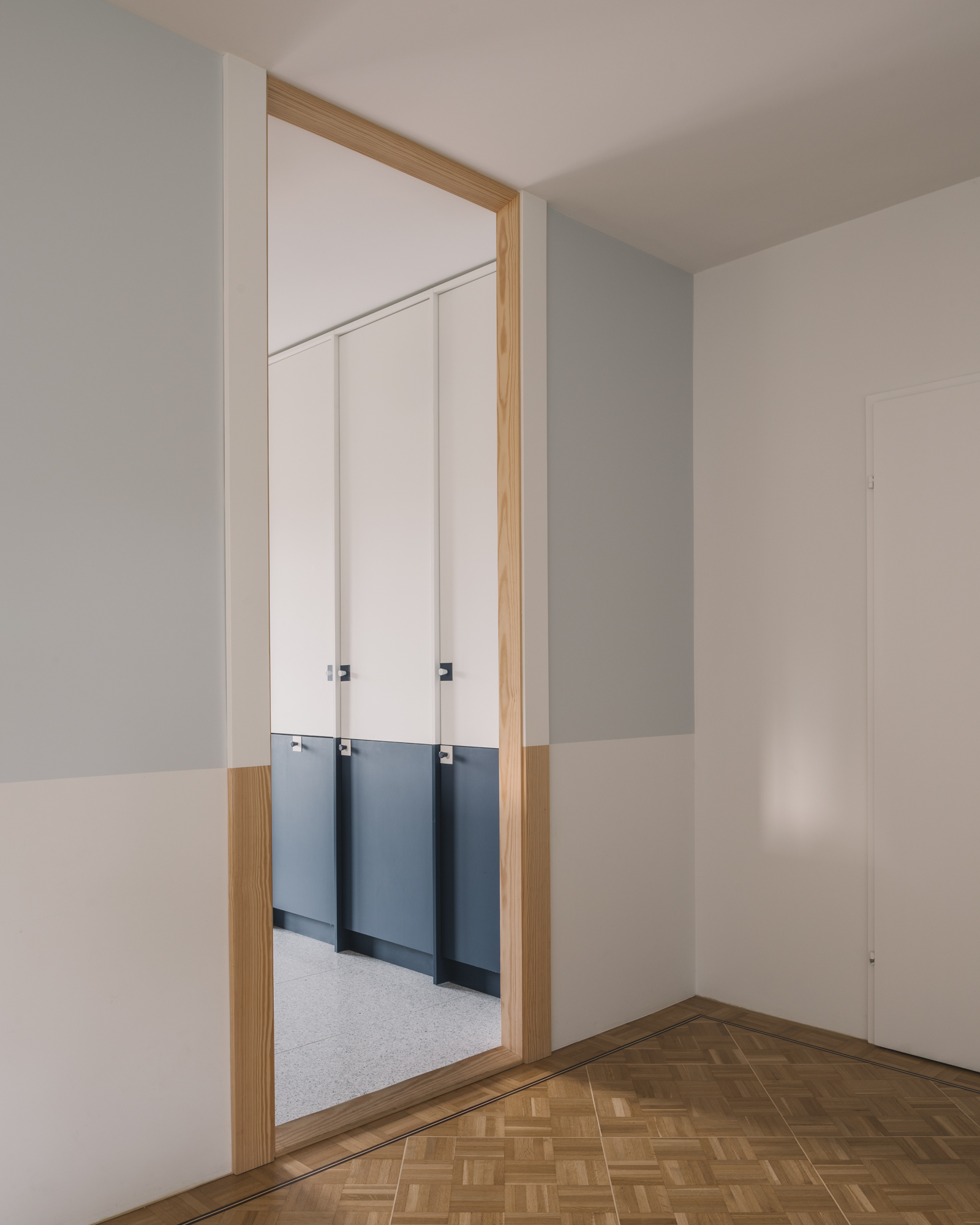 The project concerns the refurbishment of a cooking and dining area in an existing house. A folded wall, reminiscent of a screen, acts as a filter between both spaces. It preserves their autonomy while allowing cross views that are extended throughout the existing windows. A series of timber pilasters give the rhythm and articulate the different openings that vary between passages and an open bar. Family and guests can gather around the latest to share a glass of wine or a starter while the host is cooking. The chromatic game of figure and ground allows a visual intertwining of the screen and the kitchen features, blurring the limit between the interior and exterior of each space. Variations of the same primary colour – IKB and sky blue – emphasize either the depth or the surface quality of elements. Exposed timber fragments relate to the existing oak floor underlining the connection between old and new.