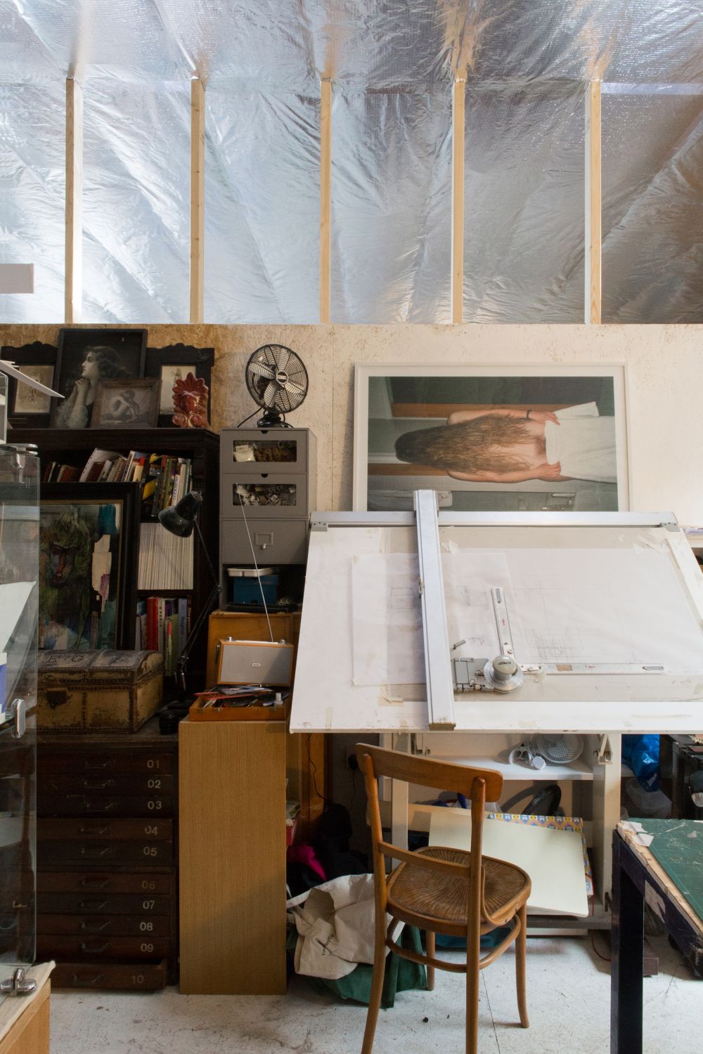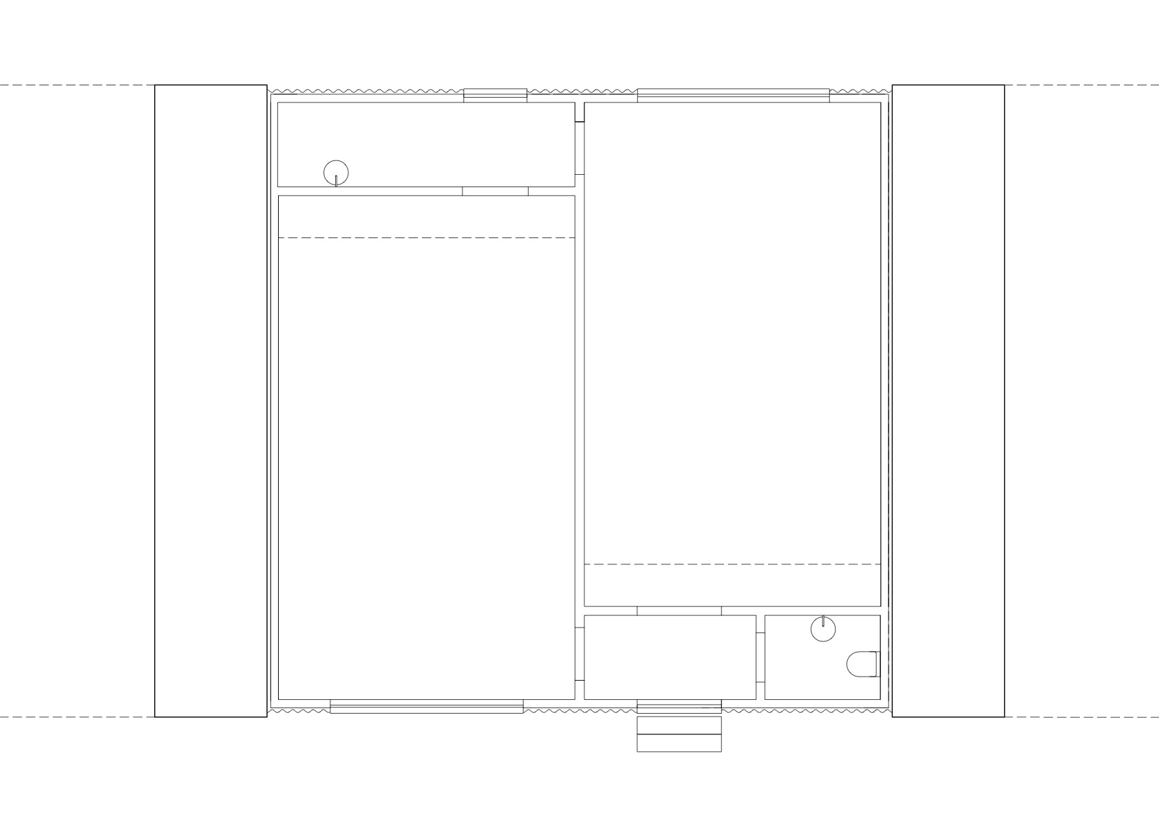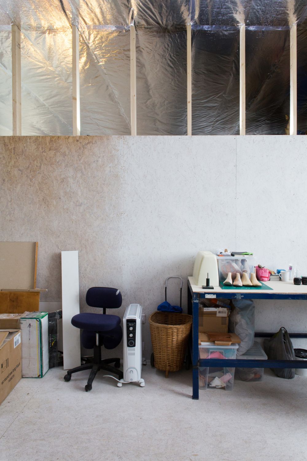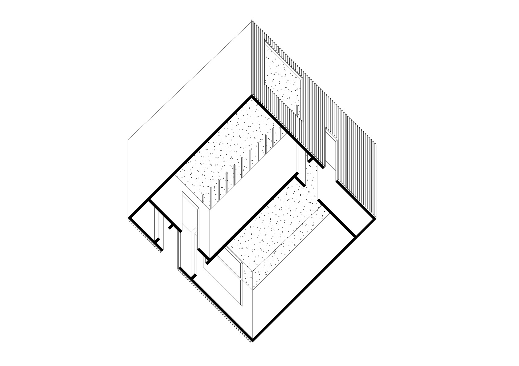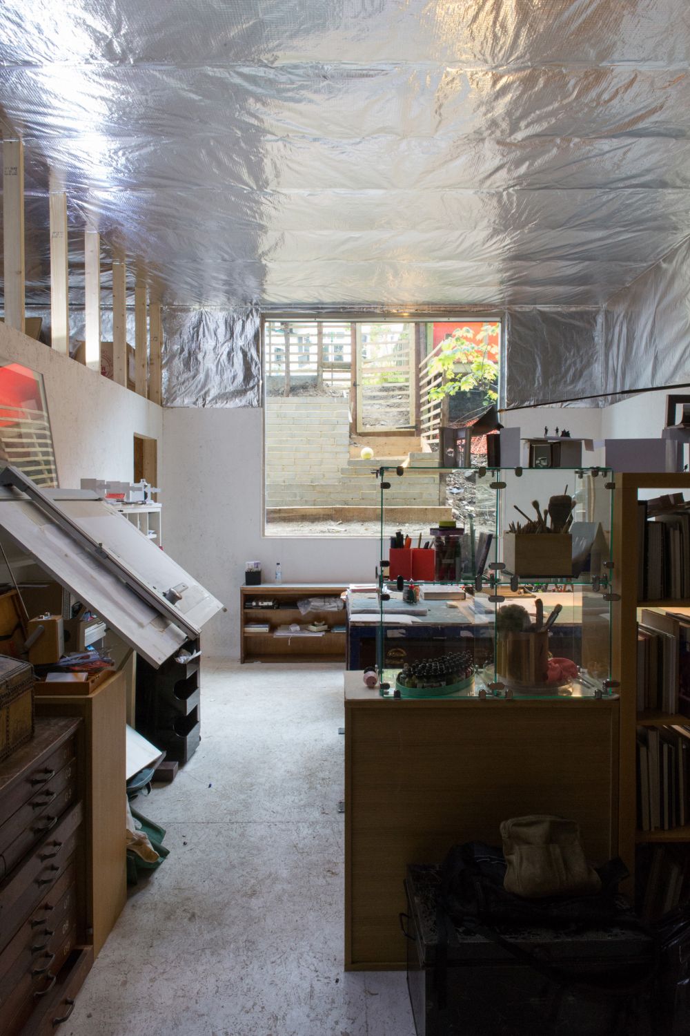 The way both studio spaces are arranged and mirrored, allows a continuous circulation and forms a relationship between to each other. Both rooms are arranged like ‘twins’ and evoke a sense of repetition. One is facing the clients garden with a clear window, the other with a translucent window facing north, creating the perfect light condition for a painting studio. Walking back and forward between both studios suggests a comparison and reveals their particular nuances, light condition and character.
