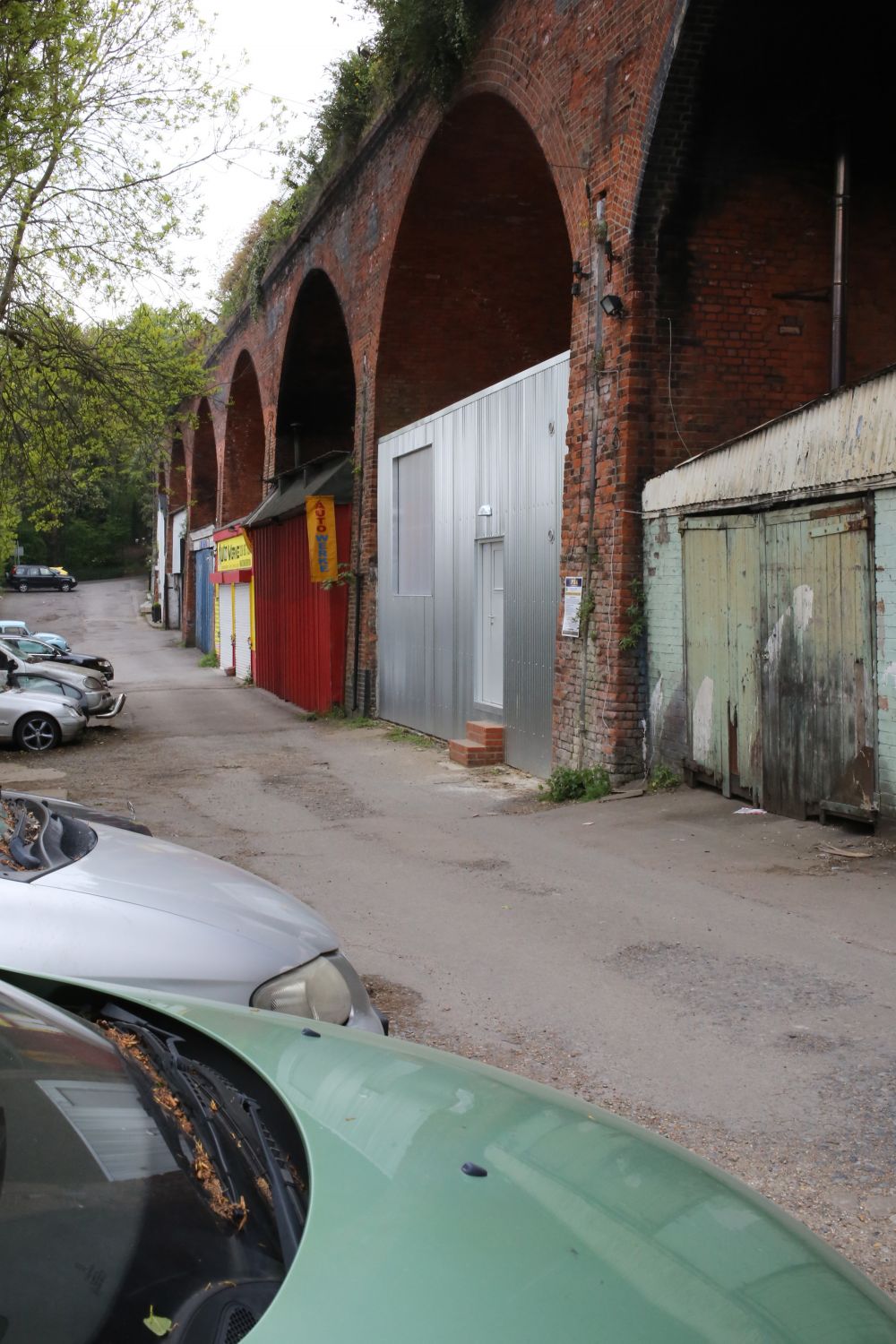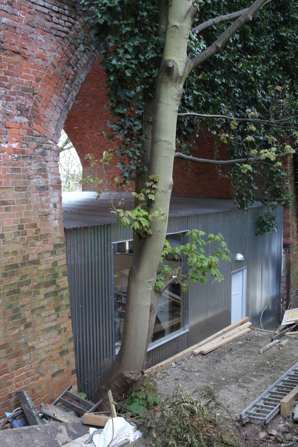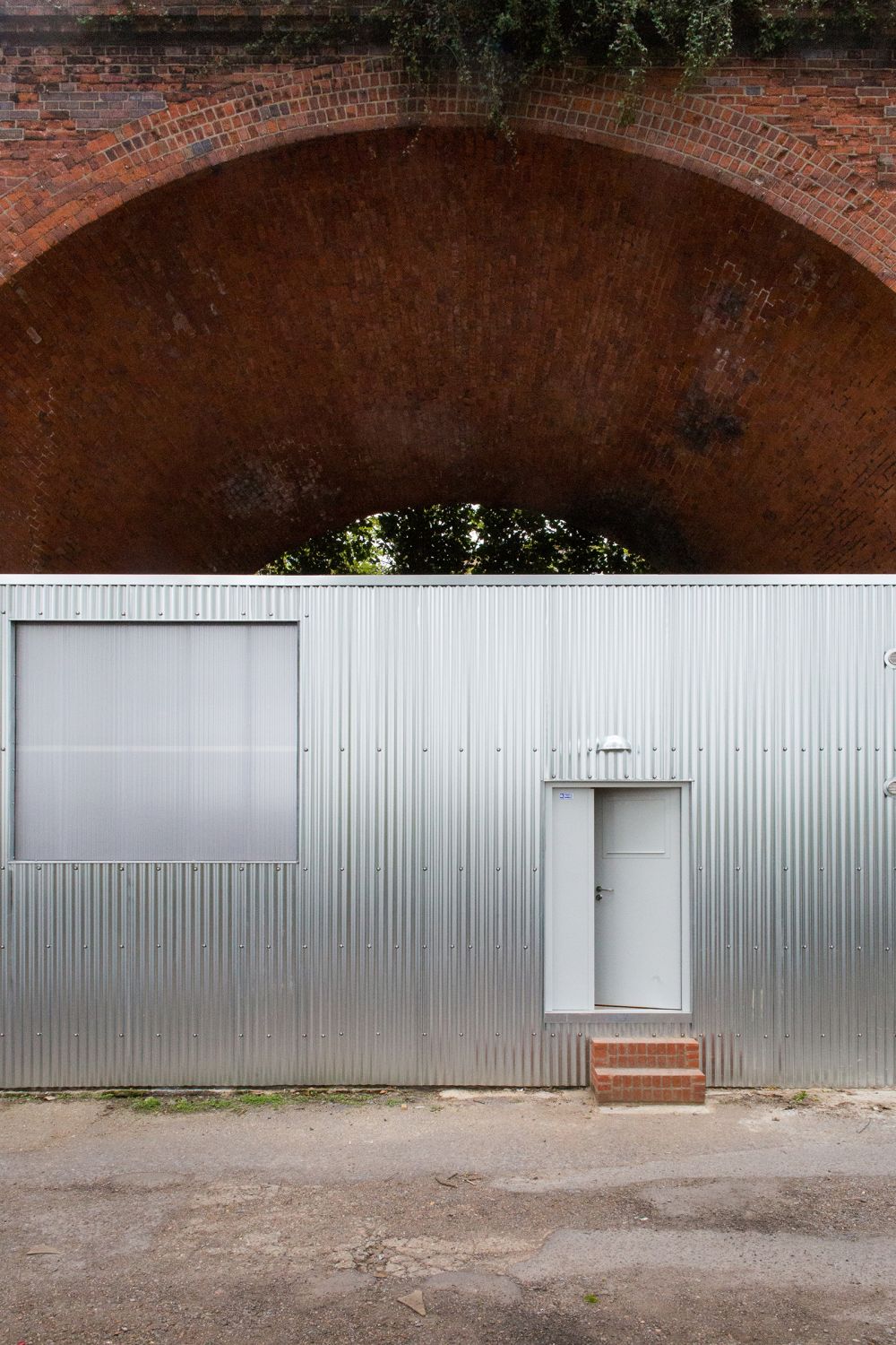 New build artist studios, using off the shelf materials to a cost of less than £420 per sqm. The plan is made of two identical spaces mirrored to form twin facades, one faces the client’s private house and garden behind the viaduct, while the other offers views onto the London skyline.