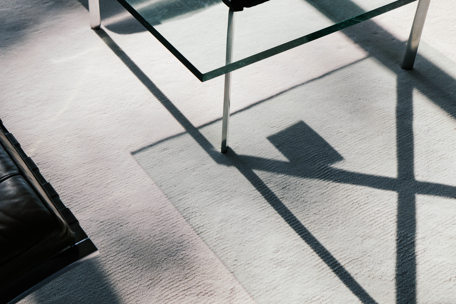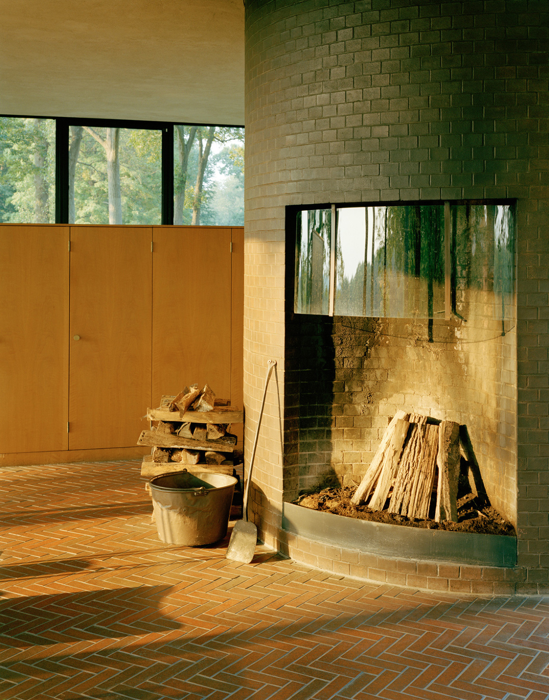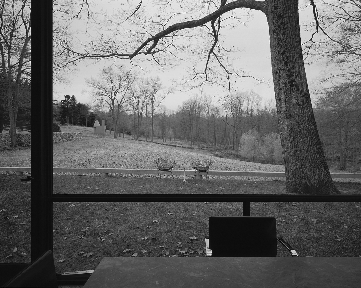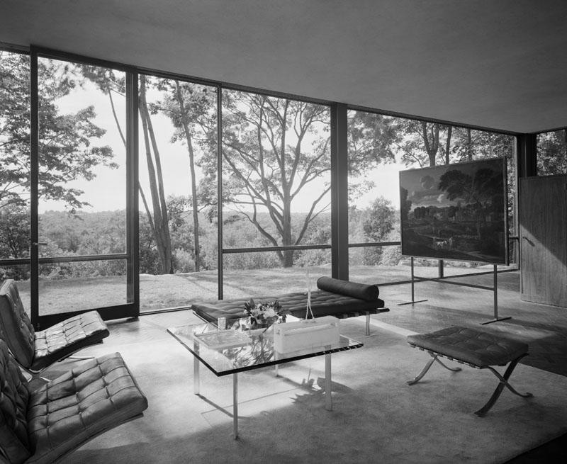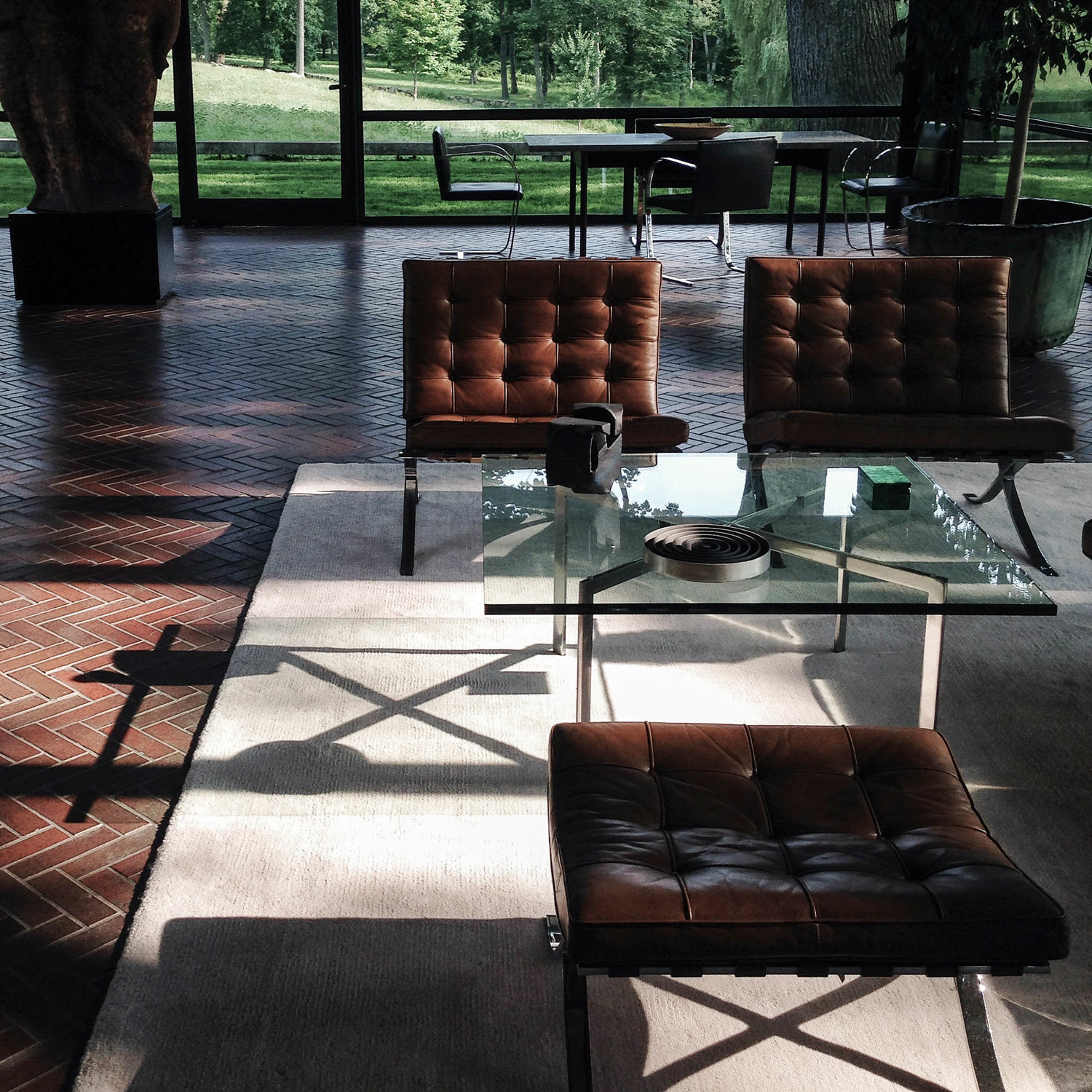 The basic concept for Johnson’s glass house was borrowed from Ludwig Mies van der Rohe, who was designing the glass-and-steel Farnsworth House during the same period. Unlike the Farnsworth House, however, Philip Johnson’s home is symmetrical and sits solidly on the ground. The quarter-inch thick glass walls are supported by black steel pillars. The interior space is divided by low walnut cabinets and a brick cylinder that contains the bathroom. The cylinder and the brick floors are a polished purple hue.