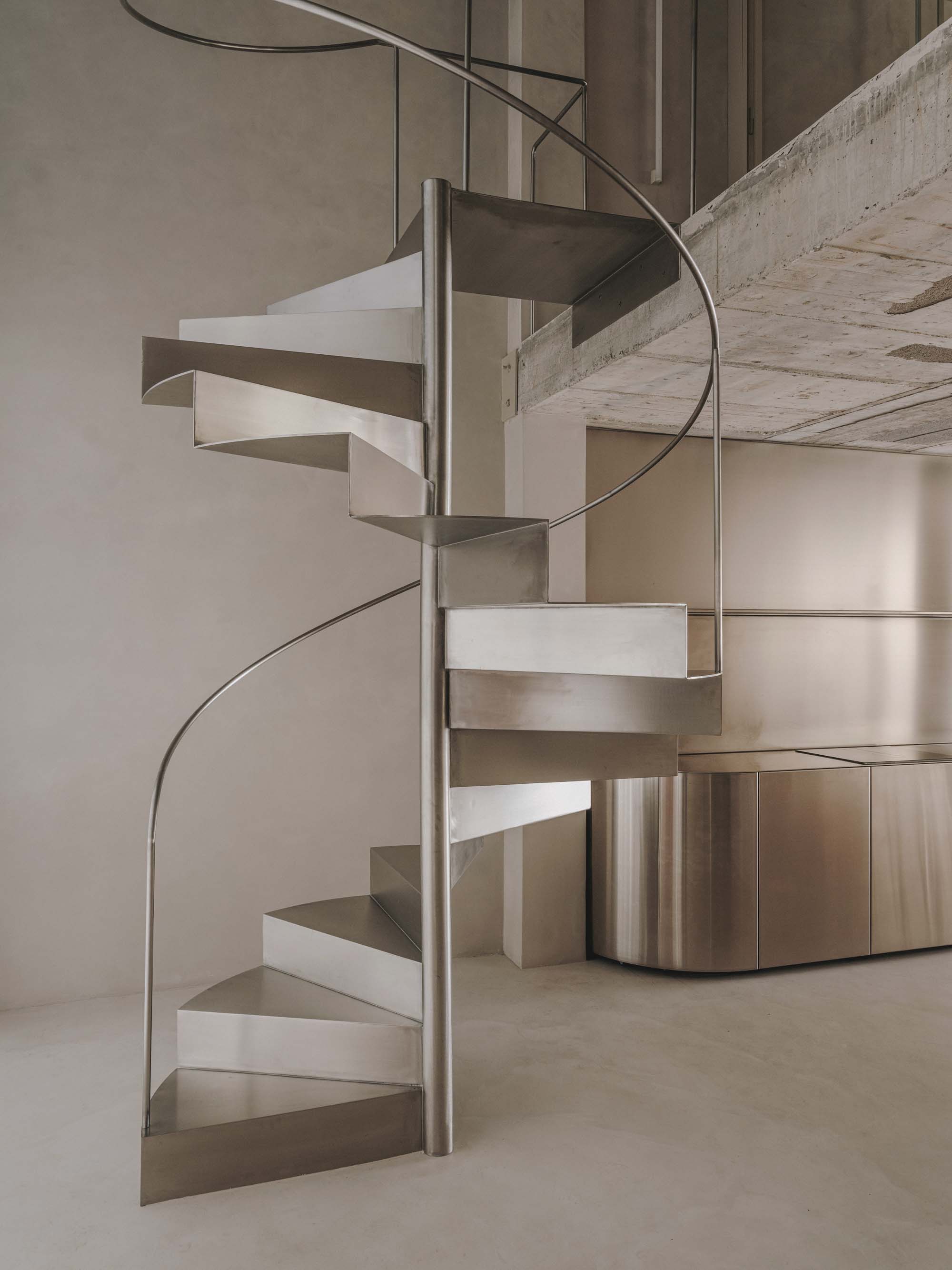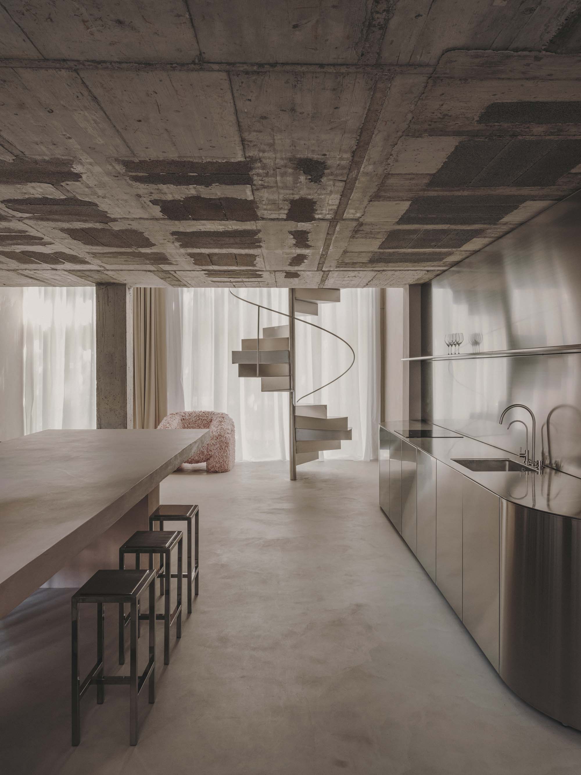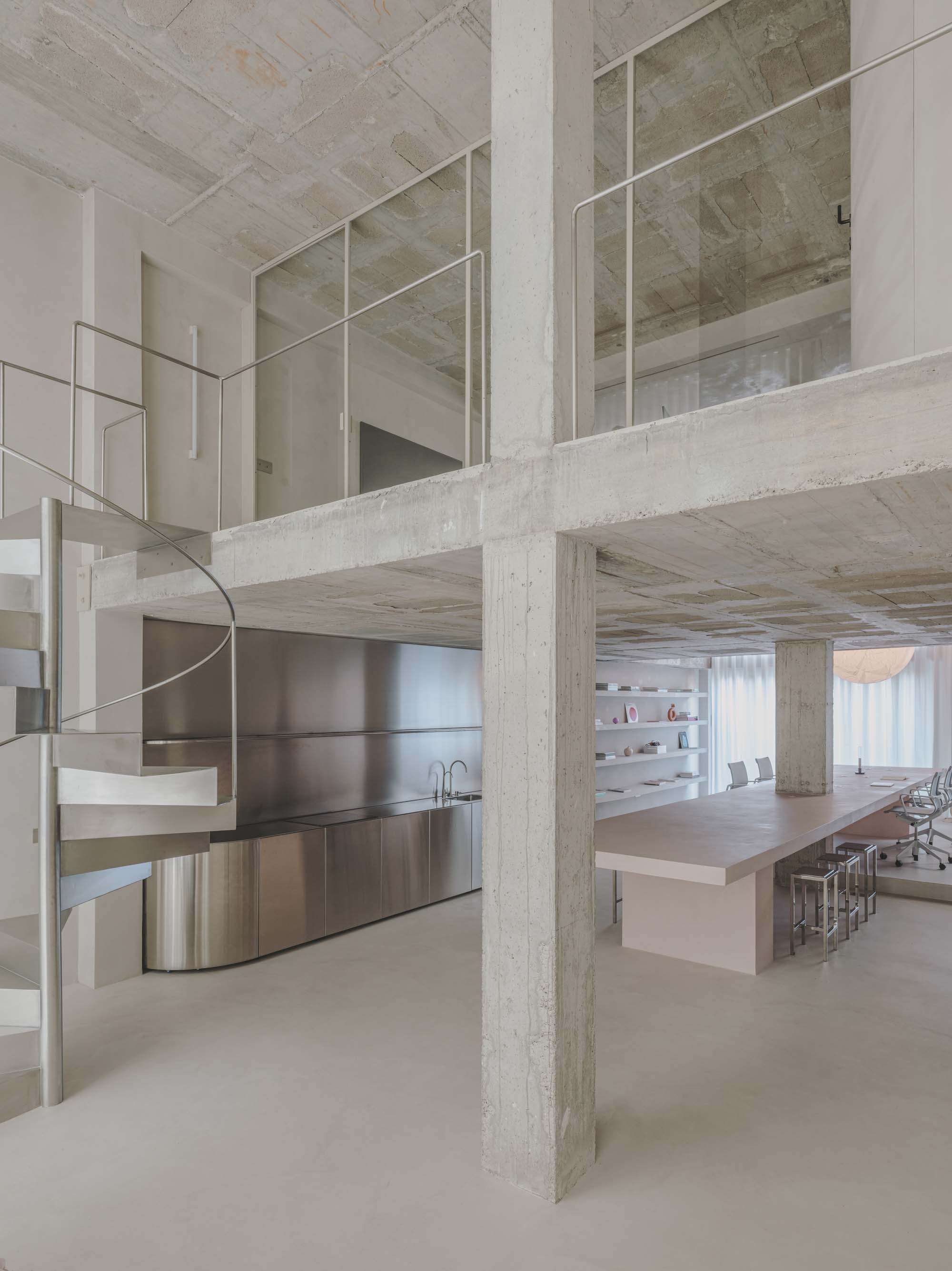 La intervención pretende diseñar un espacio de trabajo a través de elementos influenciados por la arquitectura existente. Un espacio donde la estructura de hormigón queda expuesta en su estado más crudo. Jugando con el contrapunto de la elegancia y sofisticación de los elementos que estructuran el espacio, tratados como verdaderas esculturas realizadas en acero inoxidable, la escalera que hace de puente en la verticalidad del espacio y la cocina en su horizontalidad. Elementos inspirándose en el mundo digital de Andres Reisinger, y que evocan a un espacio surrealista, onírico y escultórico.