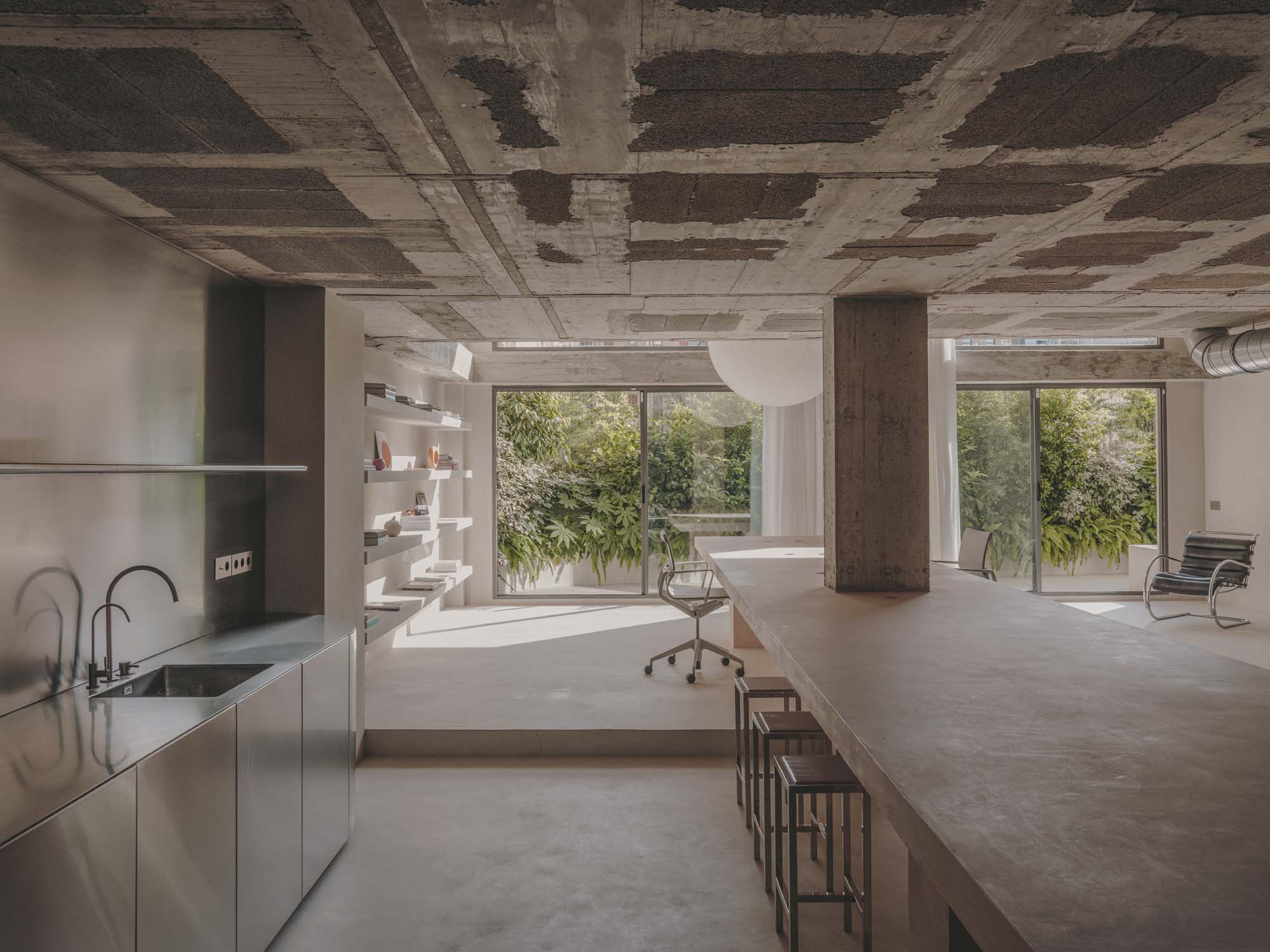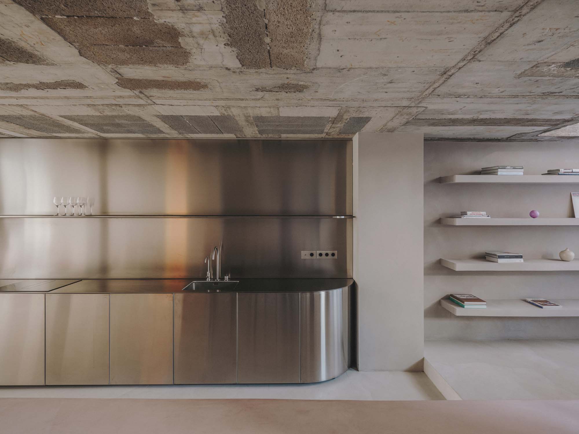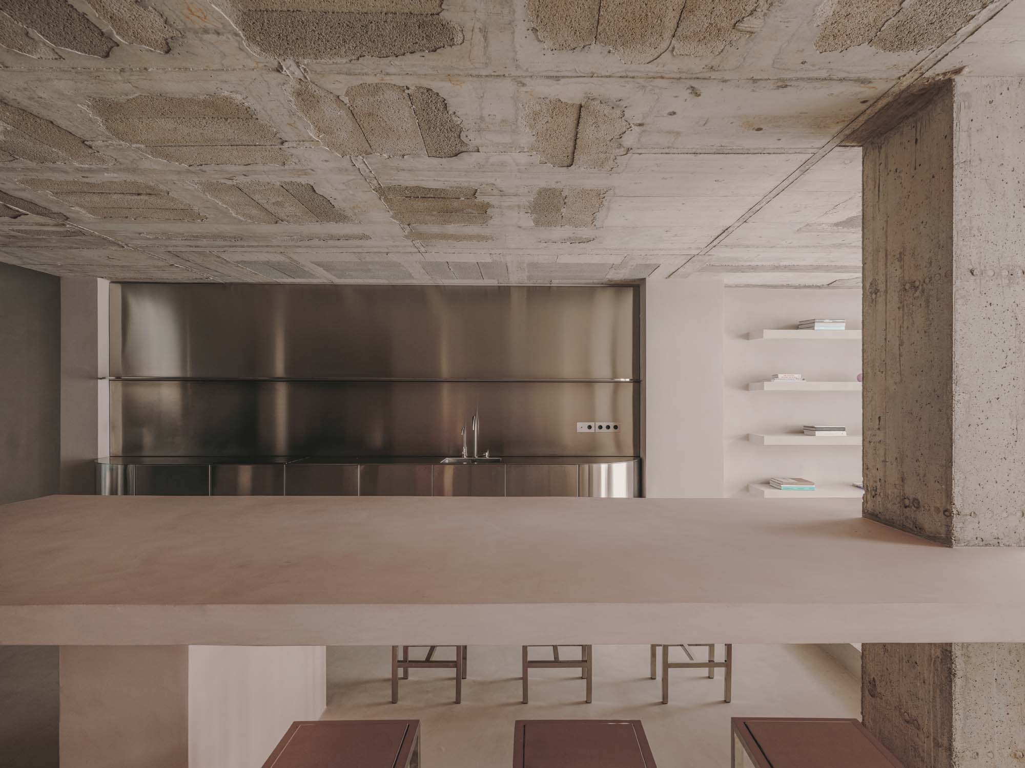 La intervención pretende diseñar un espacio de trabajo a través de elementos influenciados por la arquitectura existente. Un espacio donde la estructura de hormigón queda expuesta en su estado más crudo. Jugando con el contrapunto de la elegancia y sofisticación de los elementos que estructuran el espacio, tratados como verdaderas esculturas realizadas en acero inoxidable, la escalera que hace de puente en la verticalidad del espacio y la cocina en su horizontalidad. Elementos inspirándose en el mundo digital de Andres Reisinger, y que evocan a un espacio surrealista, onírico y escultórico.