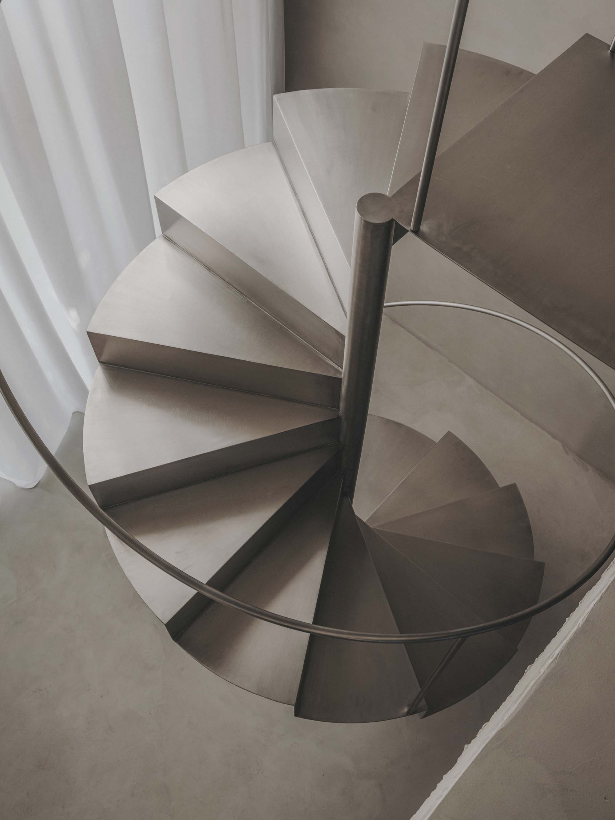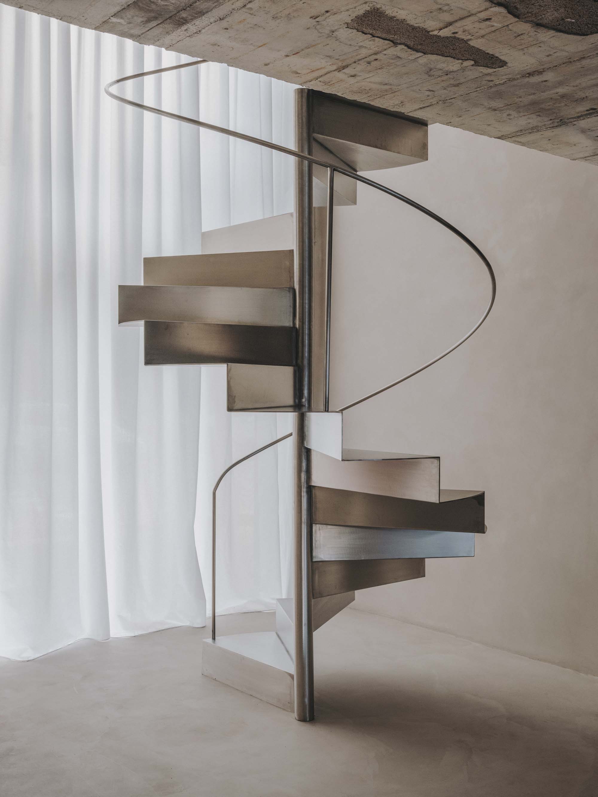 En la zona de doble altura más cerca de la calle se ubica la escalera de caracol que nos conduce al altillo donde está el lugar de trabajo de Andres. La escalera es una de las piezas más emblemáticas del proyecto, Se trajo de una sola pieza pulida y colocarla in situ como si de una escultura se tratase.