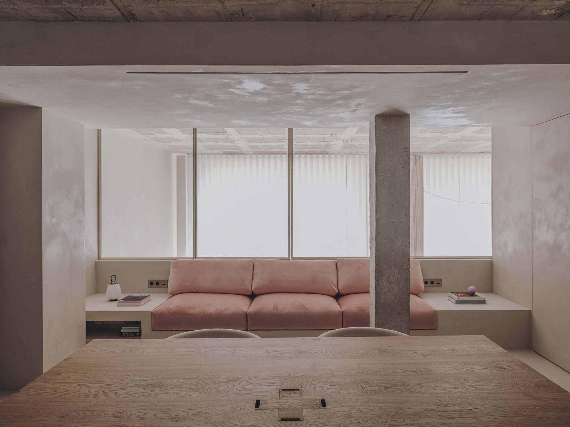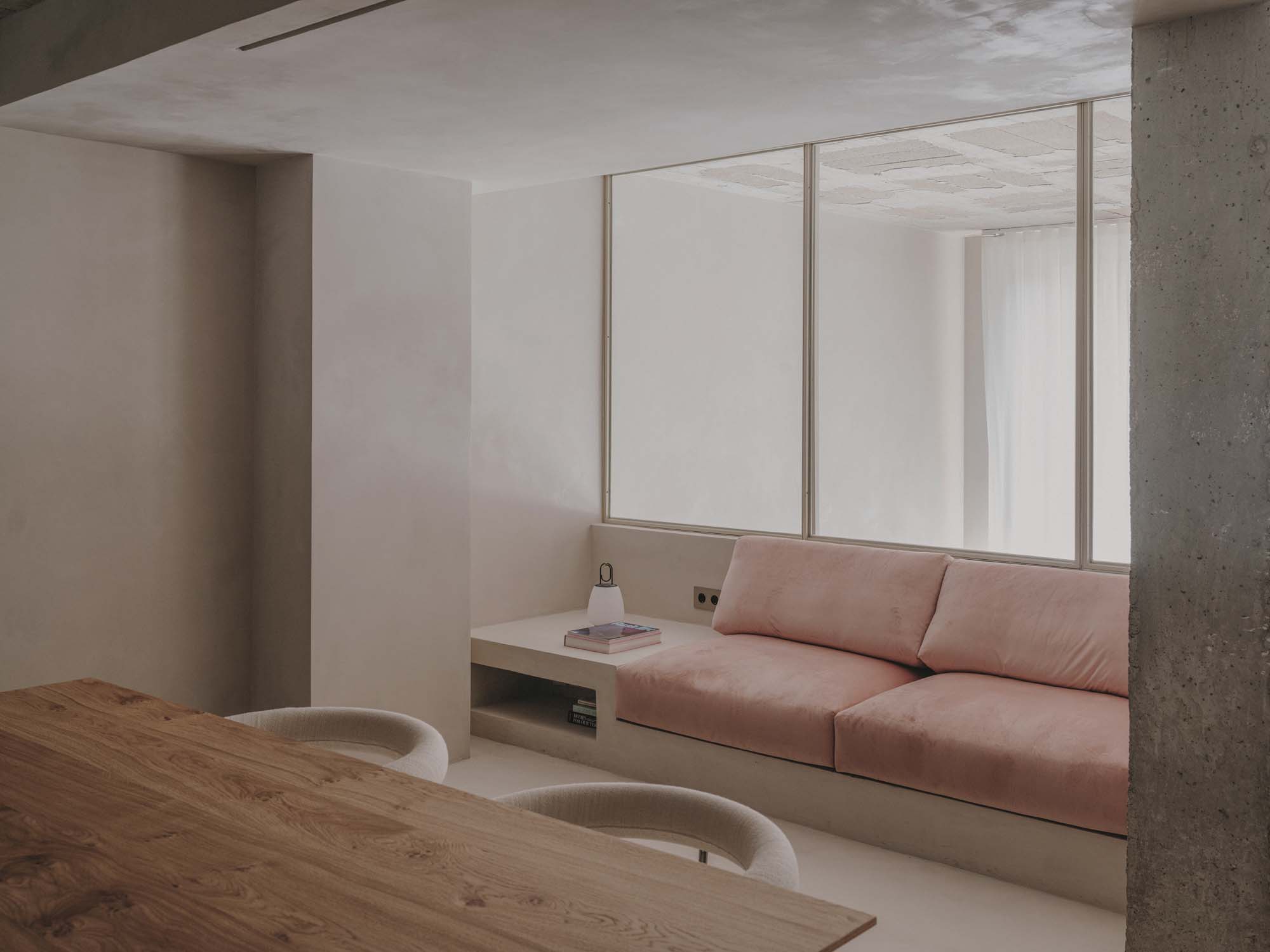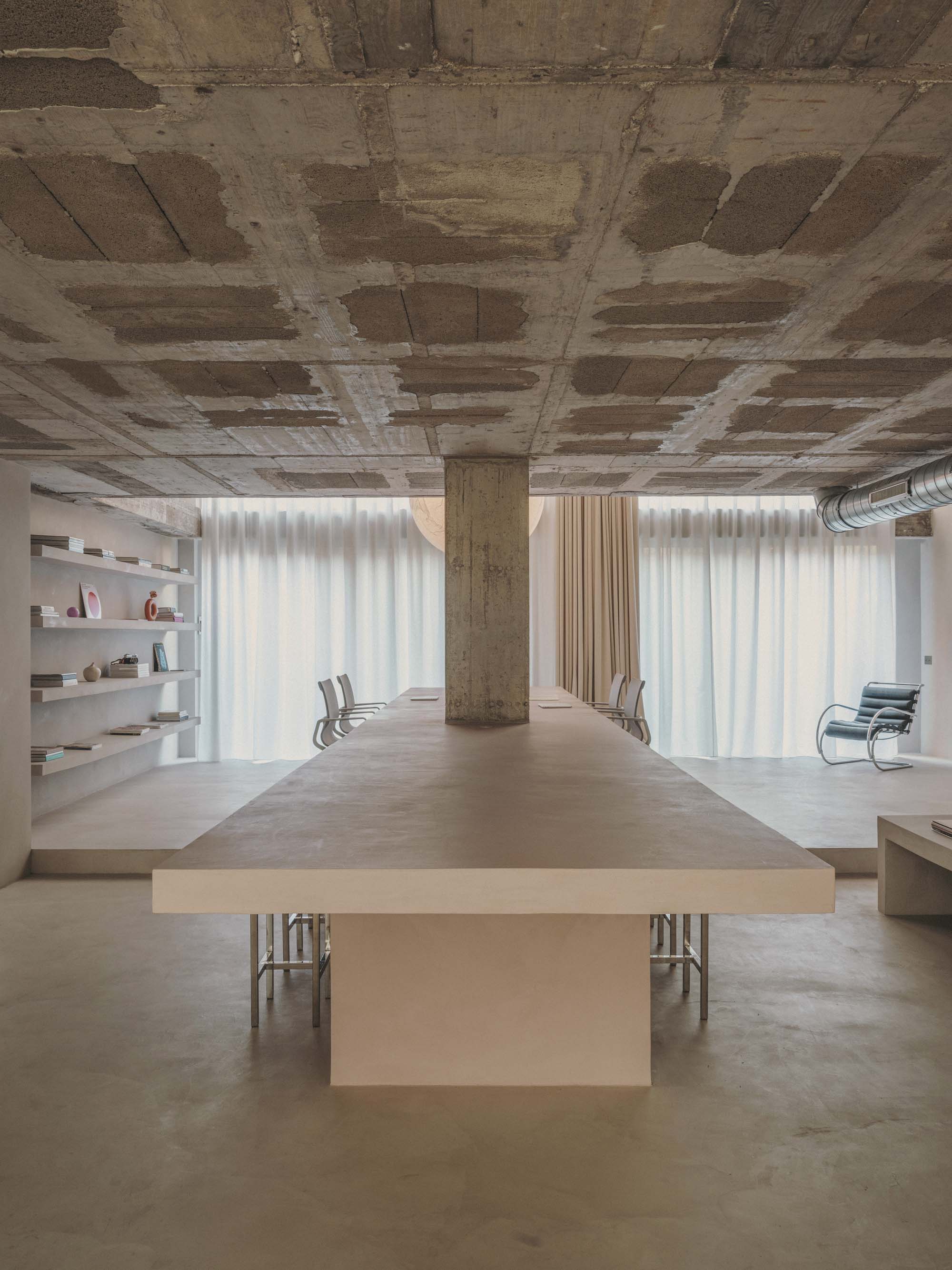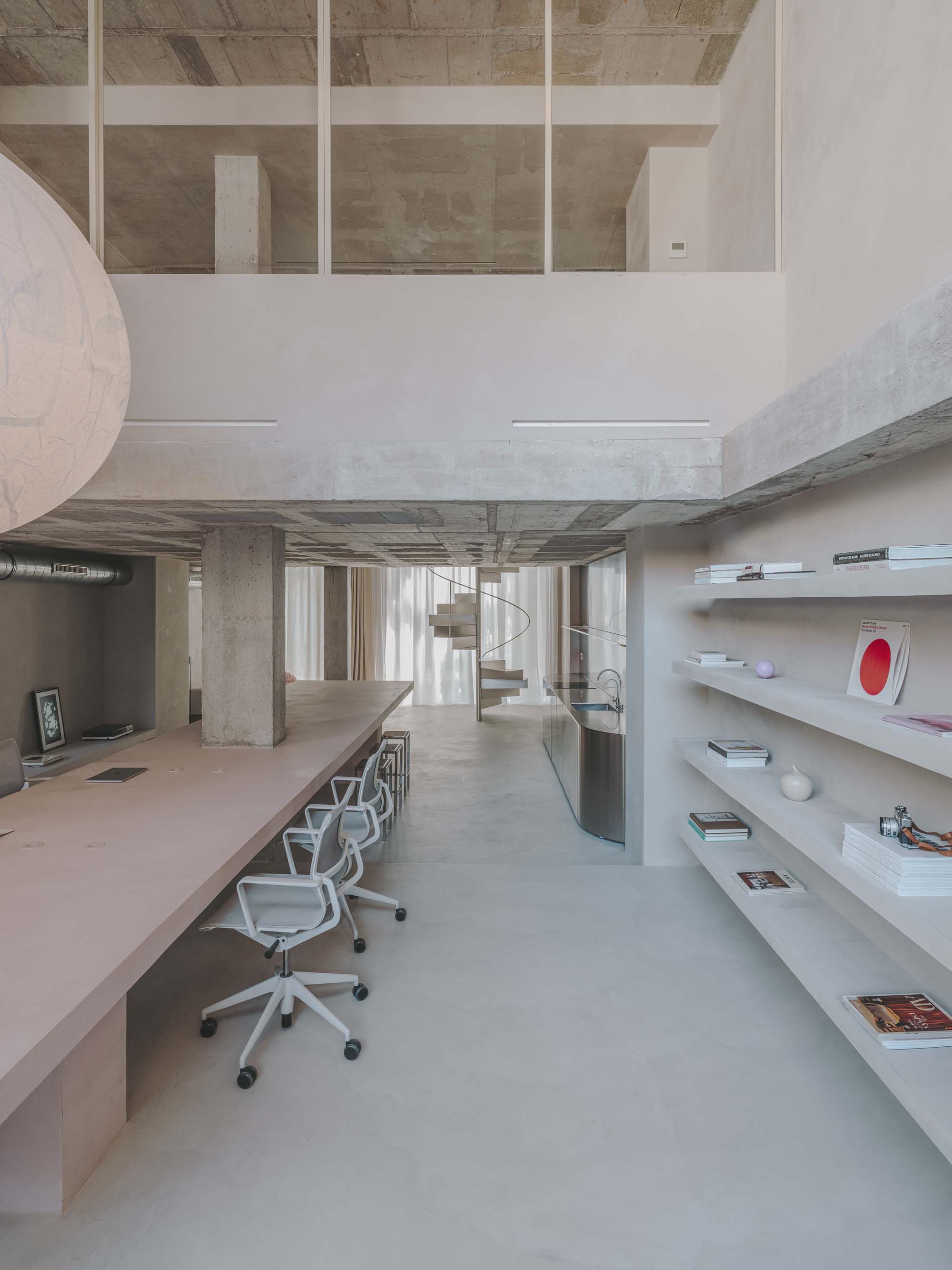 El espacio se estructura con una gran mesa central de hormigón sujeta a uno de los pilares. Queríamos diseñar una mesa continuara por todo el espacio. Una mesa que funcionara como espacio de trabajo y comedor. Decidimos elevar el suelo de la zona de trabajo, lo que a su vez nos ayuda a pasar el cableado. El color rosa de la mesa le permite destacar en el resto del espacio monocromático. Es la pieza central del estudio y su forma respeta la arquitectura existente del espacio.