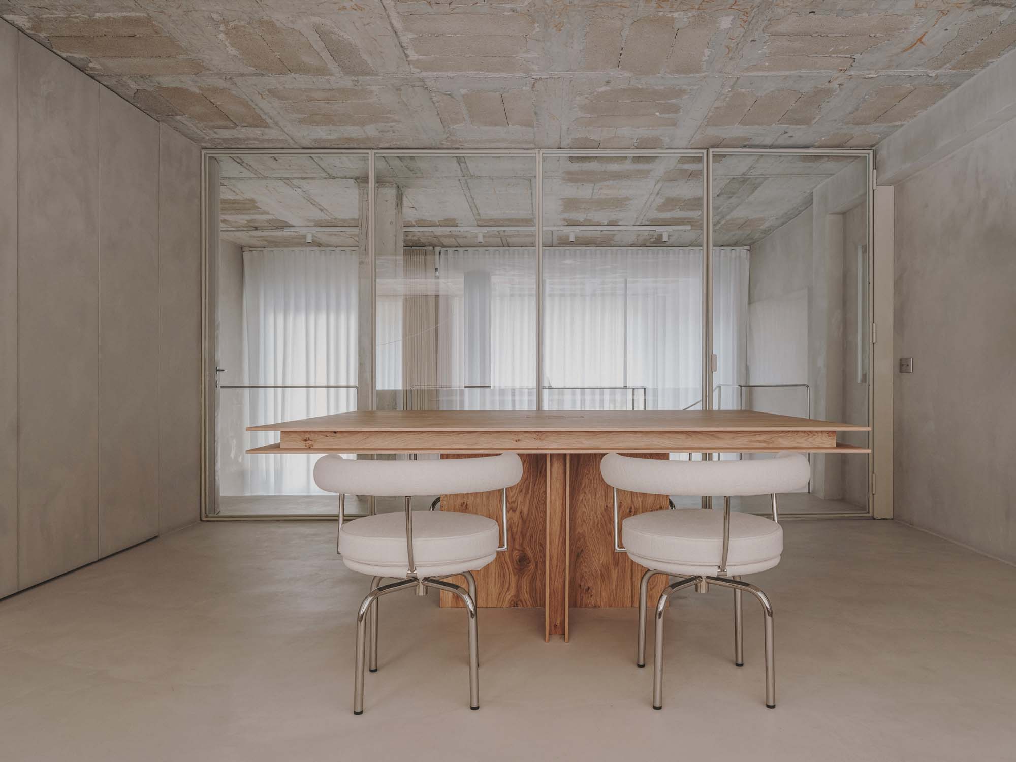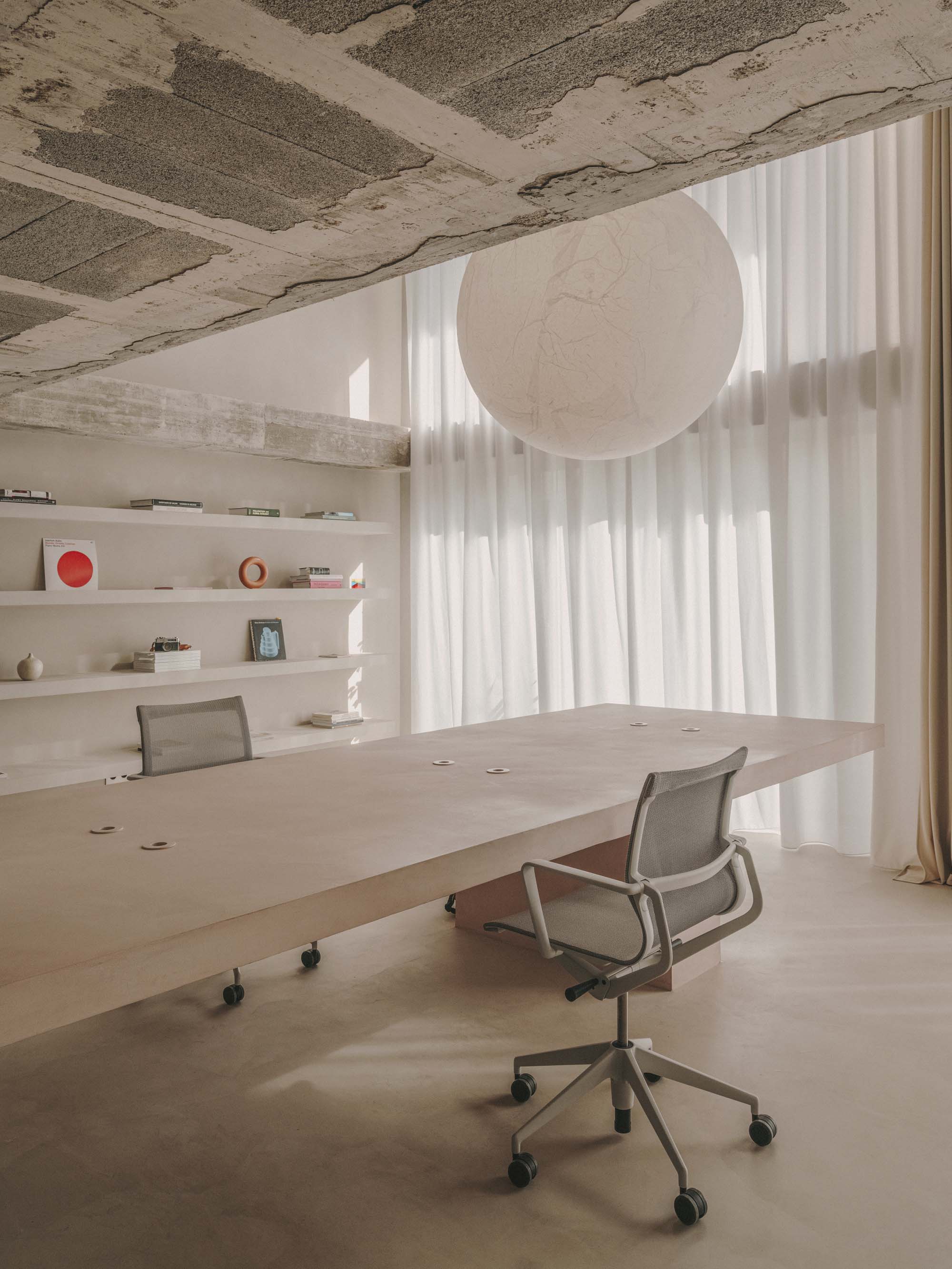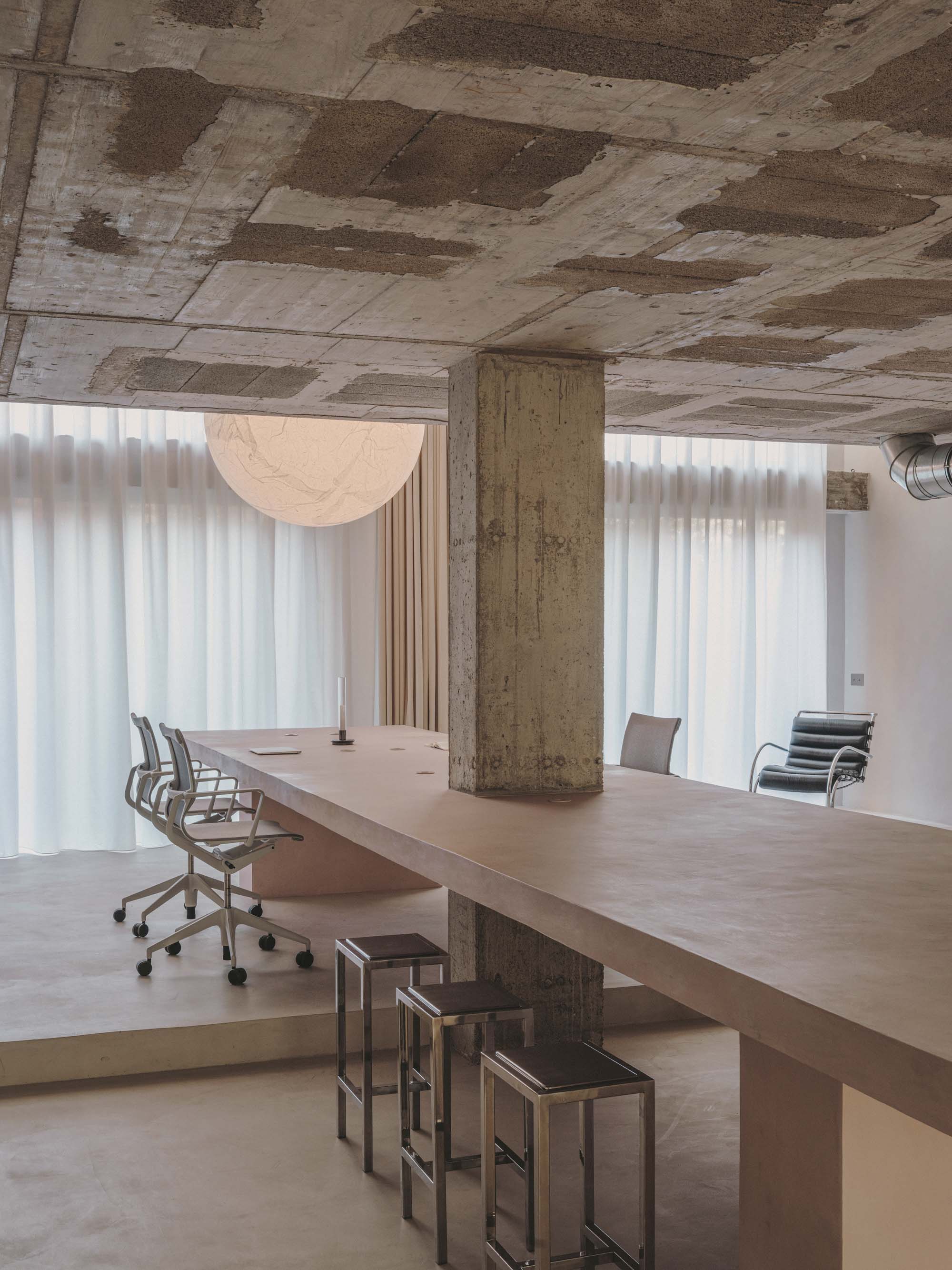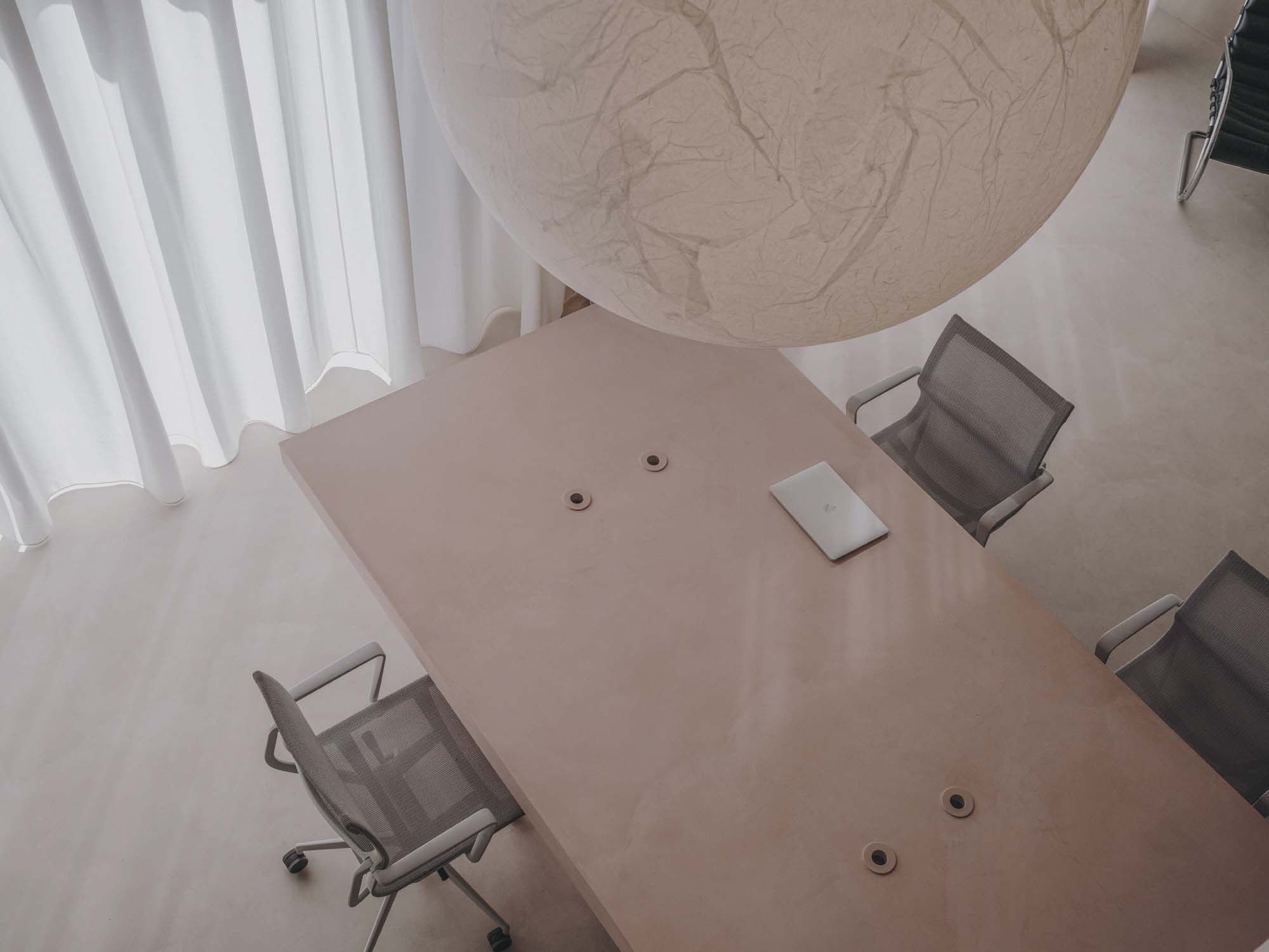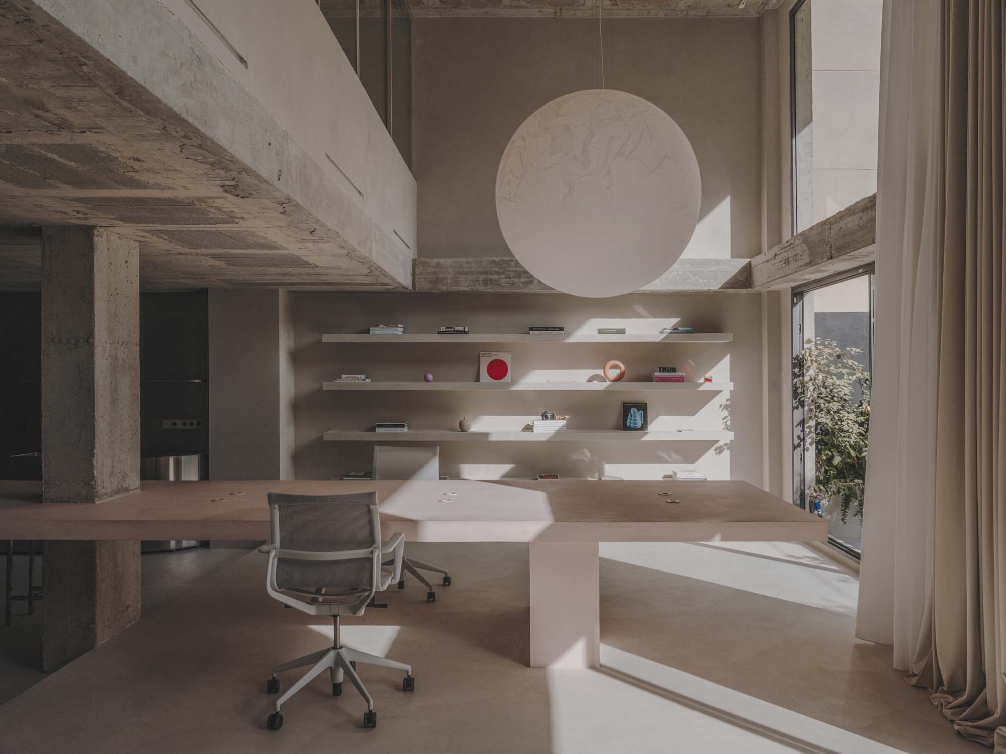 El despacho totalmente acristalado por las dos caras se compone de una gran mesa diseñada a medida en acabado roble natural y un sofá de obra con cojines también rosados como la mesa de hormigón. Las butacas LC7 de Cassina. El uso de muebles e iluminación que no siguen la estética normal de una oficina, le da al estudio una sensación más cómoda. Creando un espacio que parece onírico, sereno y surrealista. Fusionando las líneas entre el mundo físico y el mundo digital.