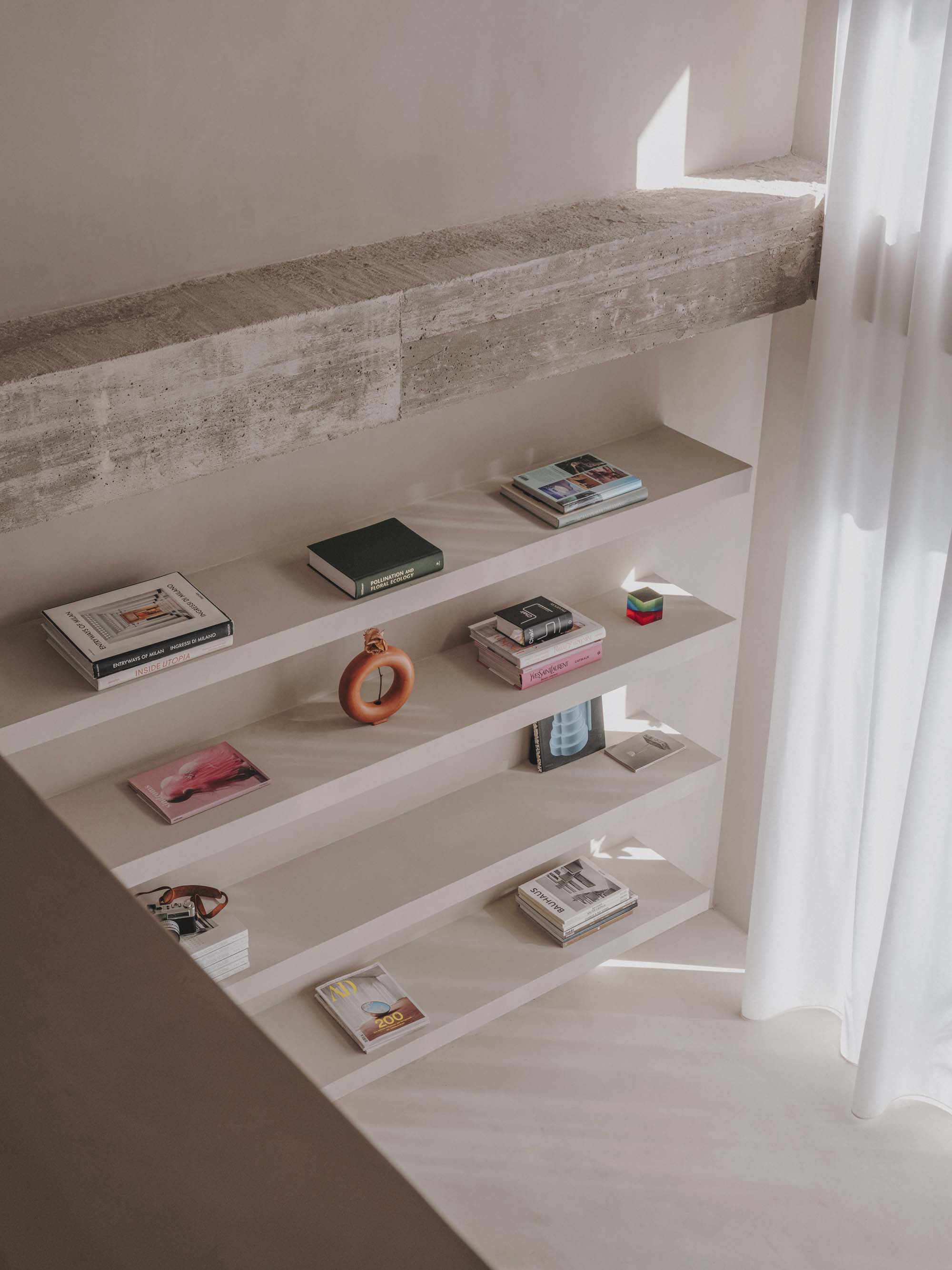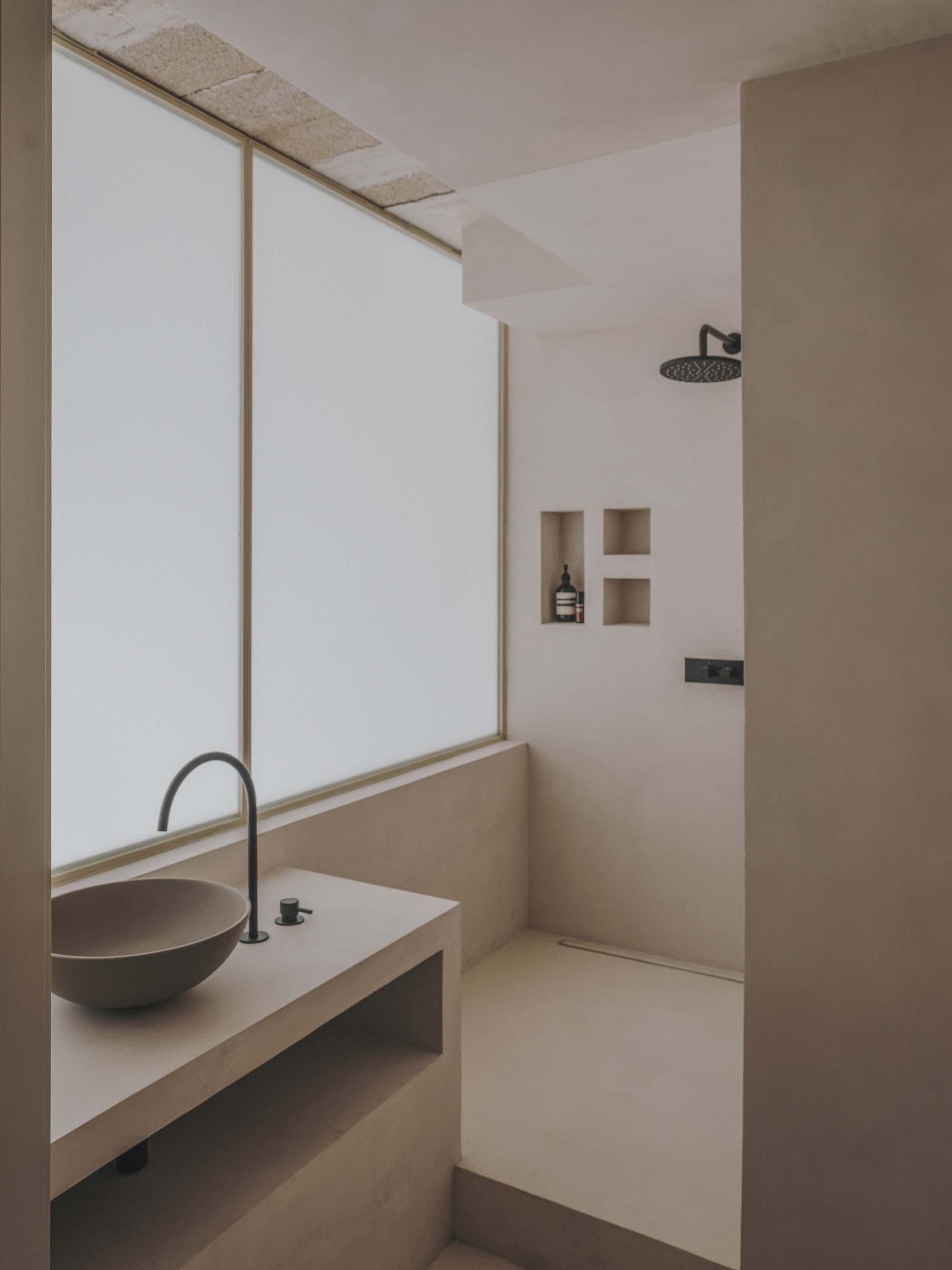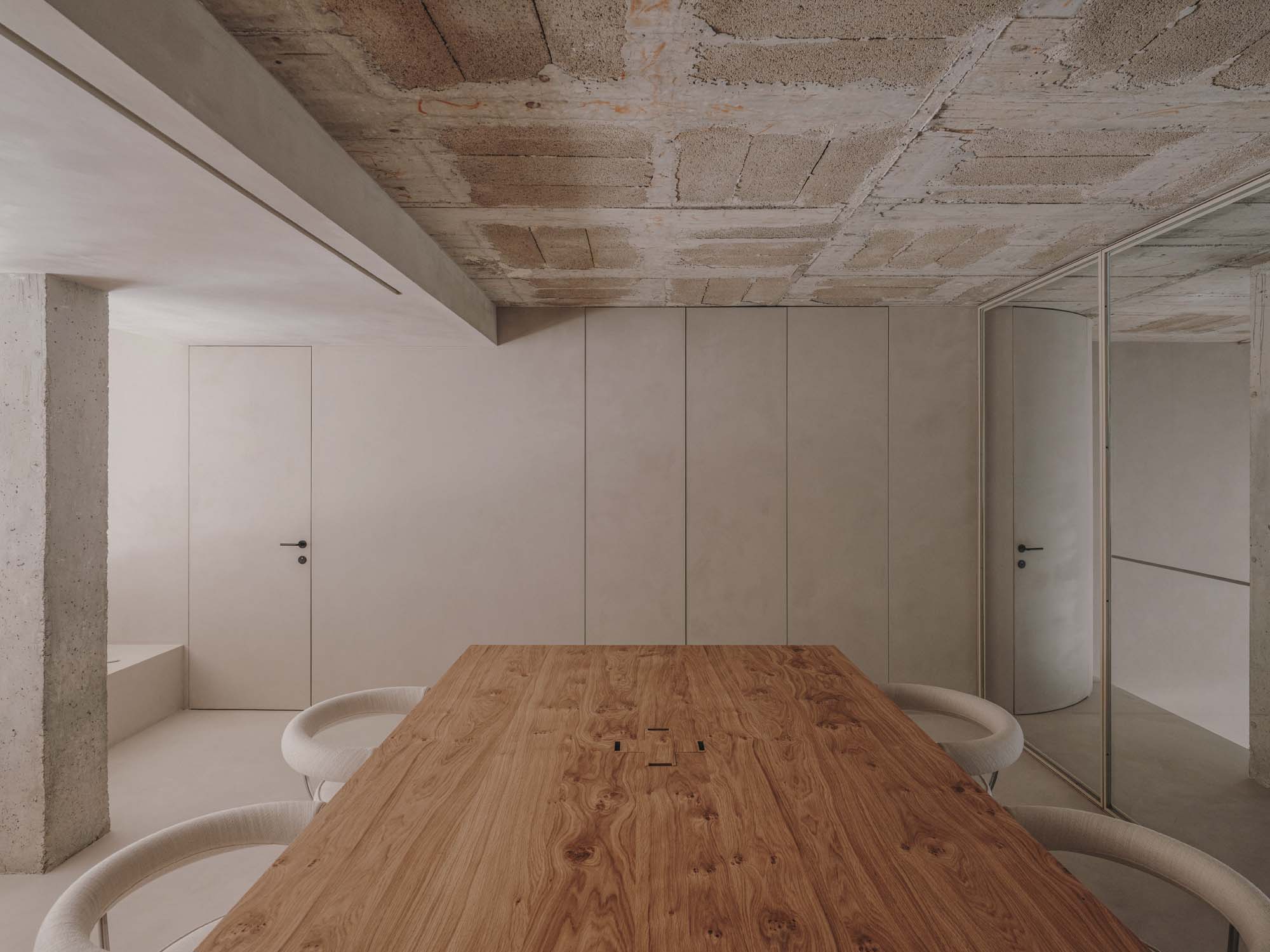 Los materiales de las paredes y el suelo se eligieron para que coincidieran con los tonos crudos y las texturas del hormigón existente. Acabado con una pintura a base de cuarzo. Esta pintura les da a las paredes un aspecto y tacto irregular y artesanal. Con un tacto suave como el terciopelo, pero un aspecto crudo que recuerda a los materiales existentes. Con un tono gris-beige a juego con la estructura y el techo de hormigón. A partir de este material se añade el microcemento para que tenga el mismo tono y textura para crear un mundo monocromático.