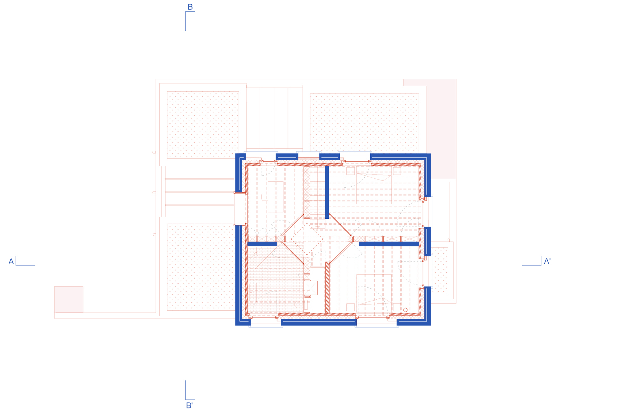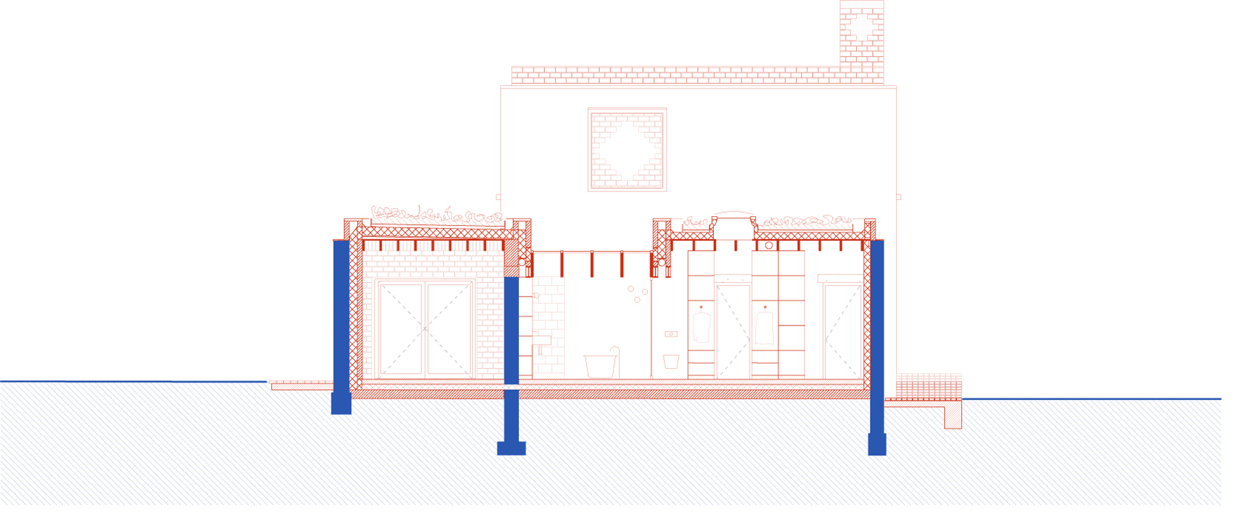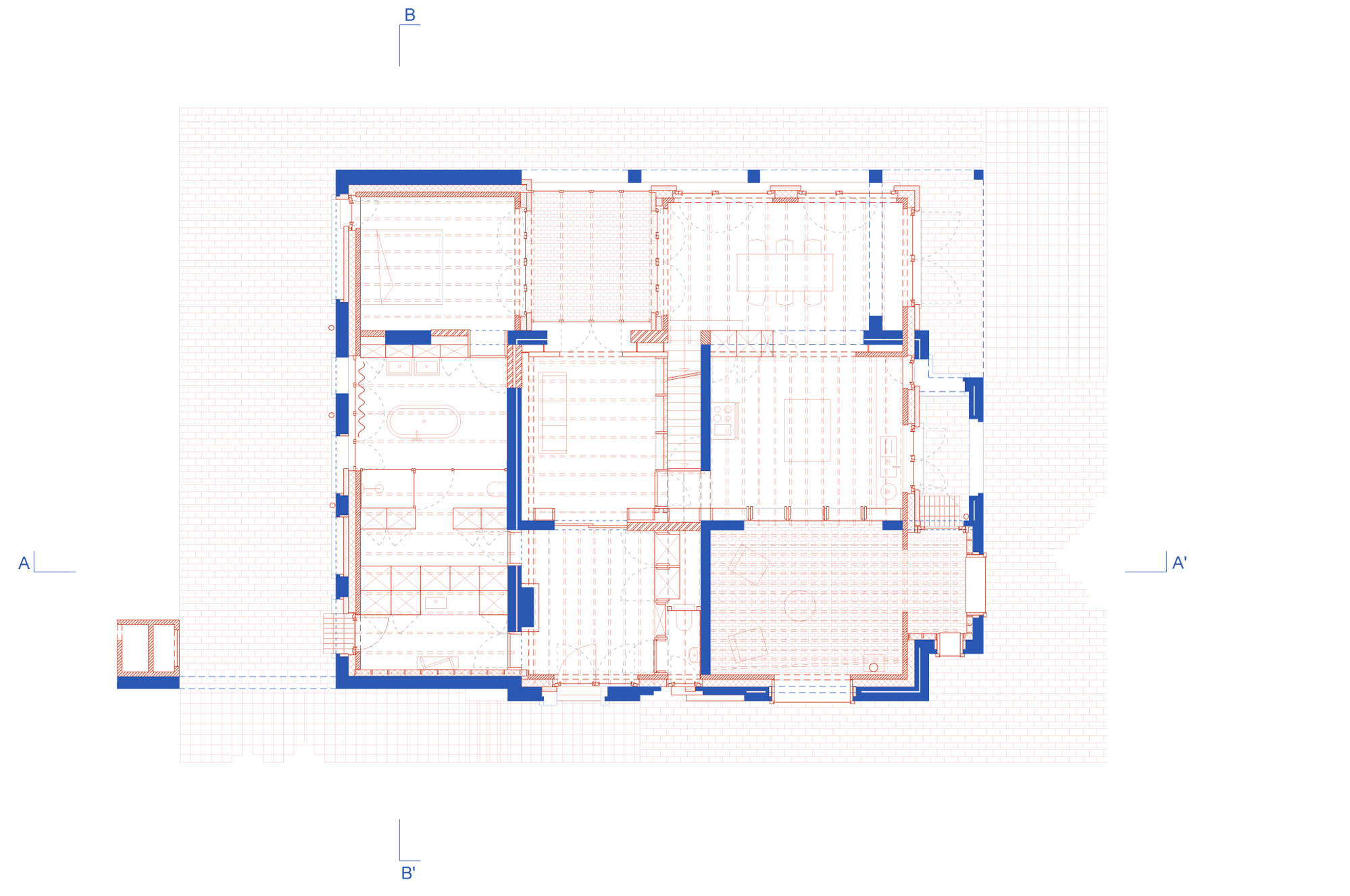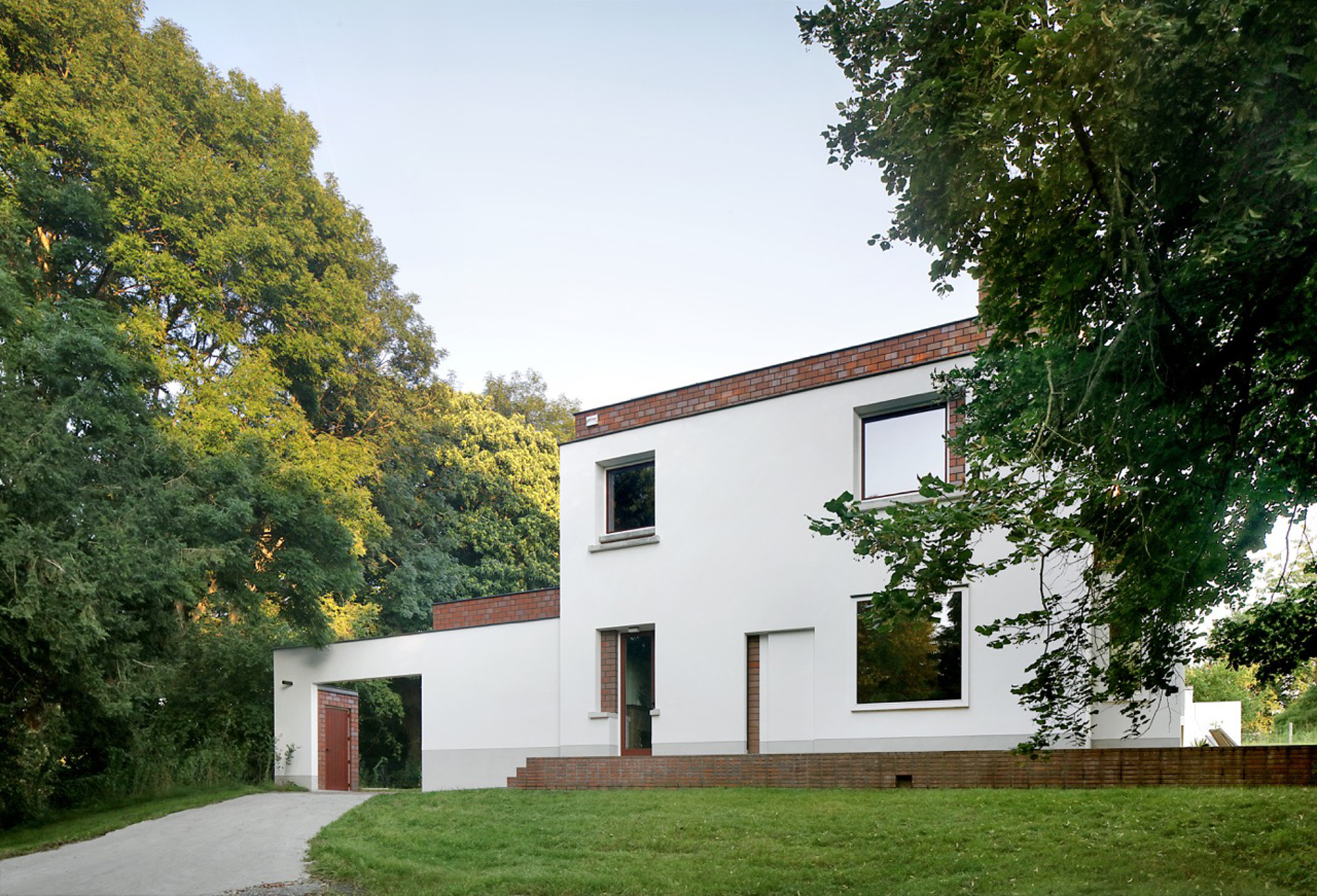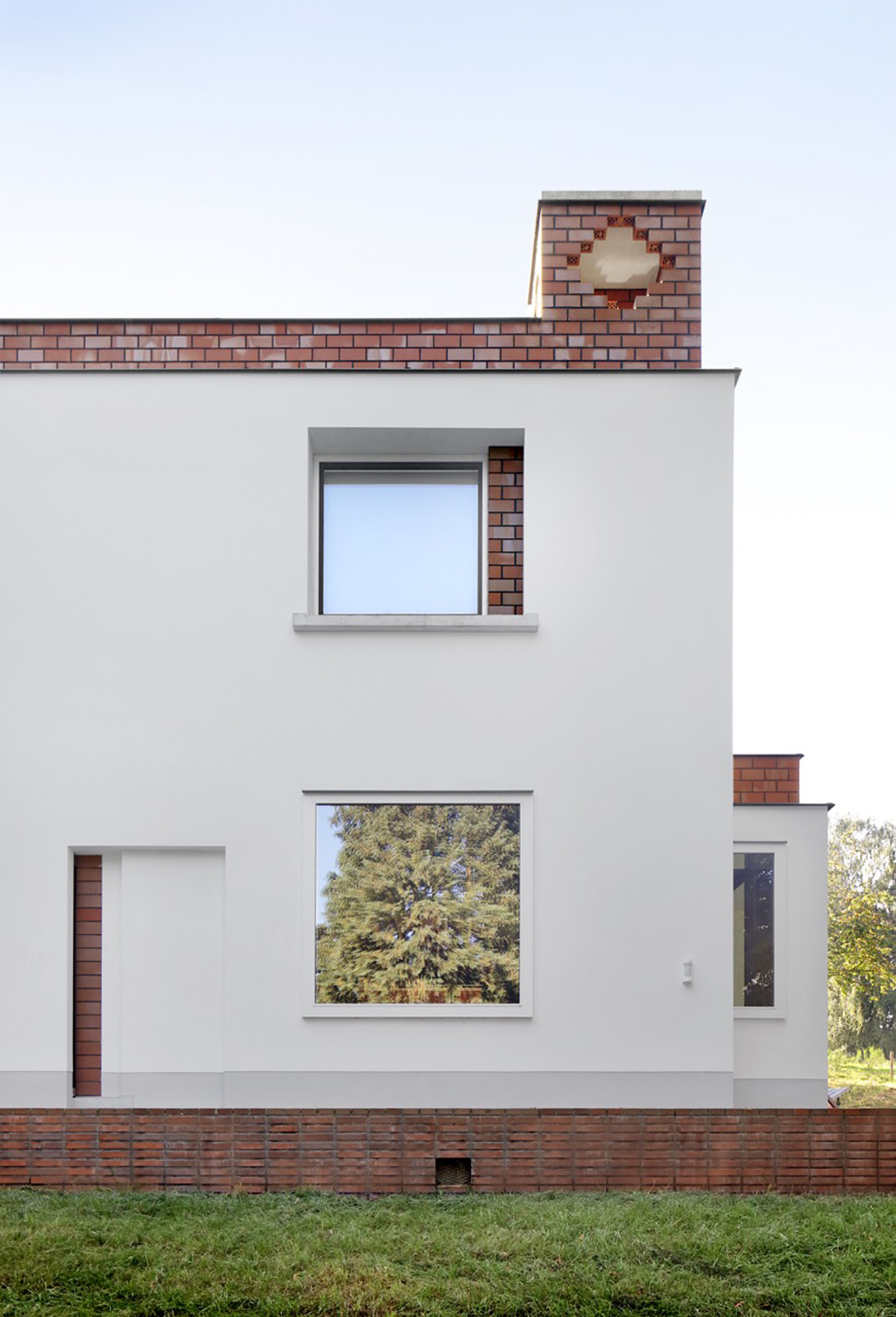 In the midst of green fields, south of Brussels, stood a 1960s modernist-looking villa. White-plastered walls, flat roofs and a garden pavilion. The new owner bought it because of its aesthetic appeal, which should not be lost when renovating it. The starting point of the design was to insulate the house from the inside following a clear logic: while the white outer walls of the original house remained, a new house was built inside with red brick. In addition, white building blocks were used to add a window or door in the old interior walls and re-arrange the spaces. The result is a new plan of nine rooms on the ground floor, joined more or less asenfilade, while a cross-shaped timber structure makes four new rooms on the first floor. The same logic was then continued in the garden pavilion, where a wellness and studio space were added.