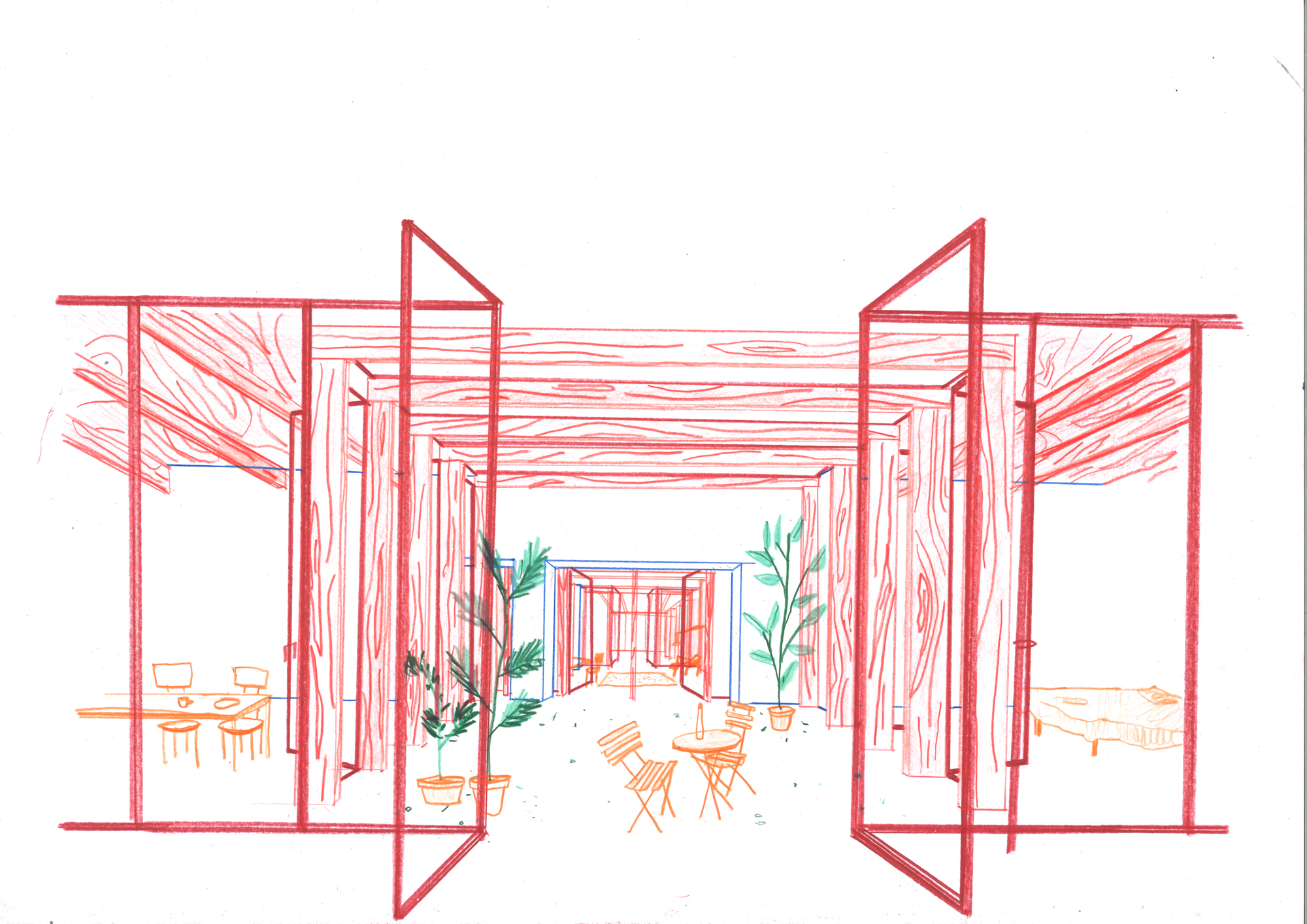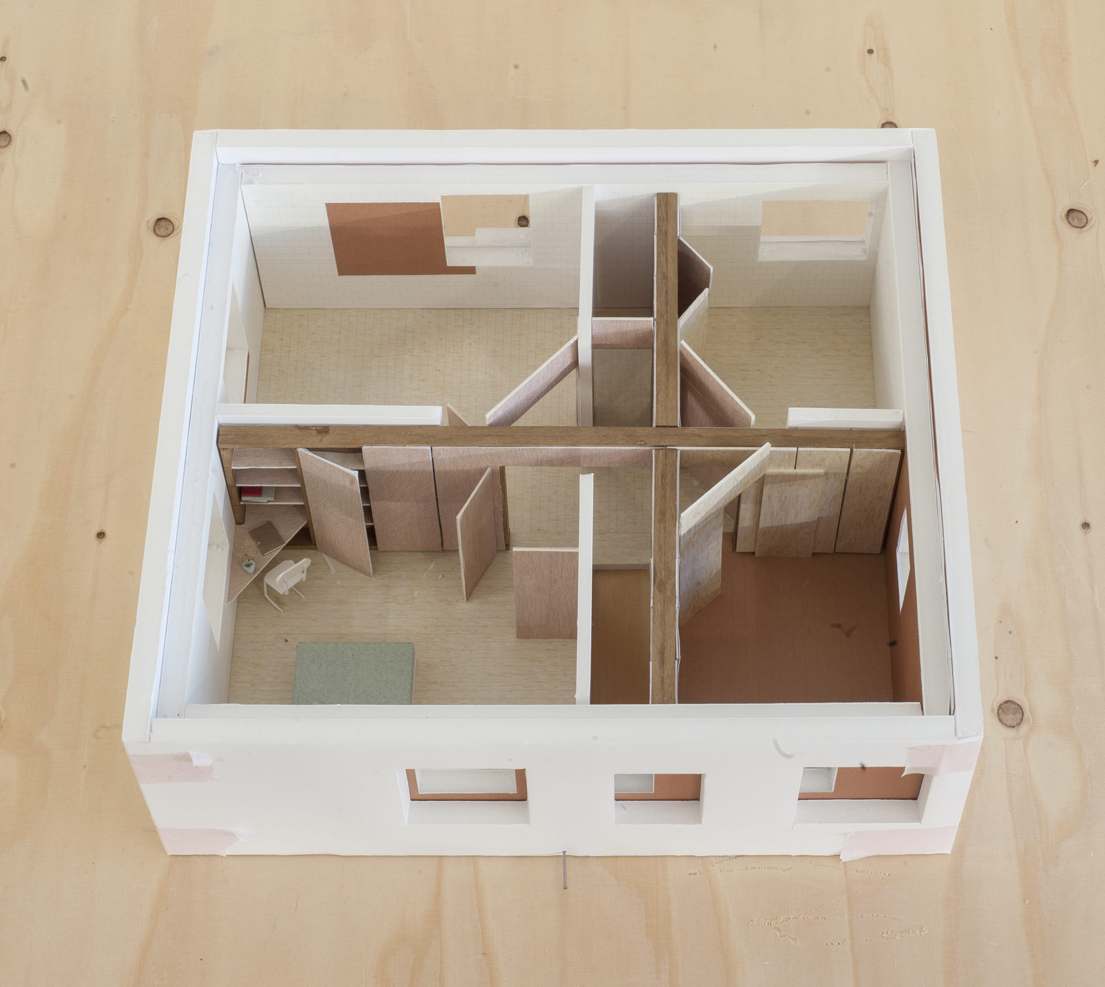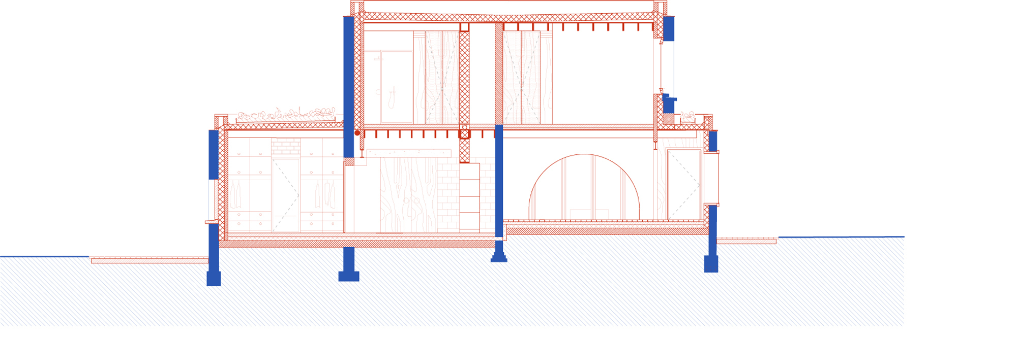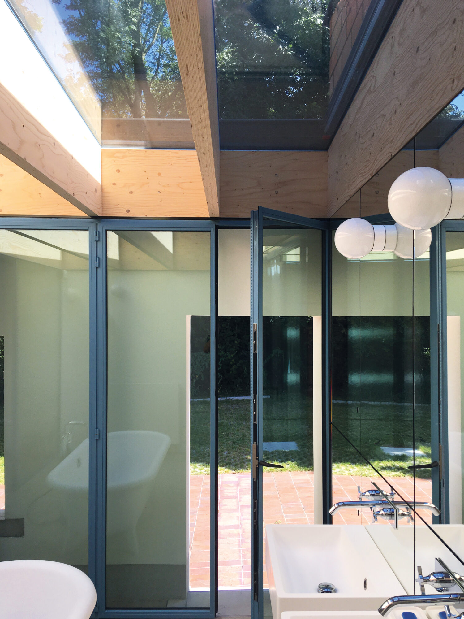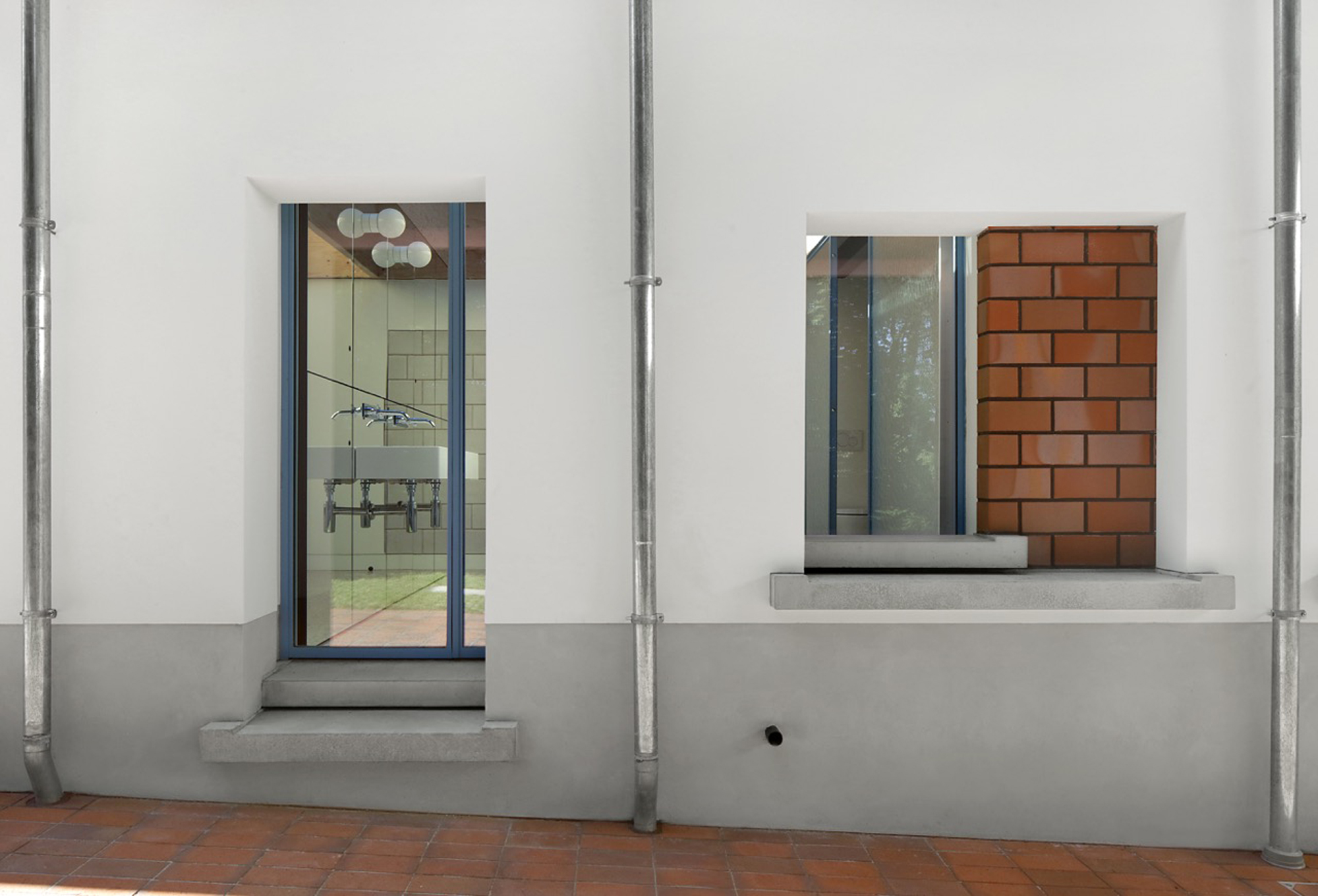 In the midst of green fields, south of Brussels, stood a 1960s modernist-looking villa. White-plastered walls, flat roofs and a garden pavilion. The new owner bought it because of its aesthetic appeal, which should not be lost when renovating it. The starting point of the design was to insulate the house from the inside following a clear logic: while the white outer walls of the original house remained, a new house was built inside with red brick. In addition, white building blocks were used to add a window or door in the old interior walls and re-arrange the spaces. The result is a new plan of nine rooms on the ground floor, joined more or less asenfilade, while a cross-shaped timber structure makes four new rooms on the first floor. The same logic was then continued in the garden pavilion, where a wellness and studio space were added.