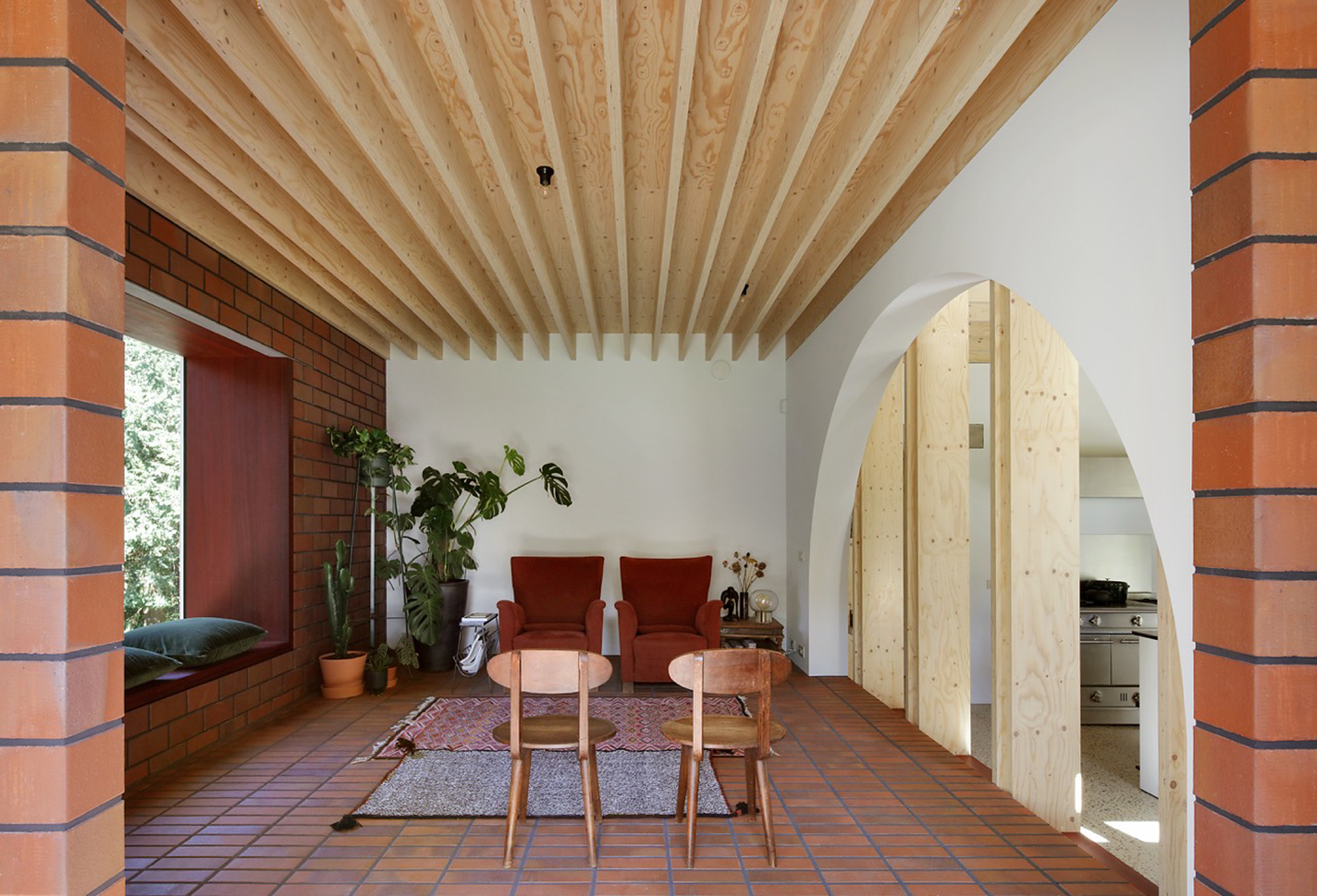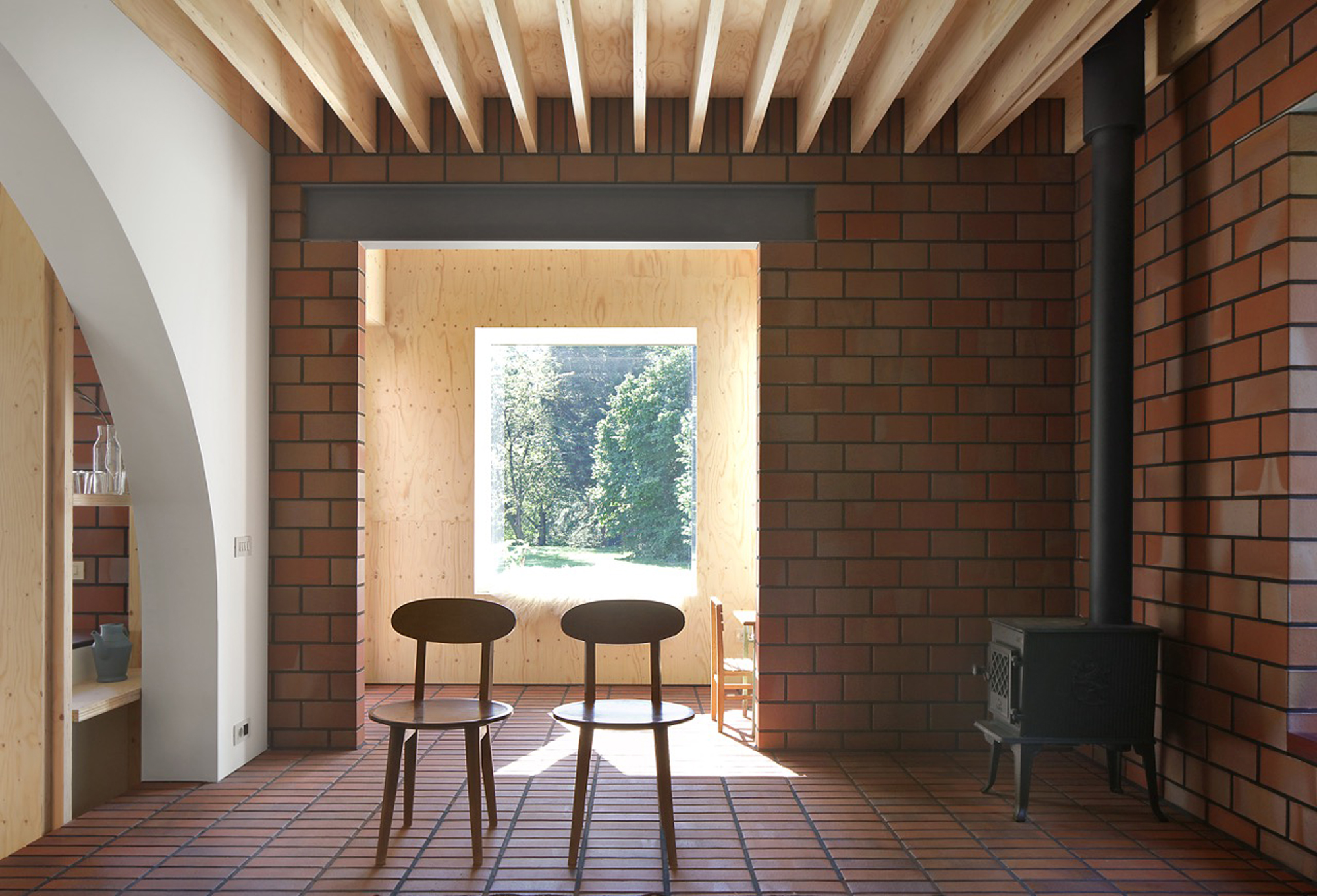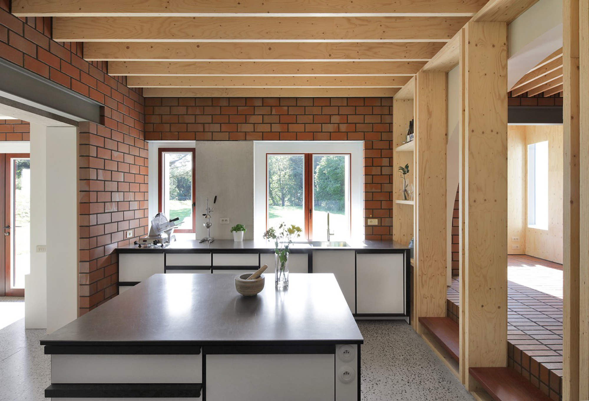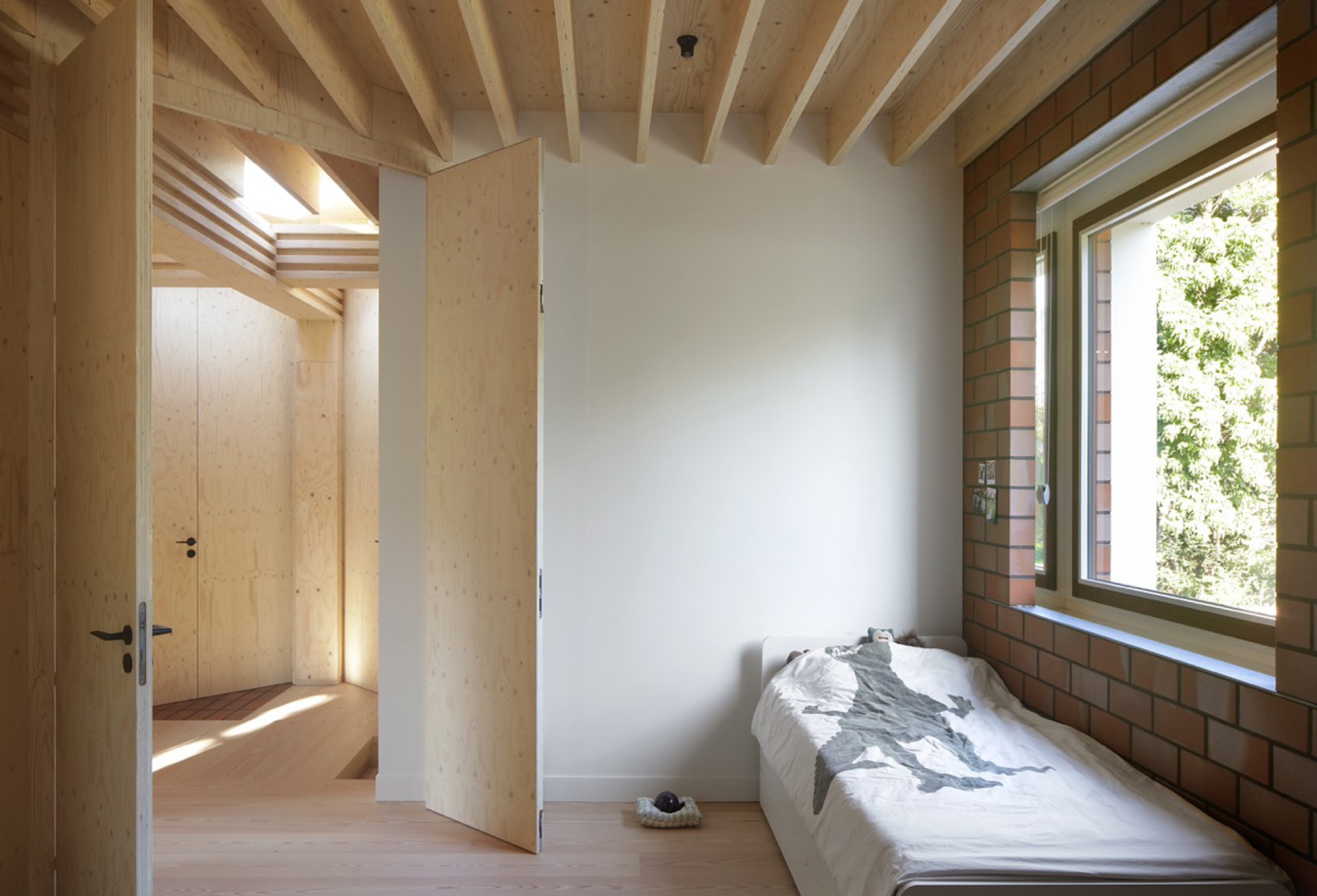 While the construction logic starts from a clear design, it is executed without strict hierarchy, allowing the plaster, red brick and wooden structure to come together in ever new detailing. The window and door openings of the old and new house are additionally used to emphasise the specific atmosphere of each room. For example, an old window opening overlaps with a double glass door, framing part of the old house from the inside, while the cut old sill emphasises the transition between inside and outside. Or an old doorway placed just next to a new window opening, with the red brick only cascading sunlight in without giving a direct view outside.