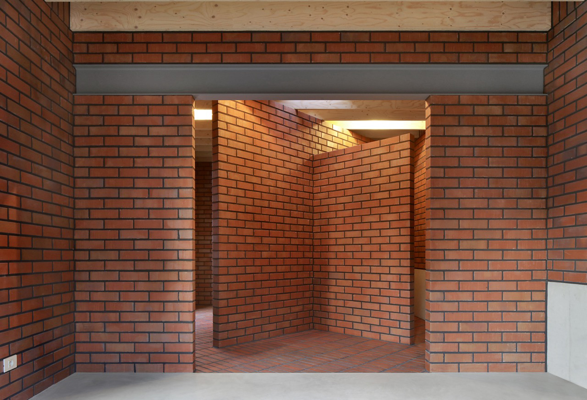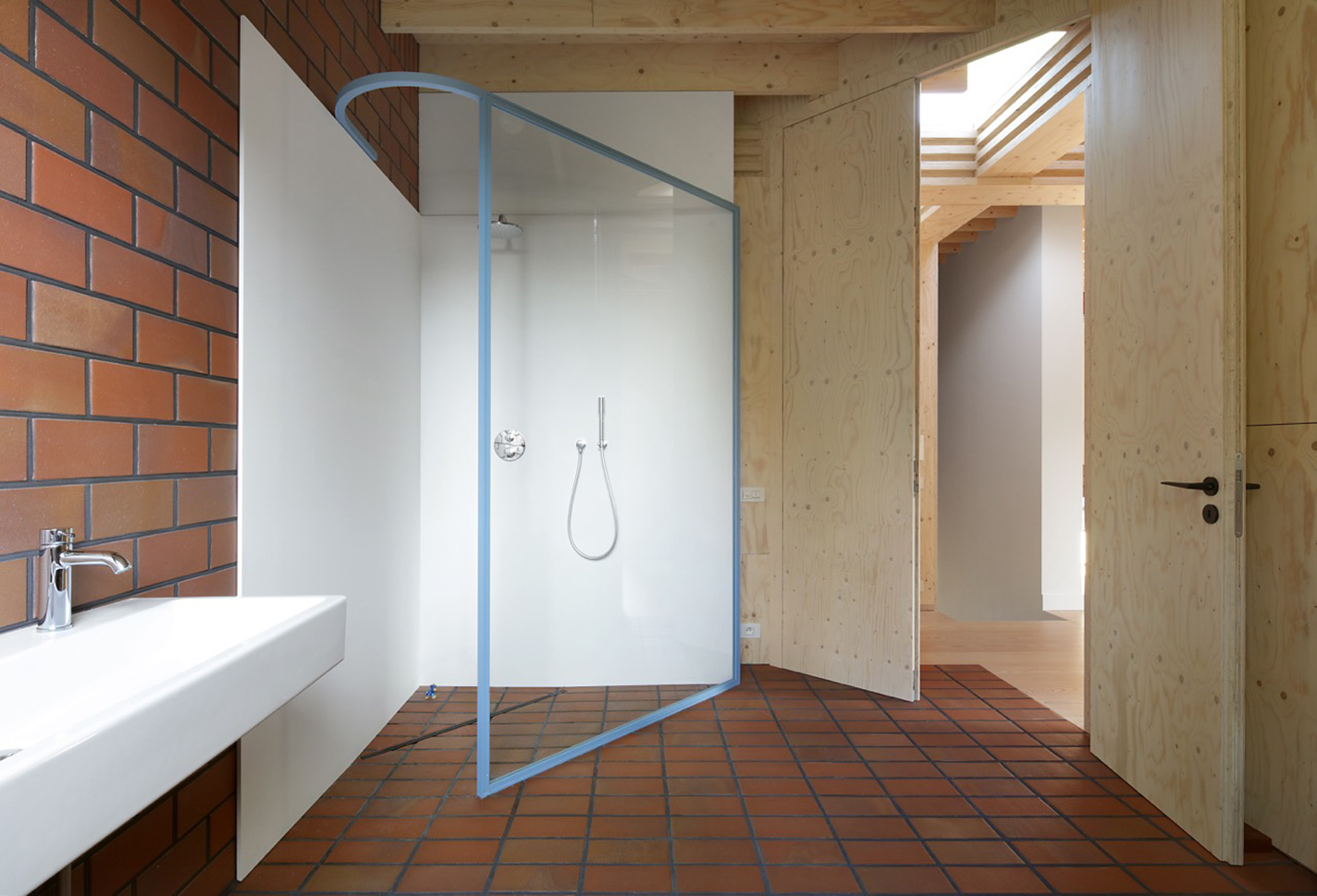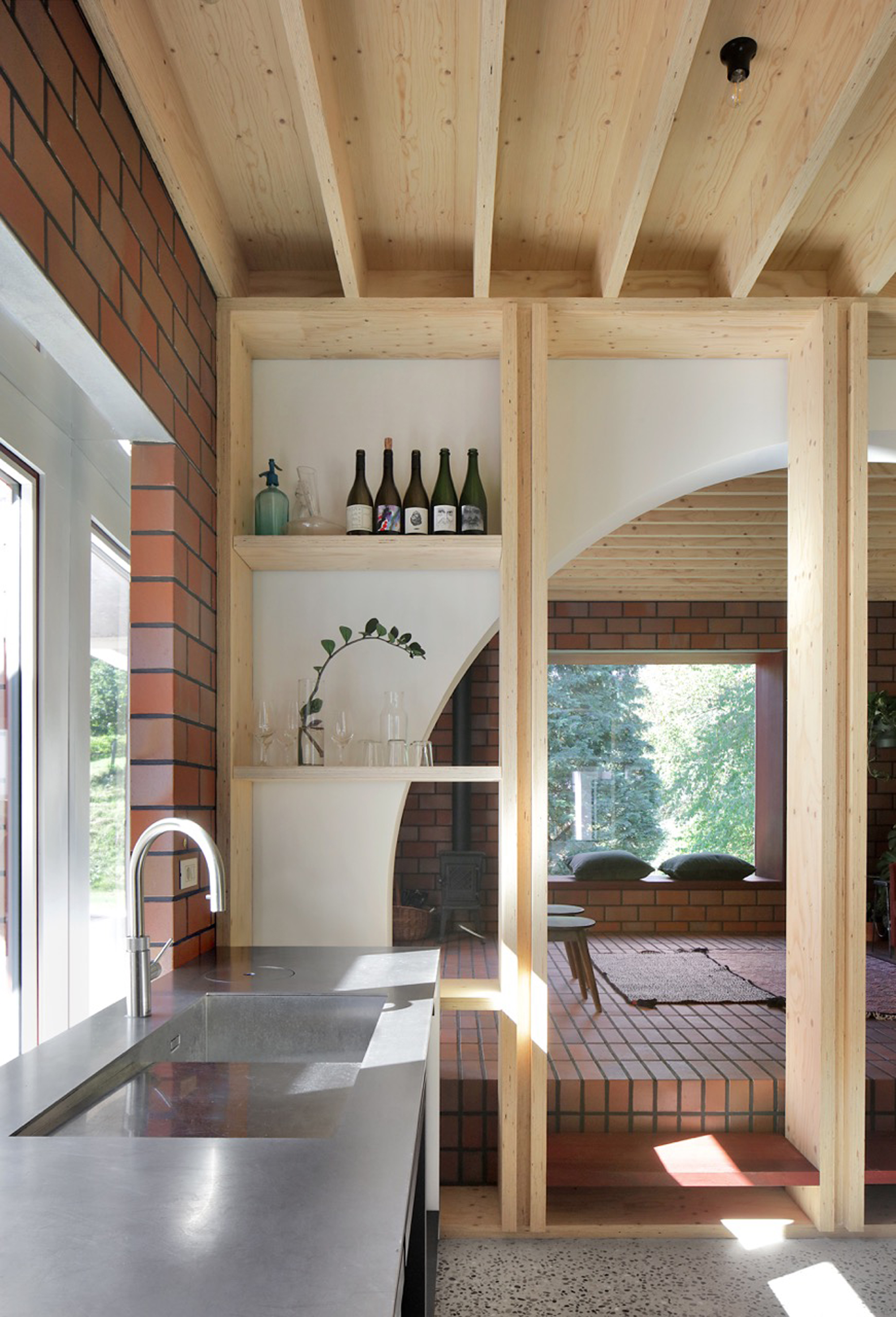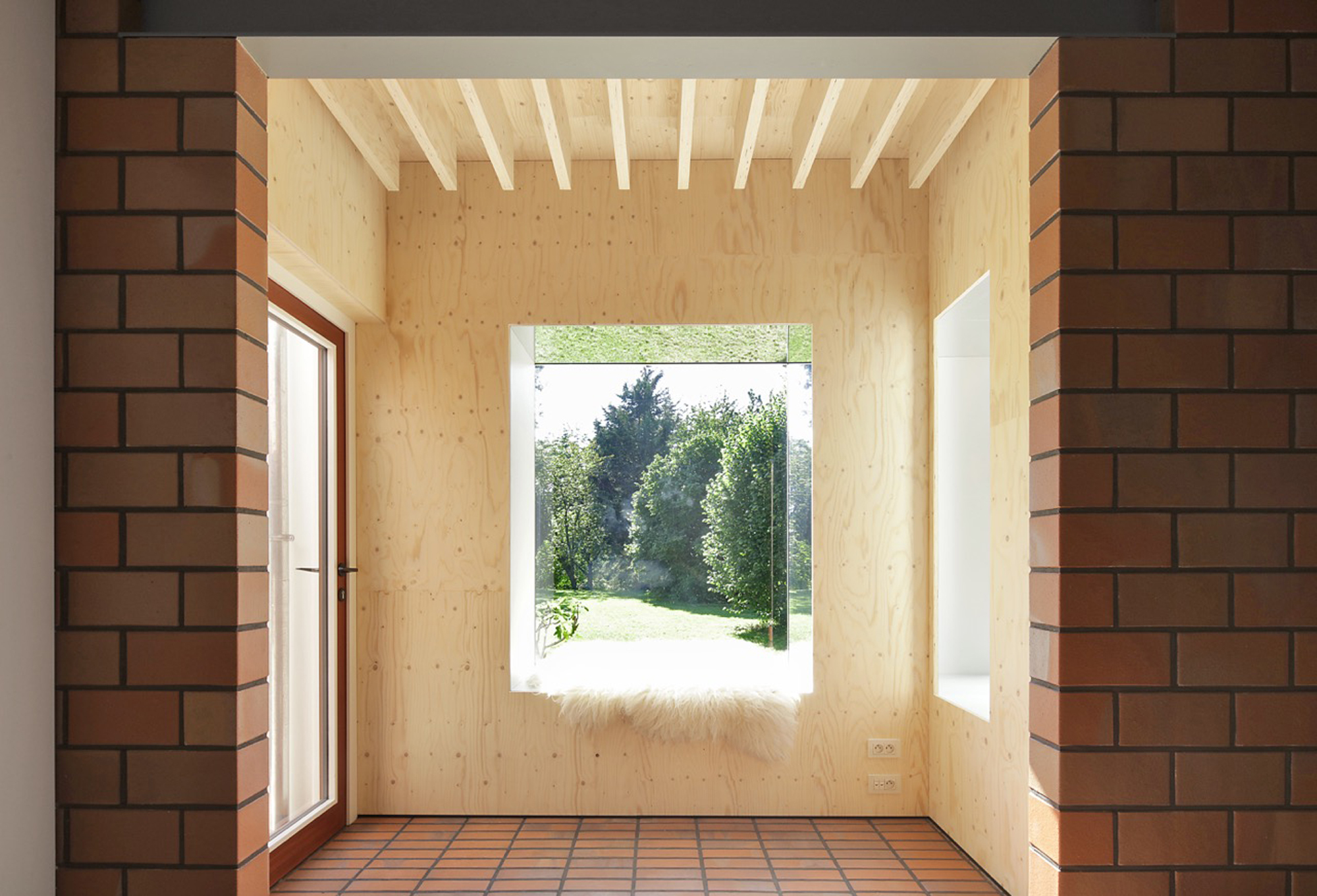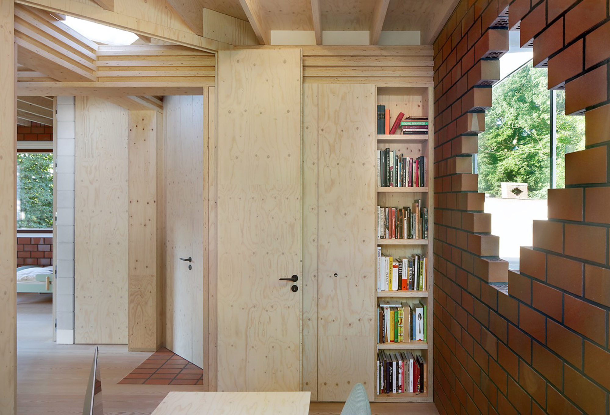 While the construction logic starts from a clear design, it is executed without strict hierarchy, allowing the plaster, red brick and wooden structure to come together in ever new detailing. The window and door openings of the old and new house are additionally used to emphasise the specific atmosphere of each room. For example, an old window opening overlaps with a double glass door, framing part of the old house from the inside, while the cut old sill emphasises the transition between inside and outside. Or an old doorway placed just next to a new window opening, with the red brick only cascading sunlight in without giving a direct view outside.
