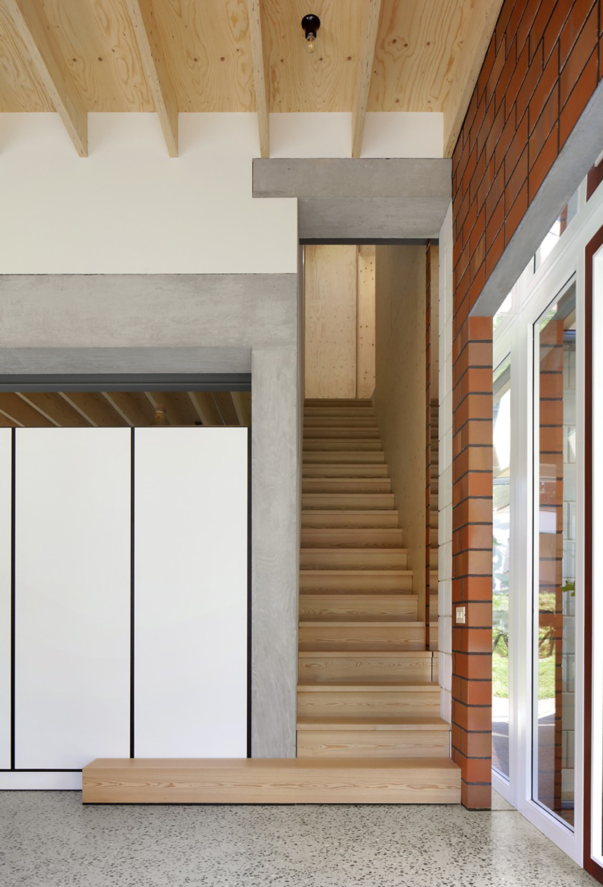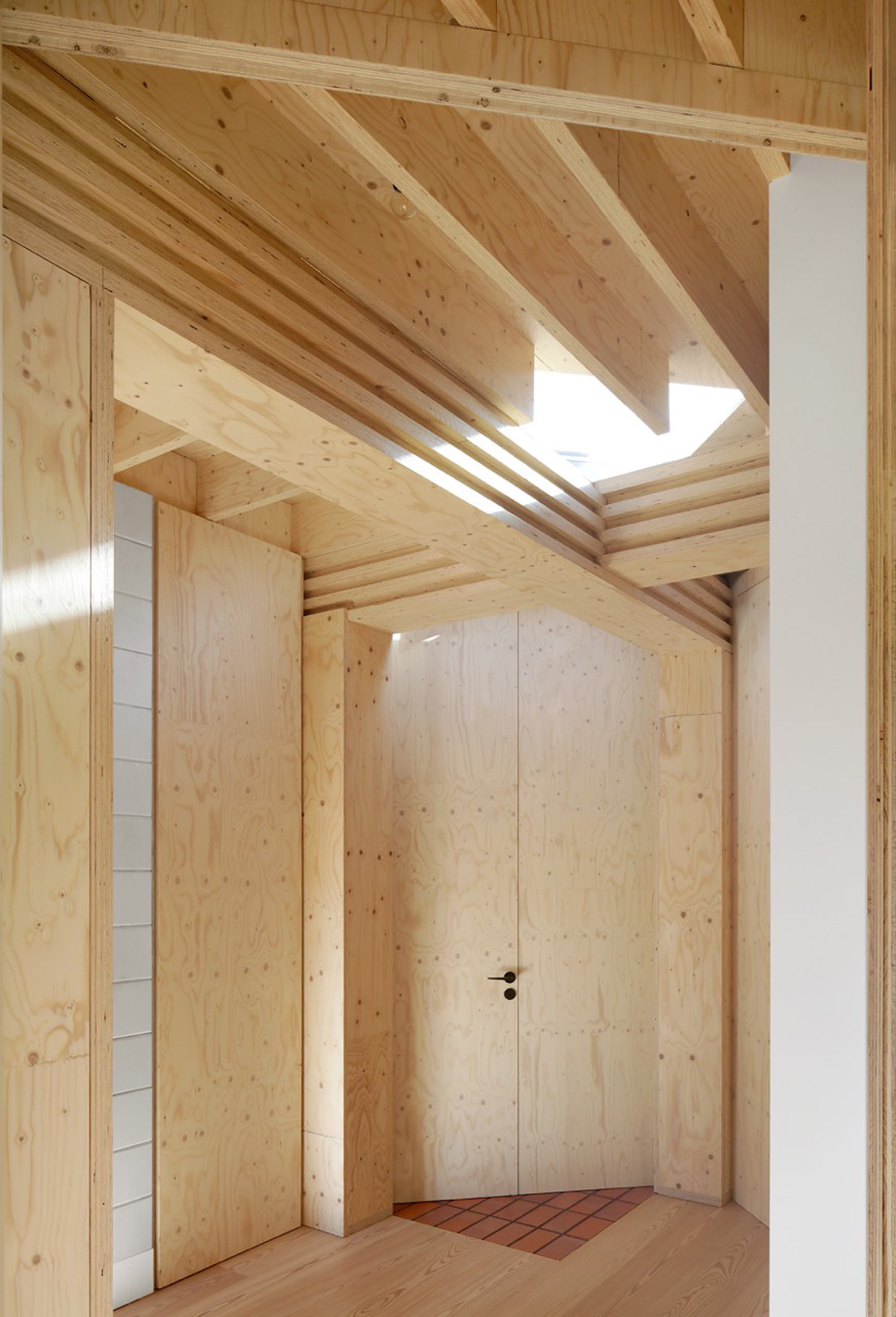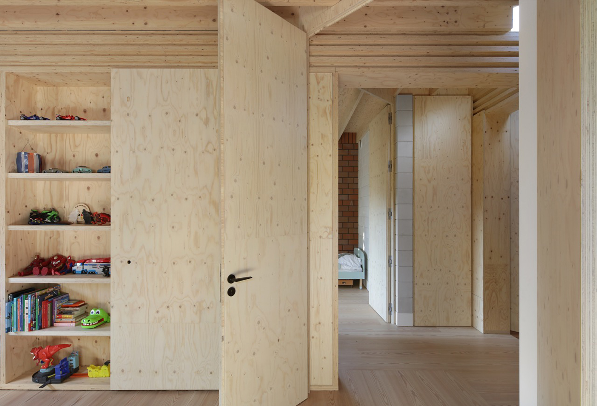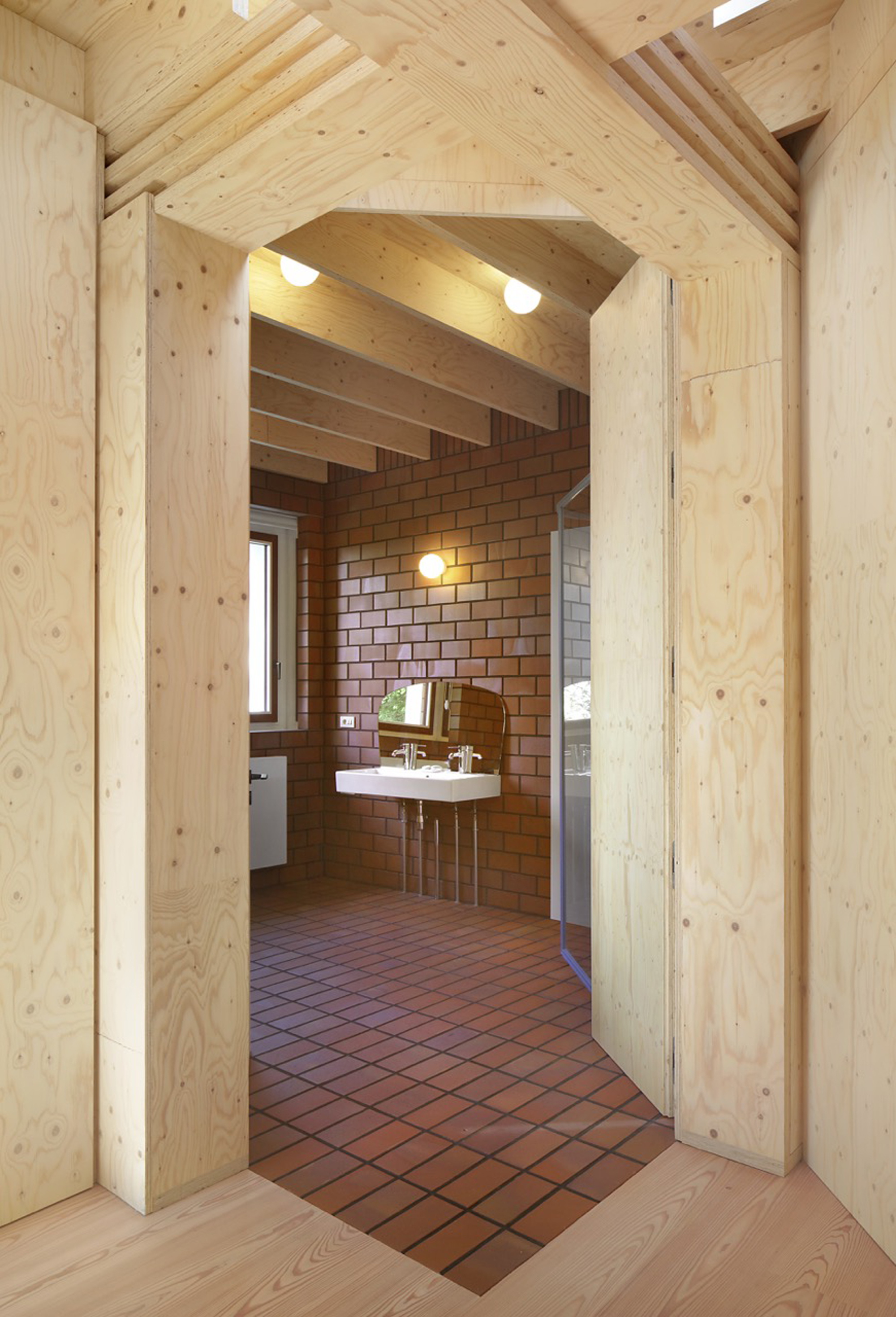 While the construction logic starts from a clear design, it is executed without strict hierarchy, allowing the plaster, red brick and wooden structure to come together in ever new detailing. The window and door openings of the old and new house are additionally used to emphasise the specific atmosphere of each room. For example, an old window opening overlaps with a double glass door, framing part of the old house from the inside, while the cut old sill emphasises the transition between inside and outside. Or an old doorway placed just next to a new window opening, with the red brick only cascading sunlight in without giving a direct view outside.