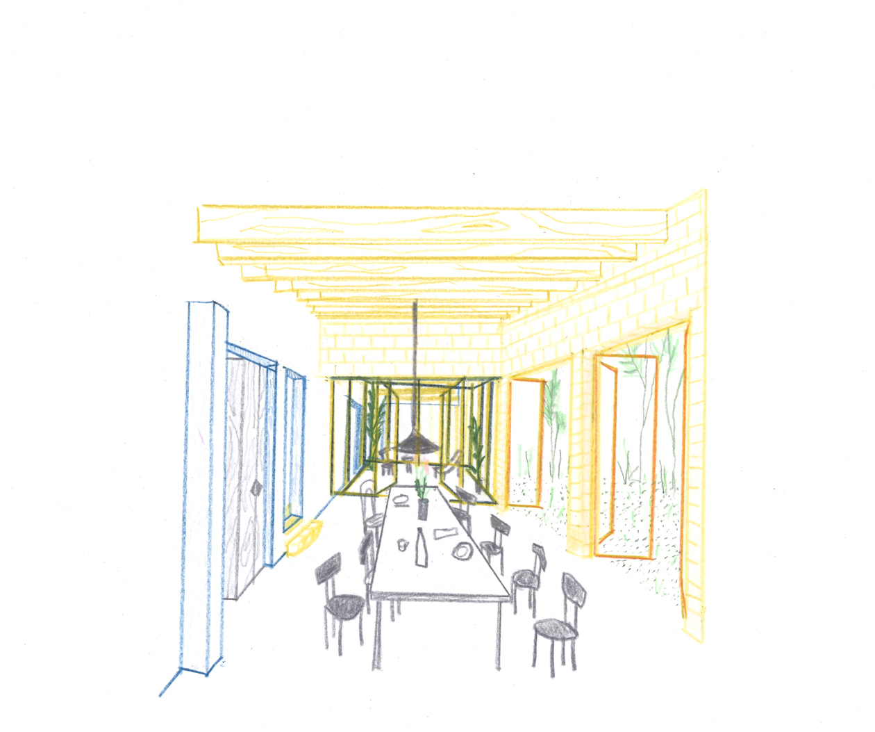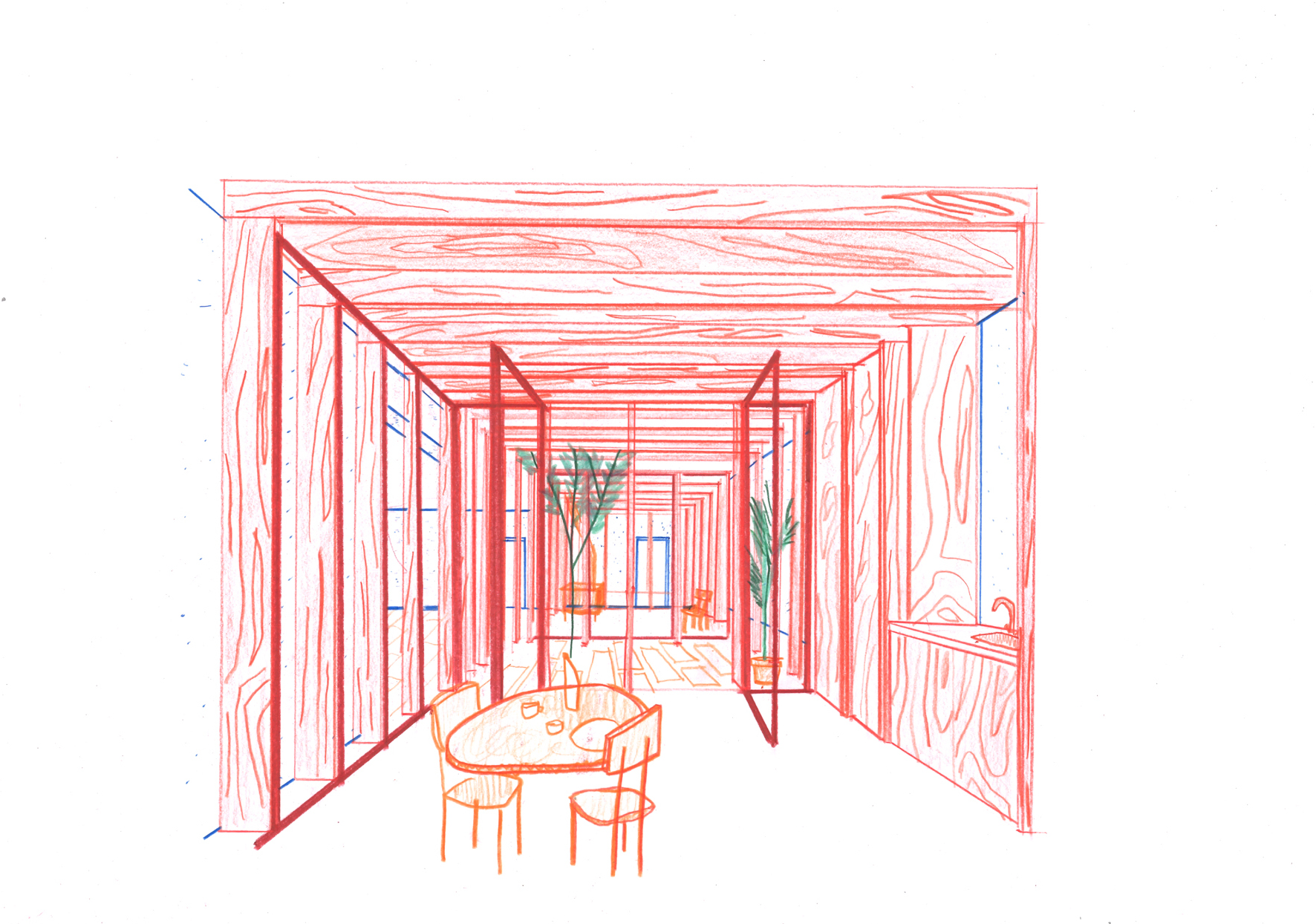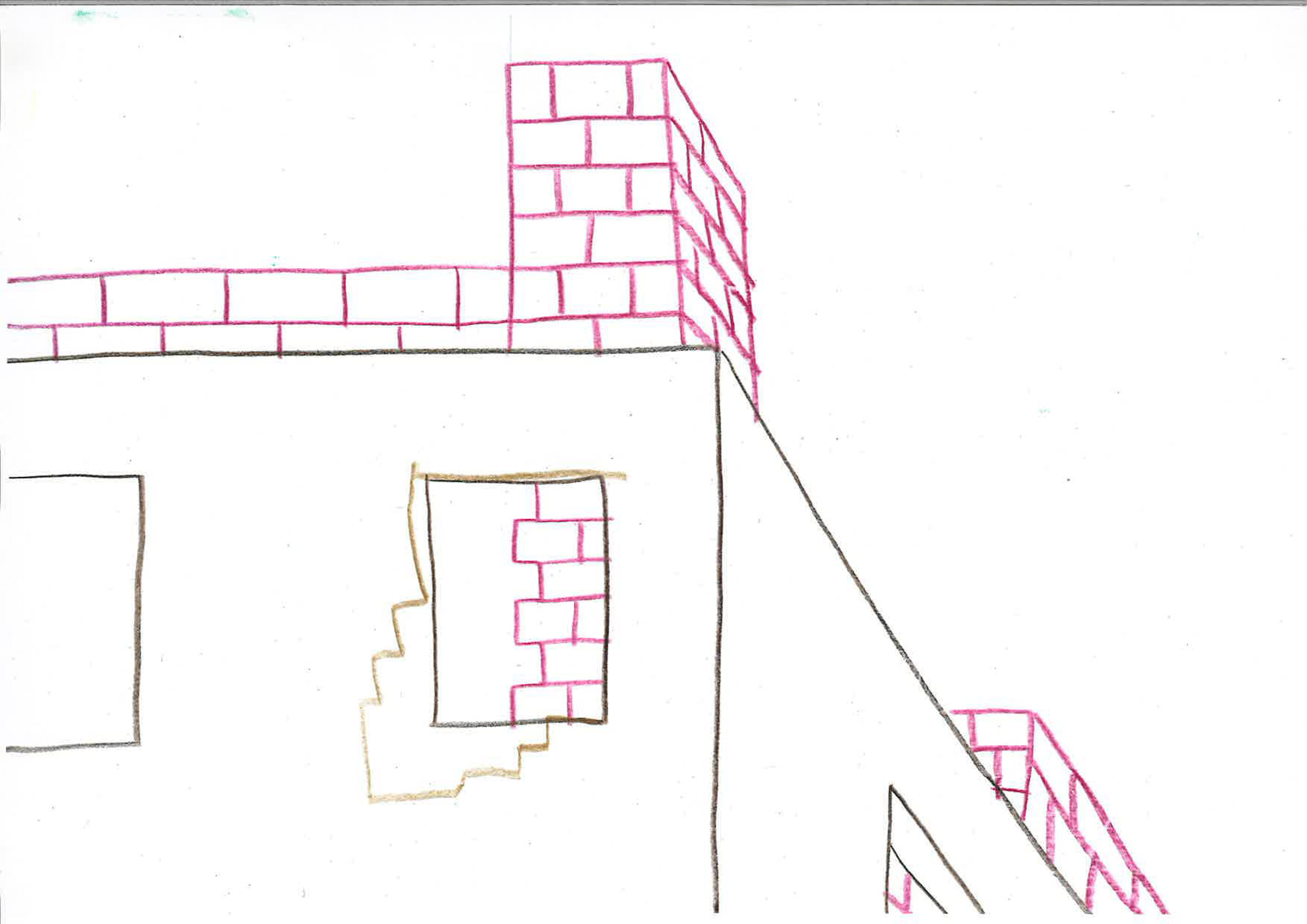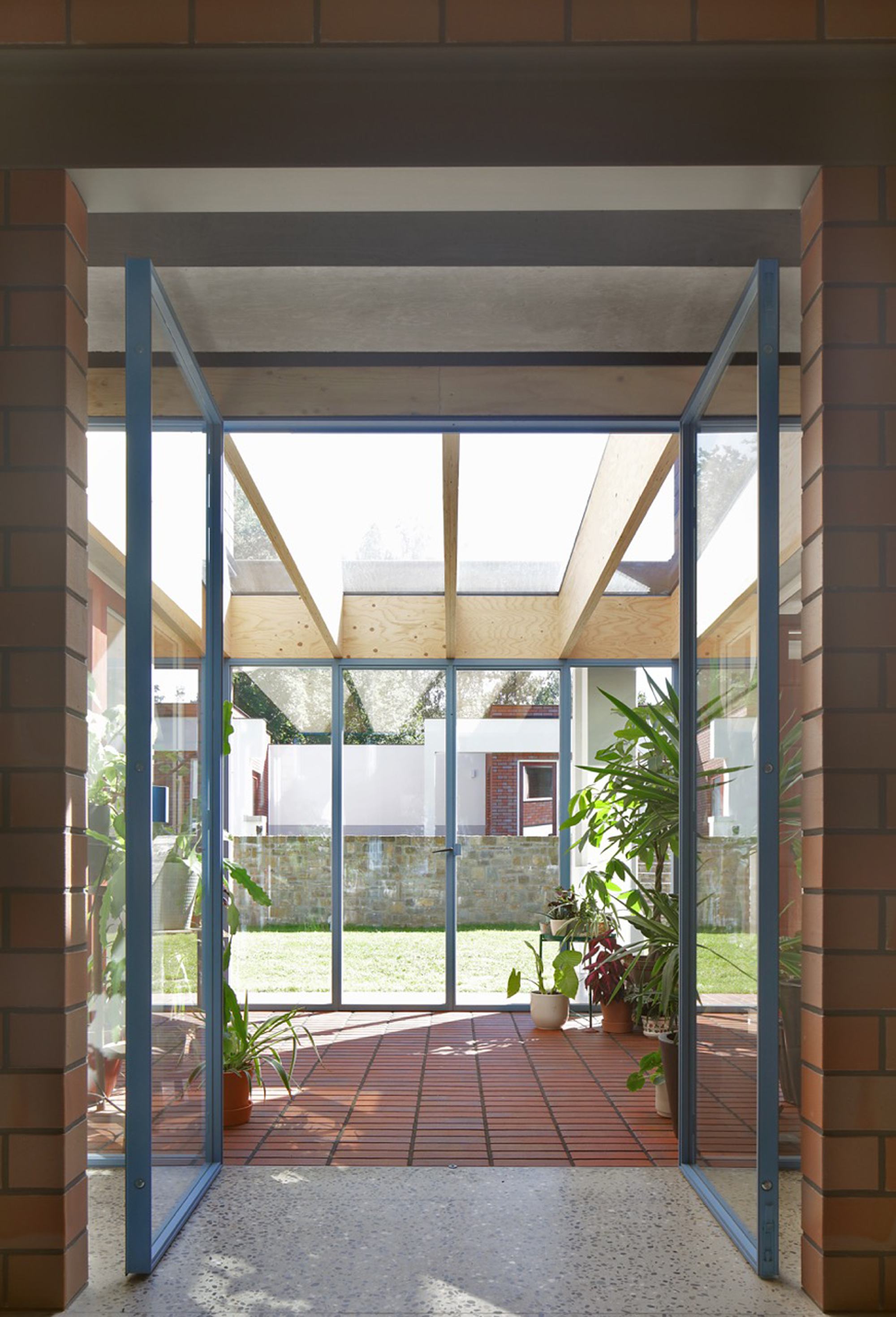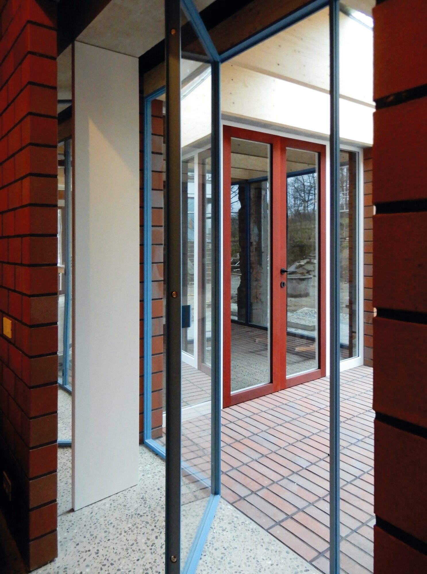 While the construction logic starts from a clear design, it is executed without strict hierarchy, allowing the plaster, red brick and wooden structure to come together in ever new detailing. The window and door openings of the old and new house are additionally used to emphasise the specific atmosphere of each room. For example, an old window opening overlaps with a double glass door, framing part of the old house from the inside, while the cut old sill emphasises the transition between inside and outside. Or an old doorway placed just next to a new window opening, with the red brick only cascading sunlight in without giving a direct view outside.