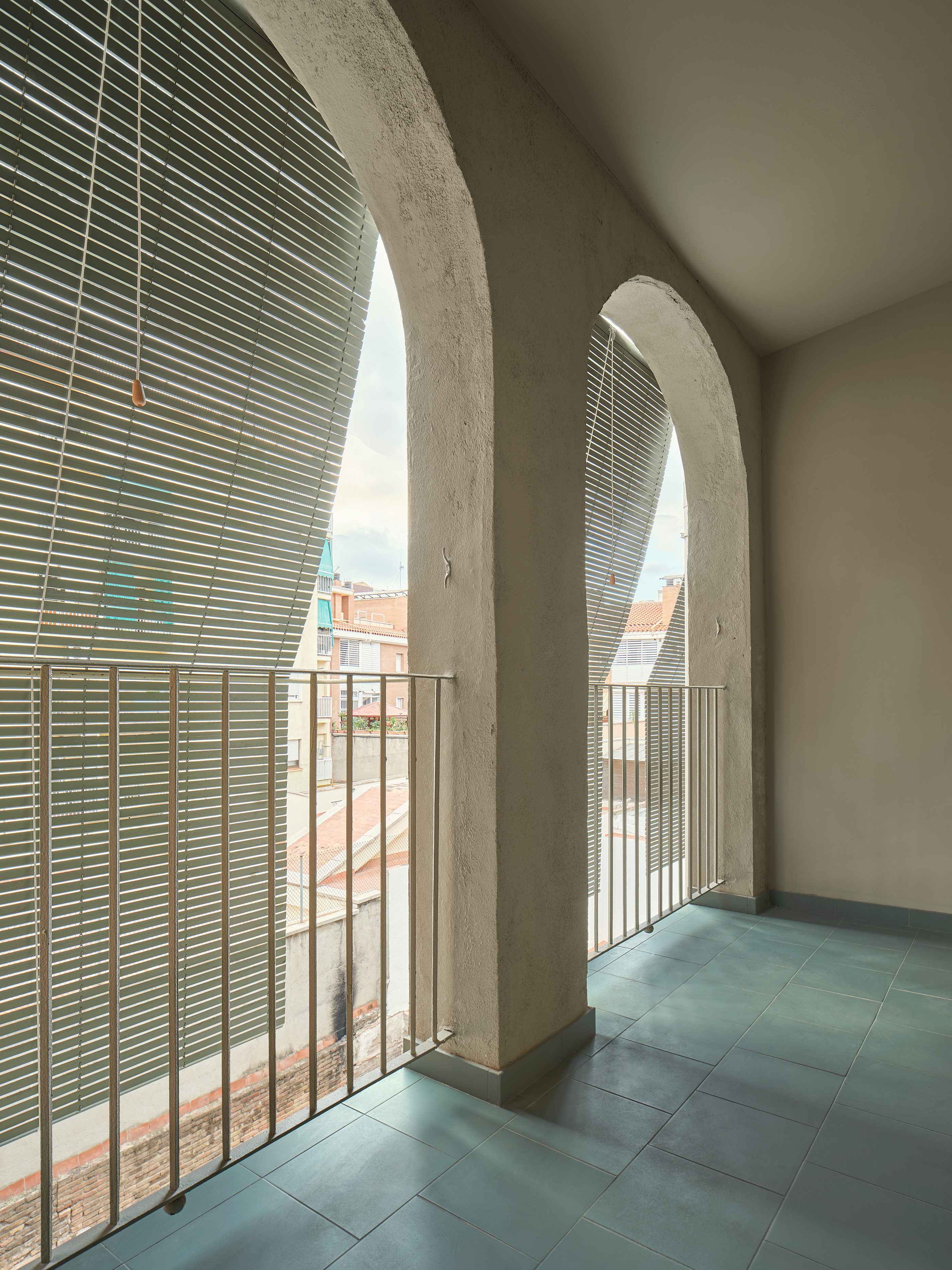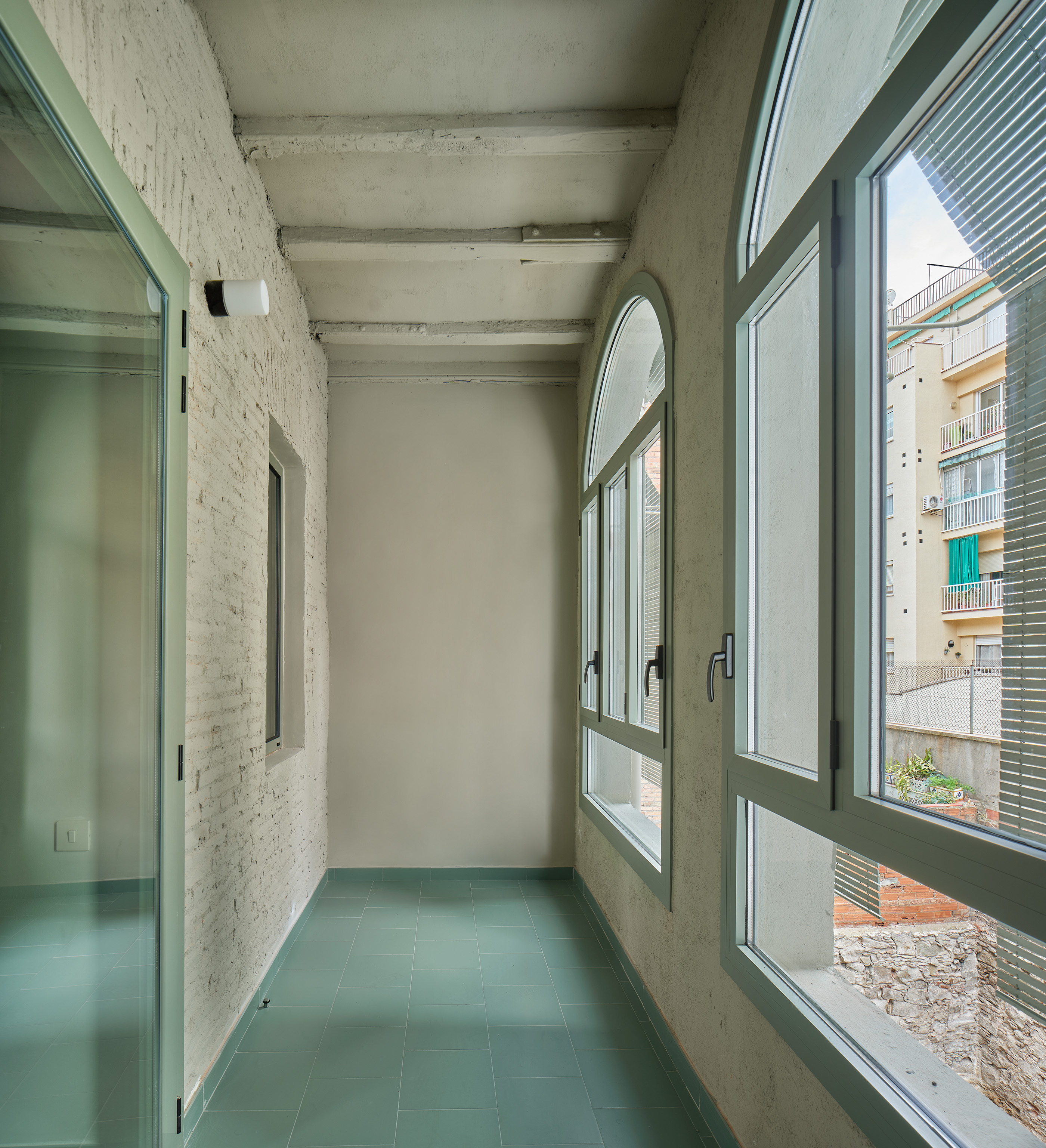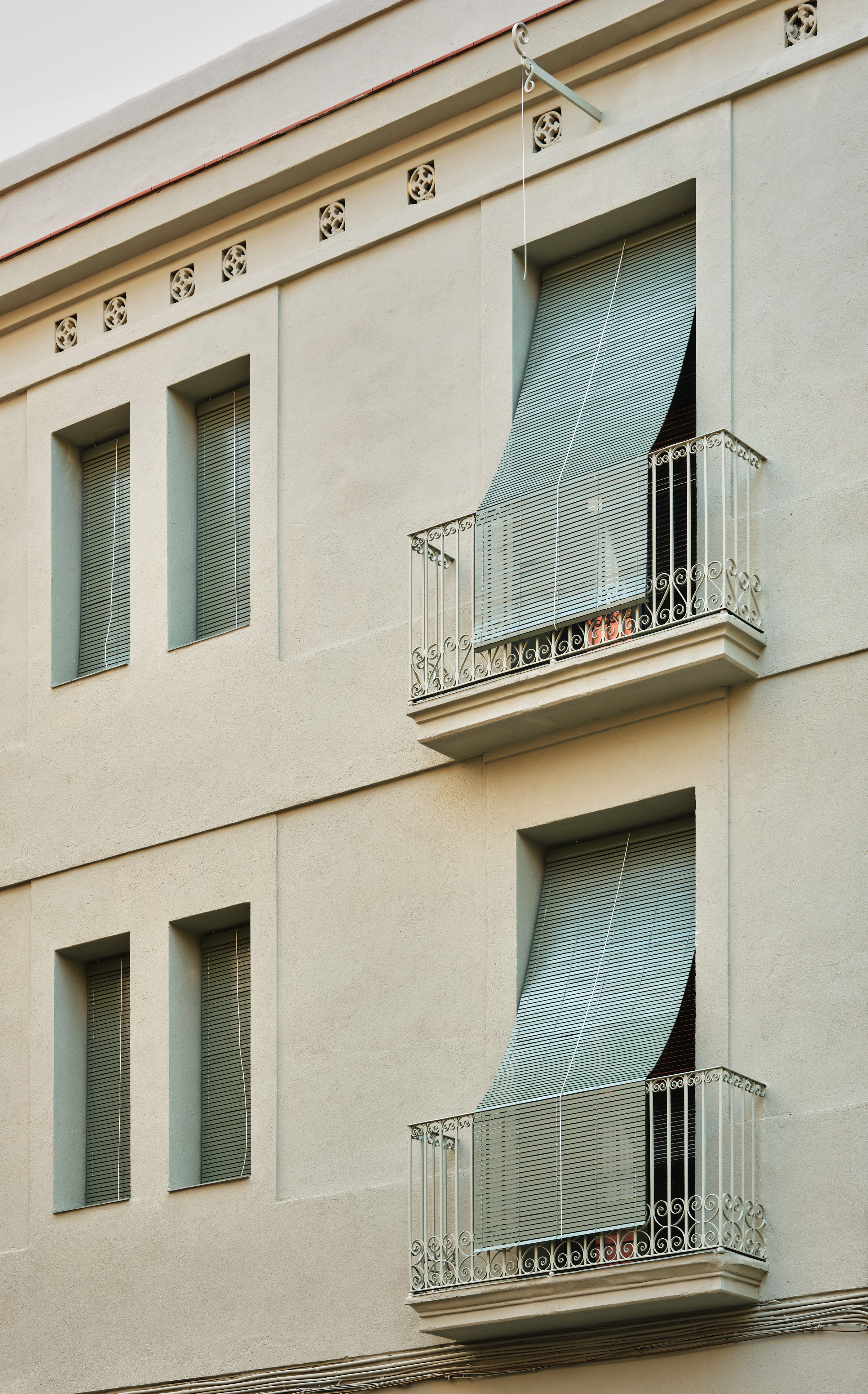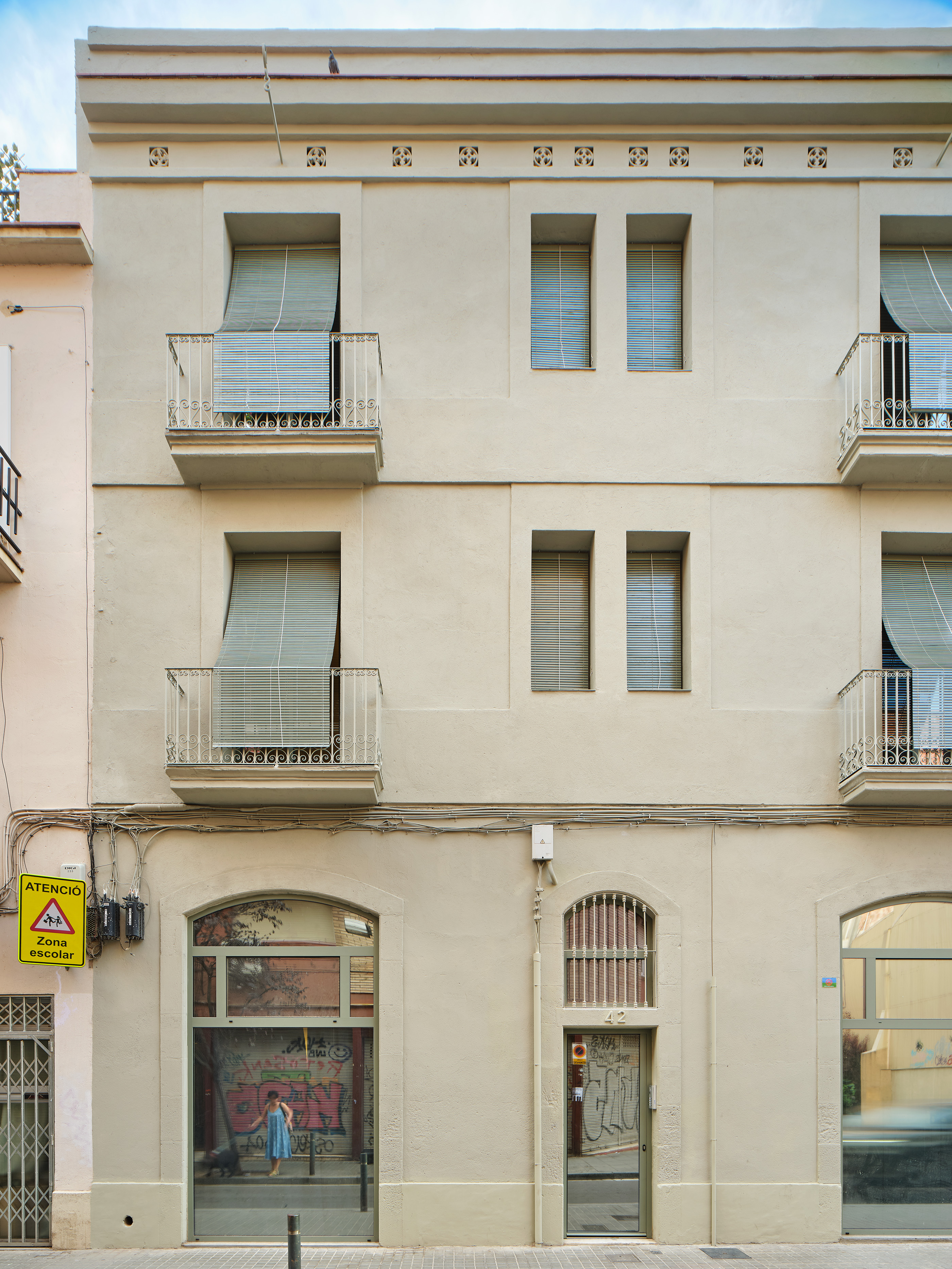 El patio posterior se ha vaciado por completo y se han recuperado los espacios intermedios traseros de las viviendas como galerías. Se ha homogeneizado el tratamiento de los cerramientos y protecciones solares para dar unidad al conjunto. Manteniendo la escalera original de vuelta catalana central, se ha incorporado un elevador y se ha dotado a todas las viviendas de climatización mediante aerotermia. El edificio se pinta en su integridad de color RAL 7032 con las carpinterías y persianas en RAL 7033.