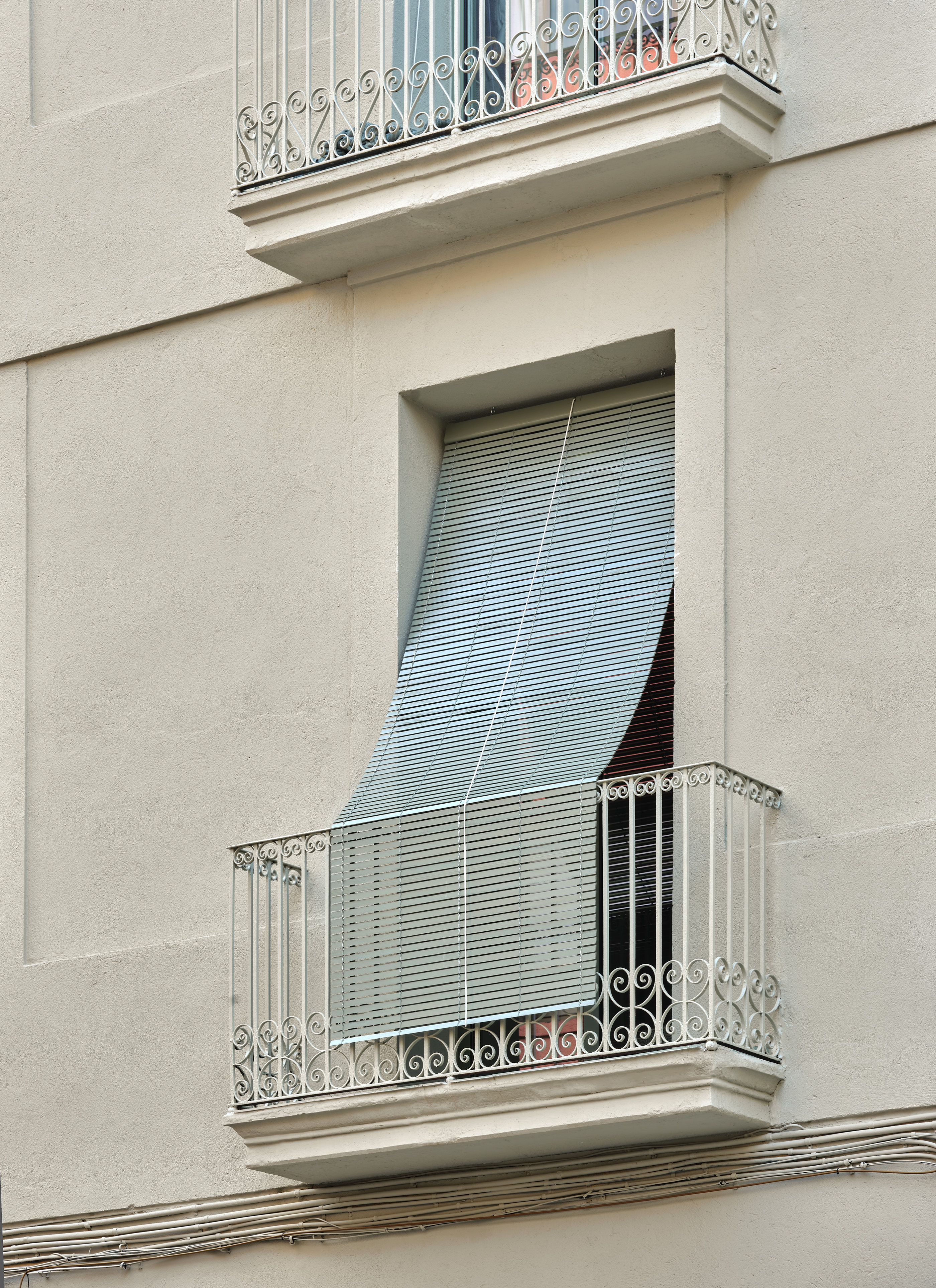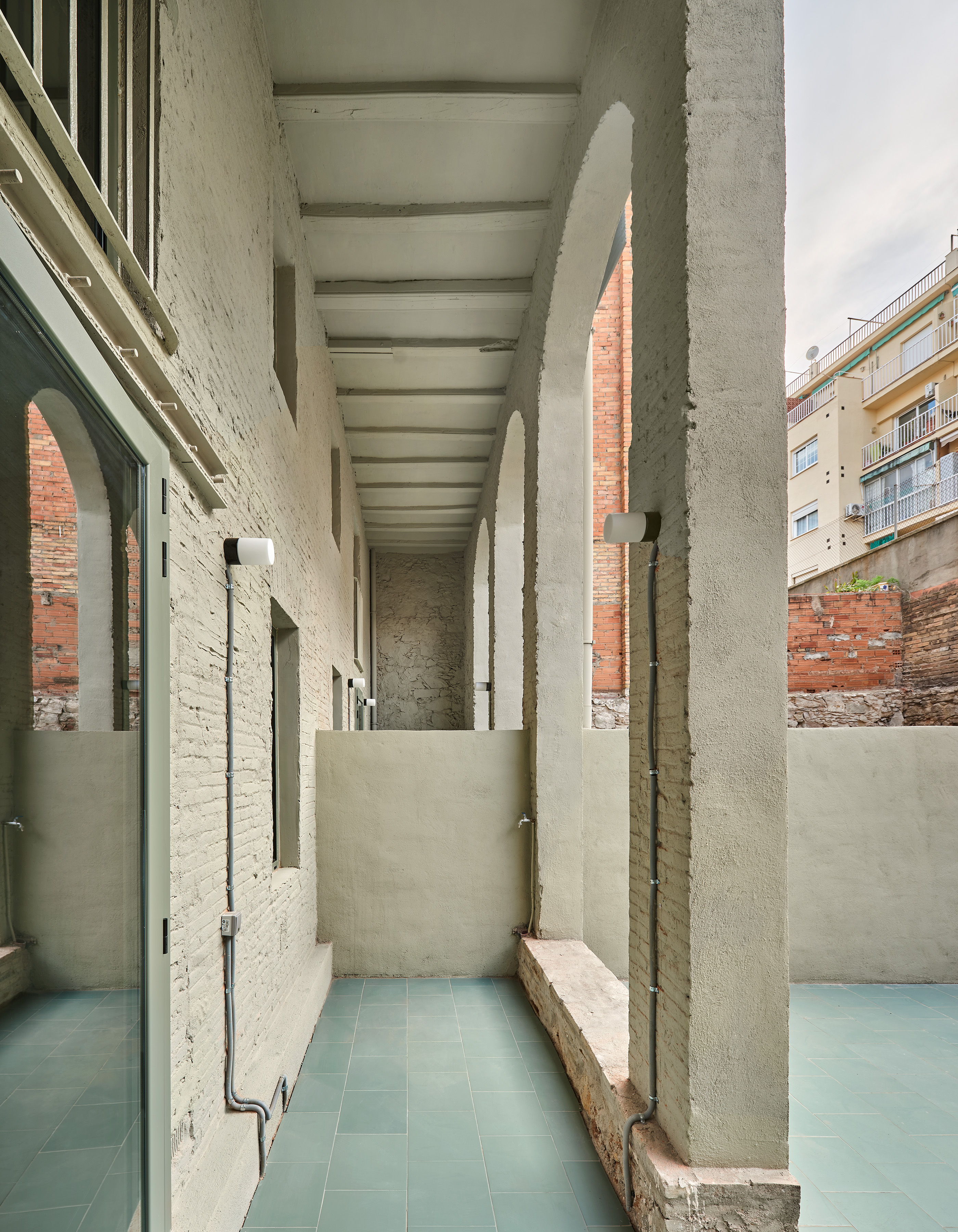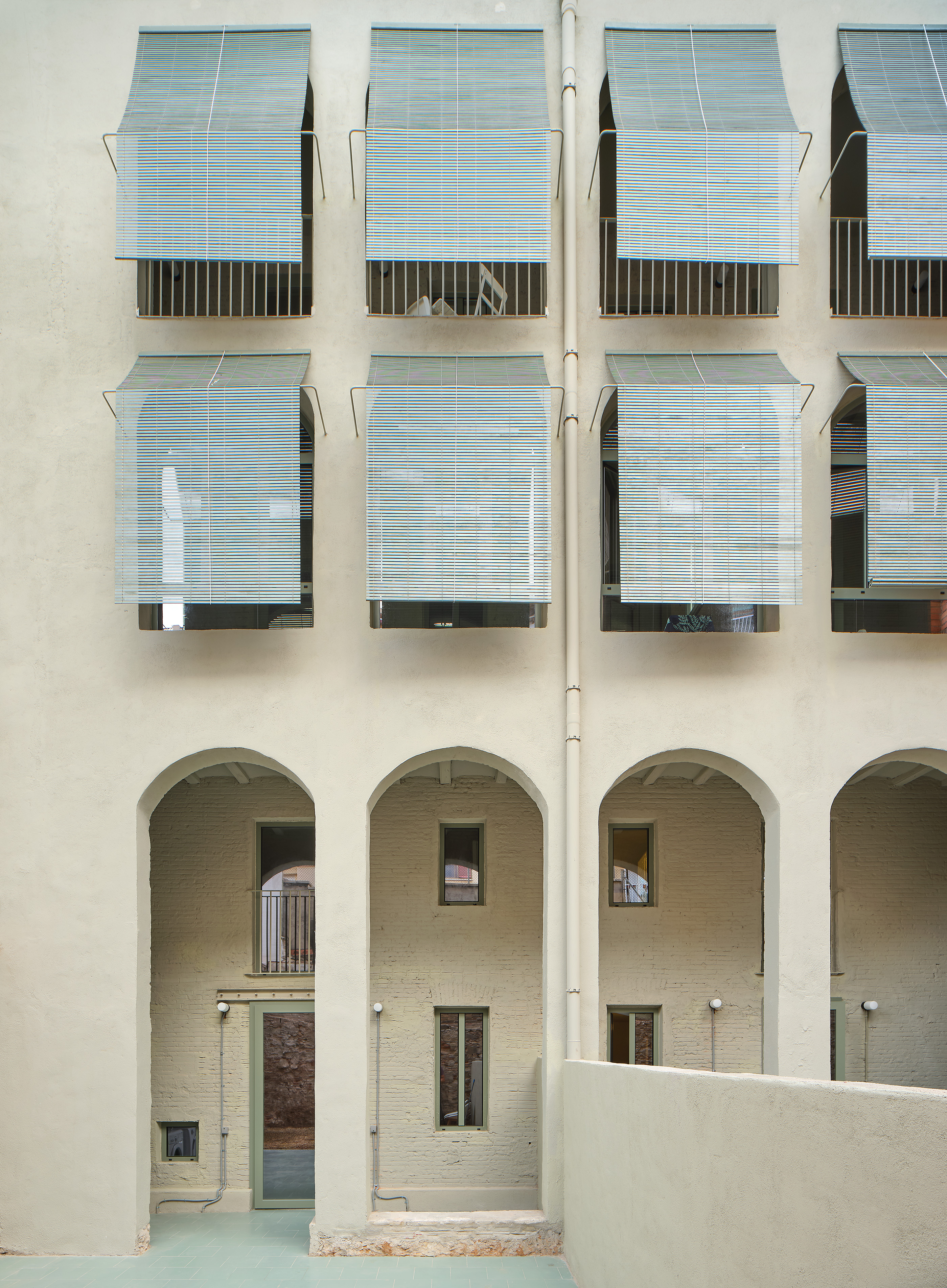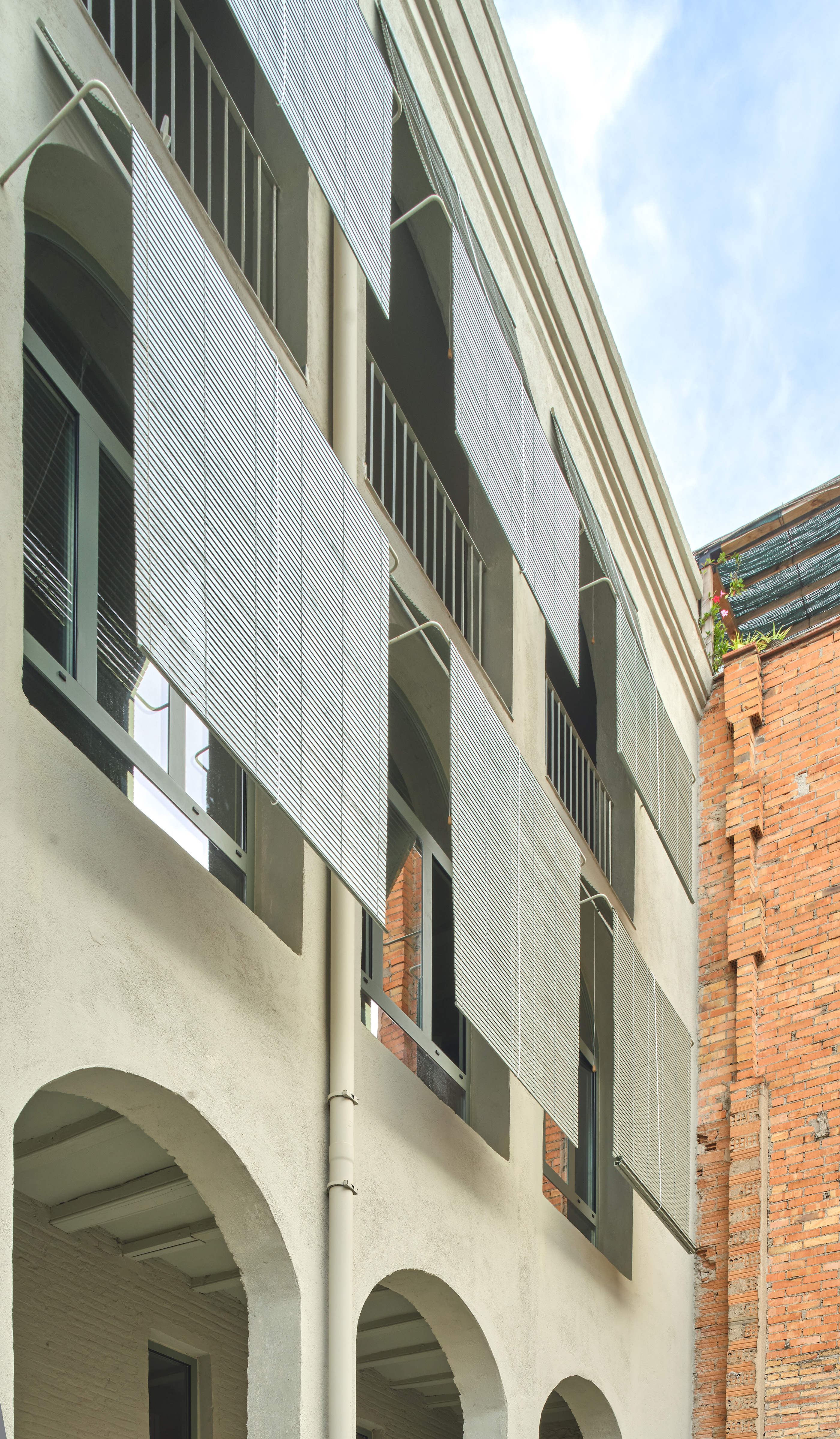 El patio posterior se ha vaciado por completo y se han recuperado los espacios intermedios traseros de las viviendas como galerías. Se ha homogeneizado el tratamiento de los cerramientos y protecciones solares para dar unidad al conjunto. Manteniendo la escalera original de vuelta catalana central, se ha incorporado un elevador y se ha dotado a todas las viviendas de climatización mediante aerotermia. El edificio se pinta en su integridad de color RAL 7032 con las carpinterías y persianas en RAL 7033.