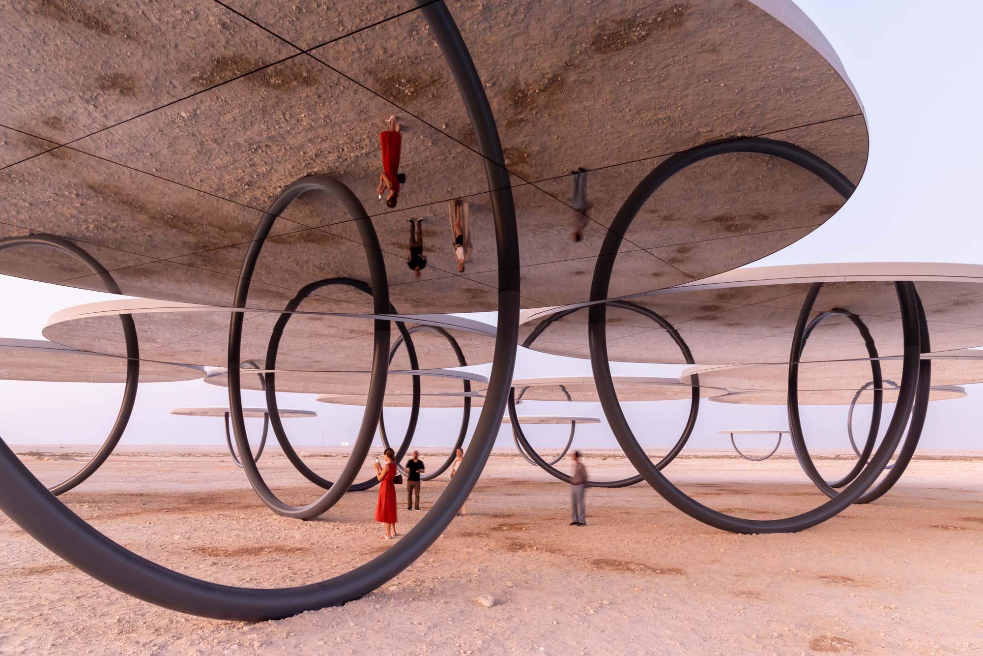 From a distance, the mirrored undersides of this cluster of circular shelters and free-standing rings can be seen shimmering on the horizon. Ten of the shelters, arranged close together in a five-pointed-star formation, define the centre of the artwork. The other shelters appear to be distributed at random but are in fact positioned according to implicit axes defined by fivefold symmetry. The principles behind such patterns are evident in quasicrystals and, although only recently discovered in the West, may have informed some of the geometrically sophisticated designs found in Islamic cultures since medieval times.