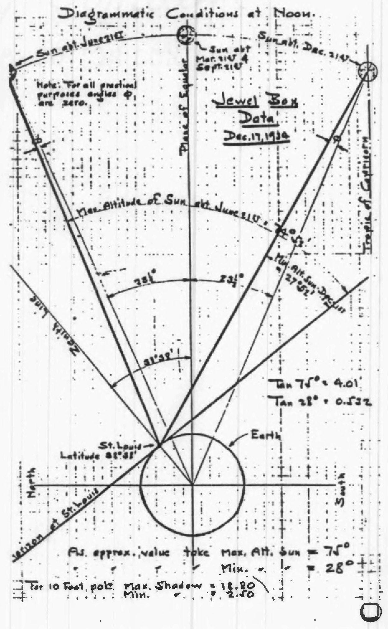 Becker determined that his design would in fact provide more than sufficient light despite its non-glass roof. The new building was to be built with its longitudinal axis on a true north-south line to assure uniform distribution of sunlight to plants. In implementing his concept of an essentially hailproof greenhouse, Becker employed extremely tall, vertical glass walls. Because the sun is at a relatively low angle during much of the year in St. Louis, sufficient light could come through the high walls of the new design rather than through a traditional glass roof. The sun is only directly overhead during the height of summer, when its heat and intensity are so strong that conventional glass greenhouse roofs must be whitewashed to reflect most of the sun’s rays.