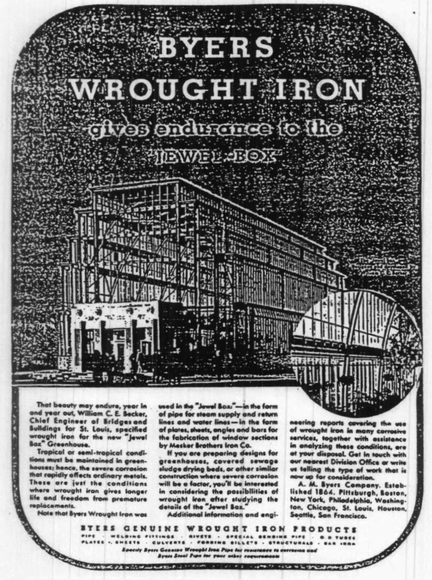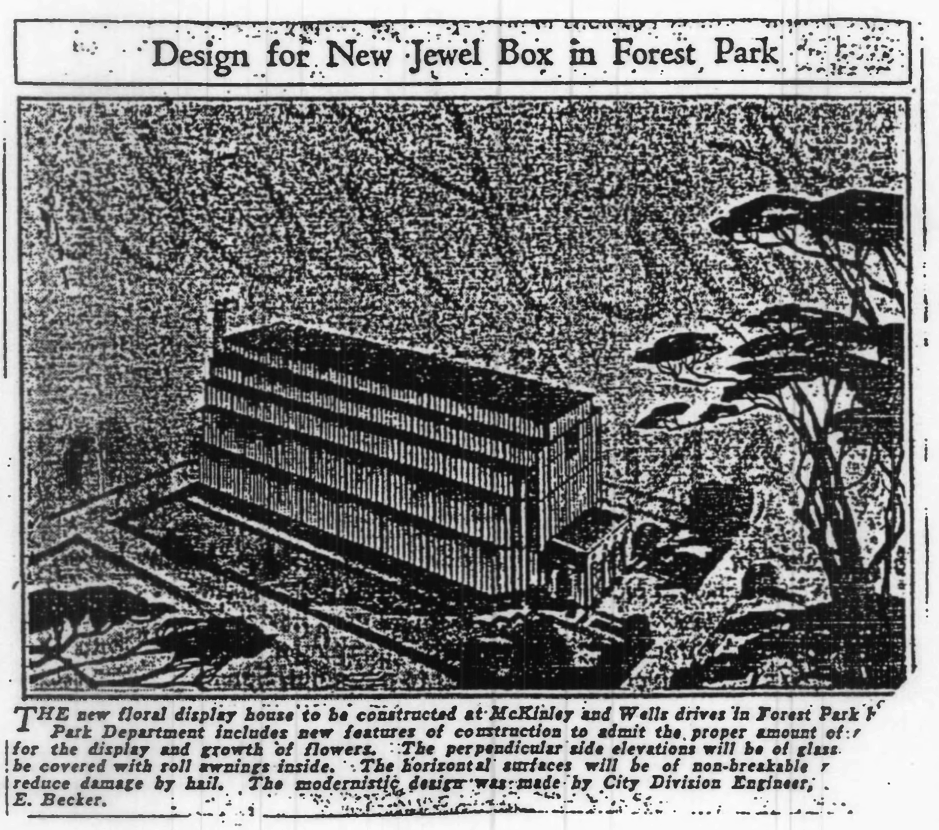 The Jewel Box is a display greenhouse located at the intersection of Wells Drive and McKinley Drive in Forest Park, St. Louis. The Jewel Box itself rests on a rock-faced ashlar foundation laid with dark mortar above, vertical glass walls rise to five stepped, flat-roofed levels. 16,664 square feet of double-strength Libbey-Owens-Ford plate glass in some panes were set into a system of wood and wrought iron supports.