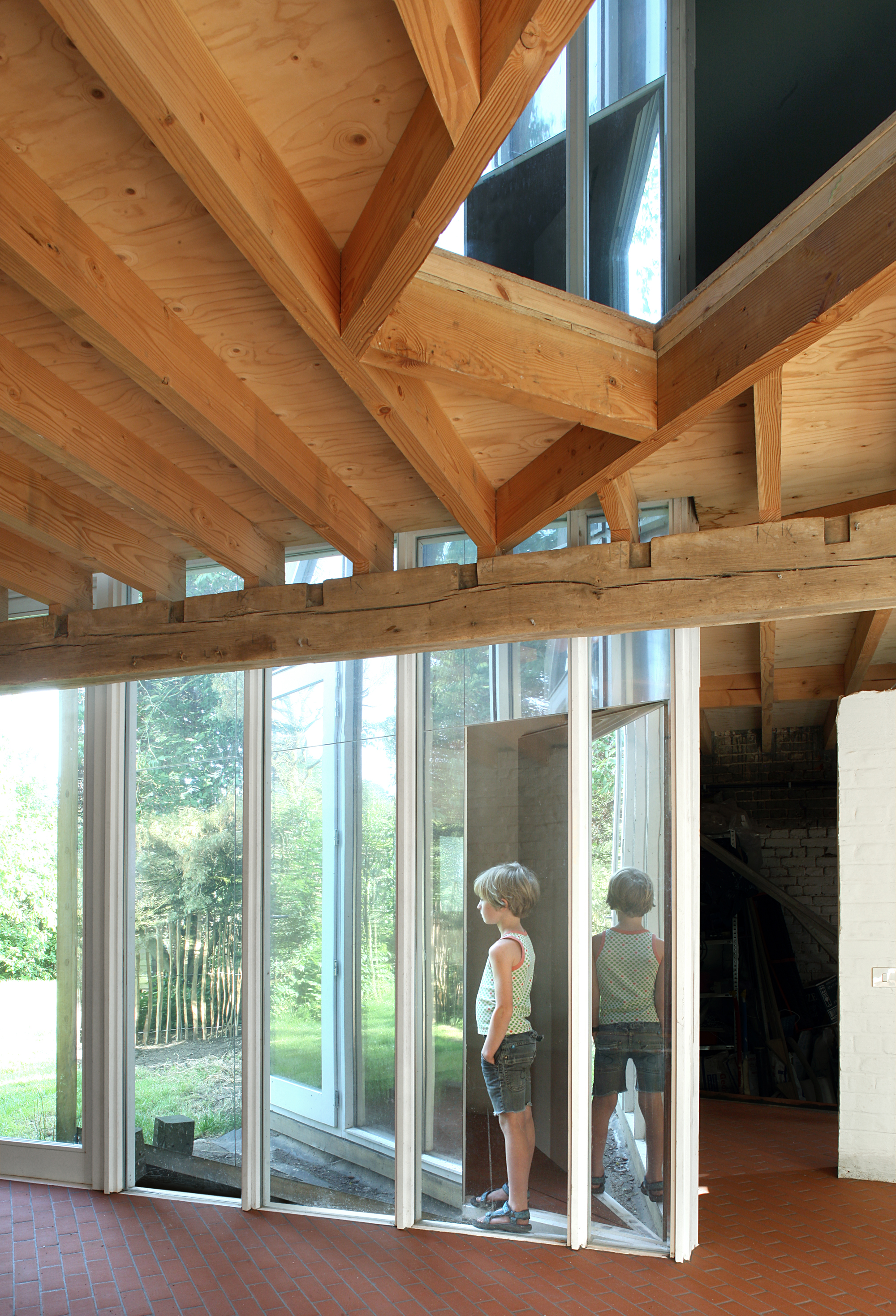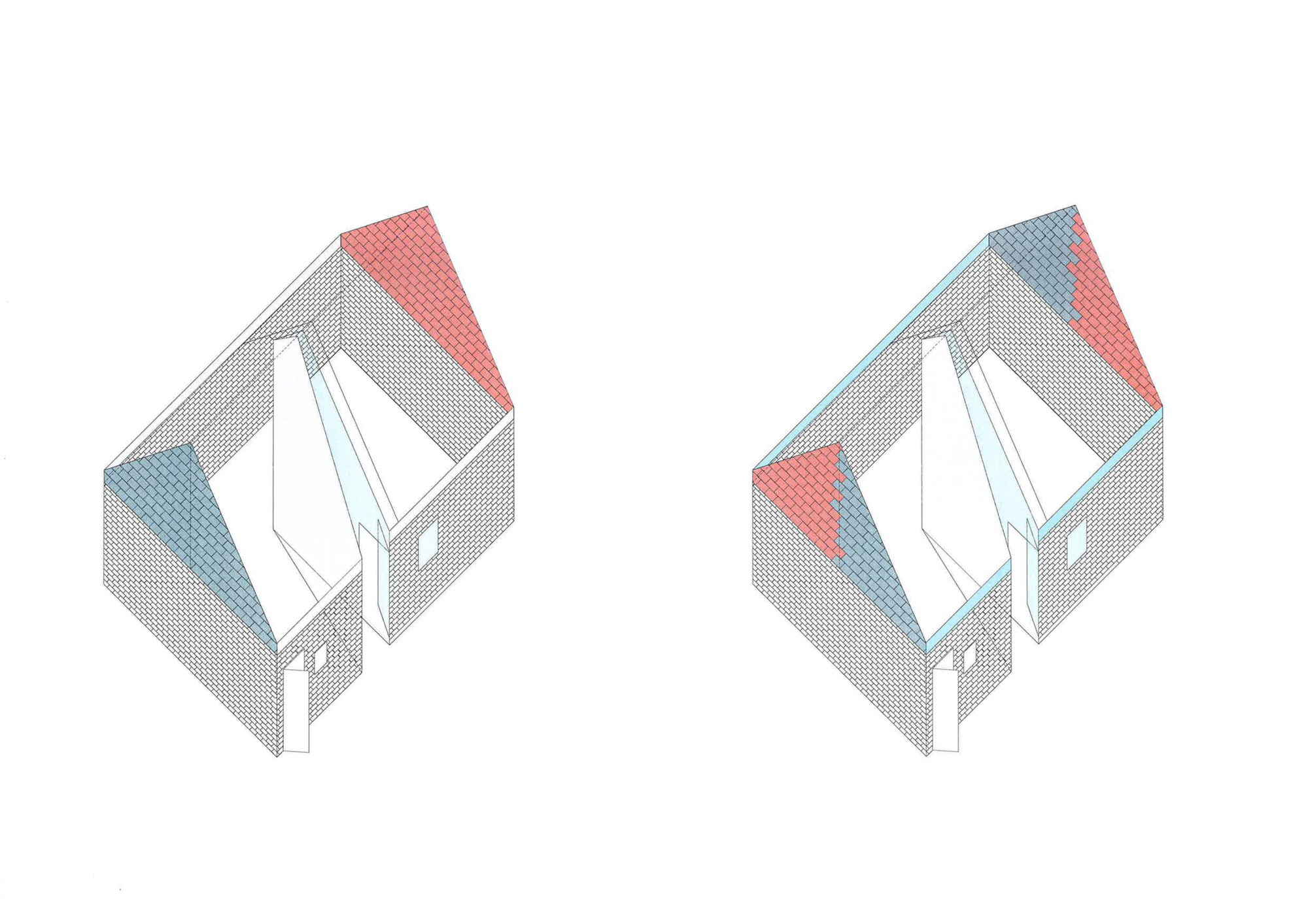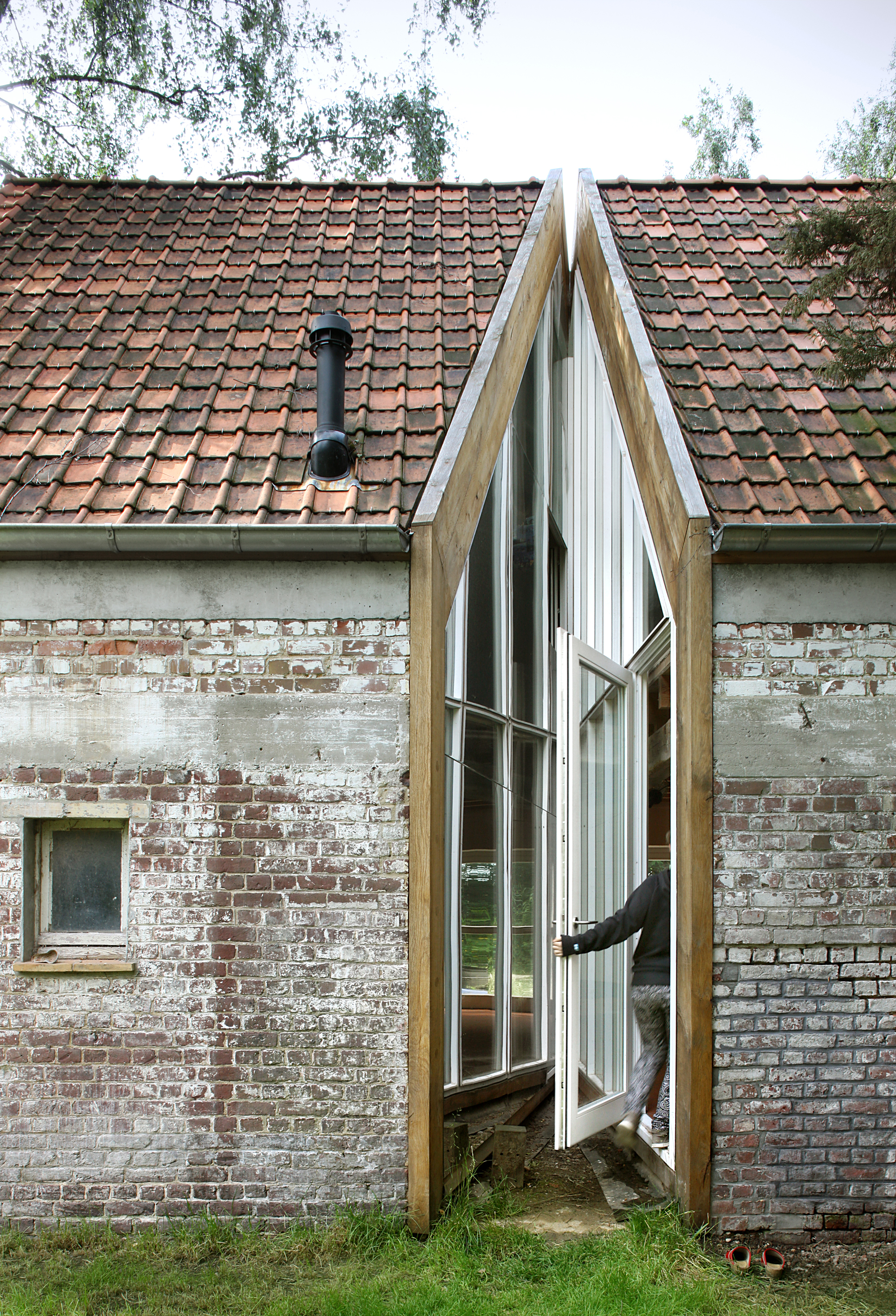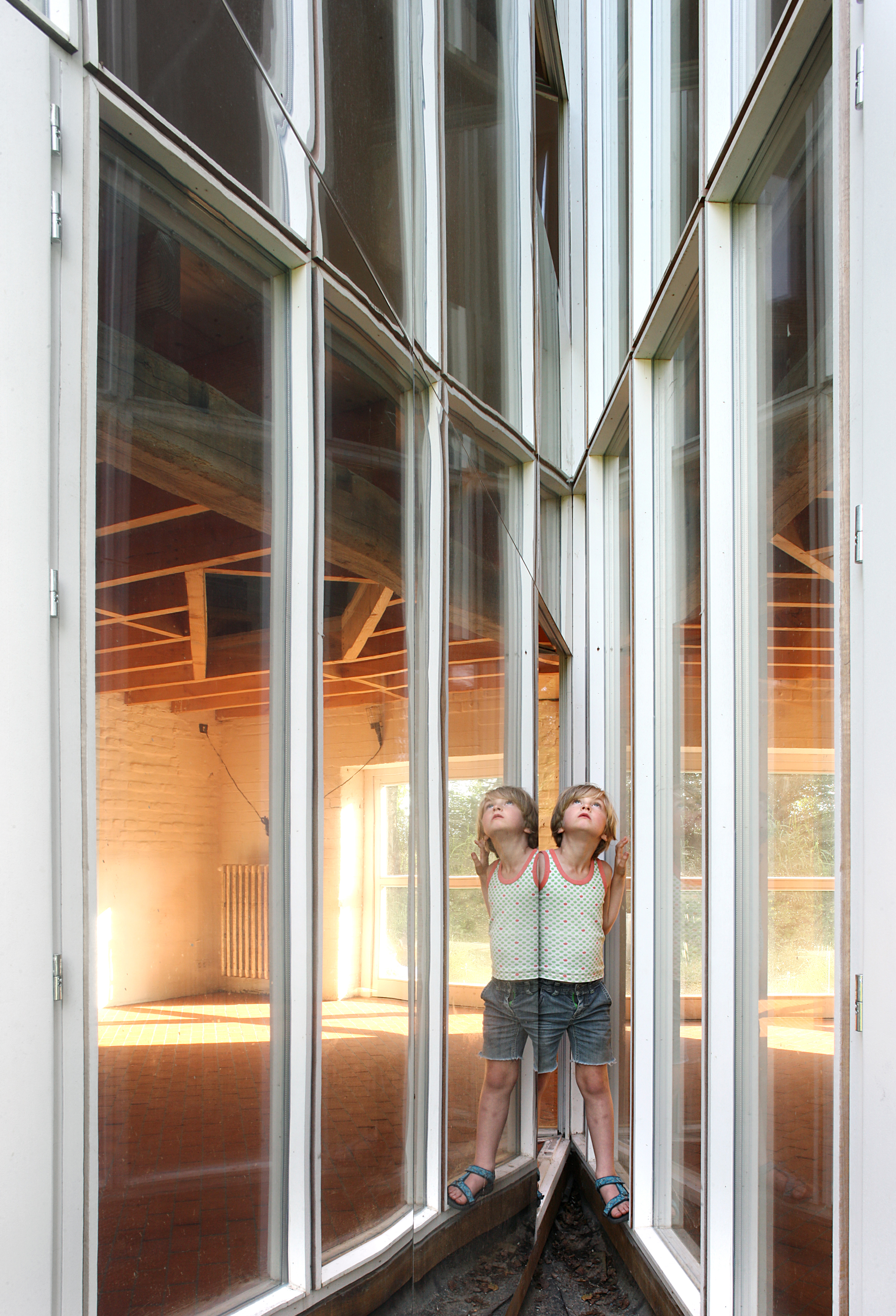 The barn at Kouter is cut through. In the cut, a window and a door appear. On one side. On the other side, a mirror. The cut is a purely functional wish. Light, access. The cut is probably also a dichotomy. For nothing needed to be added, yet it must happen nonetheless. The mirror immediately heals the wound, or, at least, it turns the cut into something different.