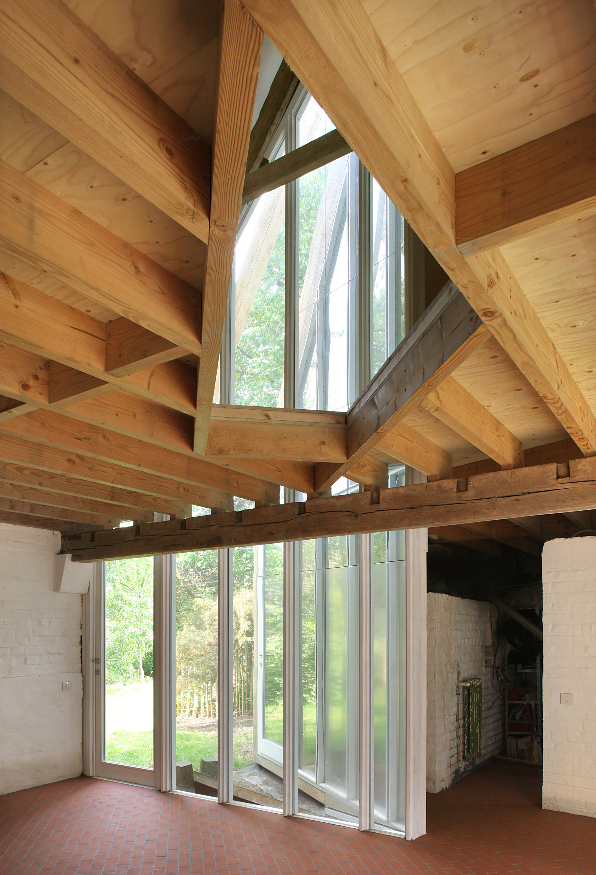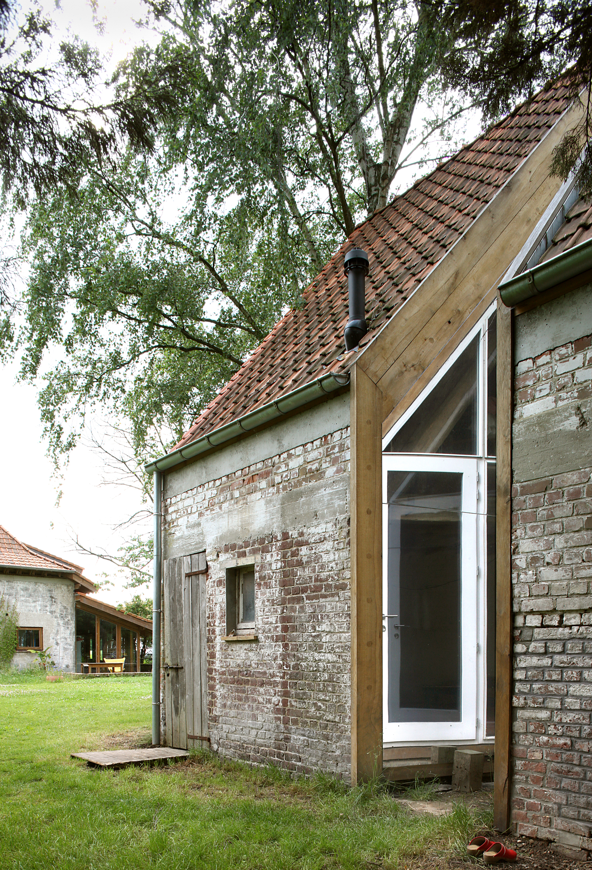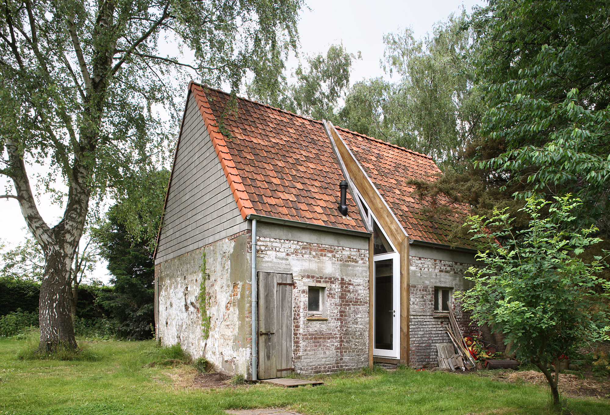 The barn at Kouter is cut through. In the cut, a window and a door appear. On one side. On the other side, a mirror. The cut is a purely functional wish. Light, access. The cut is probably also a dichotomy. For nothing needed to be added, yet it must happen nonetheless. The mirror immediately heals the wound, or, at least, it turns the cut into something different.