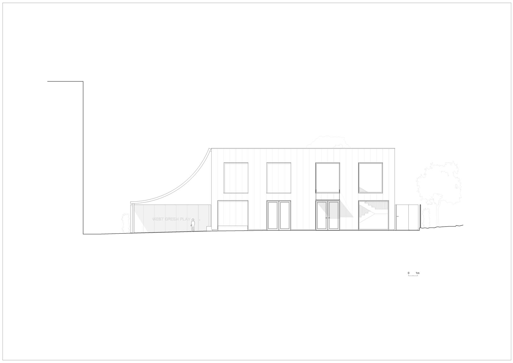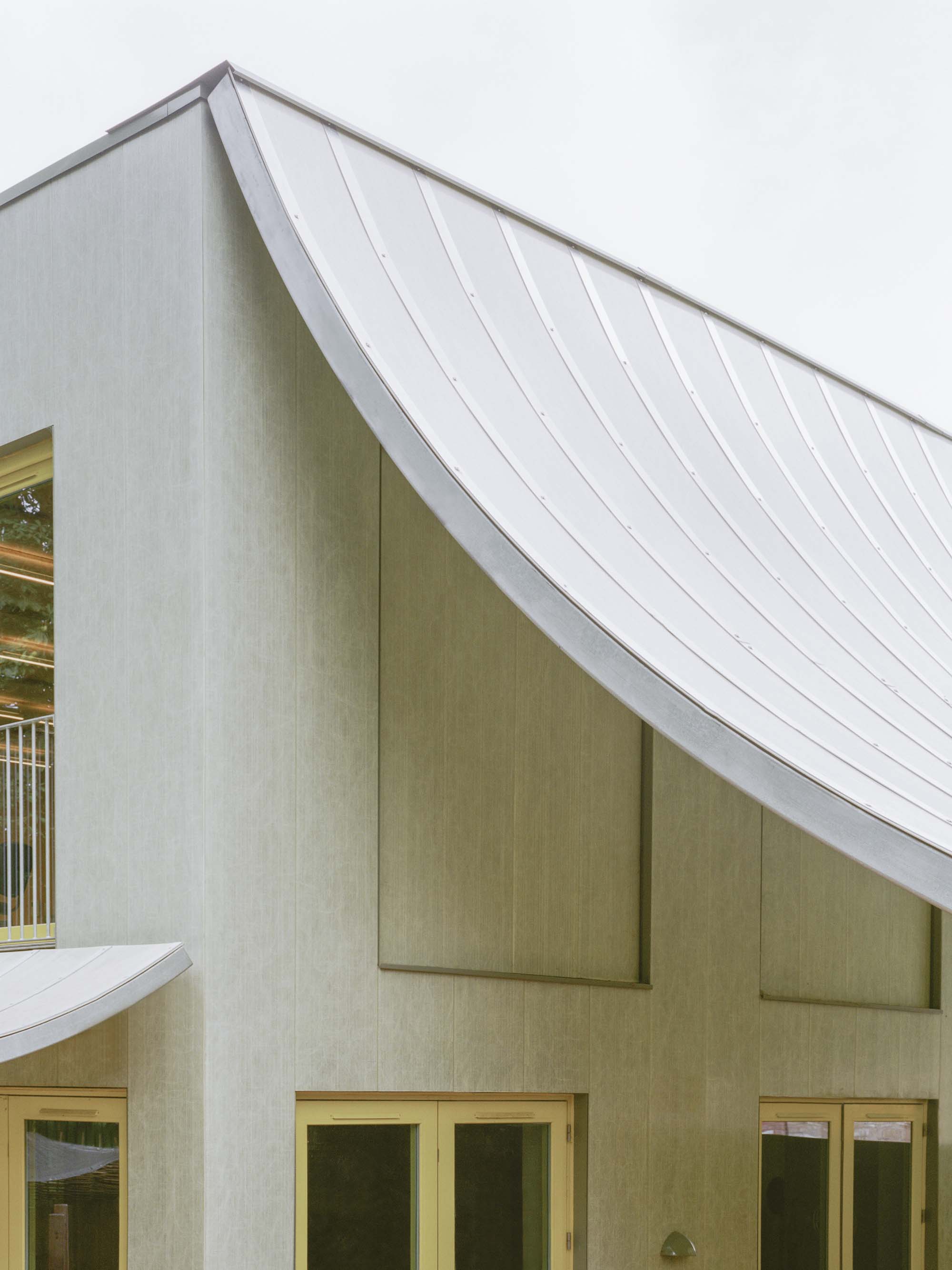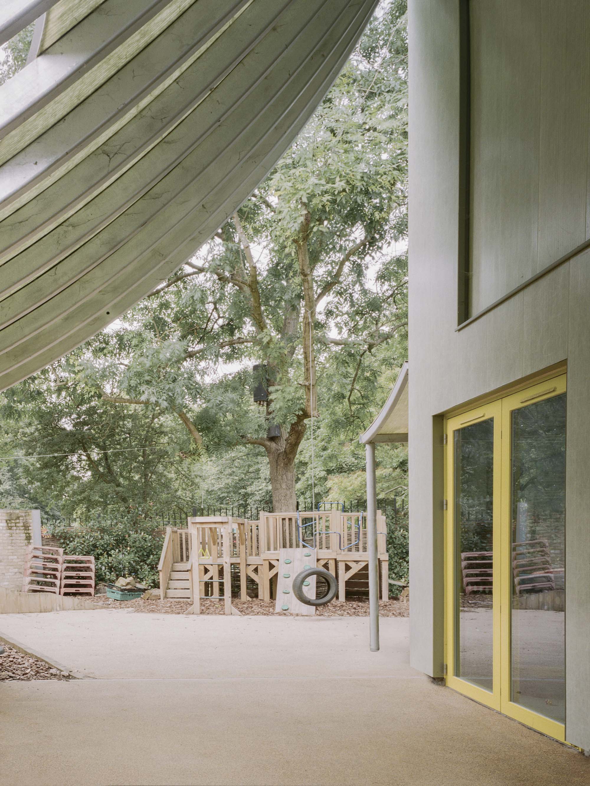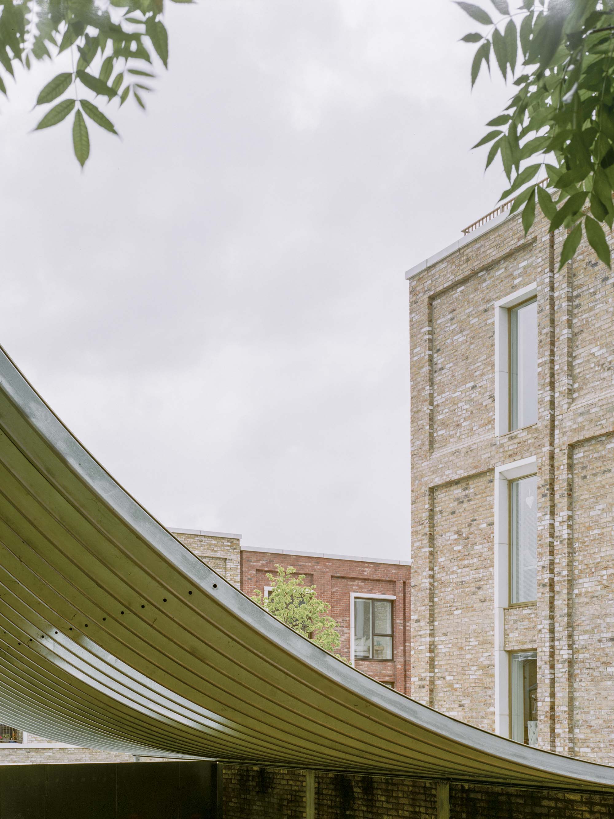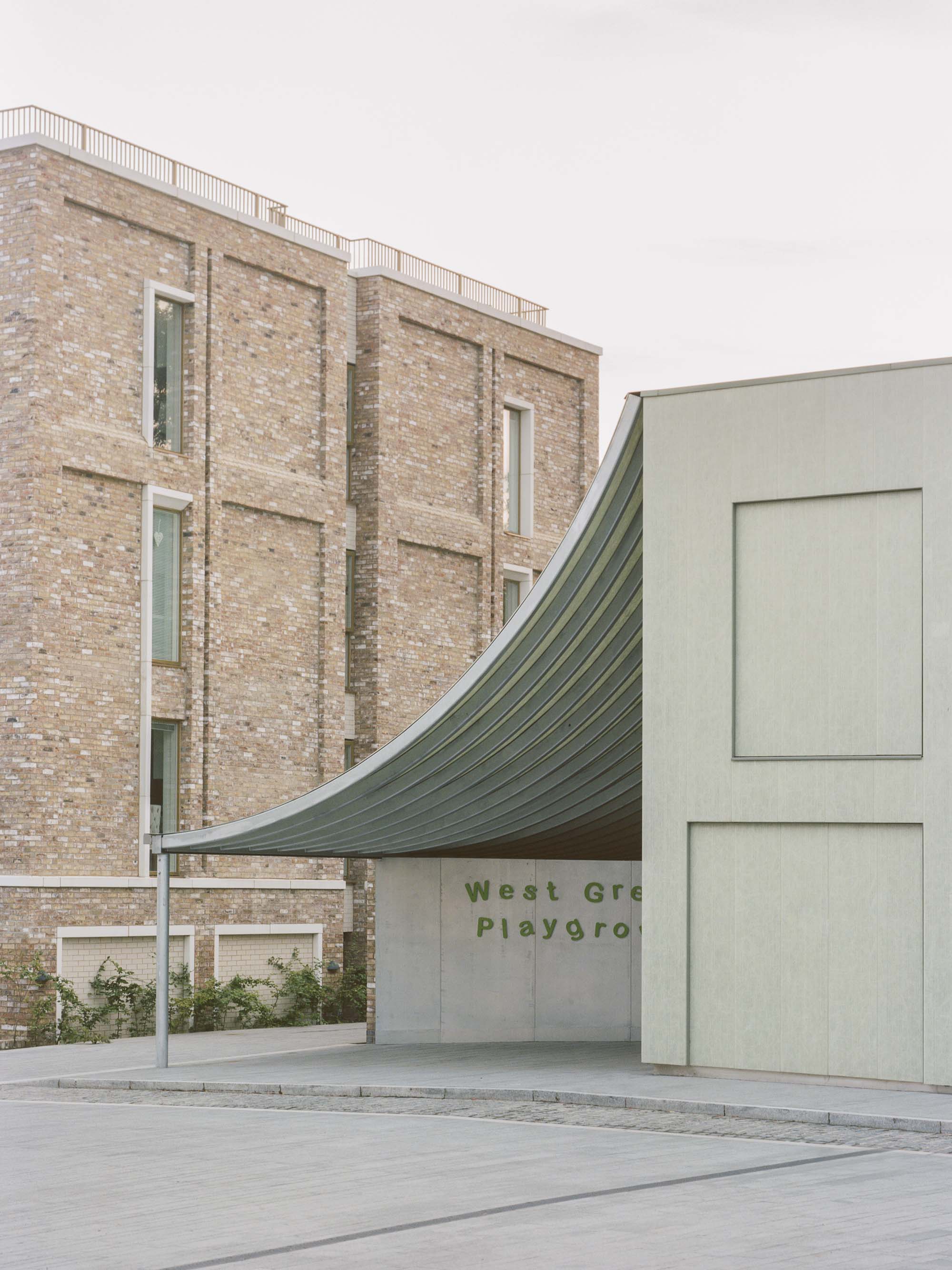 The generously curved canopy on the south side creates a covered entrance to the Nursery and outdoor play area on the side of the nursery garden with a thin diagonal wall that splits these two sides. The canopy bends from the top edge of the building down to a height of 2.2m and mediates between the scale of the building and the scale of the kids. Along the bottom edge this roof rests on a column and brick wall that leads a path from the square to the park and provides a buffer zone between the play space of the nursery and the residential development. The smaller west facing canopy creates a long loggia for shading and a threshold between garden and interior space for playing and running.