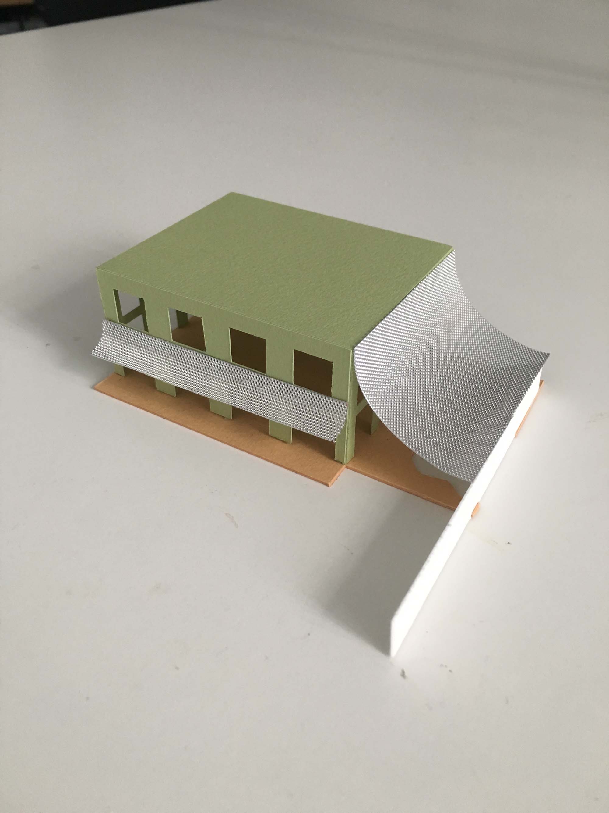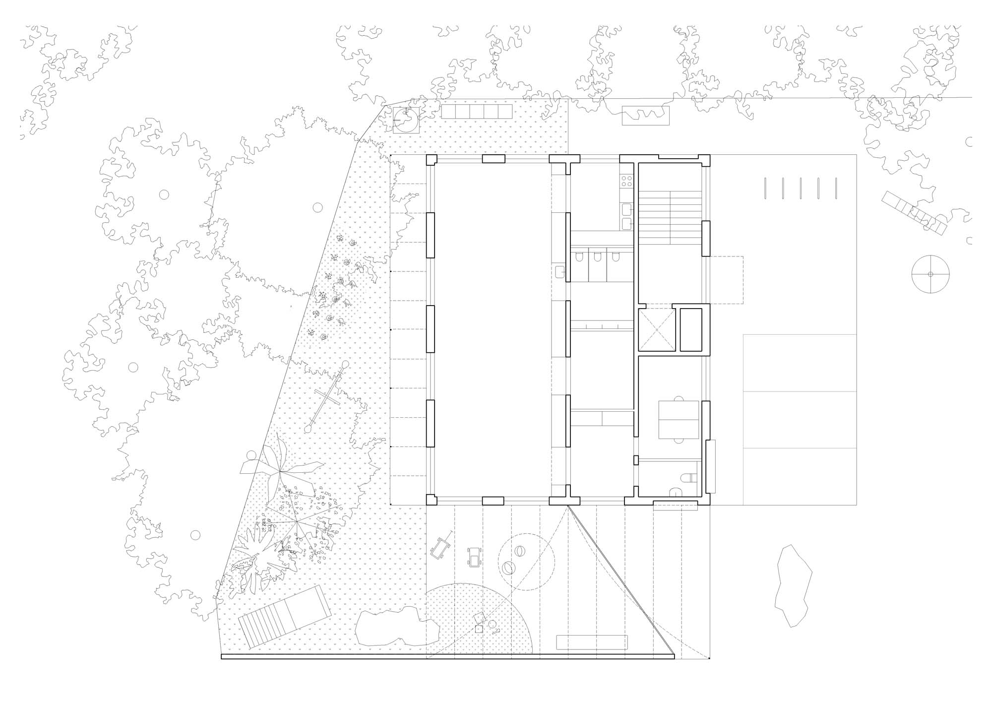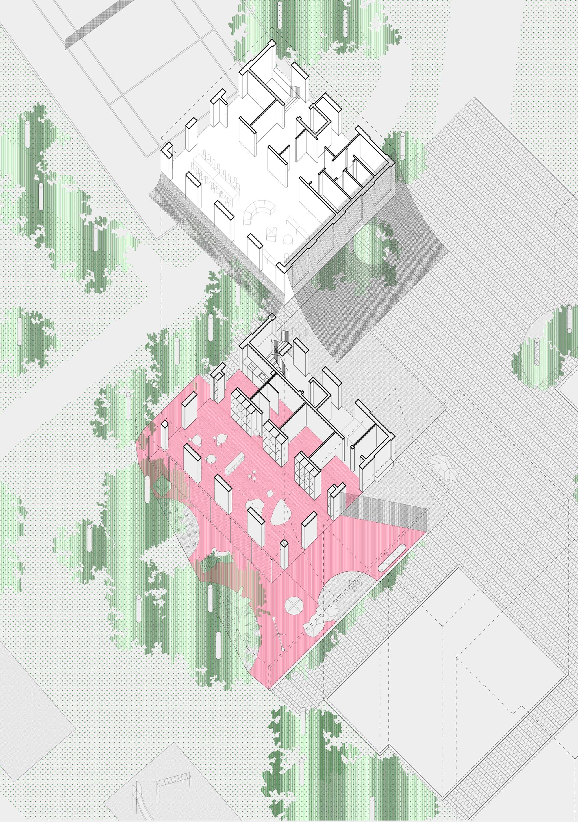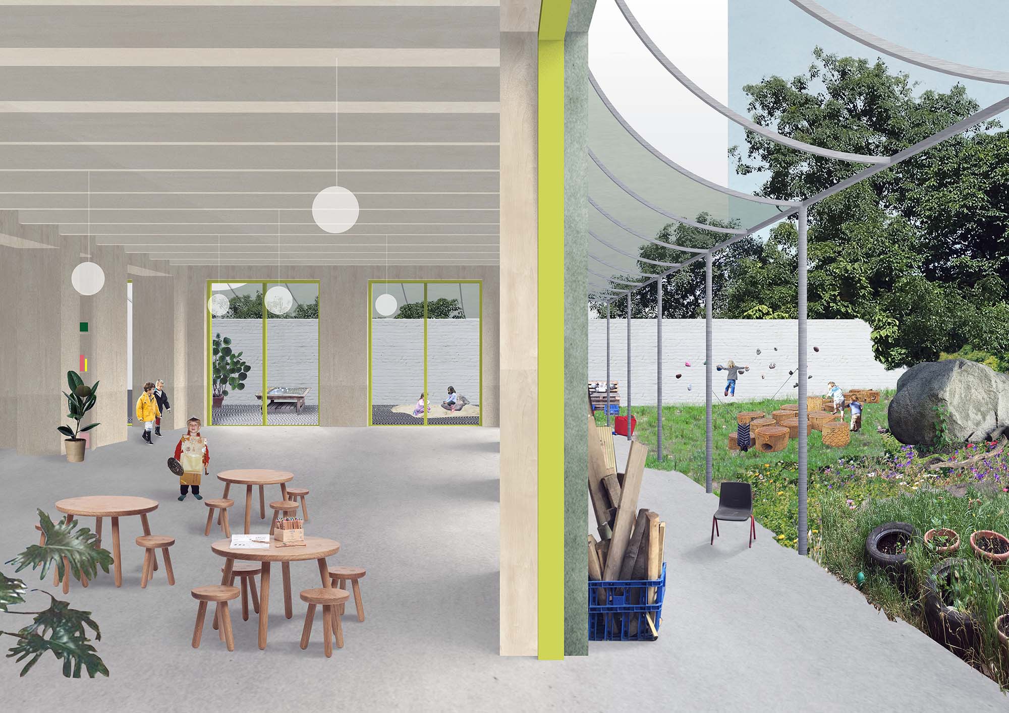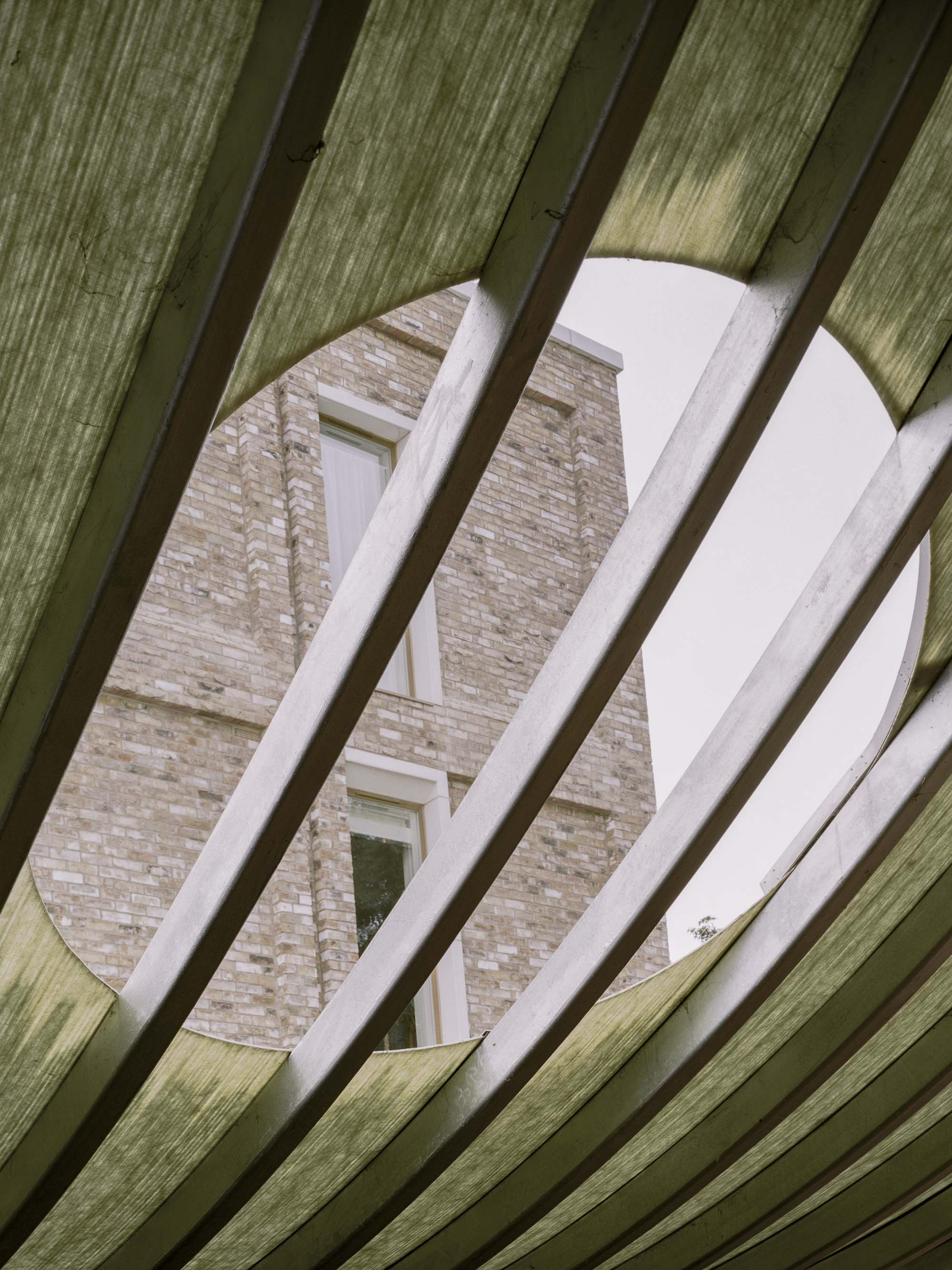 The generously curved canopy on the south side creates a covered entrance to the Nursery and outdoor play area on the side of the nursery garden with a thin diagonal wall that splits these two sides. The canopy bends from the top edge of the building down to a height of 2.2m and mediates between the scale of the building and the scale of the kids. Along the bottom edge this roof rests on a column and brick wall that leads a path from the square to the park and provides a buffer zone between the play space of the nursery and the residential development. The smaller west facing canopy creates a long loggia for shading and a threshold between garden and interior space for playing and running.